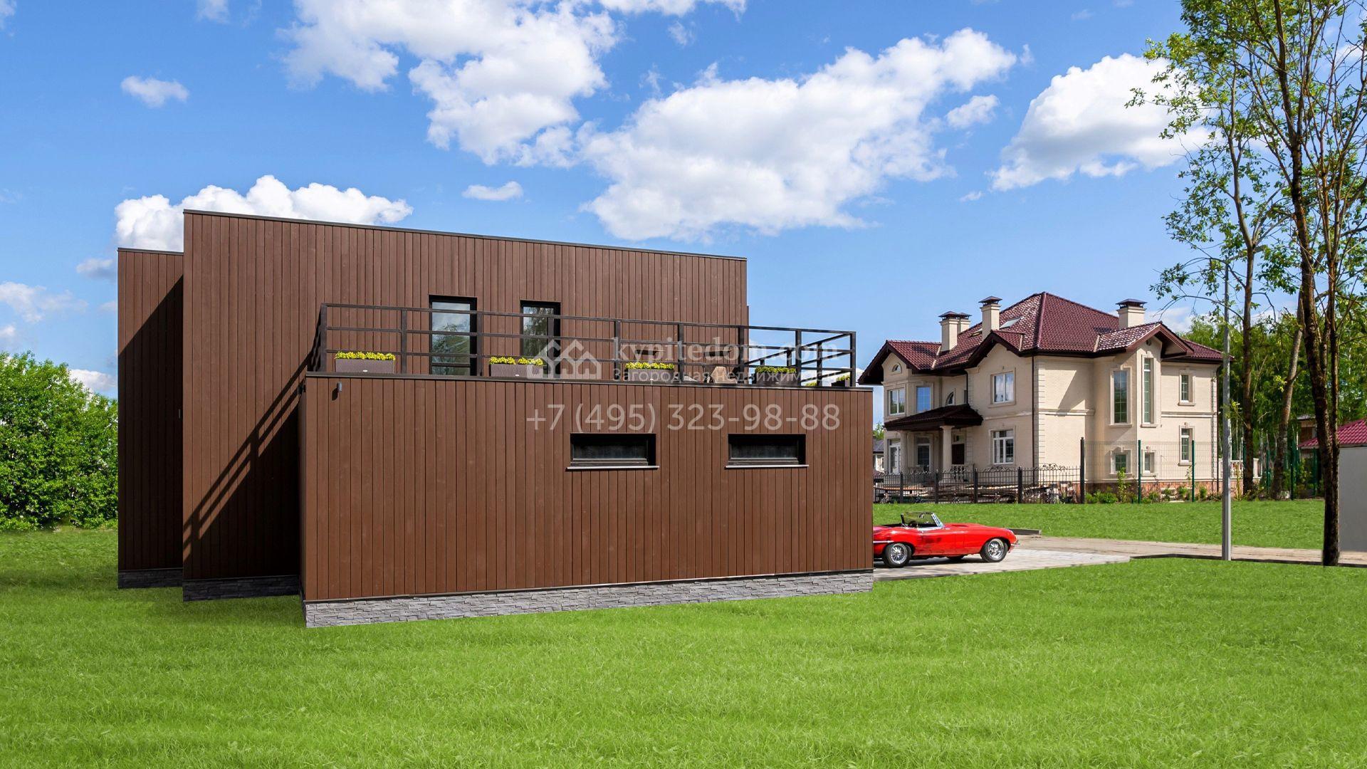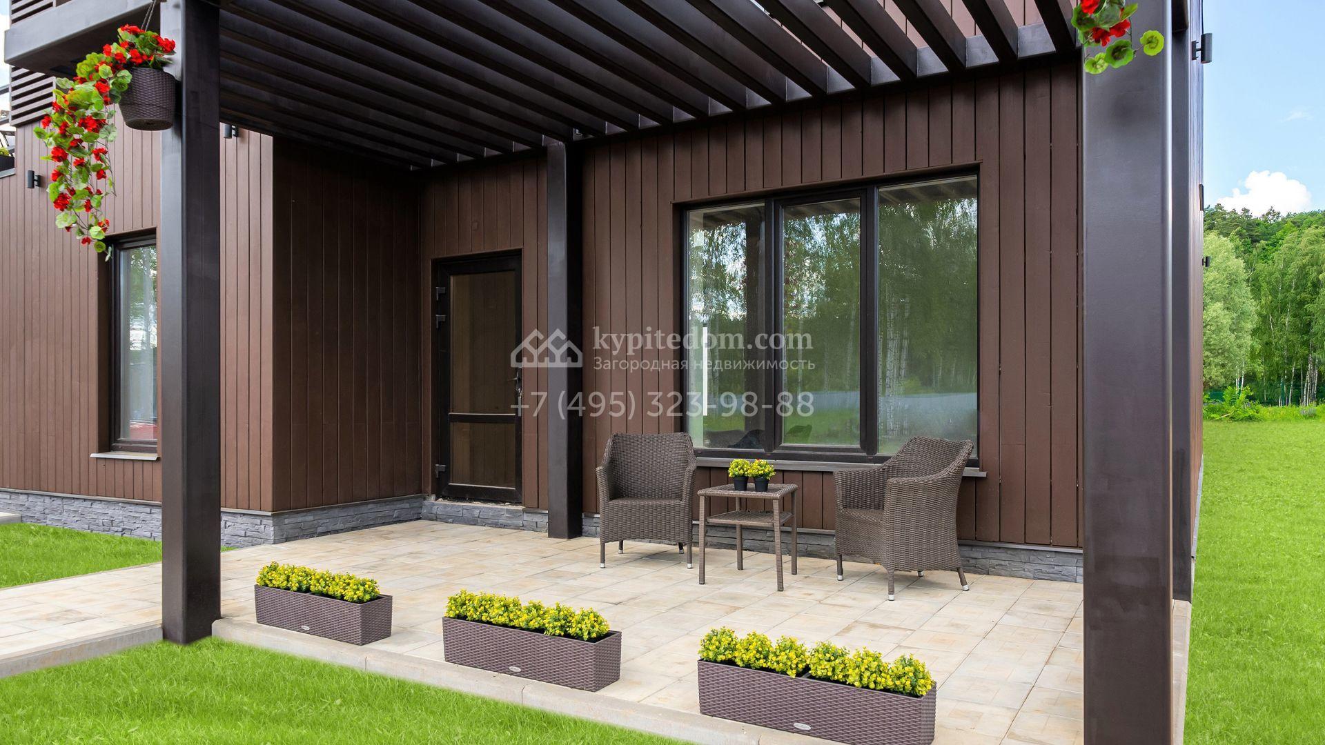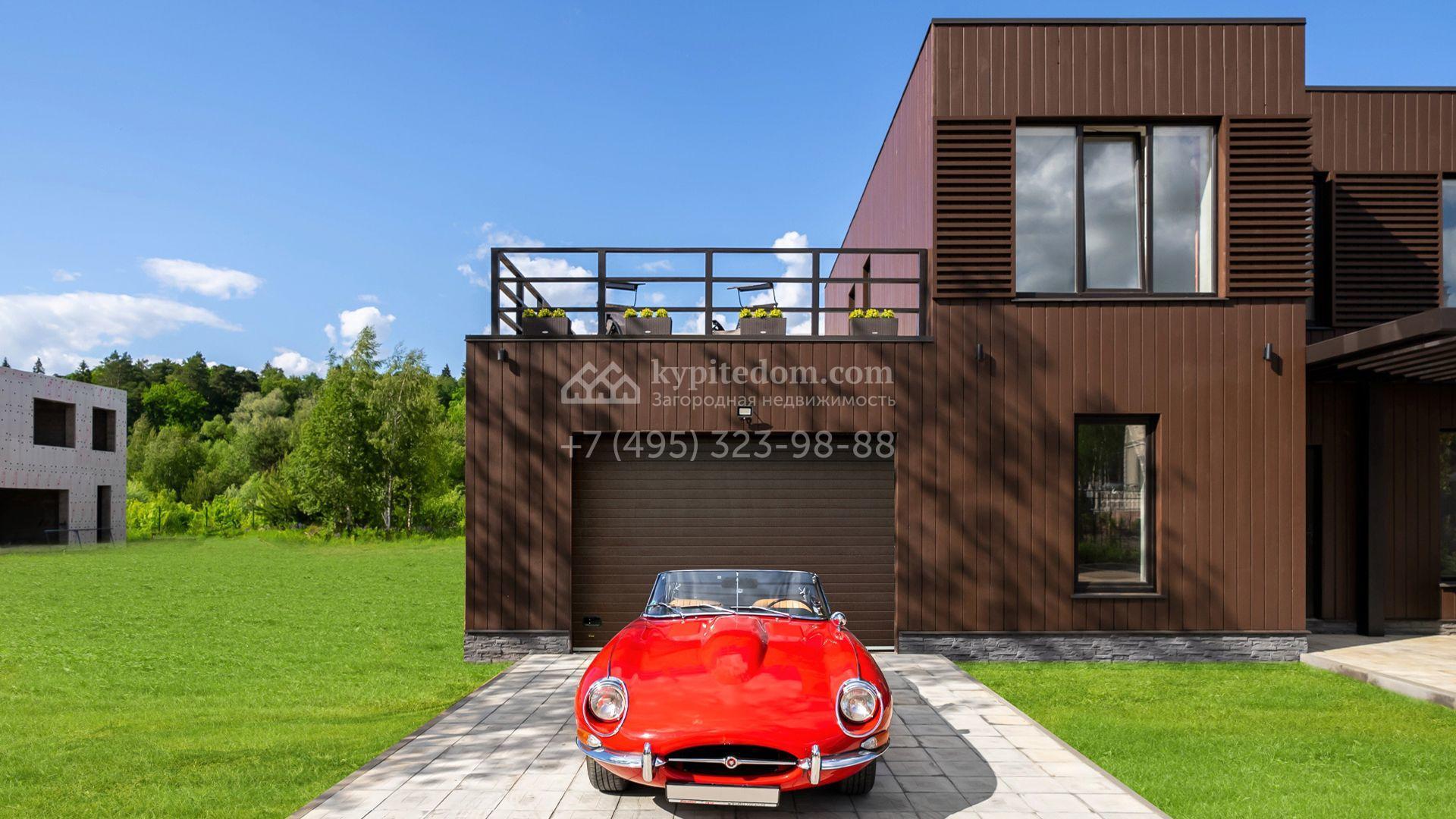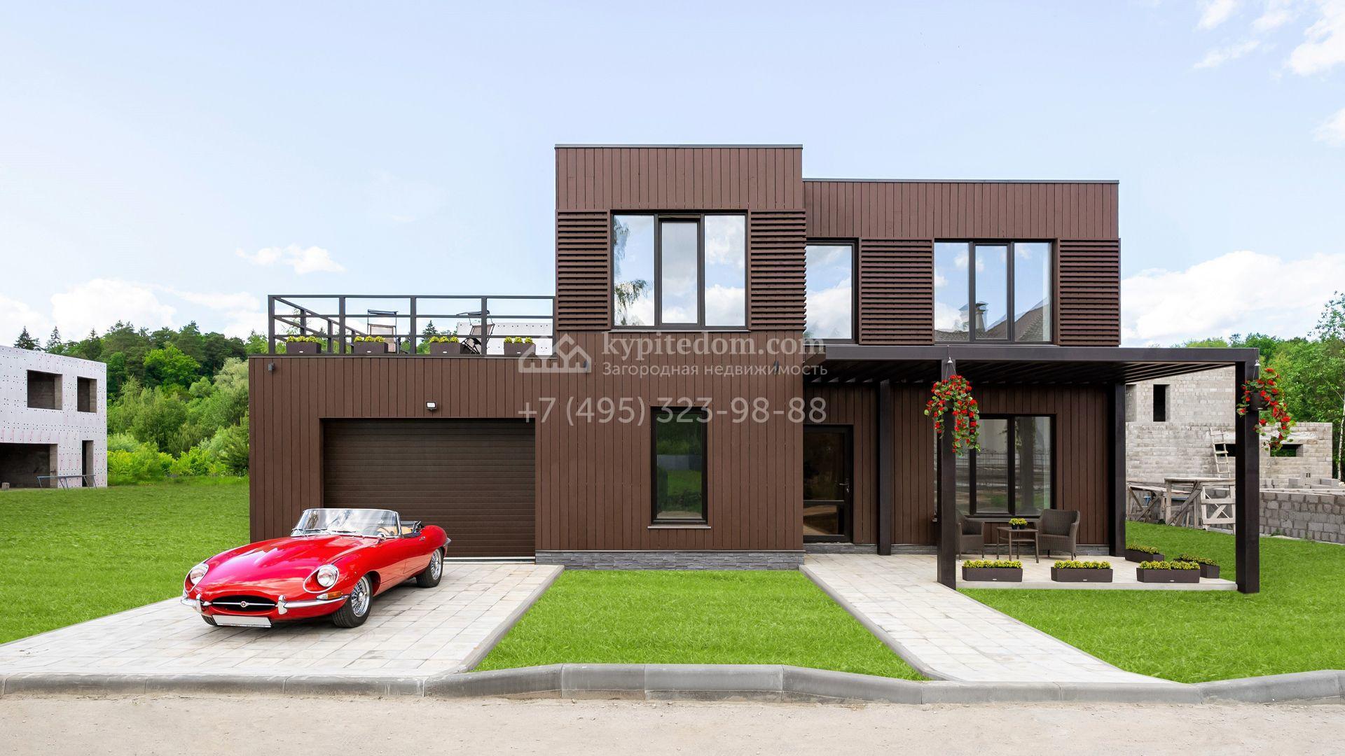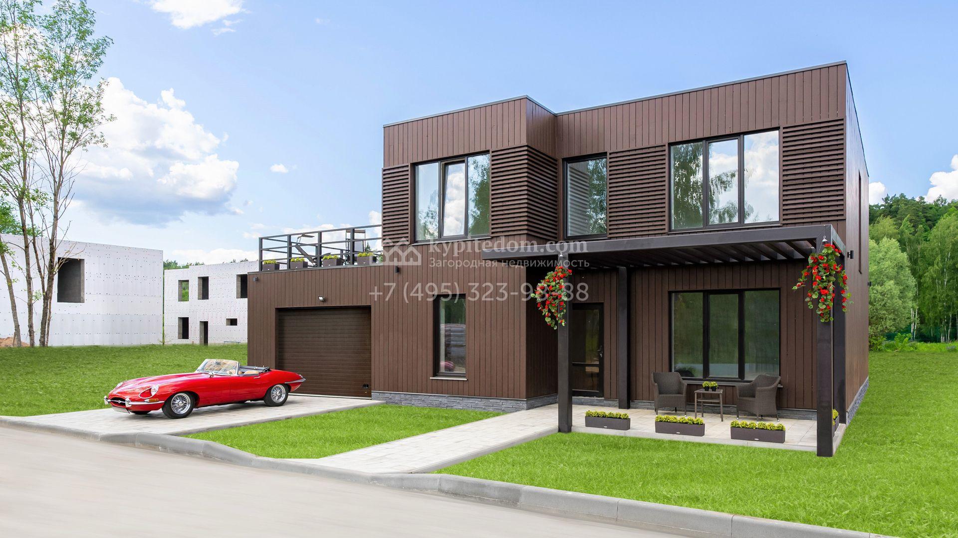 Загородный дом площадью 243 м² расположен на полевом участке 6,3 сотки. Фасад в современном стиле облицован планкеном из натурального дерева и декорирован подсветкой. В коттедже выполнена отделка под ключ. Планировка позволяет организовать несколько спален с санузлами, гостиную, кухню, столовую, кабинет. Предусмотрен гараж на 1 машину. На участке можно выполнить ландшафтный дизайн и обустроить зону барбекю на террасе.