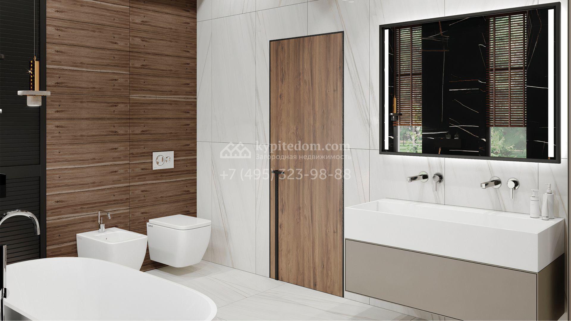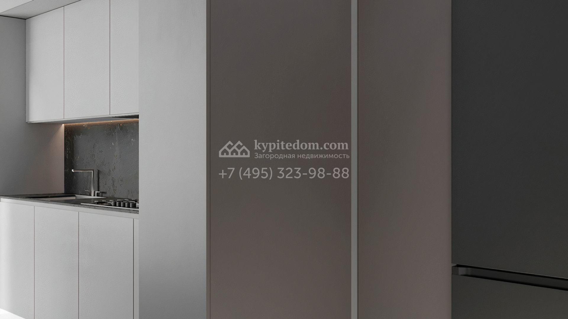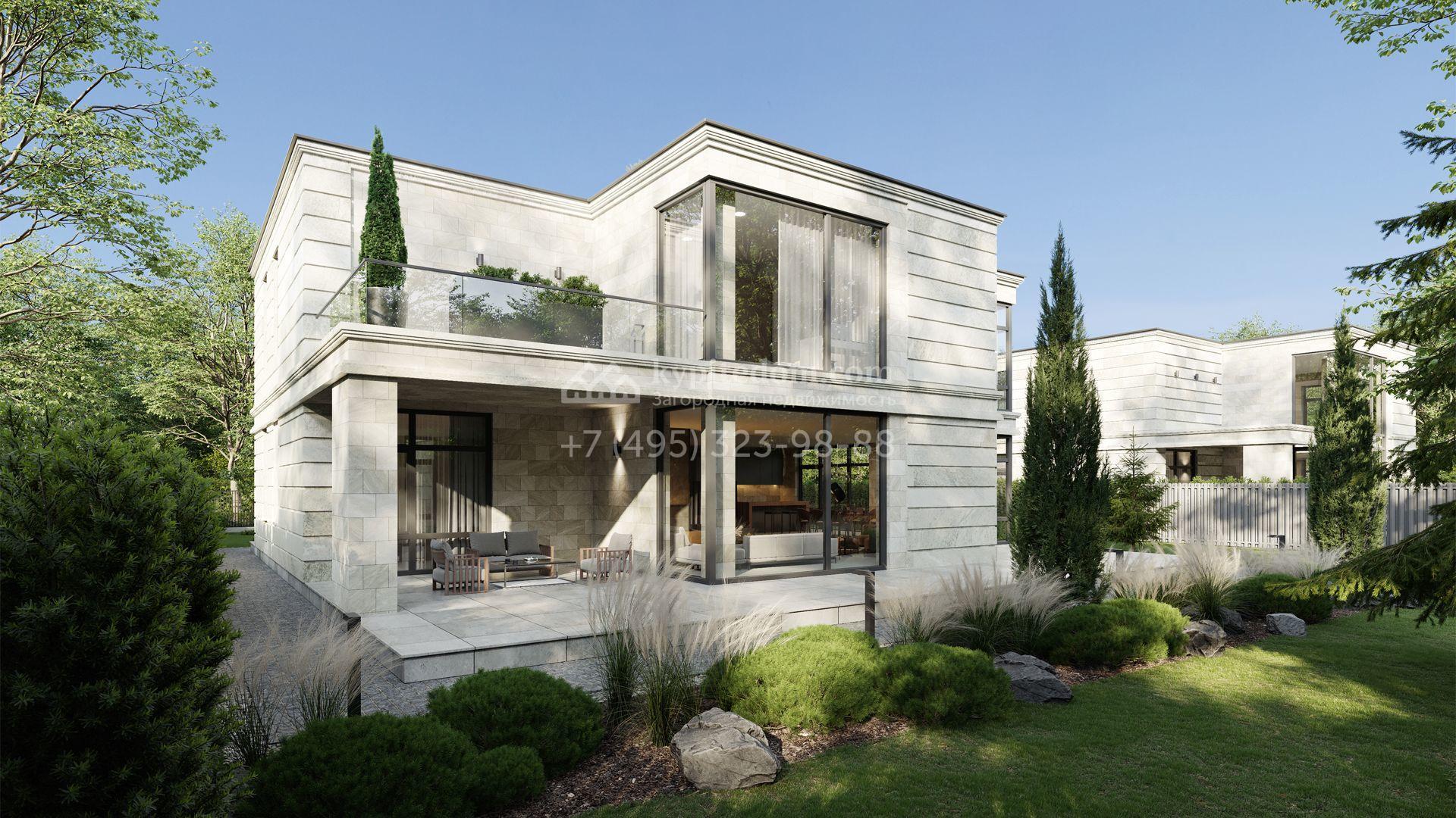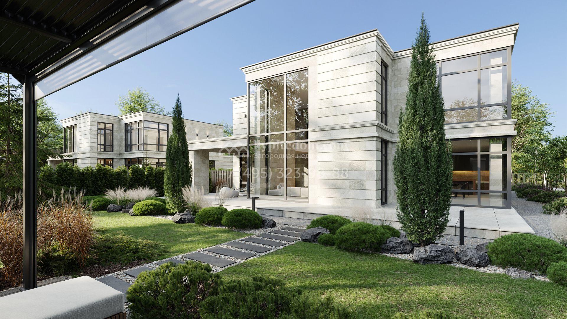 Загородный дом площадью 384 м² построен на полевом участке 11 соток с ландшафтным дизайном. Фасад с большими окнами облицован светлым камнем, декорирован подсветкой. Коттедж представлен в отделке whitebox. Планировка резиденции включает 5 спален, гостиную с камином, кухню-столовую, кабинет и террасу. В контуре дома предусмотрен гараж на 2 машины. На участке засеян газон, высажены кустарники и вымощены дорожки.