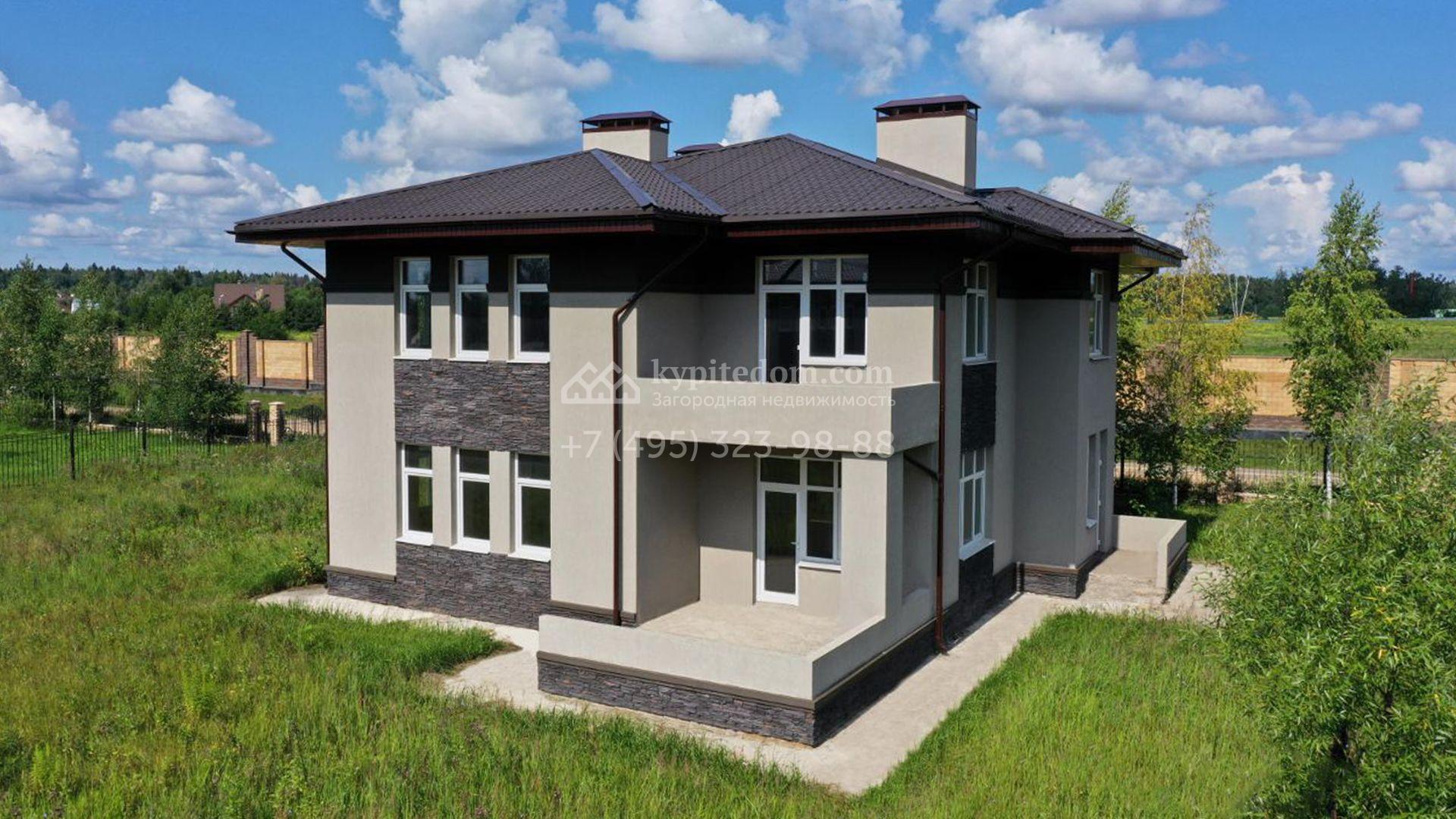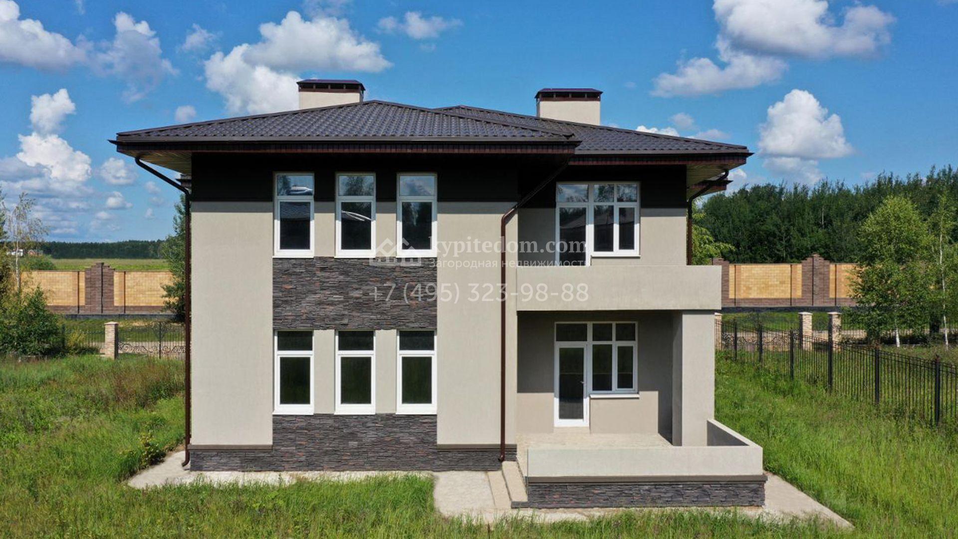 Загородный дом площадью 270 м² расположен на полевом участке 14 соток. Фасад здания в современном стиле облицован серой штукатуркой и темной плиткой под камень. В коттедже без отделки можно выполнить отделку с учетом индивидуальных потребностей. В резиденции спланировали 3 спальни, гостиную, кухню-столовую и кабинет. На участке можно выполнить ландшафтный дизайн и обустроить беседку с зоной барбекю.