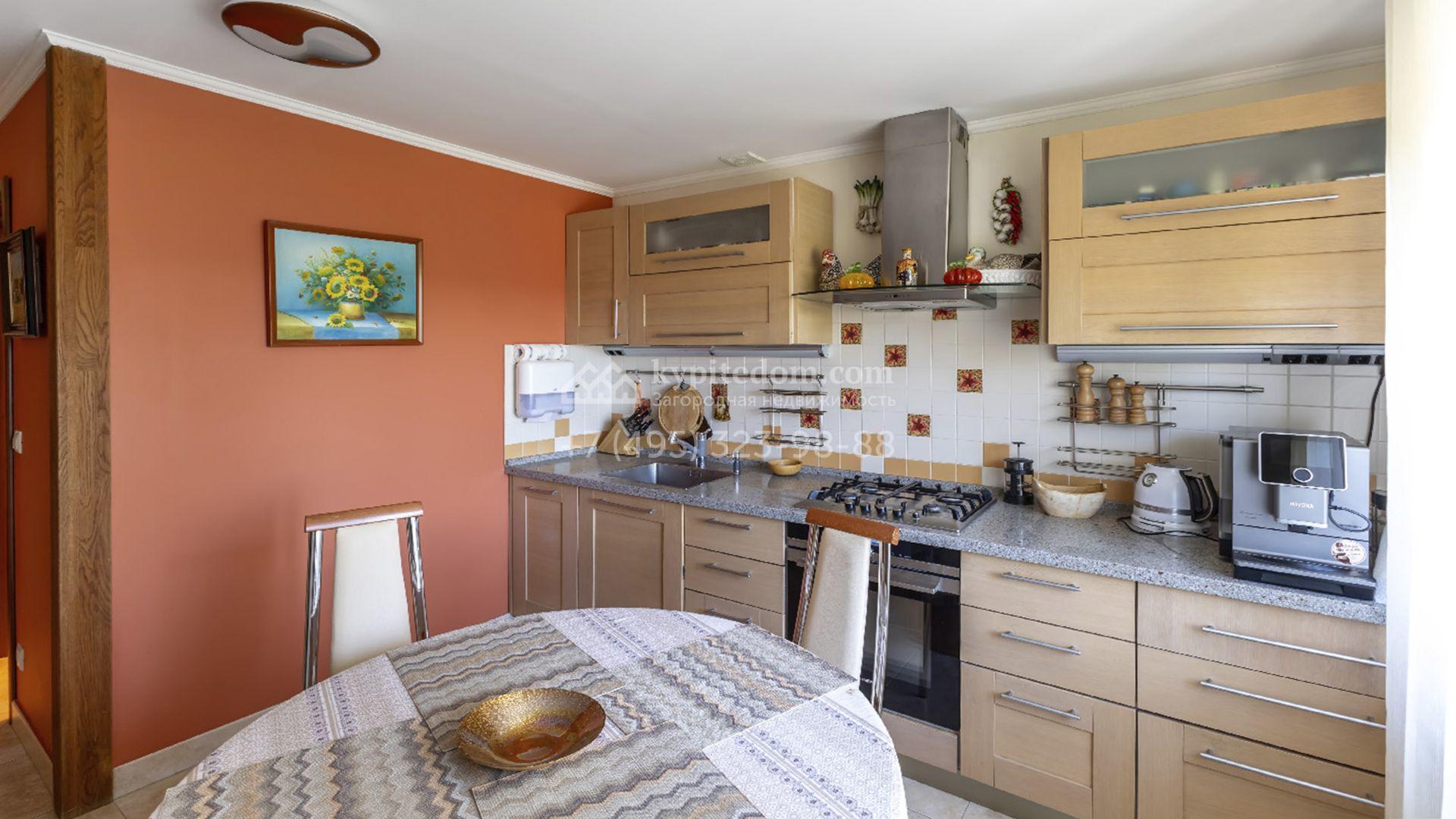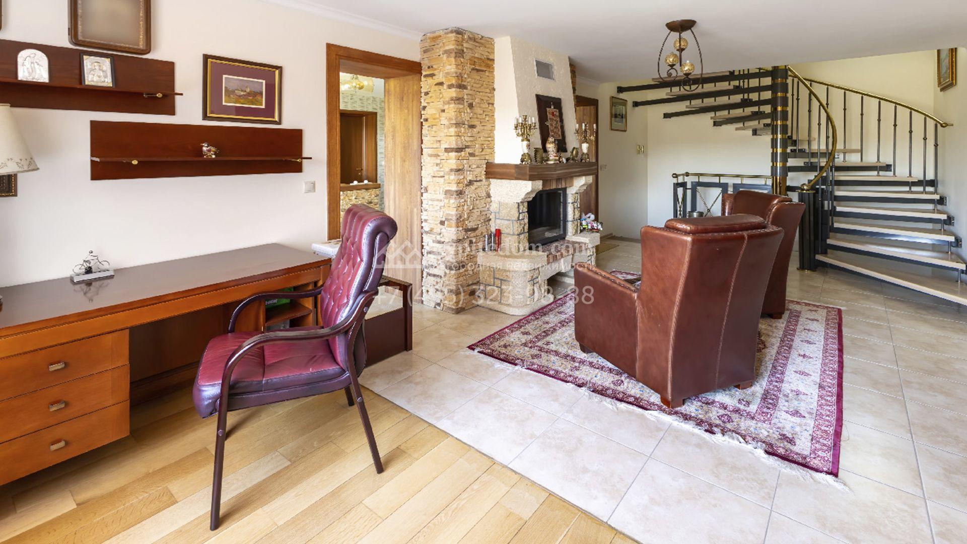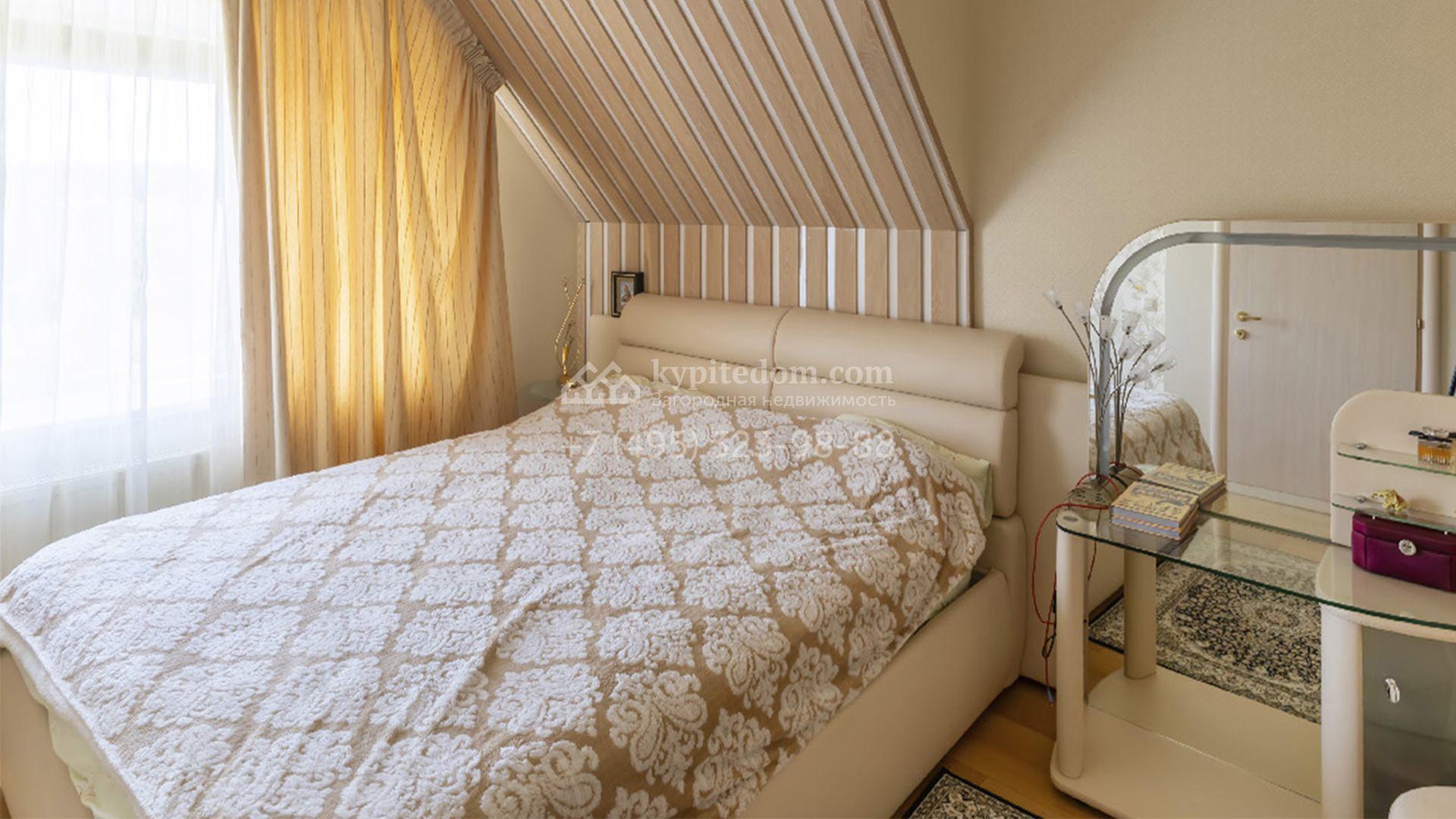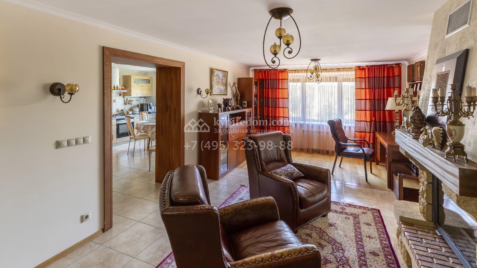 Загородный дом площадью 238 м² расположен на полевом участке 40 соток. Современный фасад с многоскатной крышей облицован бежевой штукатуркой и декорирован плиткой с фактурой камня. Уютный интерьер выдержан в светлых тонах. В доме спланировали гостиную, кабинет с каминной зоной, оборудованную кухню-столовую и террасу.