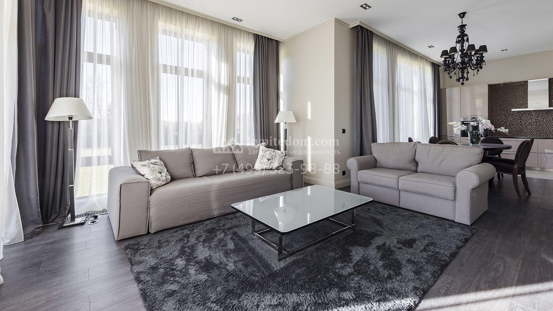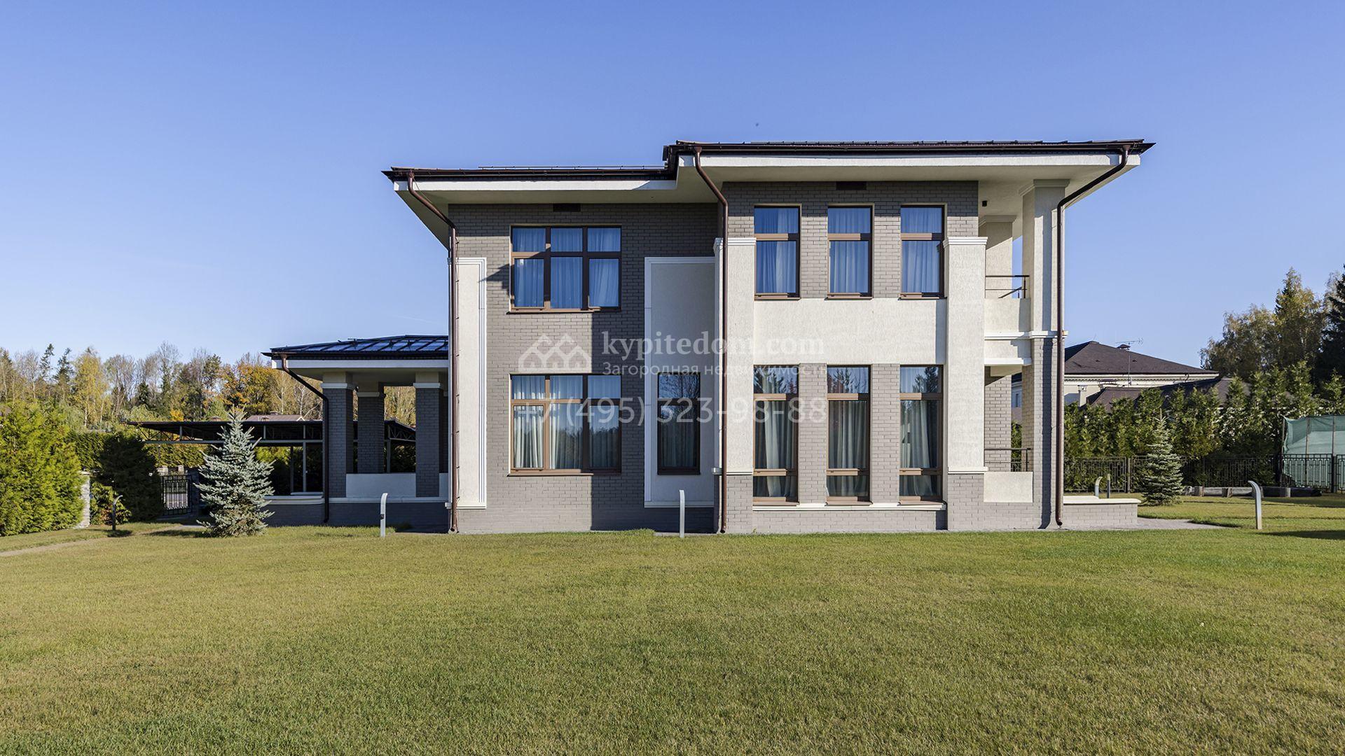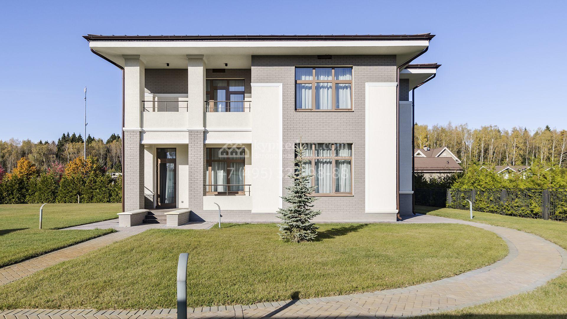Загородный дом площадью 214 м² расположен на просторном полевом участке 19 соток. Современный фасад с большими окнами облицован бежевой штукатуркой и серым клинкерным кирпичом. Интерьер выдержан в спокойных тонах, дополнен комфортной мебелью, бытовой техникой и сантехникой.