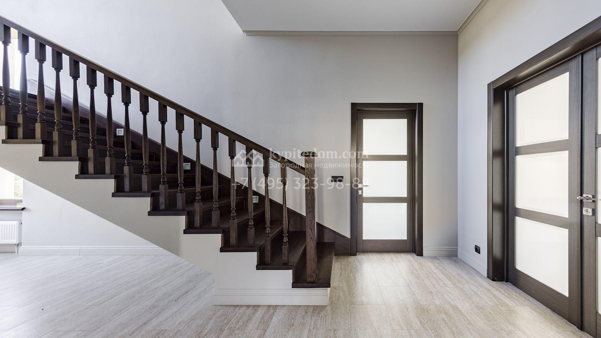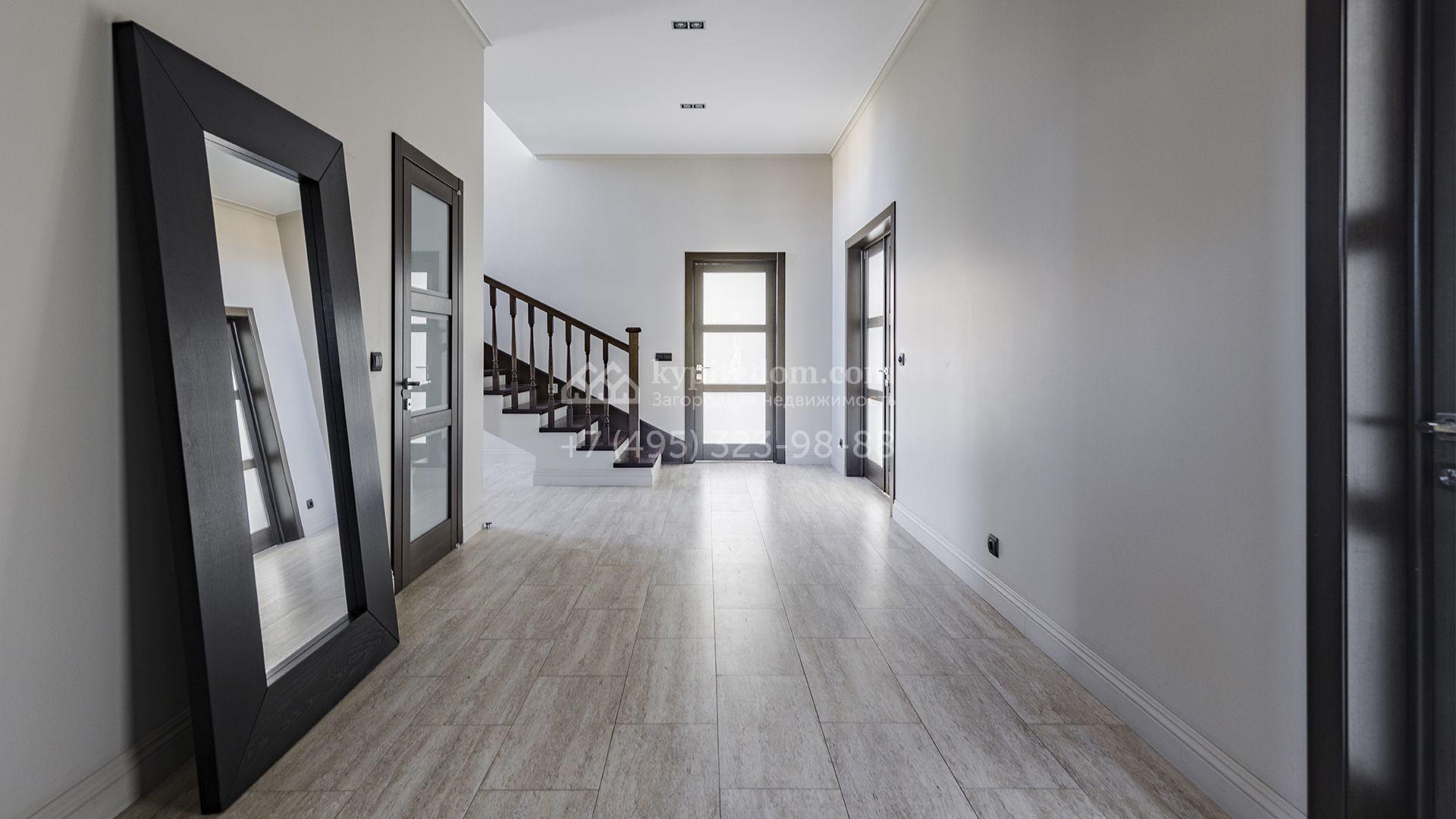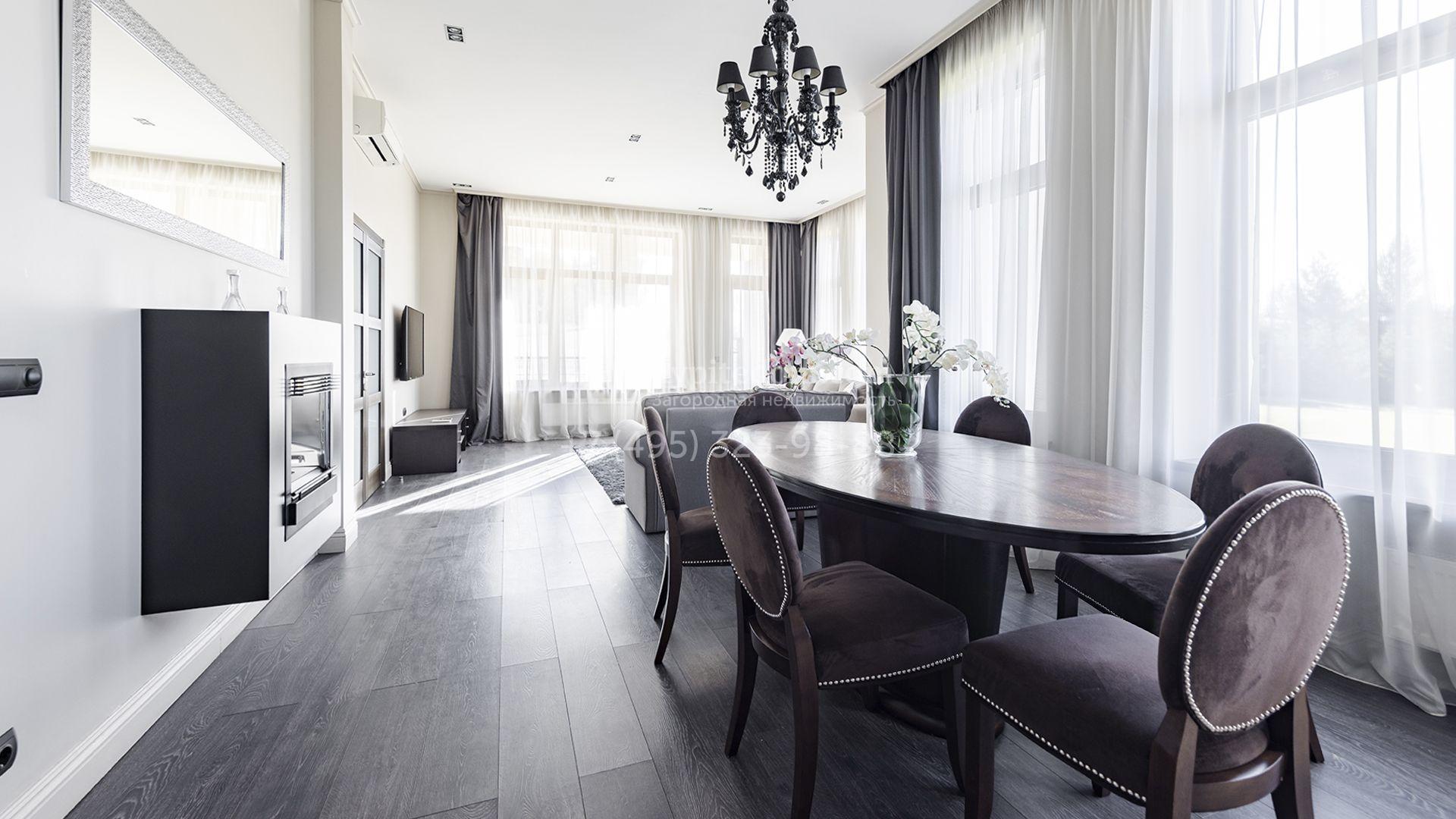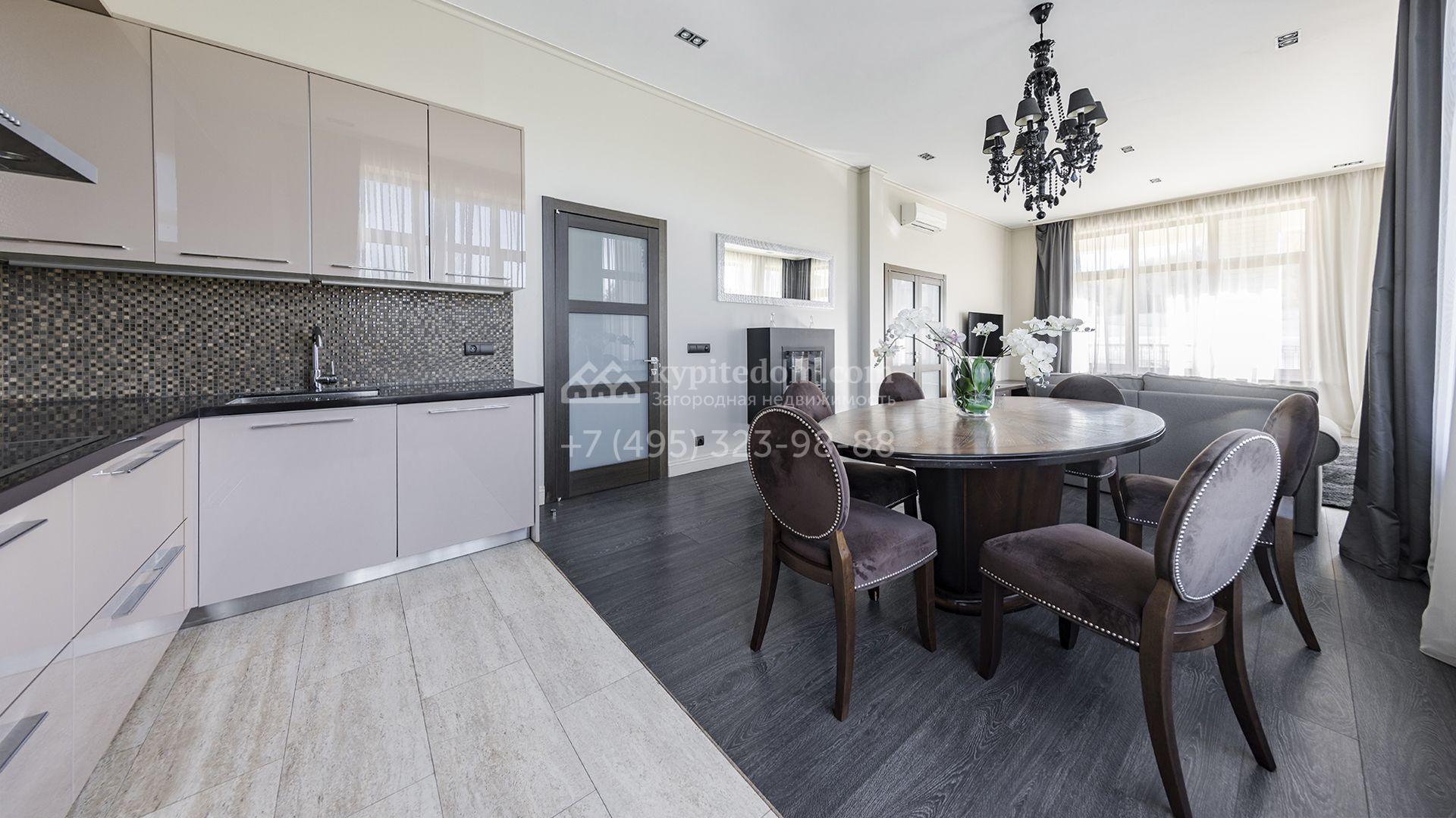 Загородный дом площадью 214 м² расположен на просторном полевом участке 19 соток. Современный фасад с большими окнами облицован бежевой штукатуркой и серым клинкерным кирпичом. Интерьер выдержан в спокойных тонах, дополнен комфортной мебелью, бытовой техникой и сантехникой.