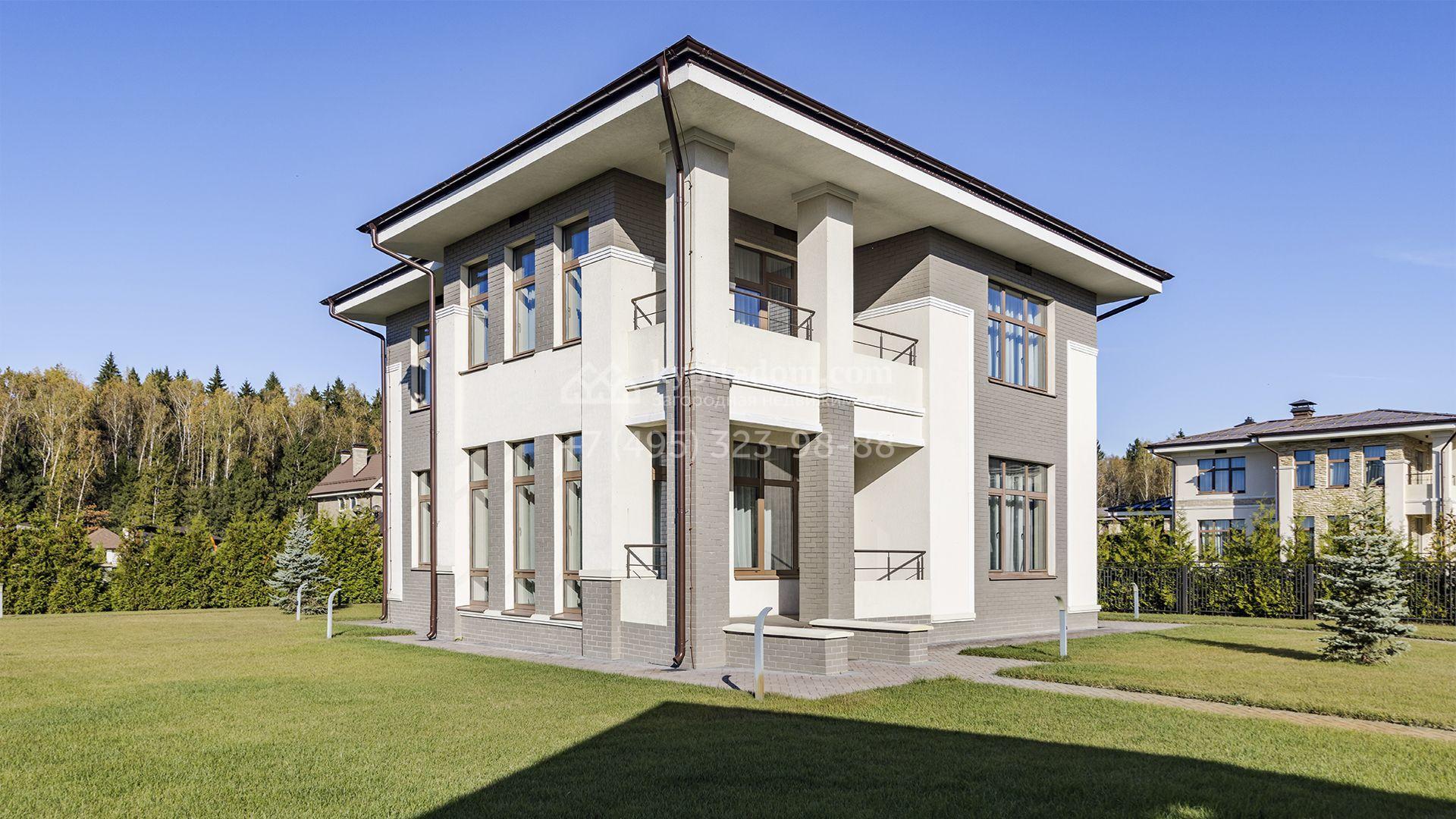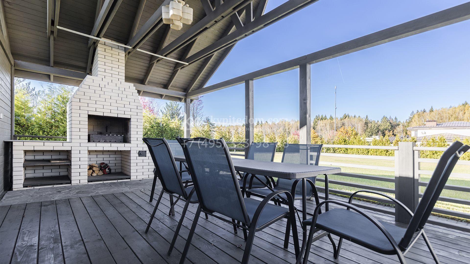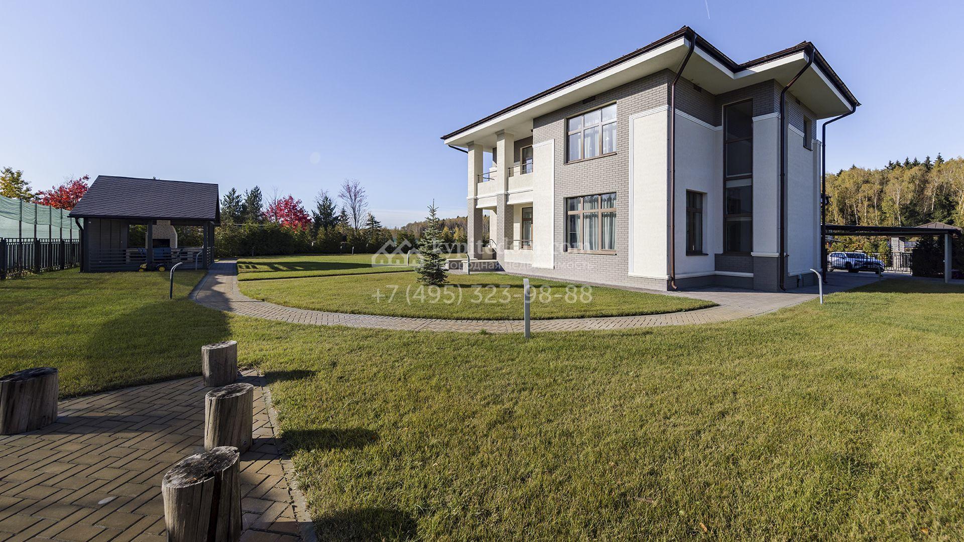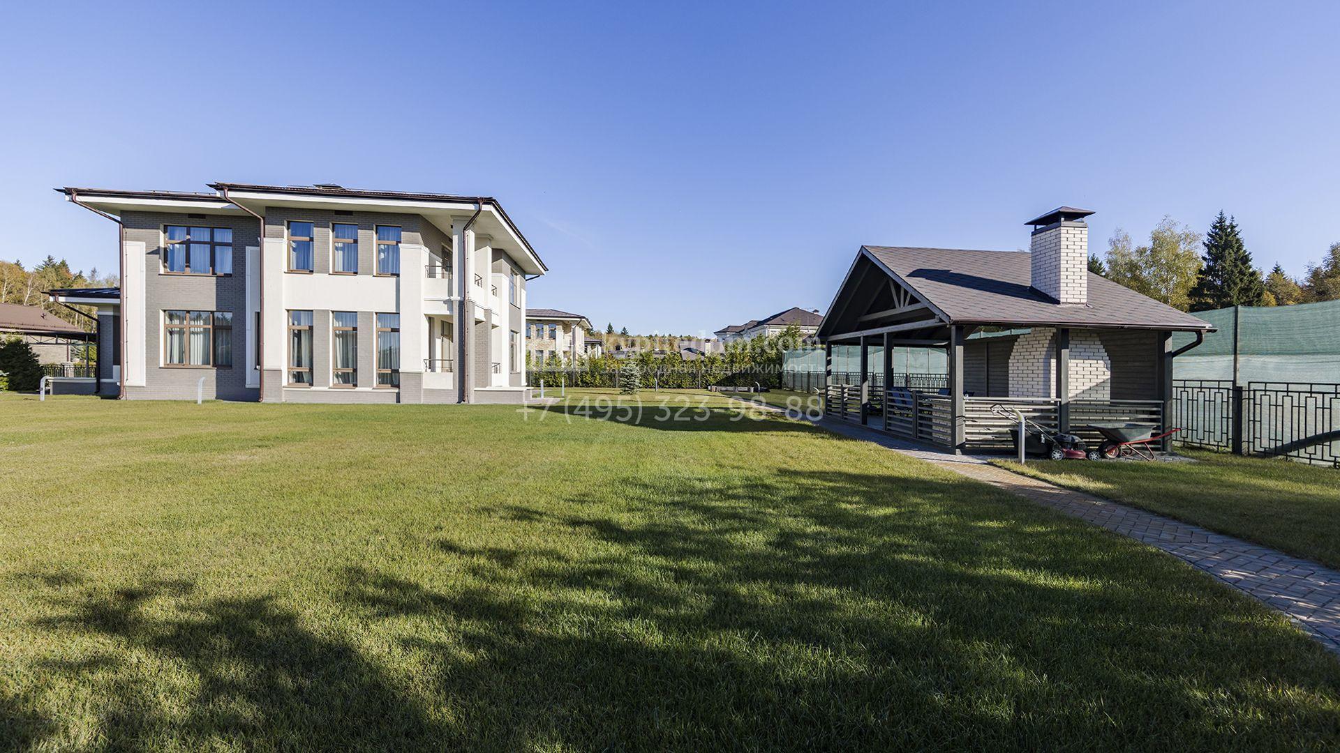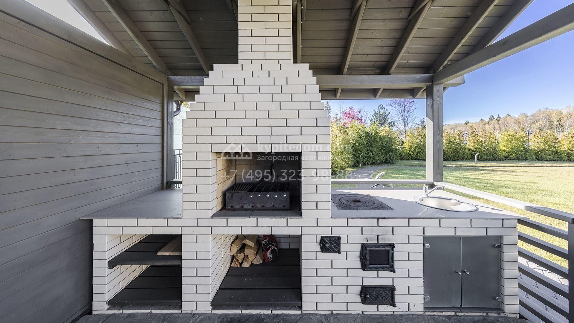 В коттедже спланировали уютную гостиную-кухню-столовую с камином и TV-зоной с выходом на террасу, 3 спальни, кабинет и 2 гардеробные. Рядом с основным зданием возведены навес на 3 машины и обустроенная беседка для барбекю. В рамках ландшафтного дизайна на участке засеян газон, высажены хвойные деревья, дорожки вымощены брусчаткой и оборудовано уличное освещение.