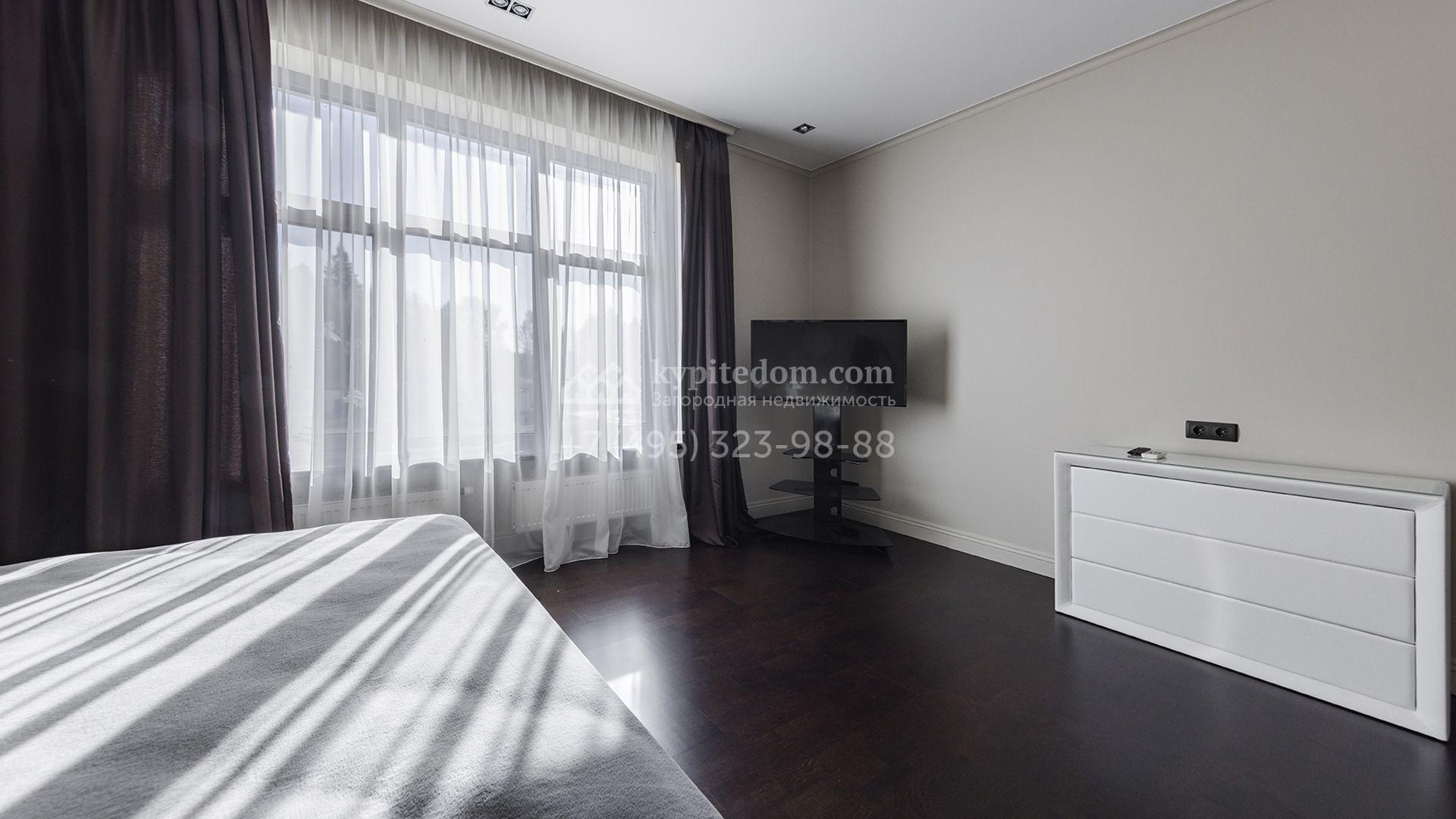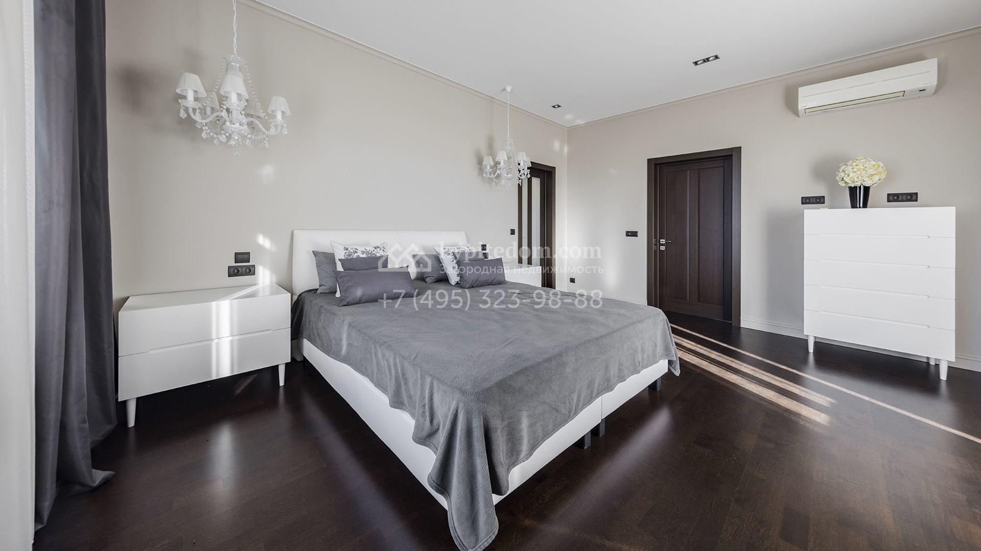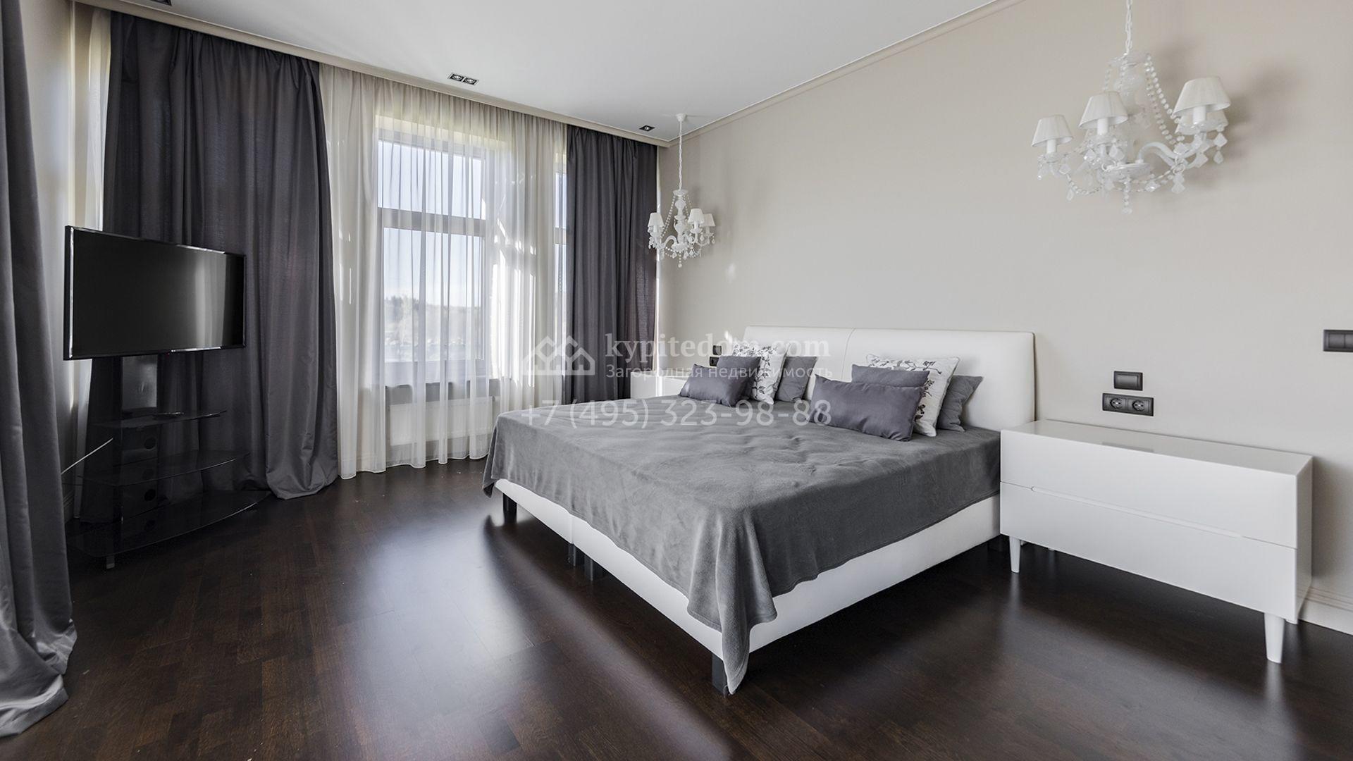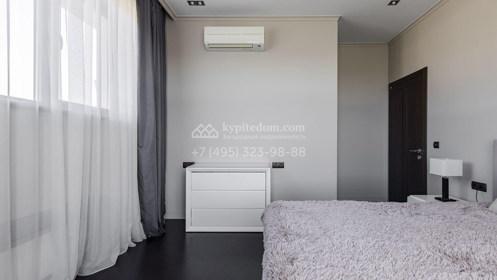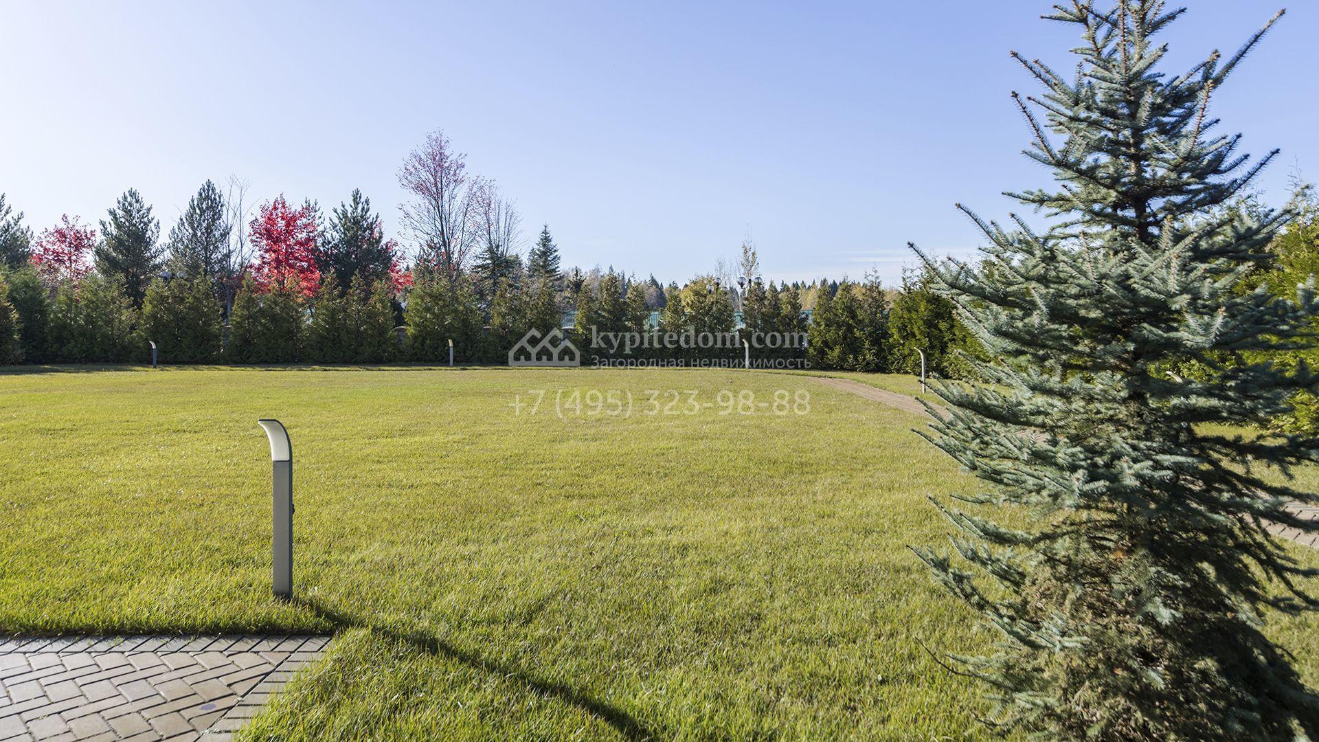 В коттедже спланировали уютную гостиную-кухню-столовую с камином и TV-зоной с выходом на террасу, 3 спальни, кабинет и 2 гардеробные. Рядом с основным зданием возведены навес на 3 машины и обустроенная беседка для барбекю. В рамках ландшафтного дизайна на участке засеян газон, высажены хвойные деревья, дорожки вымощены брусчаткой и оборудовано уличное освещение.