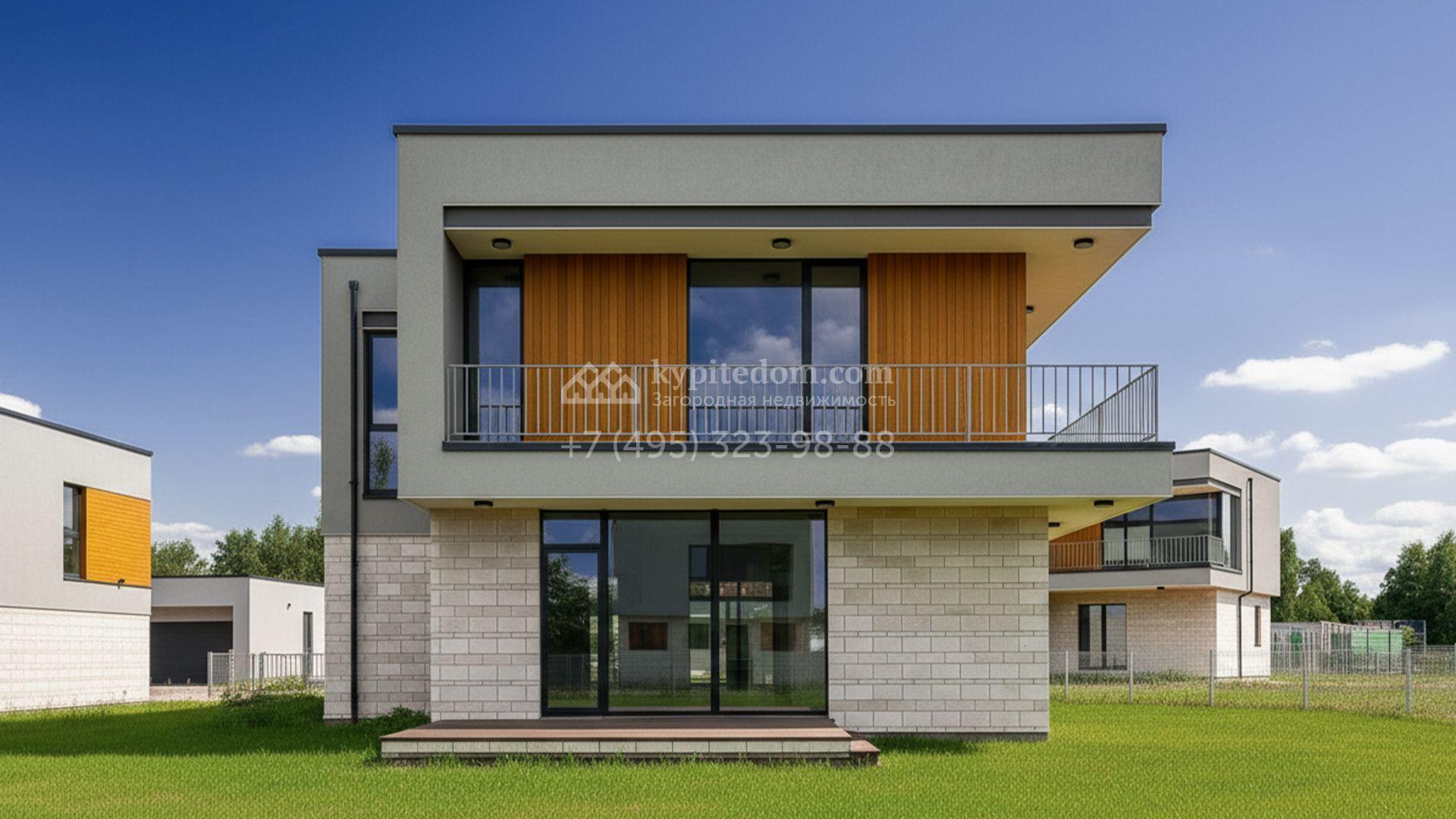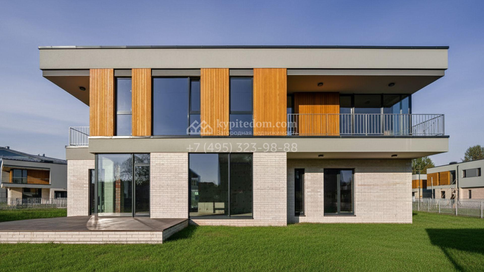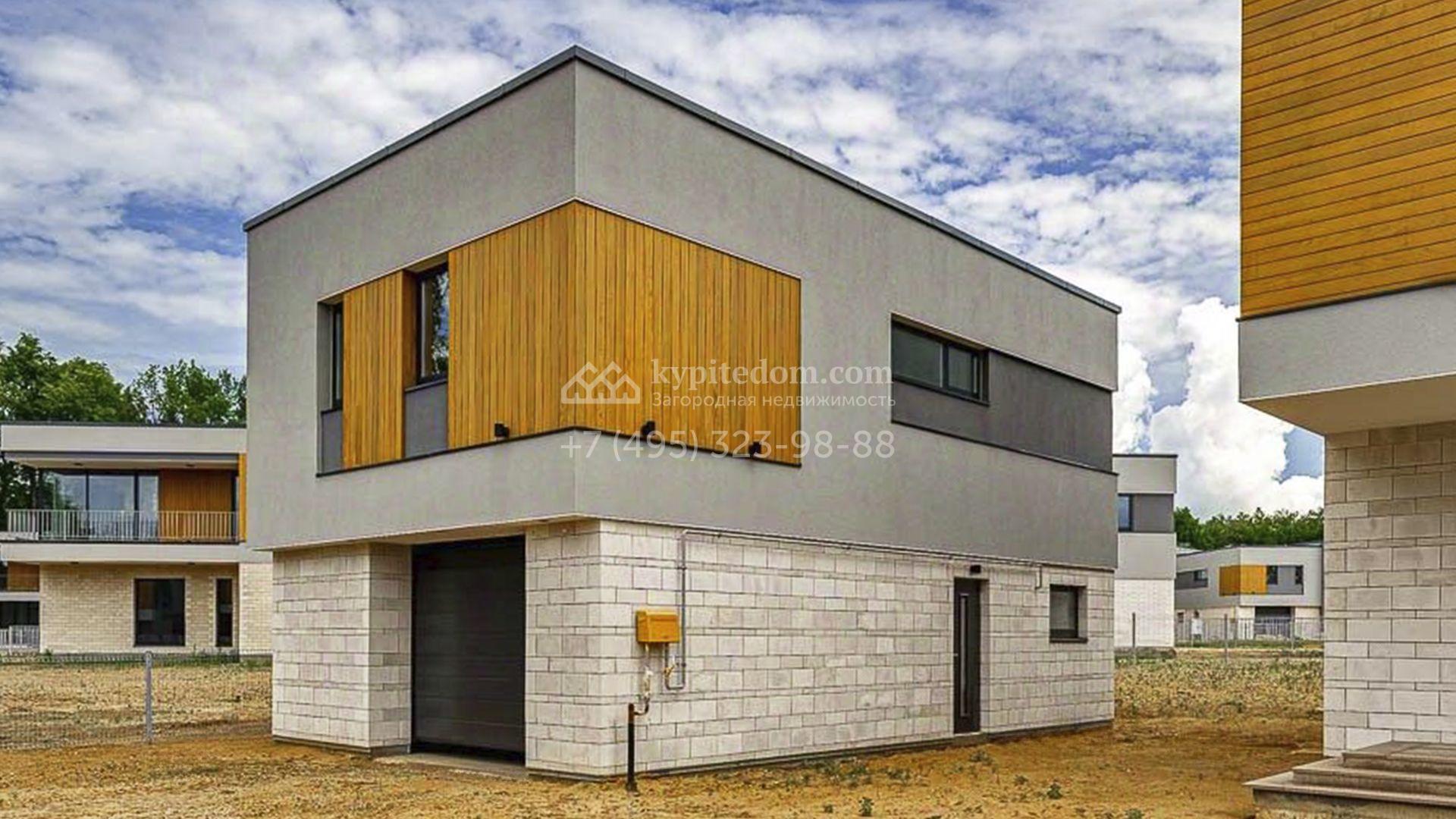 Загородный дом площадью 363 м² построен на полевом участке 15,1 соток. Фасад выполнен в современном стиле и облицован белой штукатуркой, клинкерной плиткой и декорирован вставками под дерево. Коттедж представлен без отделки, что позволяет реализовать индивидуальный дизайн-проект. Участок с газоном окружен изгородью.