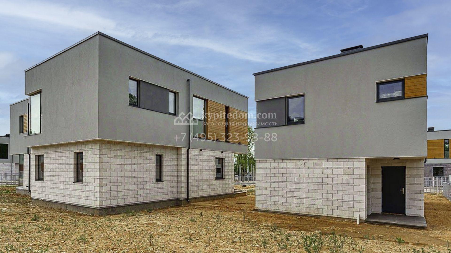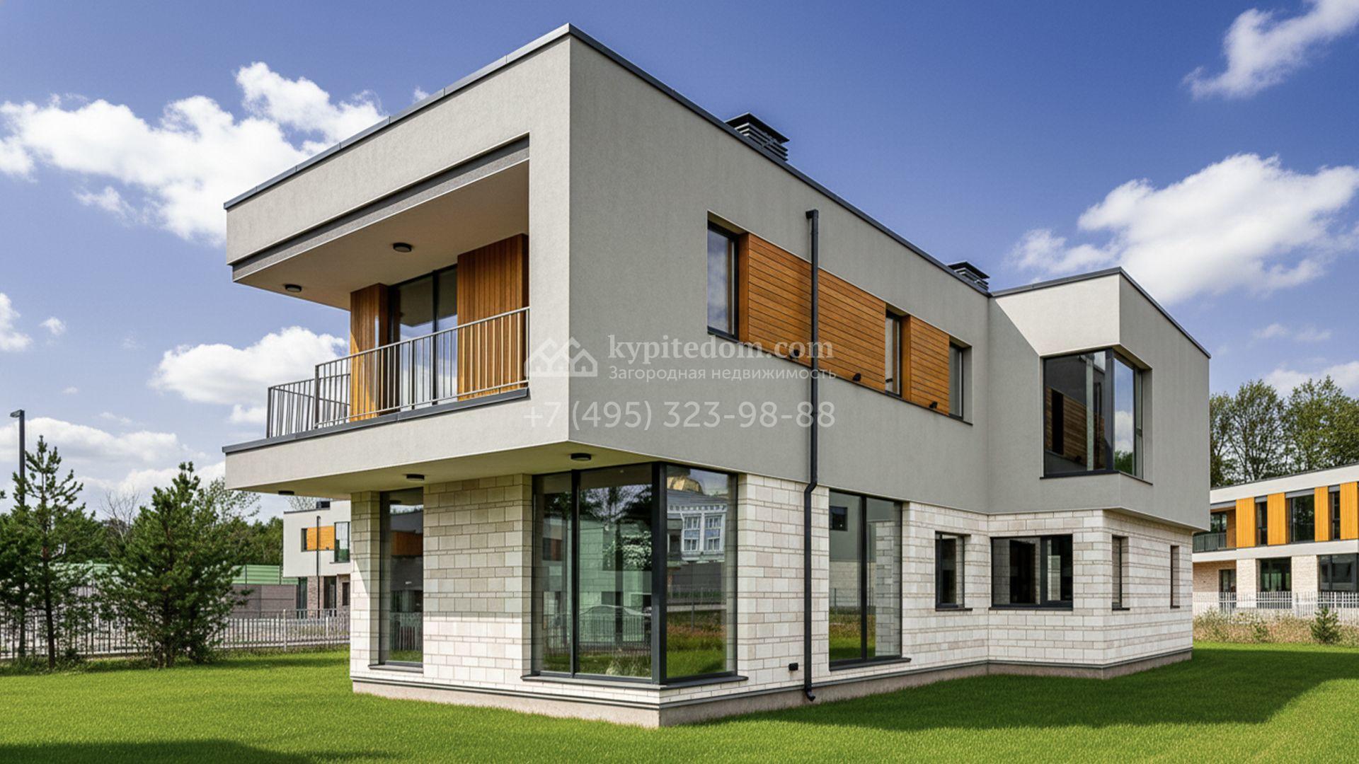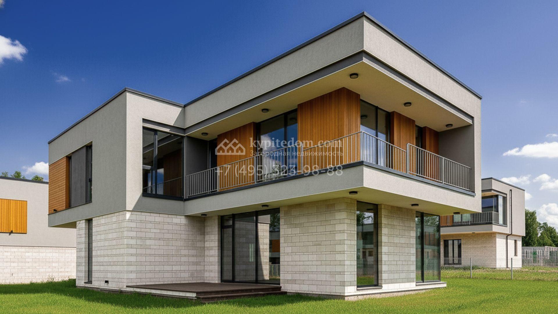 Загородный дом площадью 363 м² построен на полевом участке 15,1 соток. Фасад выполнен в современном стиле и облицован белой штукатуркой, клинкерной плиткой и декорирован вставками под дерево. Коттедж представлен без отделки, что позволяет реализовать индивидуальный дизайн-проект. Участок с газоном окружен изгородью.