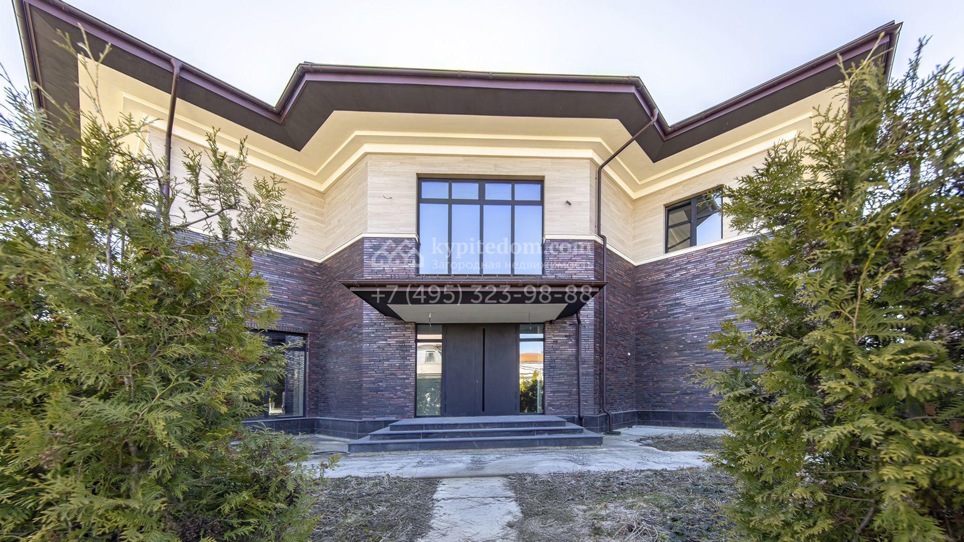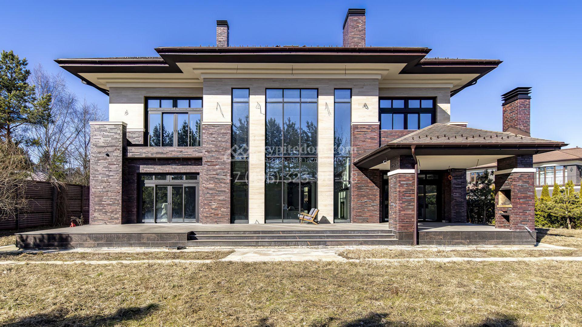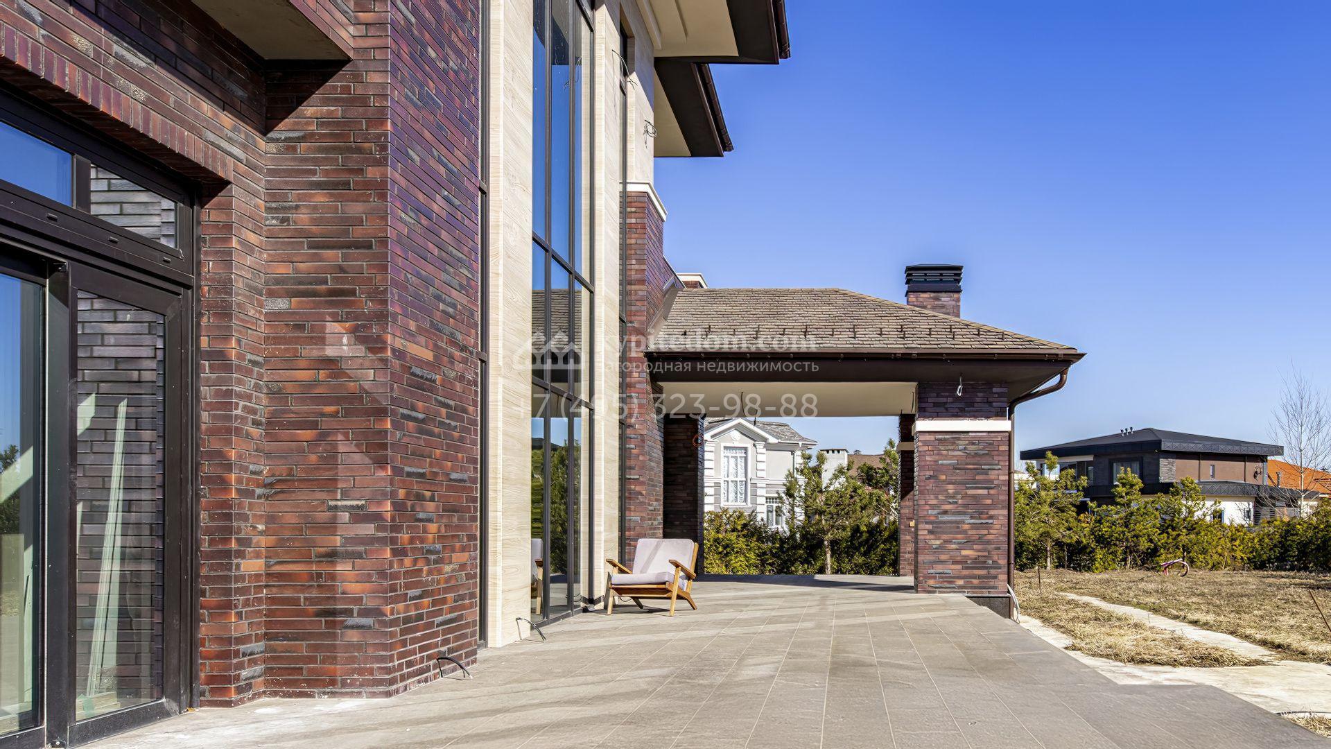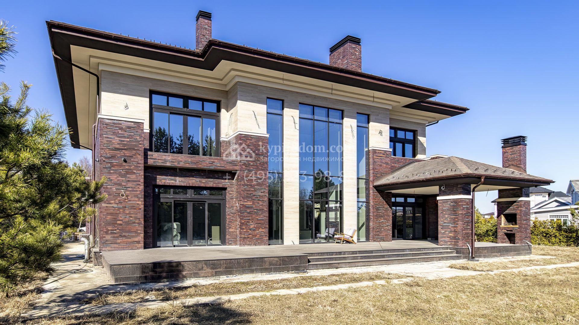 Трехэтажный коттедж площадью 541 м² расположен на полевом участке 20 соток. Современный фасад здания с большой площадью остекления демонстрирует гармоничное сочетание темного кирпича и светлого камня. Выступающая кровля, колонны, массивные карнизы и террасы подчёркивают тщательно продуманный архитектурный стиль. Дом оснащен подогревом полов, приточно-вытяжной вентиляцией и системой кондиционирования Daikin.