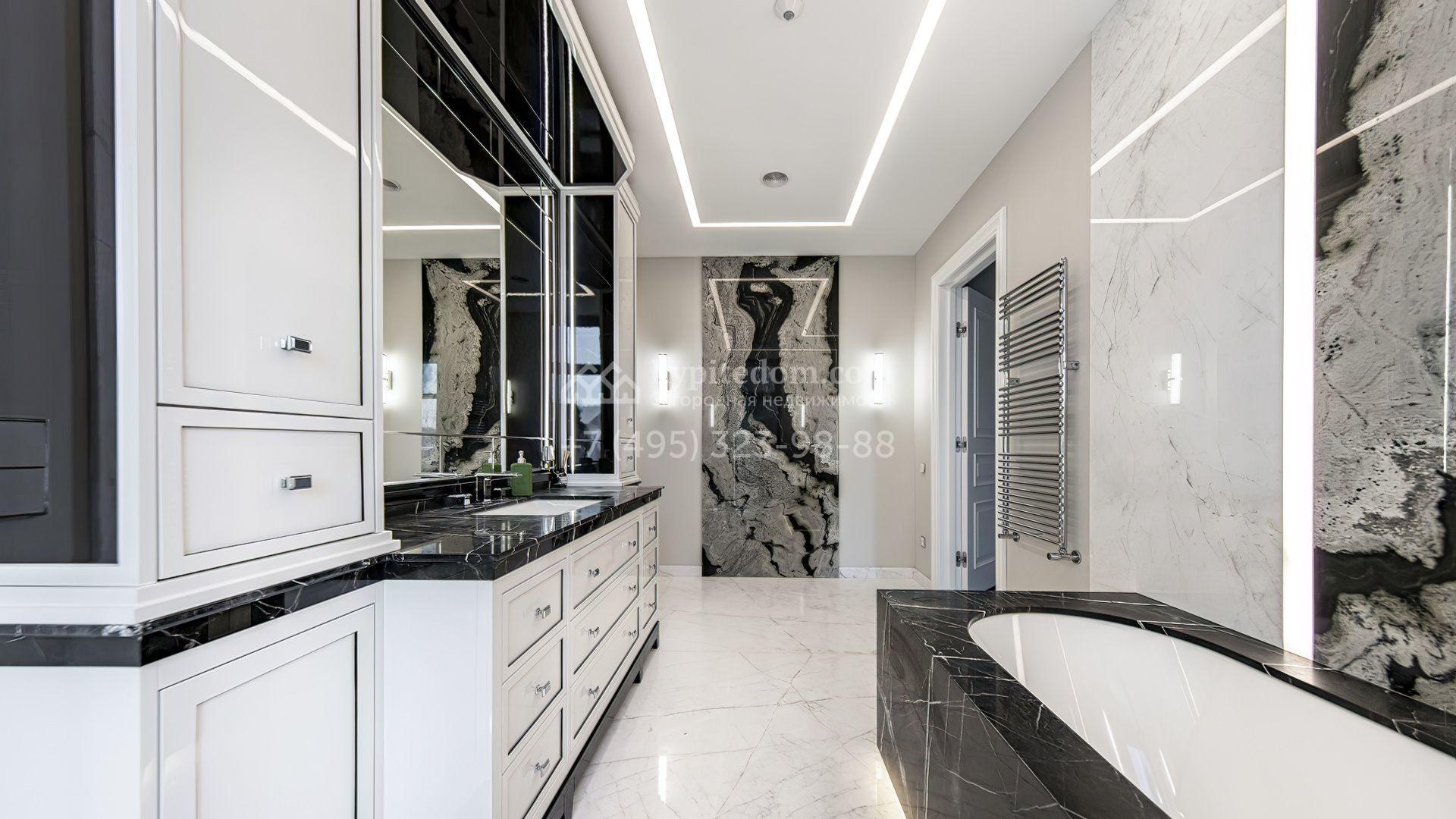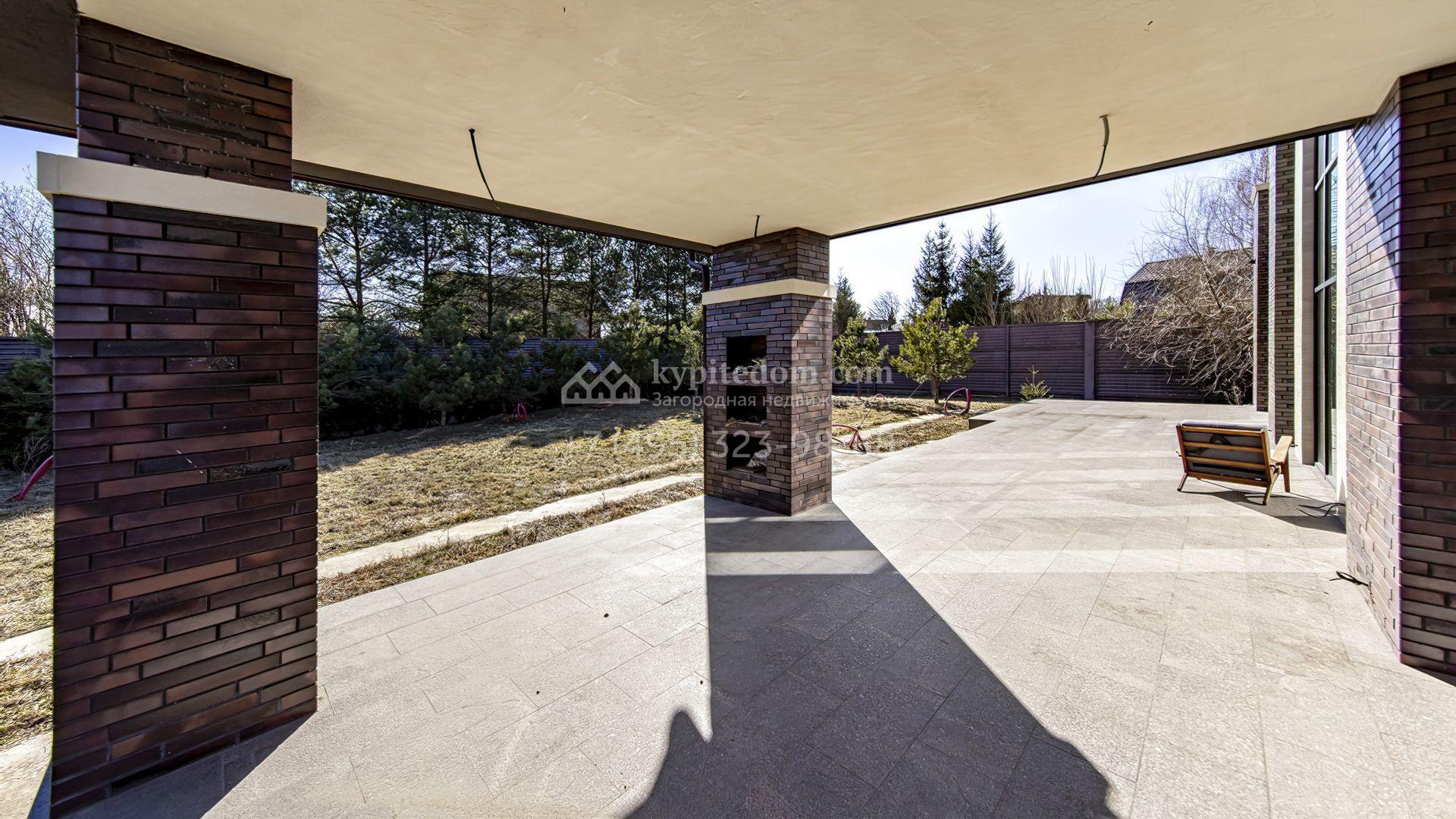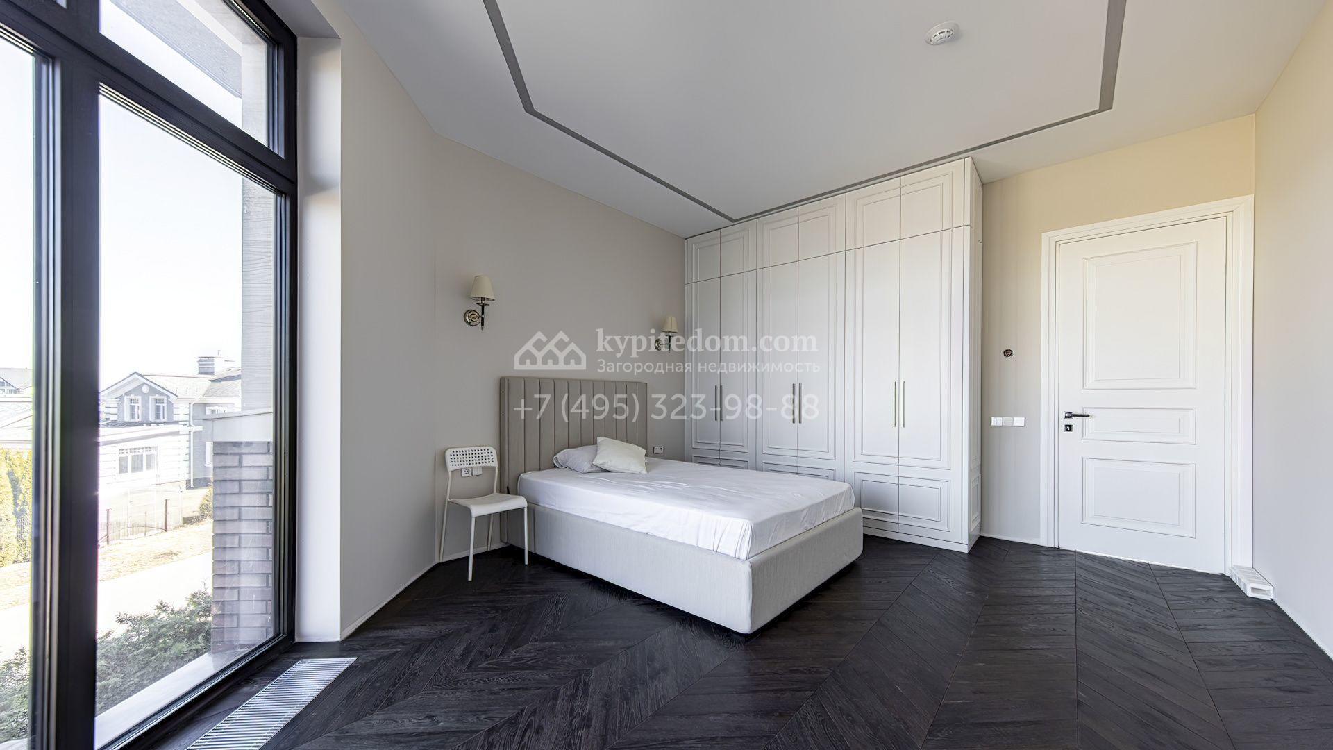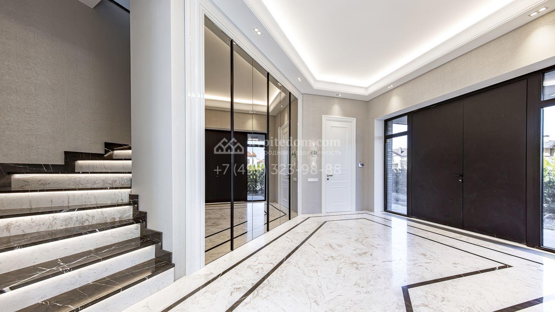 Трехэтажный коттедж площадью 541 м² расположен на полевом участке 20 соток. Современный фасад здания с большой площадью остекления демонстрирует гармоничное сочетание темного кирпича и светлого камня. Выступающая кровля, колонны, массивные карнизы и террасы подчёркивают тщательно продуманный архитектурный стиль. Дом оснащен подогревом полов, приточно-вытяжной вентиляцией и системой кондиционирования Daikin.