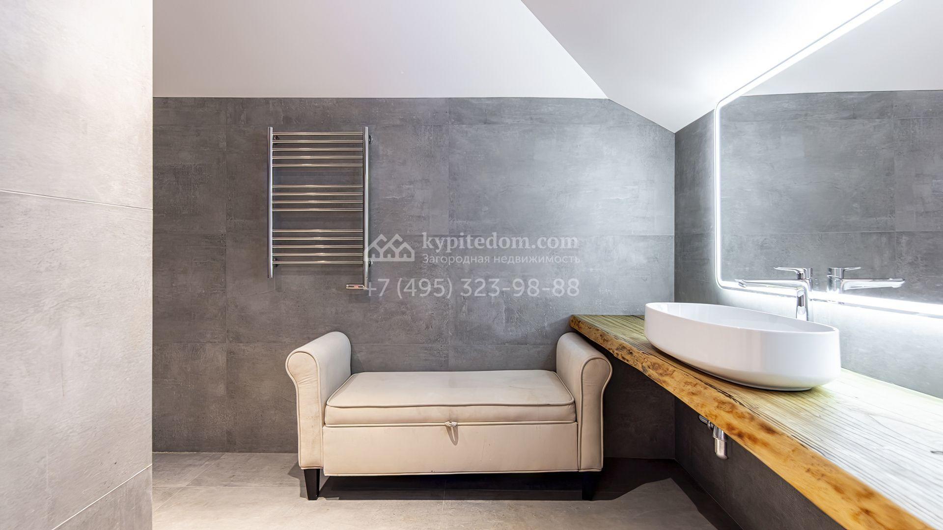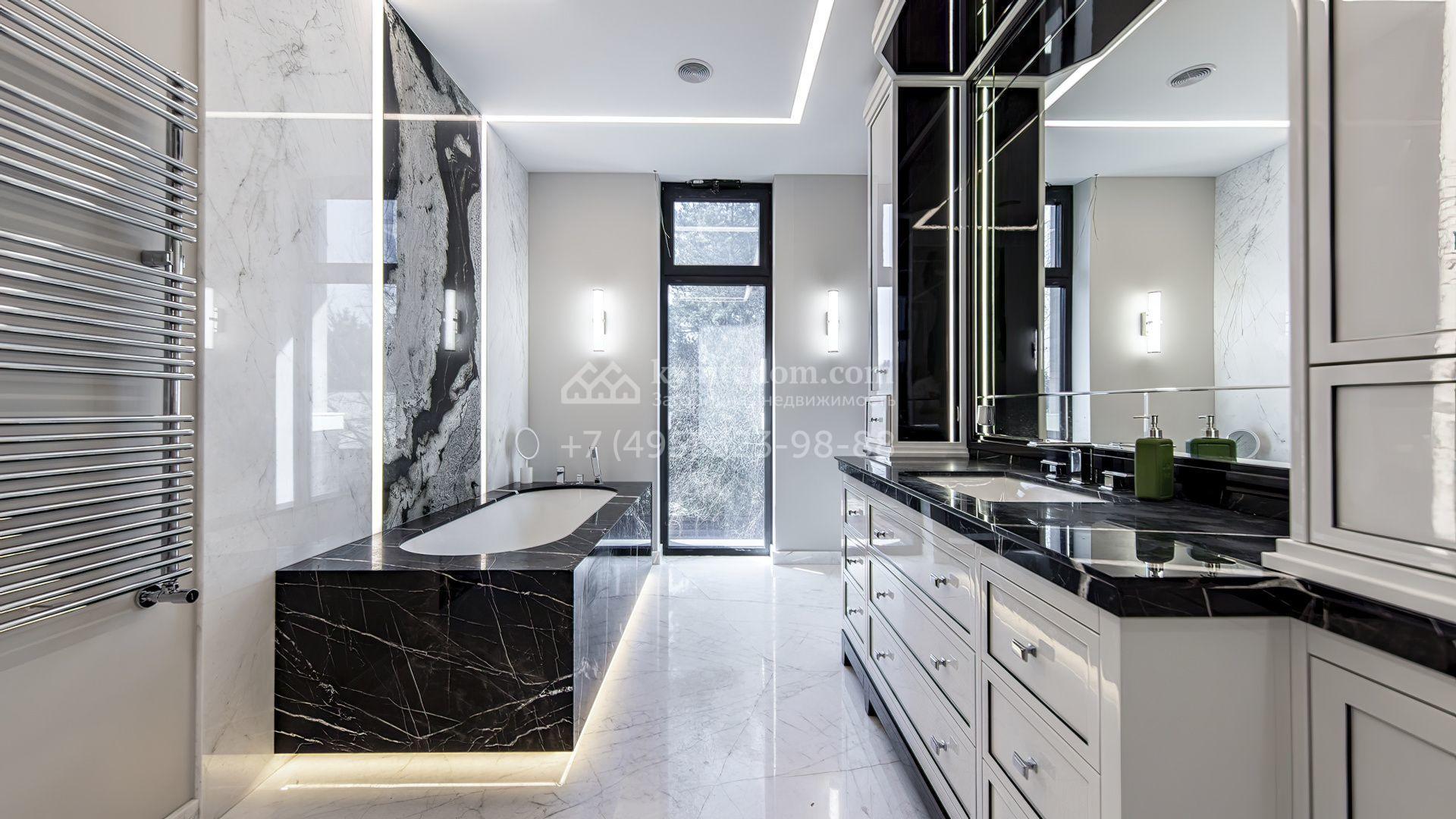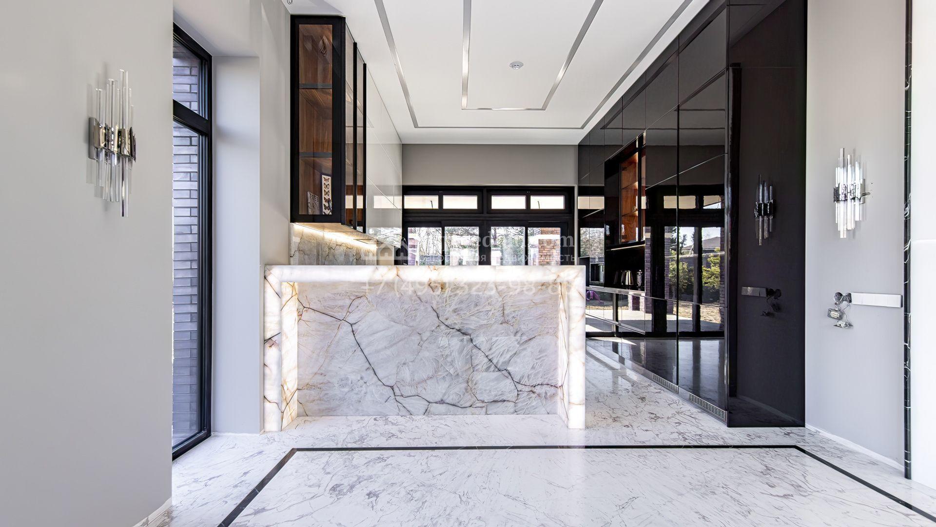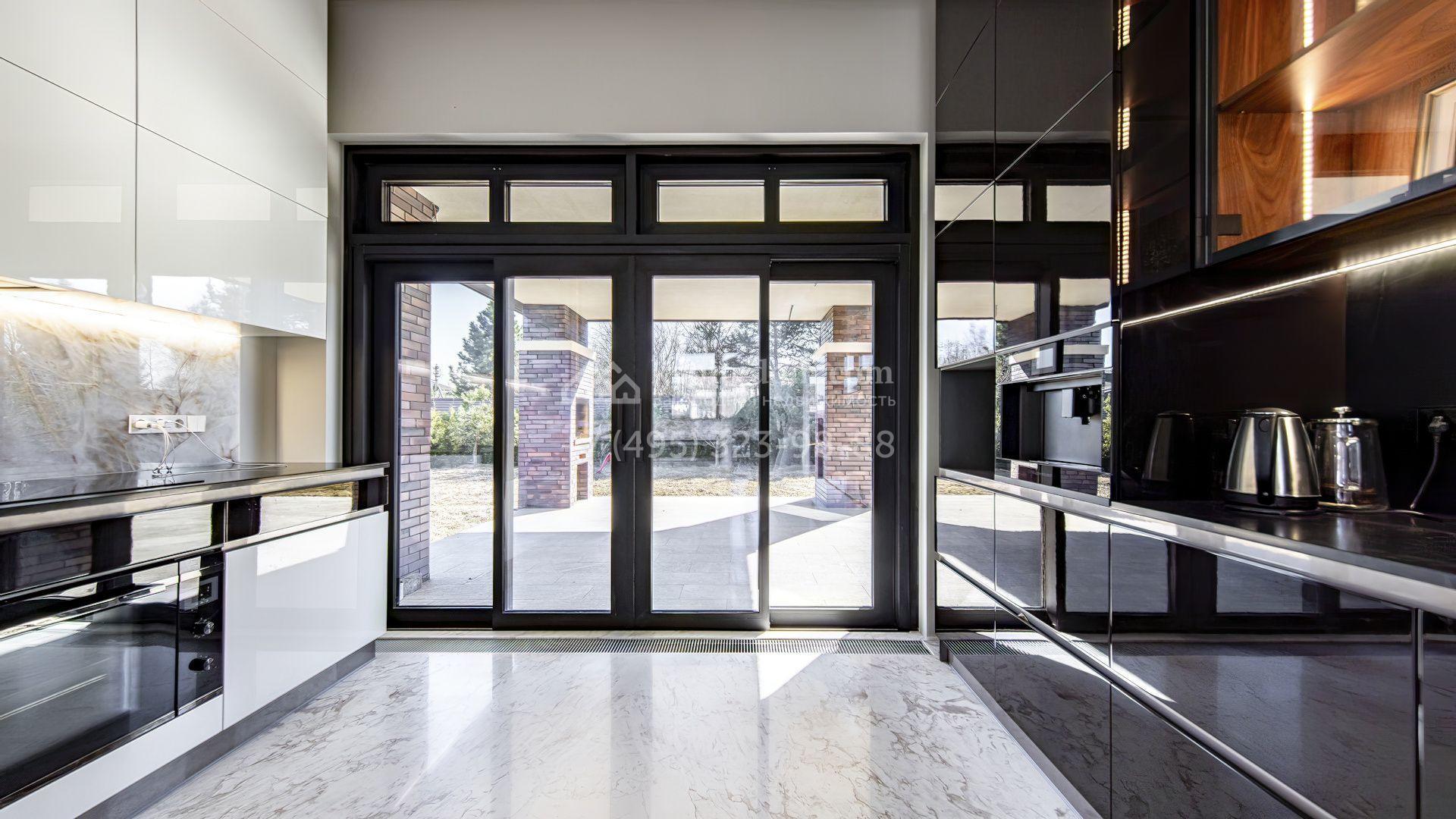 Трехэтажный коттедж площадью 541 м² расположен на полевом участке 20 соток. Современный фасад здания с большой площадью остекления демонстрирует гармоничное сочетание темного кирпича и светлого камня. Выступающая кровля, колонны, массивные карнизы и террасы подчёркивают тщательно продуманный архитектурный стиль. Дом оснащен подогревом полов, приточно-вытяжной вентиляцией и системой кондиционирования Daikin.