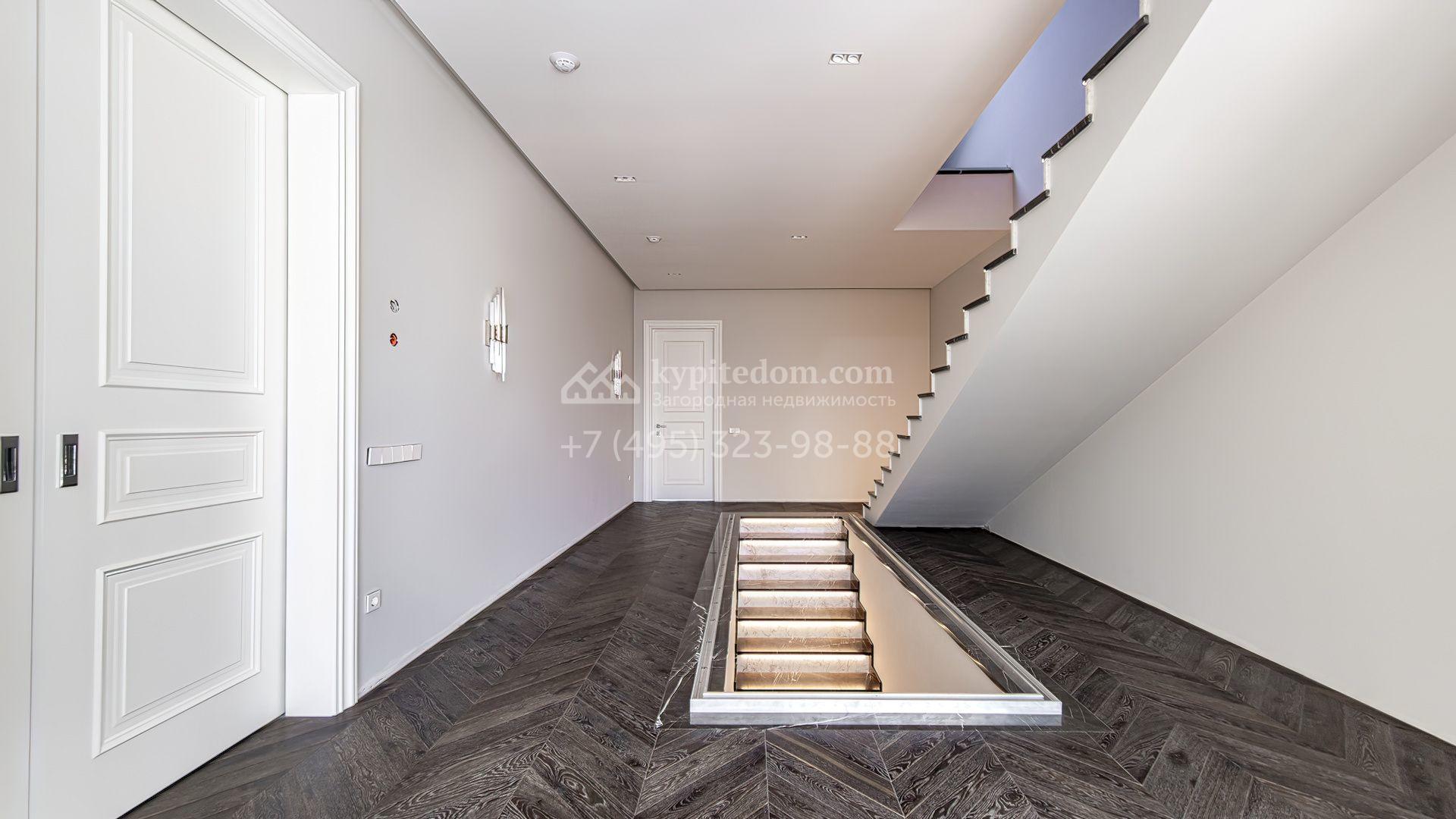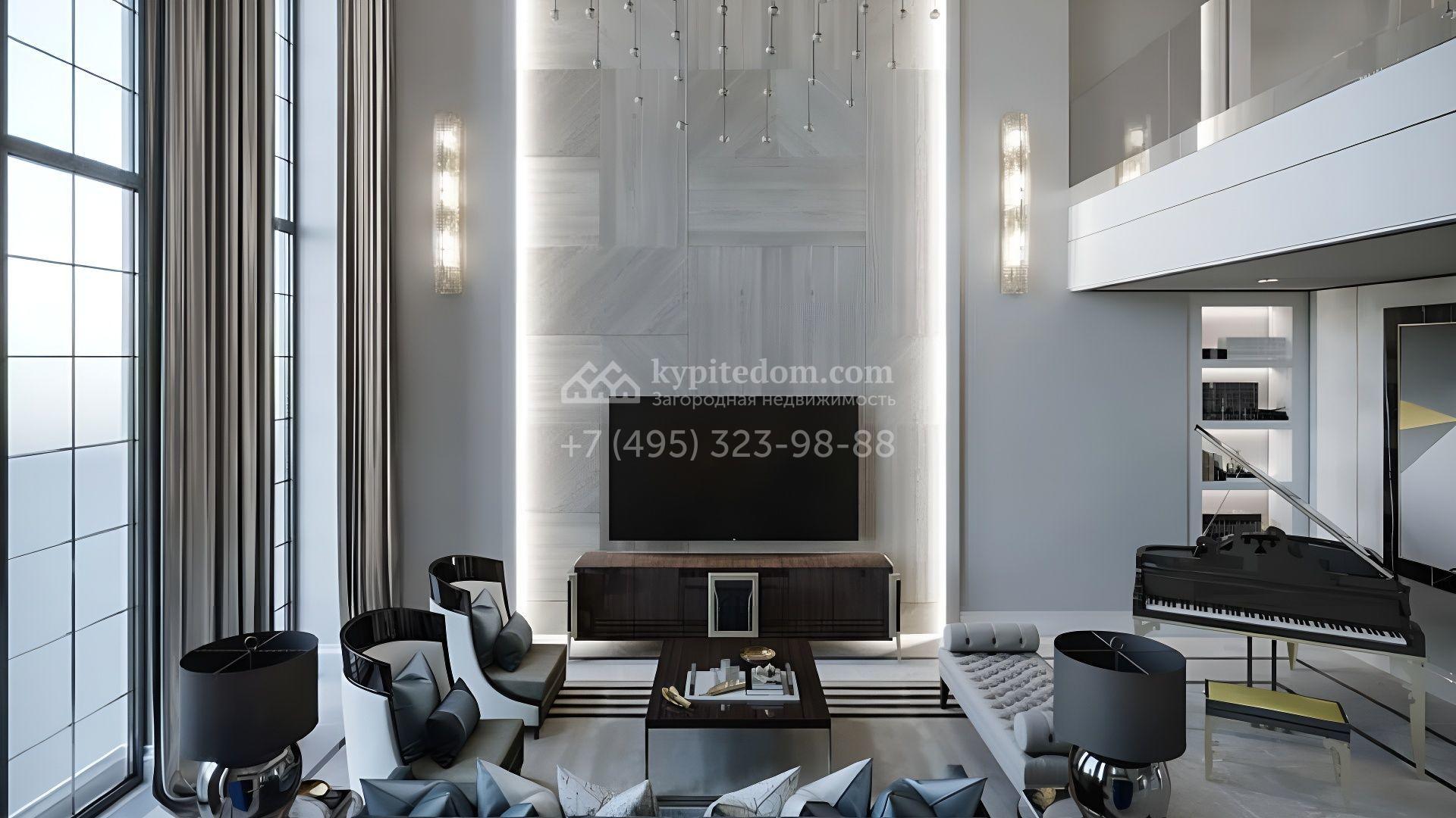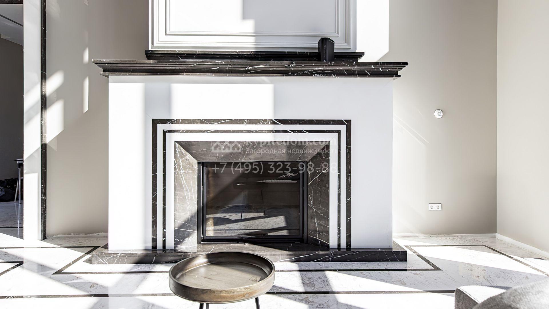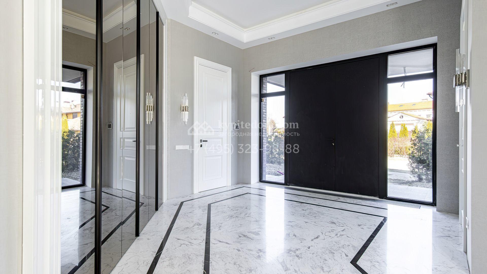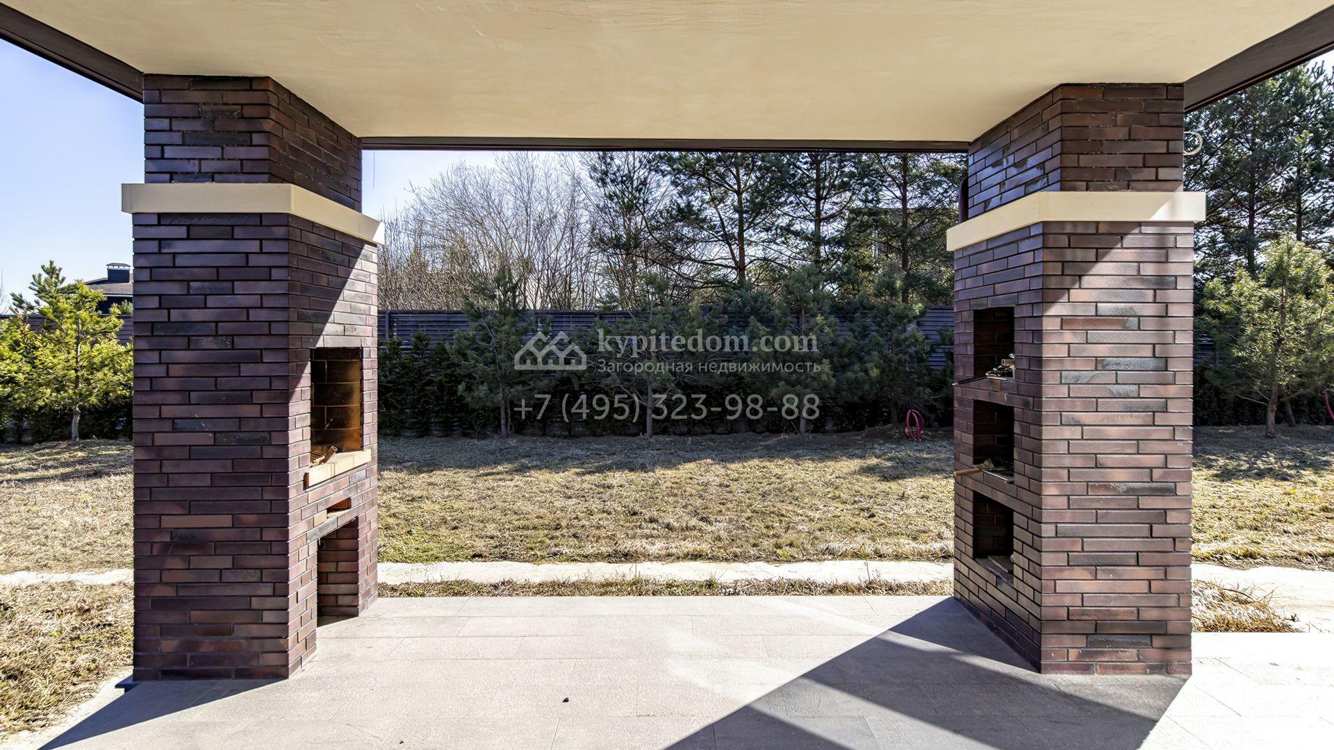 Планировка включает гостиную со вторым светом, камином и выходом на террасу с зоной барбекю, кухню-столовую, 4 спальни, кабинет, спортзал, библиотеку, а также комнату отдыха с хаммамом. На ухоженном участке засеян газон, проложены дорожки и высажены хвойные деревья. Перед домом организована просторная въездная группа для дополнительного комфорта.