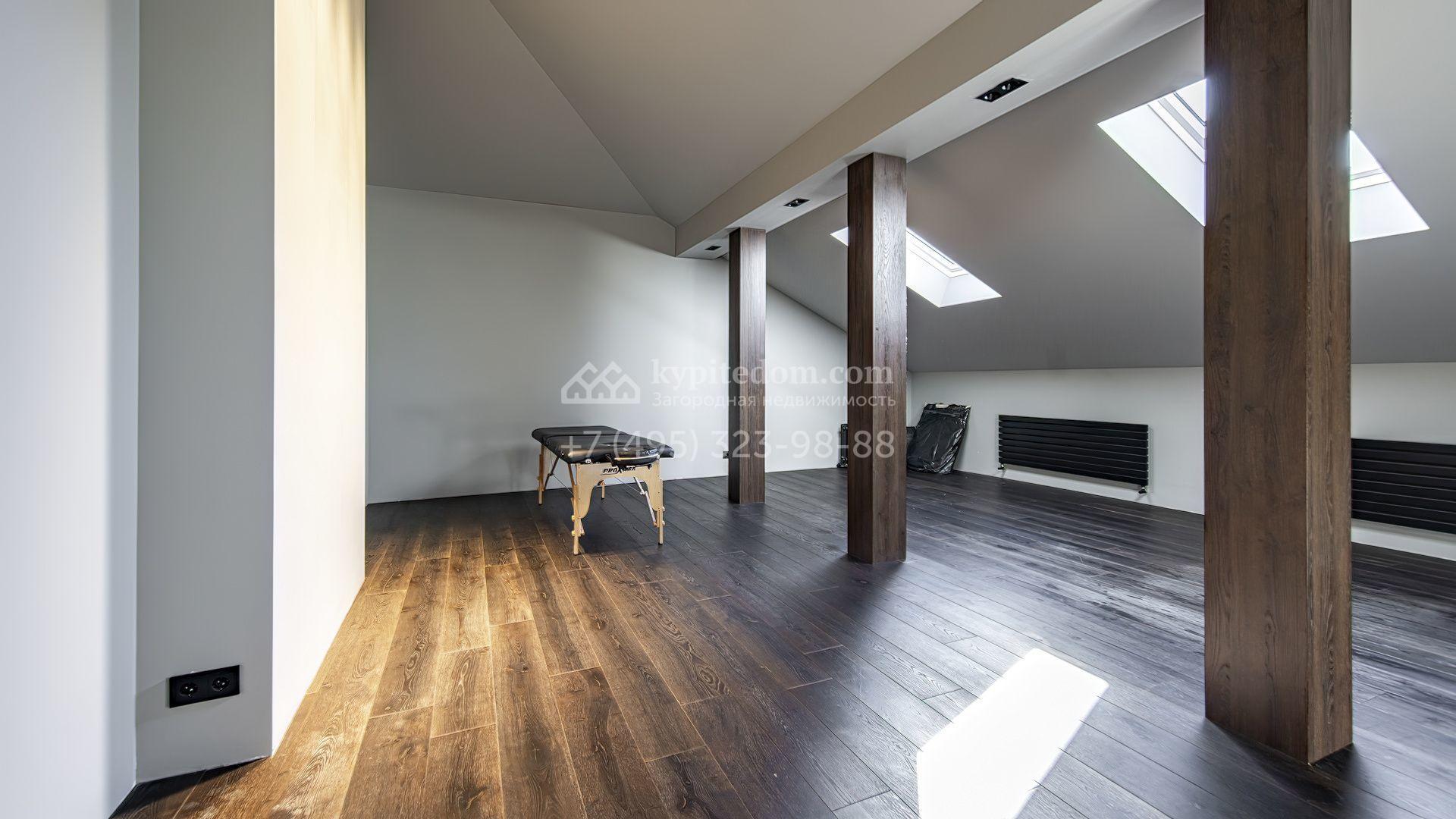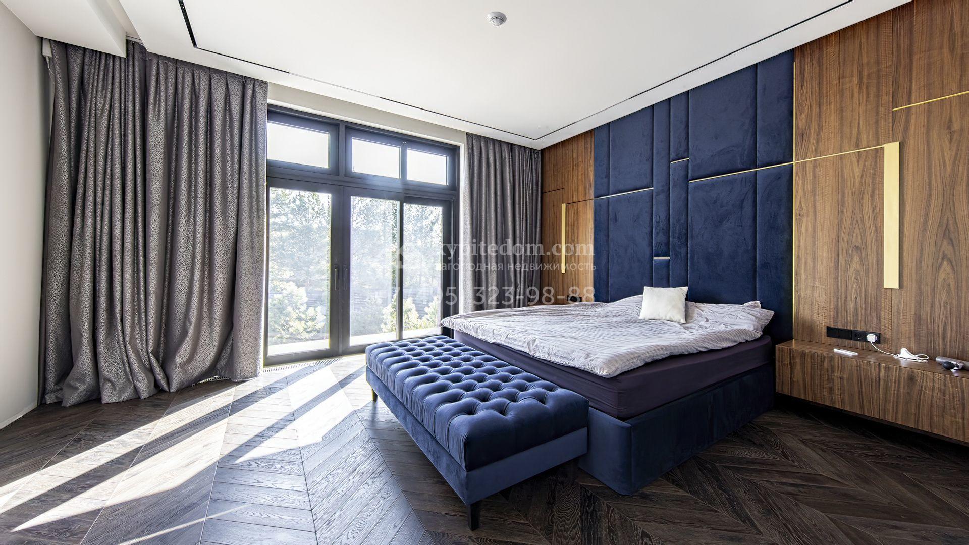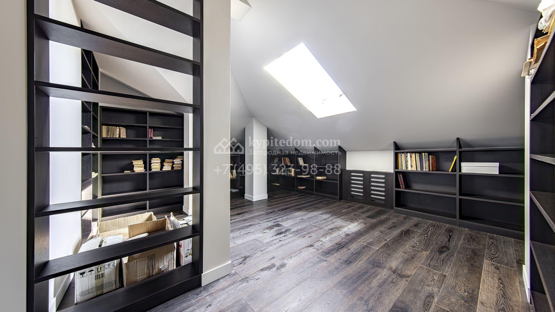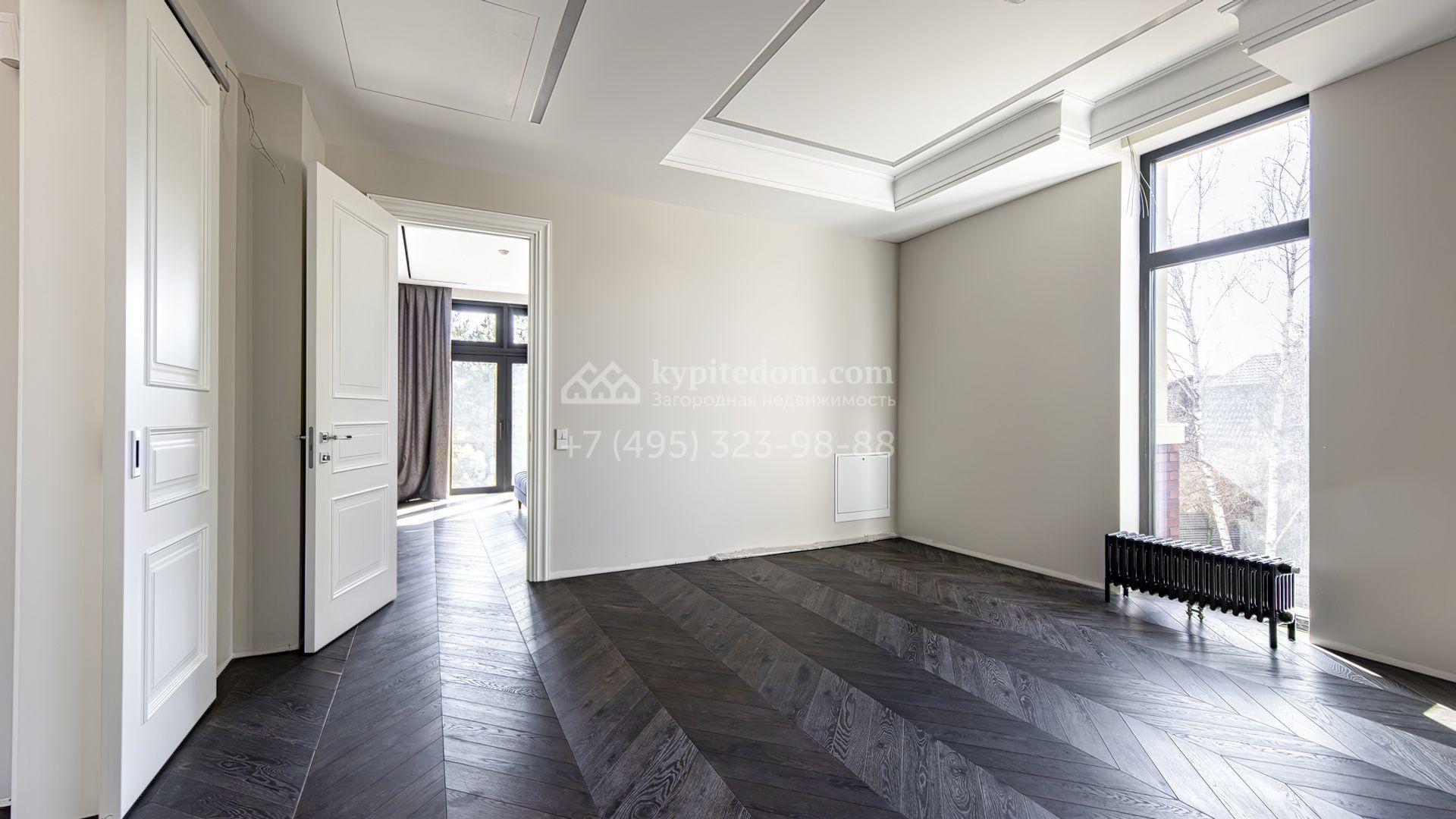 Планировка включает гостиную со вторым светом, камином и выходом на террасу с зоной барбекю, кухню-столовую, 4 спальни, кабинет, спортзал, библиотеку, а также комнату отдыха с хаммамом. На ухоженном участке засеян газон, проложены дорожки и высажены хвойные деревья. Перед домом организована просторная въездная группа для дополнительного комфорта.