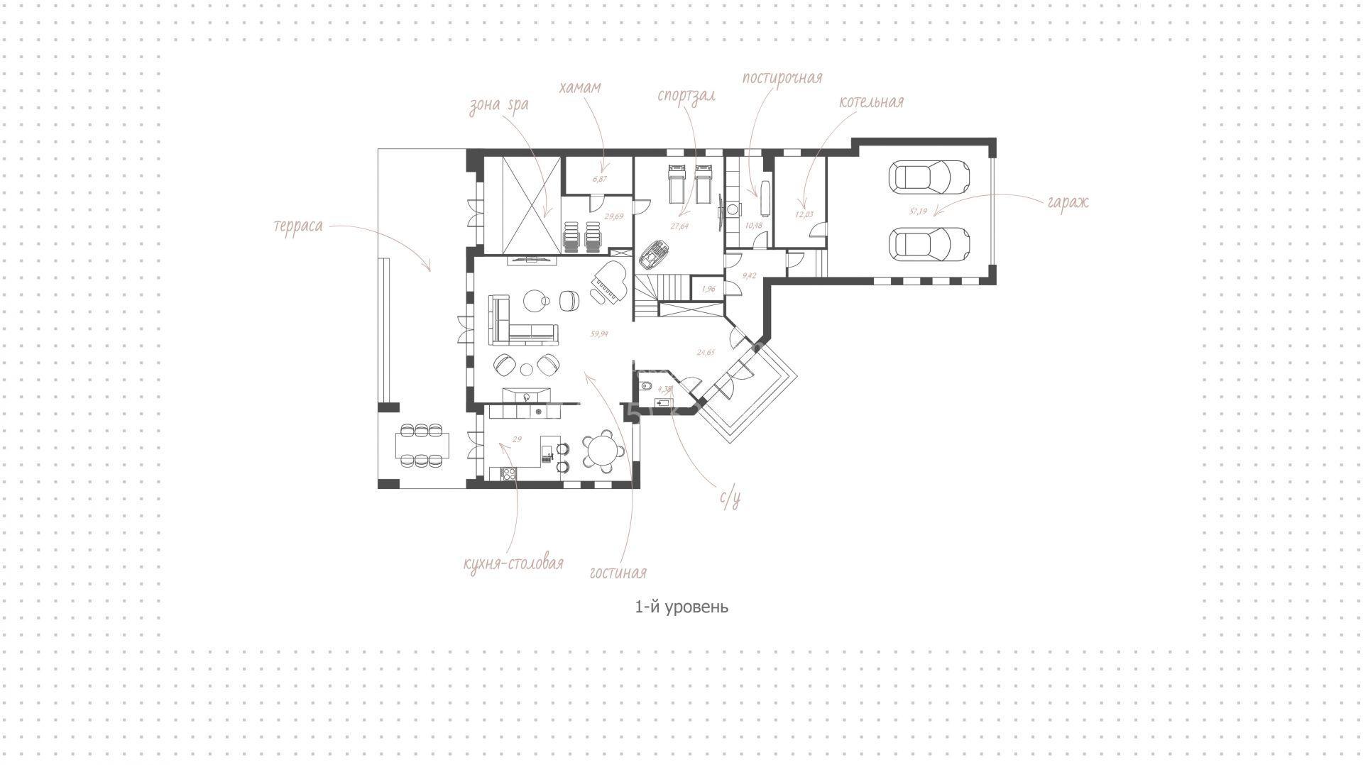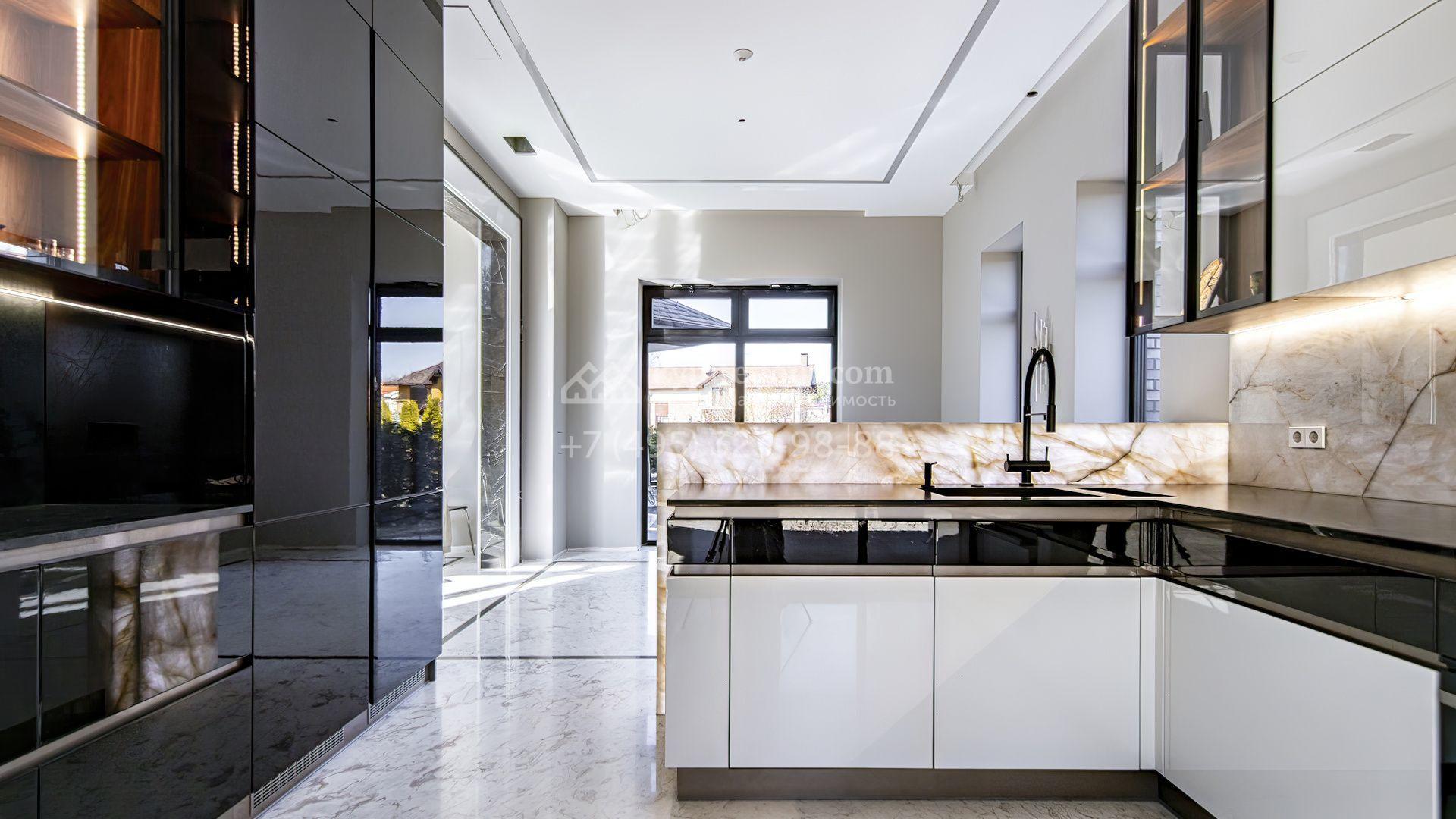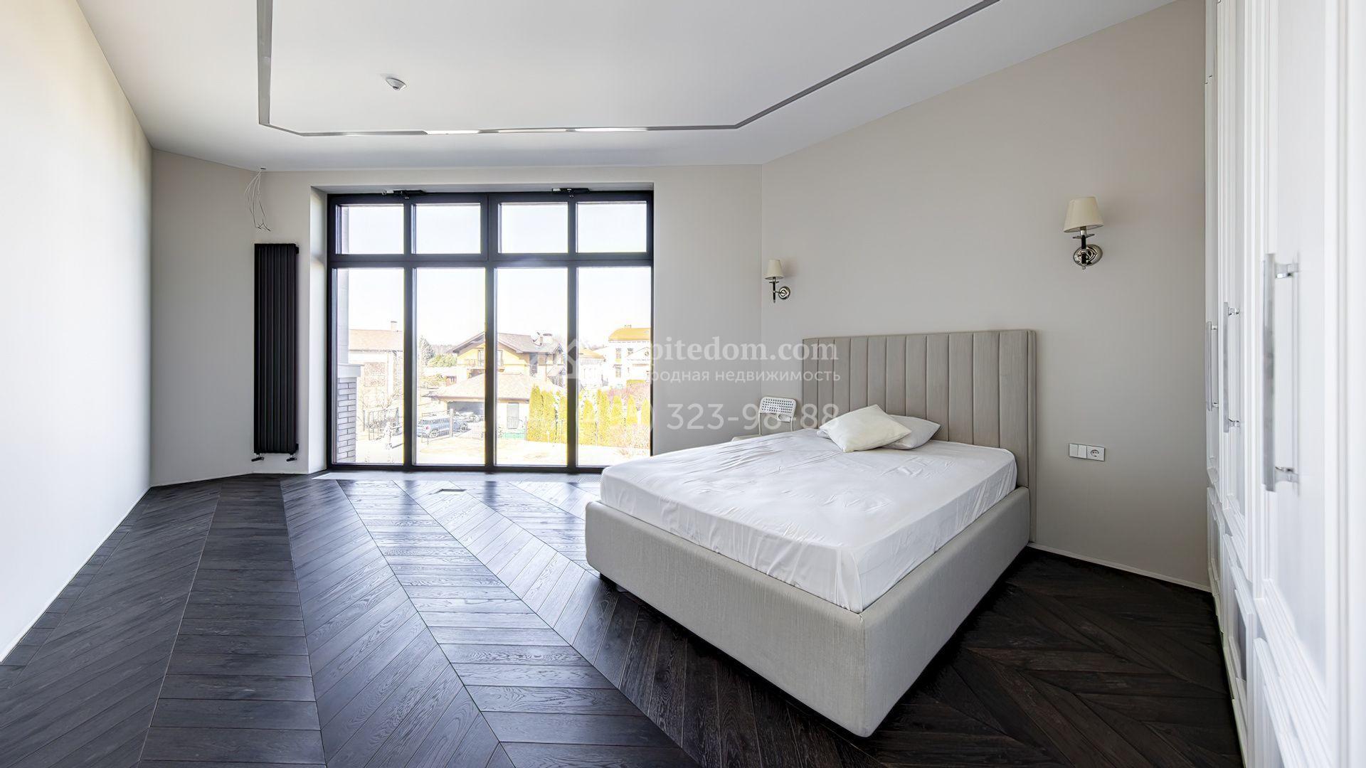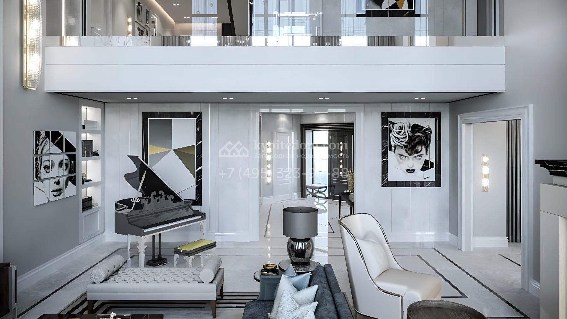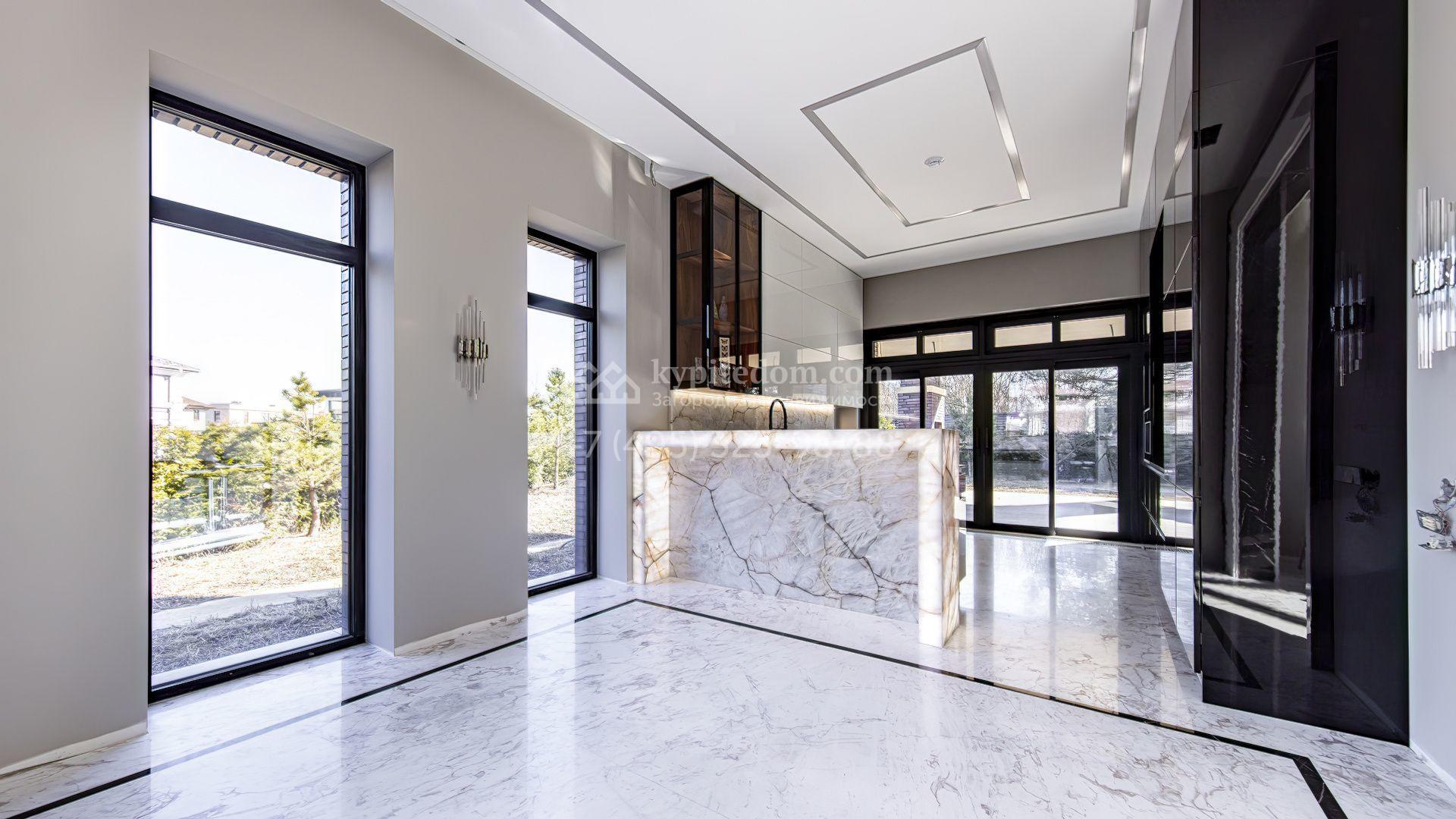 Планировка включает гостиную со вторым светом, камином и выходом на террасу с зоной барбекю, кухню-столовую, 4 спальни, кабинет, спортзал, библиотеку, а также комнату отдыха с хаммамом. На ухоженном участке засеян газон, проложены дорожки и высажены хвойные деревья. Перед домом организована просторная въездная группа для дополнительного комфорта.