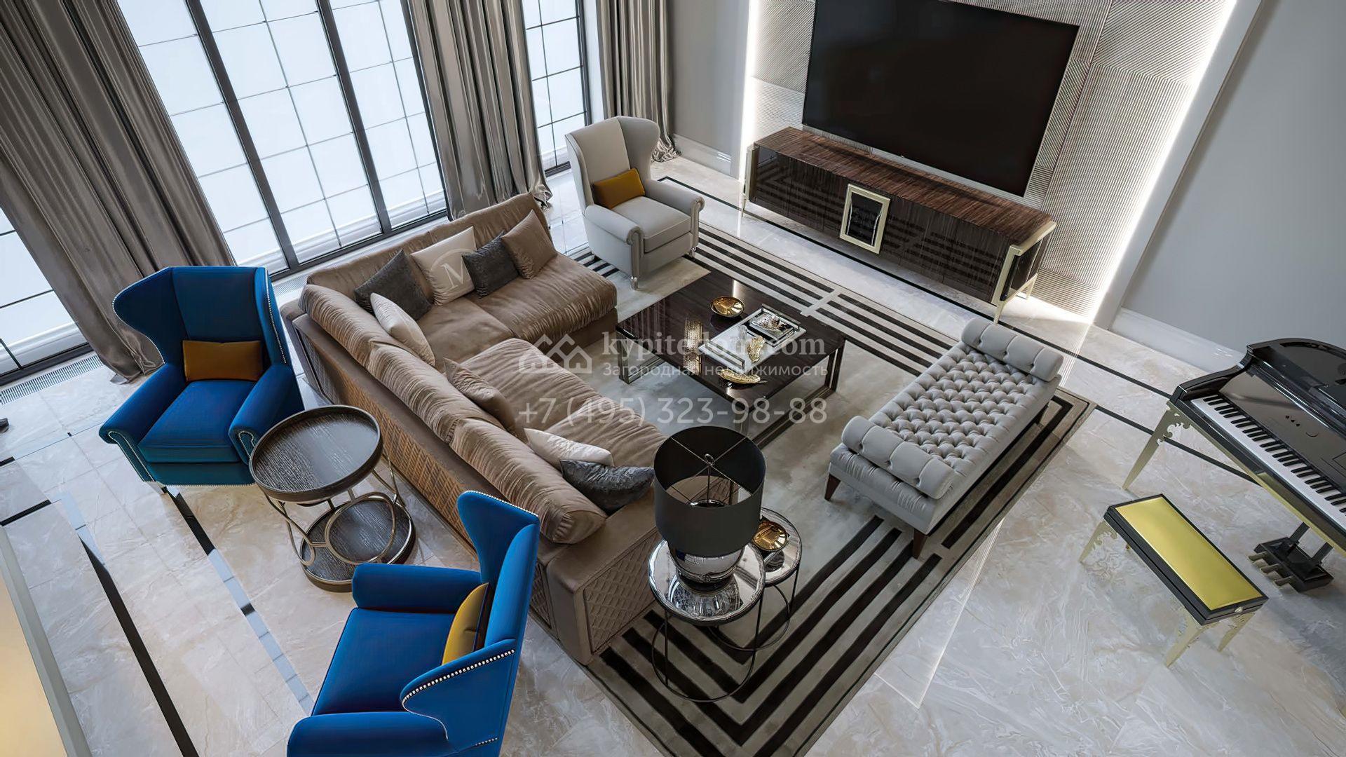 Интерьер создан по эксклюзивному проекту бюро «ТопДом». В отделке применены натуральные и высококачественные материалы — паркет, итальянский керамогранит, мрамор Thassos и Pietra Grey. Стены декорированы гипсовыми панно, мраморным слэбом «Тигровый глаз», тканевыми и зеркальными панелями с металлическими деталями. Кухня оборудована гарнитуром из кварцевого агломерата Patagonia и встраиваемой техникой Kuppersbusch.
