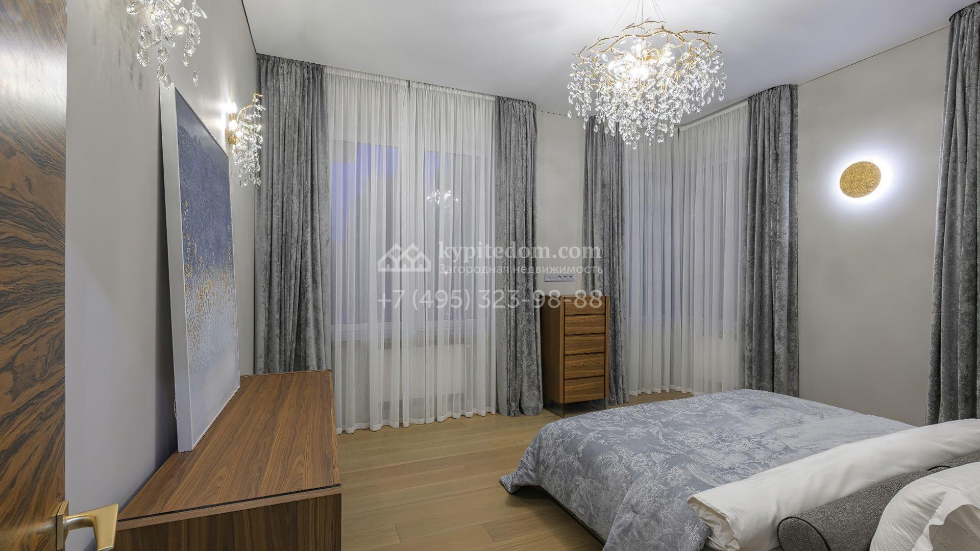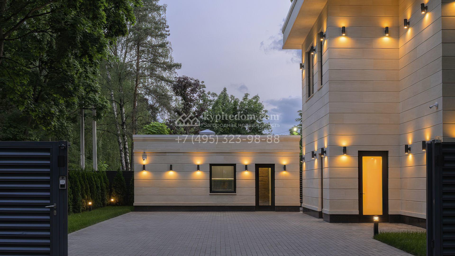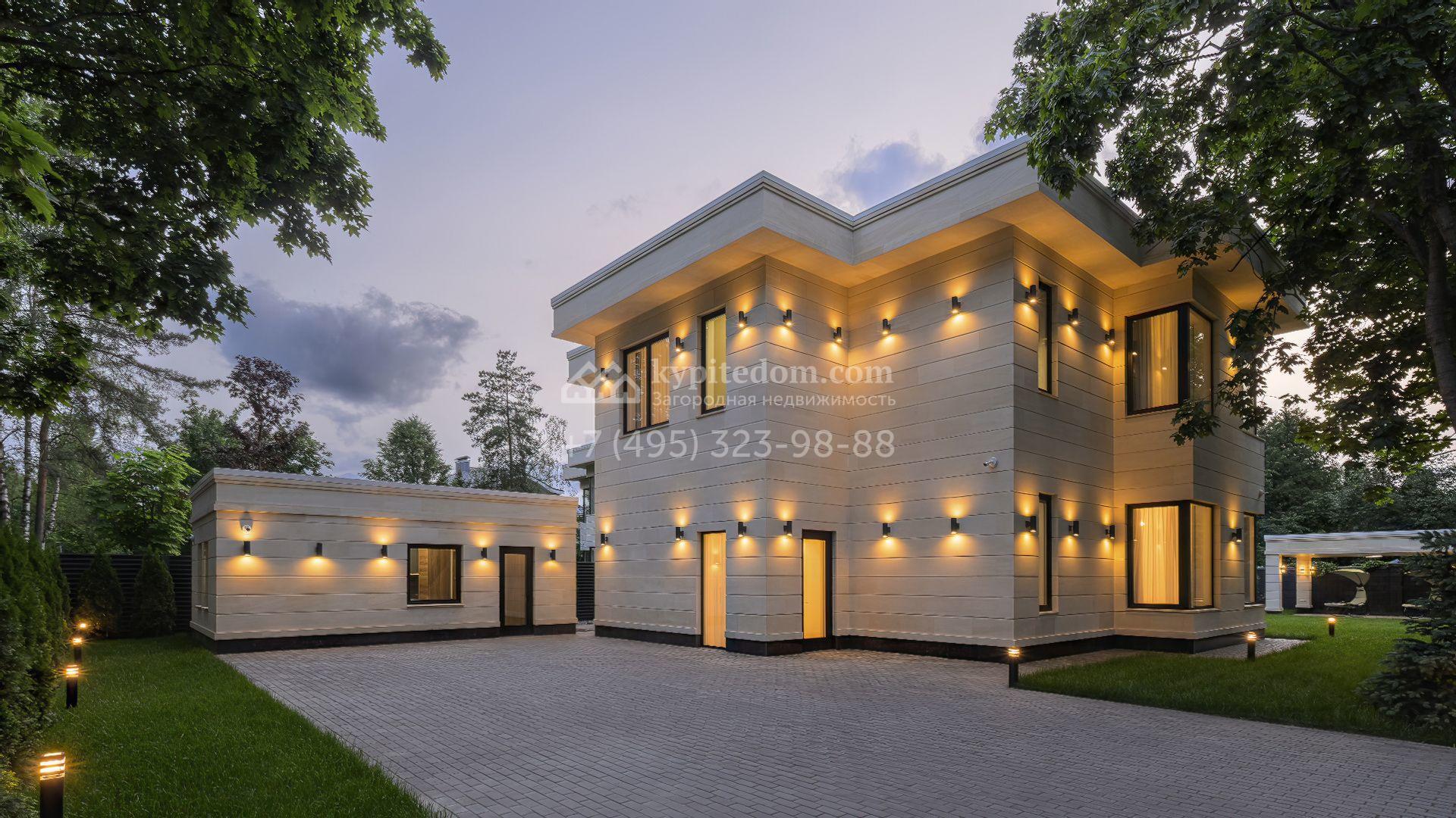 Планировка включает кухню-гостиную-столовую, кабинет, гардеробную, санузел и технические помещения на первом этаже. На втором уровне расположены три спальни с собственными санузлами и гардеробными. Участок благоустроен — засеян газон, высажены декоративные и плодовые деревья, кустарники, организован автополив. Для отдыха предусмотрена беседка, а также отдельный гостевой дом площадью 50 м² с двумя спальнями и кухней. Оставить автомобили можно на паркинге, рассчитанном на девять машиномест.