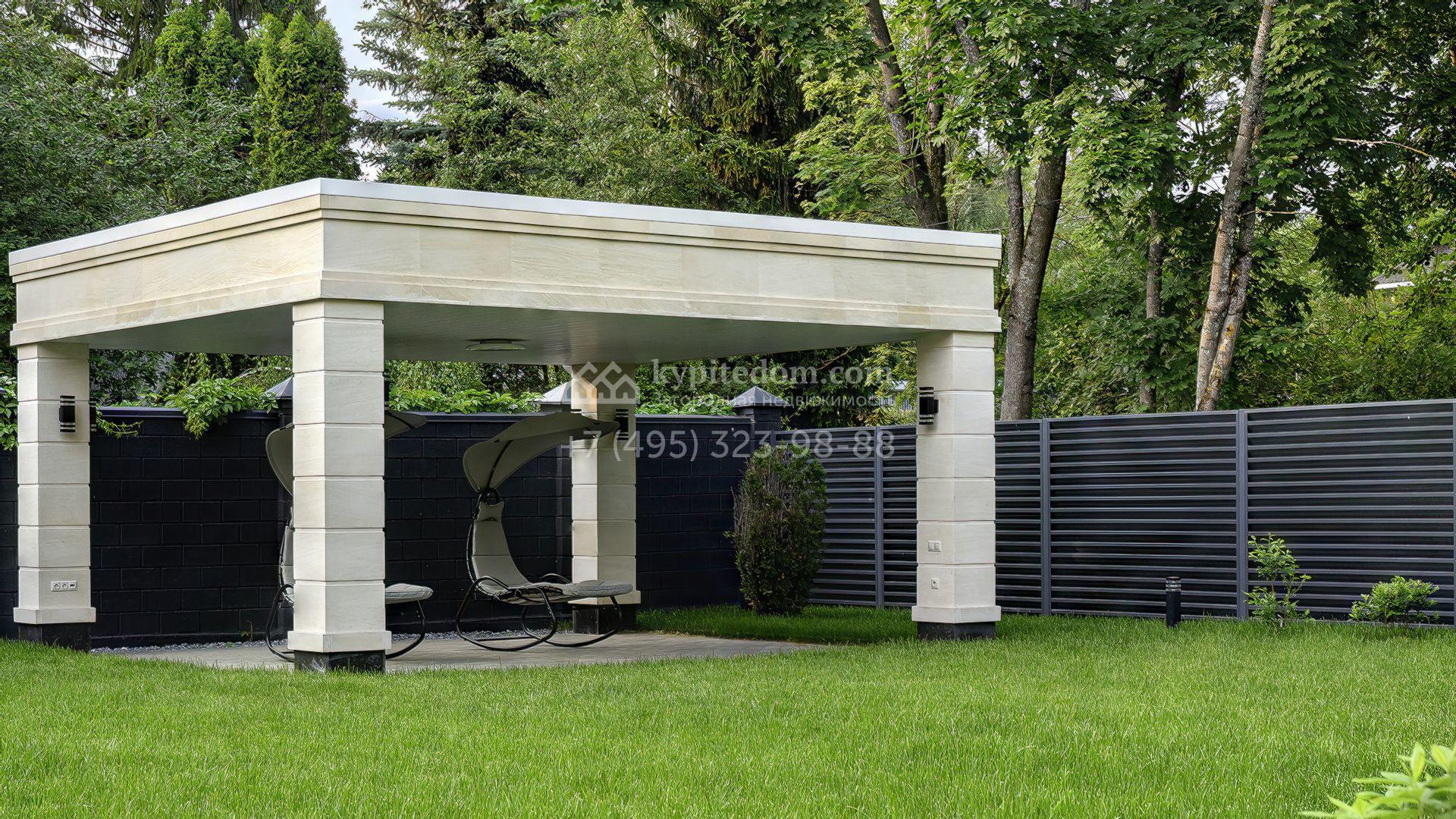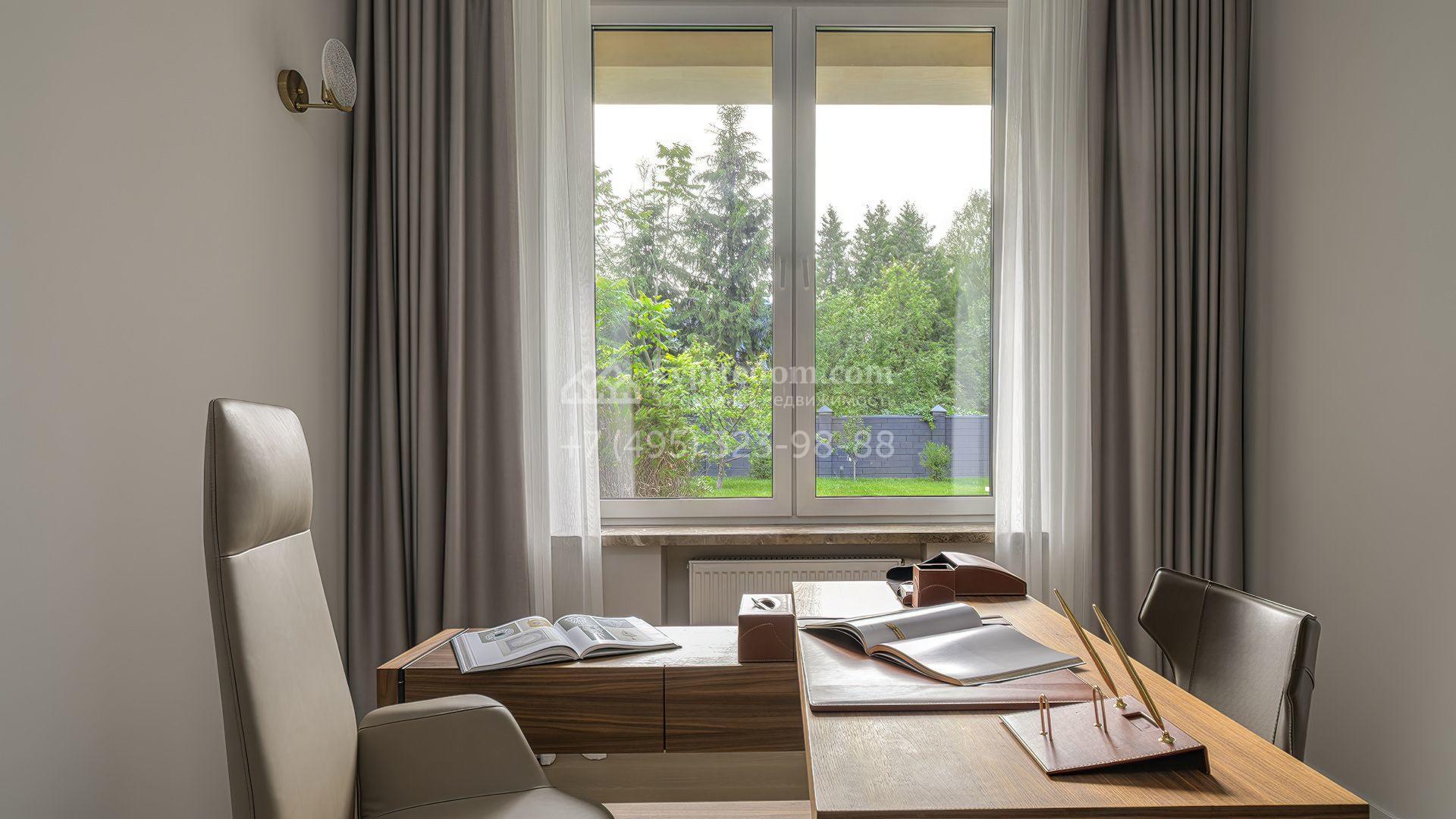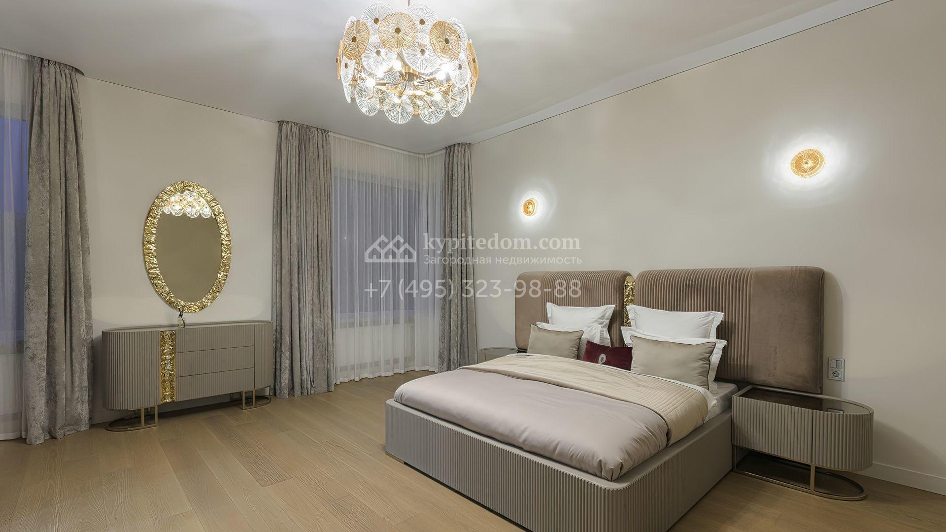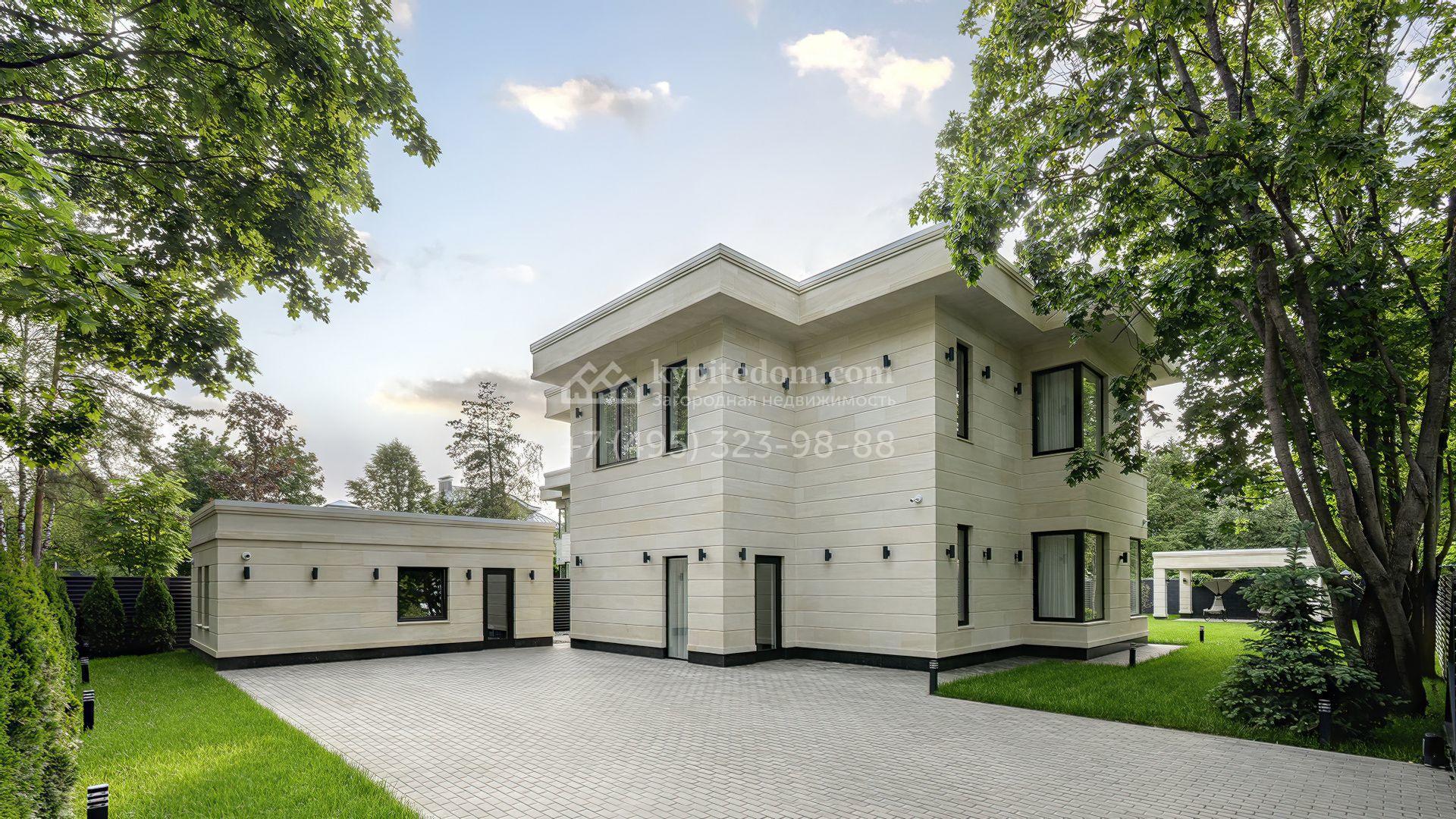 Планировка включает кухню-гостиную-столовую, кабинет, гардеробную, санузел и технические помещения на первом этаже. На втором уровне расположены три спальни с собственными санузлами и гардеробными. Участок благоустроен — засеян газон, высажены декоративные и плодовые деревья, кустарники, организован автополив. Для отдыха предусмотрена беседка, а также отдельный гостевой дом площадью 50 м² с двумя спальнями и кухней. Оставить автомобили можно на паркинге, рассчитанном на девять машиномест.