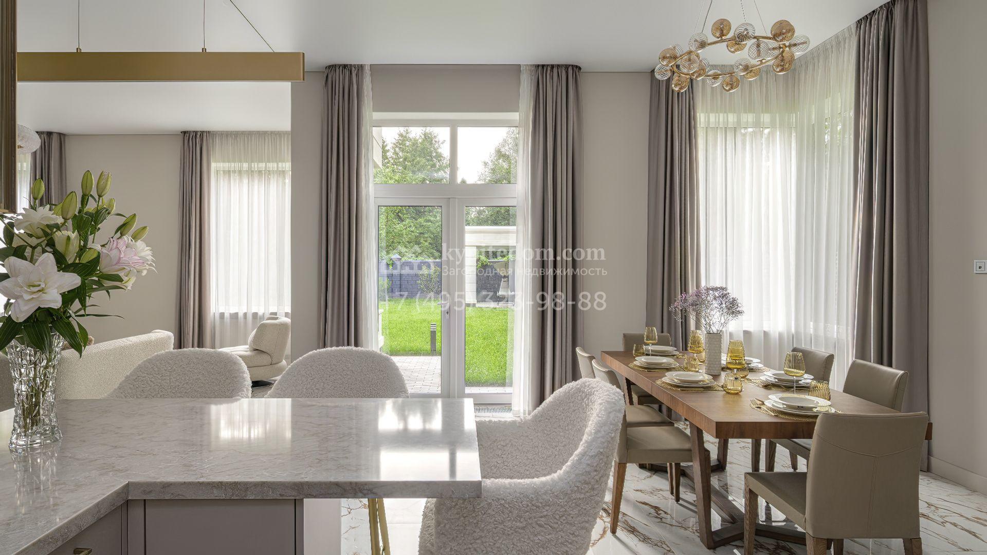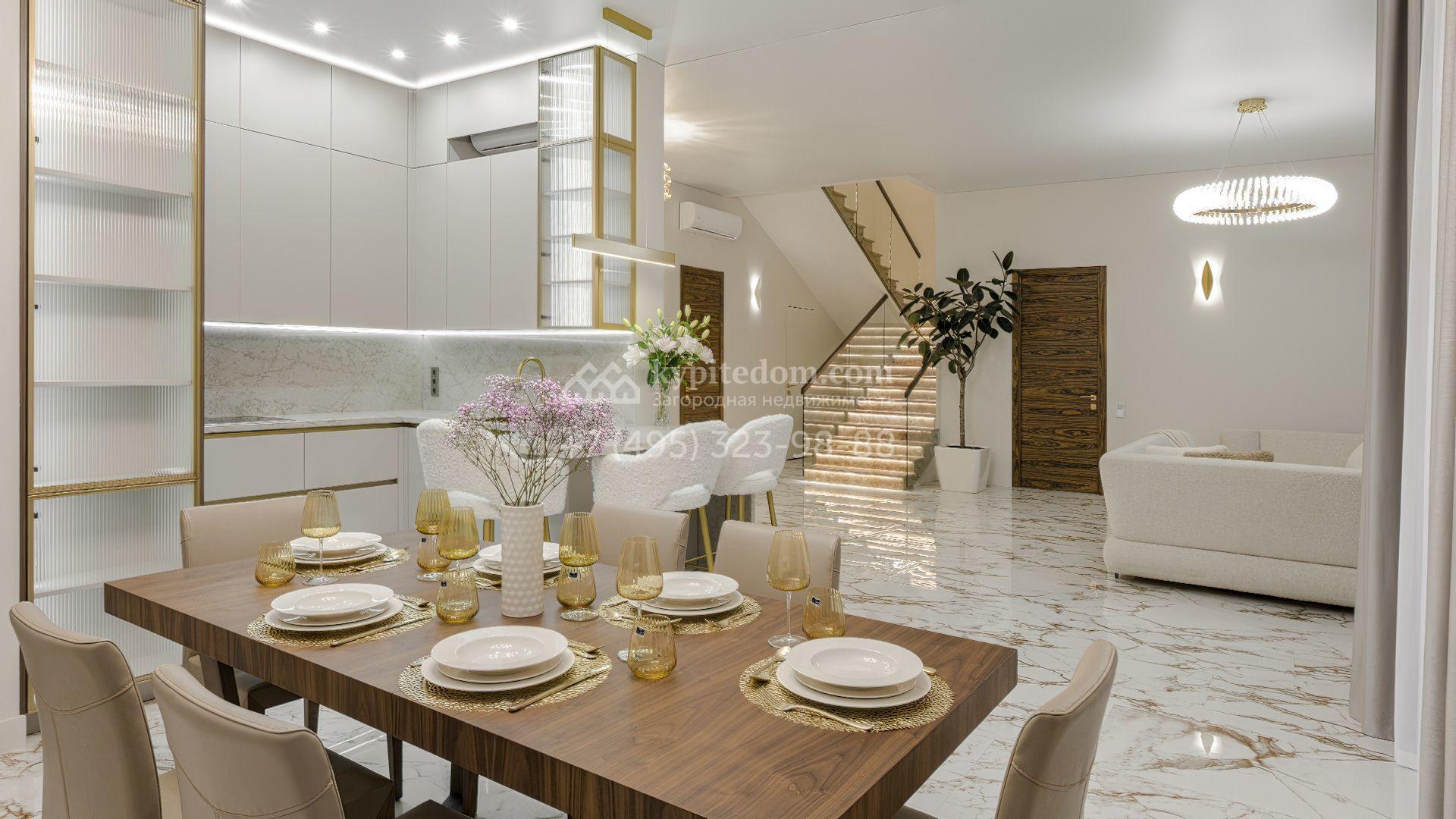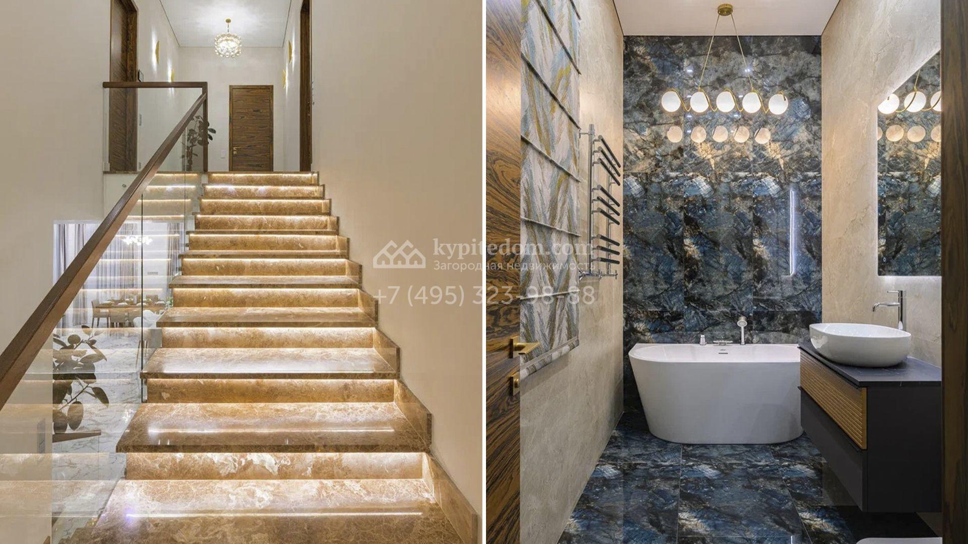 В отделке использованы мрамор, камень, шпон, ценные породы дерева и текстиль премиального класса. Мебель выполнена на заказ, освещение организовано по уровням — с использованием потолочных и встроенных светильников, создающих мягкие световые сценарии в каждой зоне. В доме установлены система вентиляции с климат-контролем и современный комплект инженерного оборудования. Кухонная и бытовая техника представлена брендами Kuppersbusch и Liebherr, сантехника — Villeroy & Boch и Bogemia. Котельная оснащена системой Buderus с защитой от протечек Neptun.