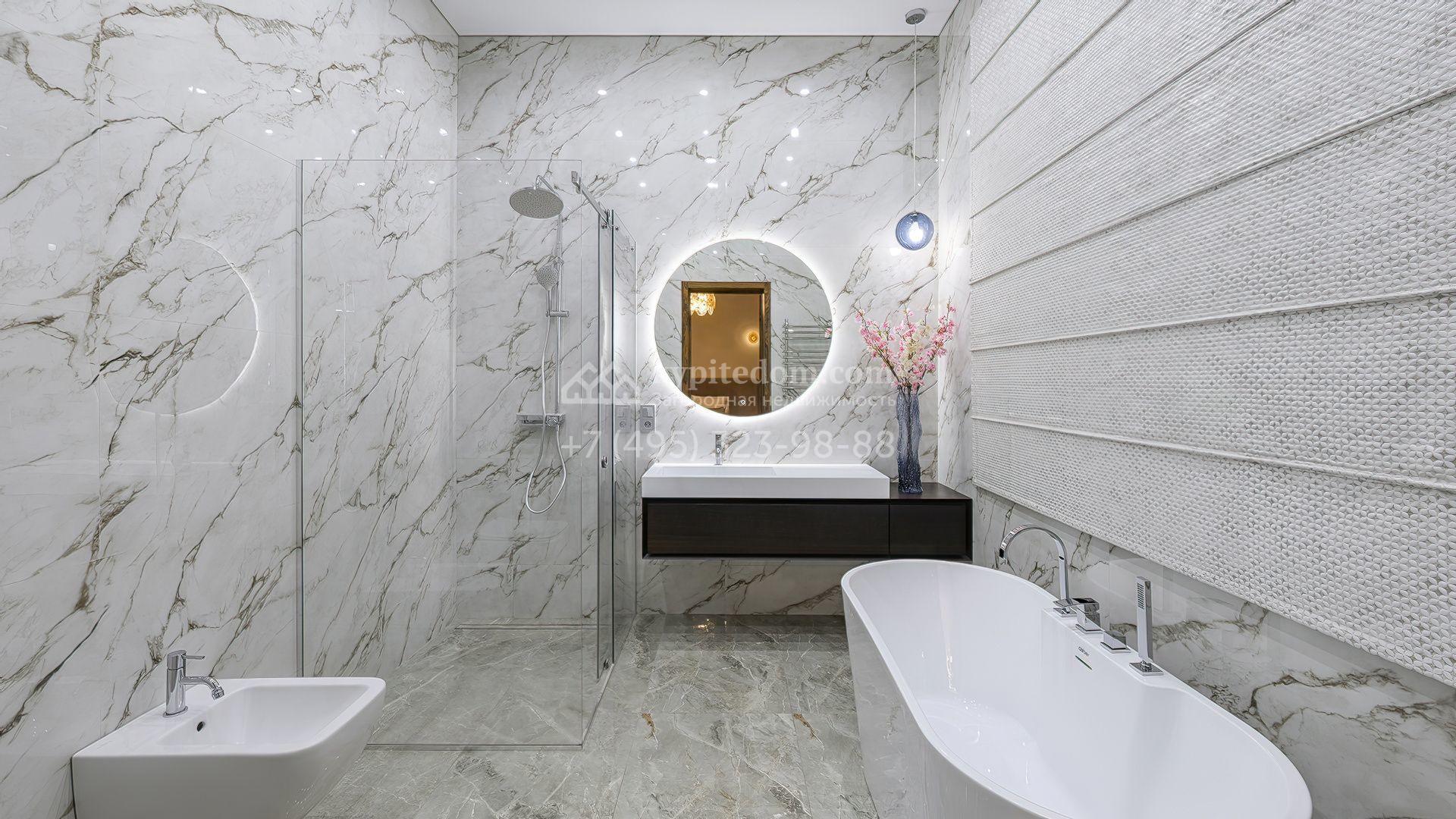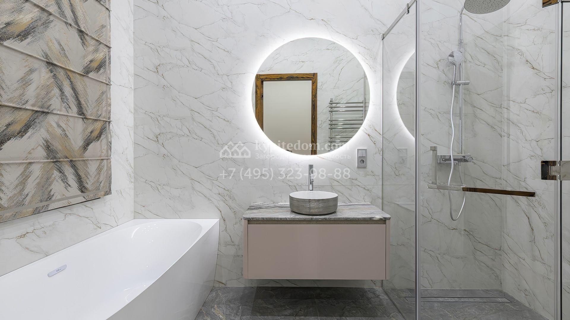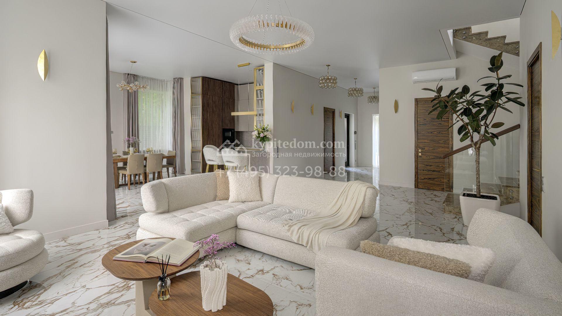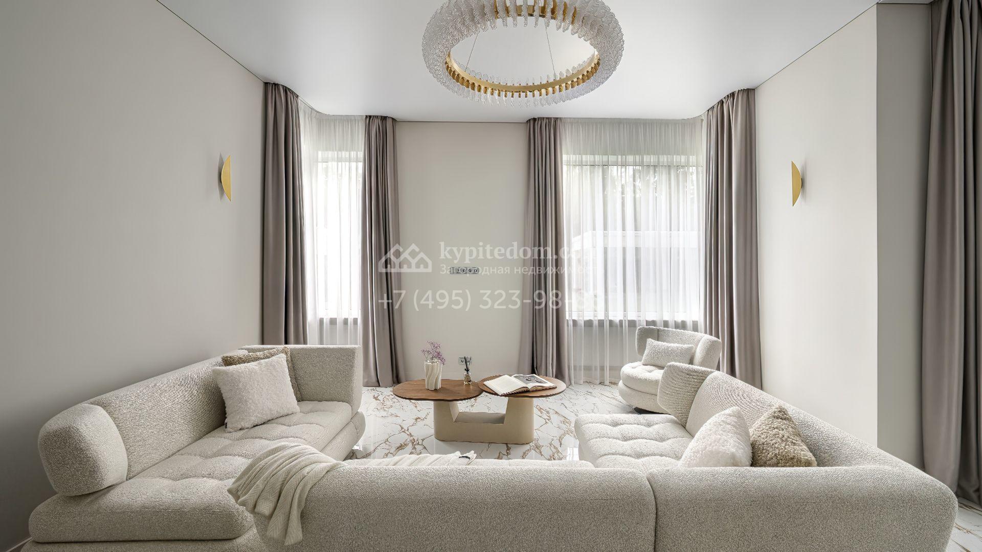В отделке использованы мрамор, камень, шпон, ценные породы дерева и текстиль премиального класса. Мебель выполнена на заказ, освещение организовано по уровням — с использованием потолочных и встроенных светильников, создающих мягкие световые сценарии в каждой зоне. В доме установлены система вентиляции с климат-контролем и современный комплект инженерного оборудования. Кухонная и бытовая техника представлена брендами Kuppersbusch и Liebherr, сантехника — Villeroy & Boch и Bogemia. Котельная оснащена системой Buderus с защитой от протечек Neptun.