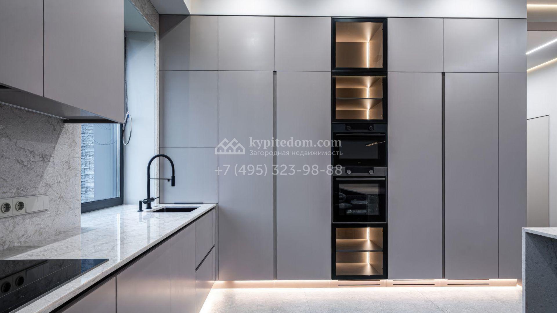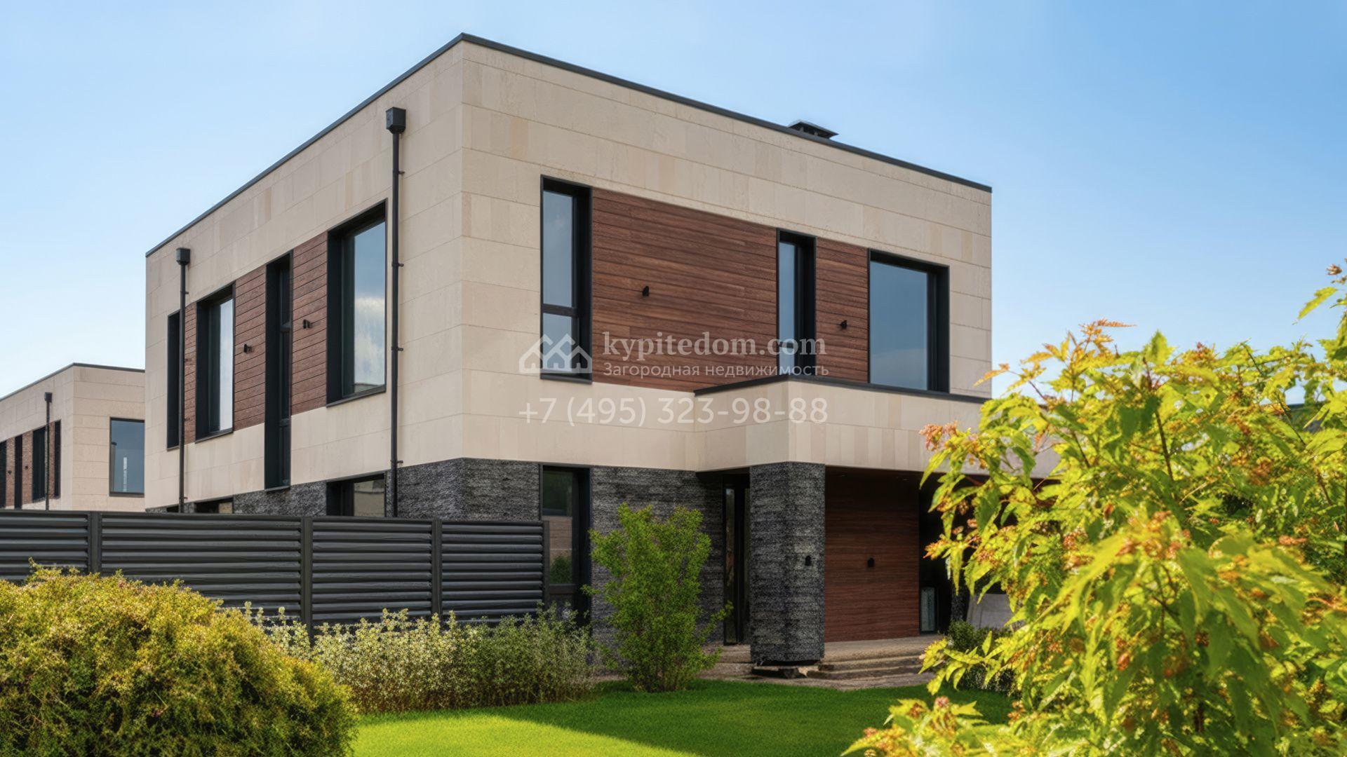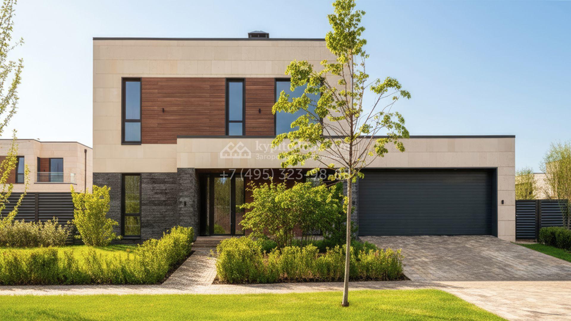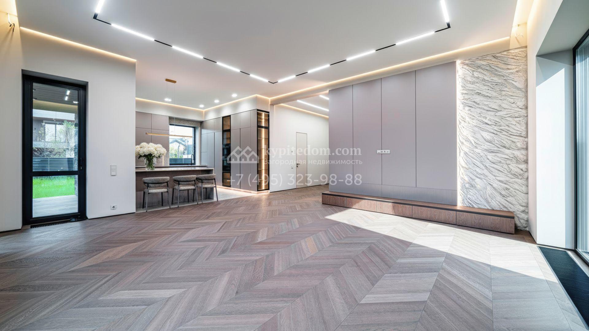 Загородный коттедж площадью 372 м² расположен на полевом участке 8,3 сотки. Современный фасад облицован сланцем, натуральным камнем Limestone и панелями с фактурой дерева, а подсветка гармонично подчёркивает строгие формы здания в вечерние часы. Панорамное остелкение и потолки высотой 4 метра визуально расширяют пространство и создают ощущение свободы.
