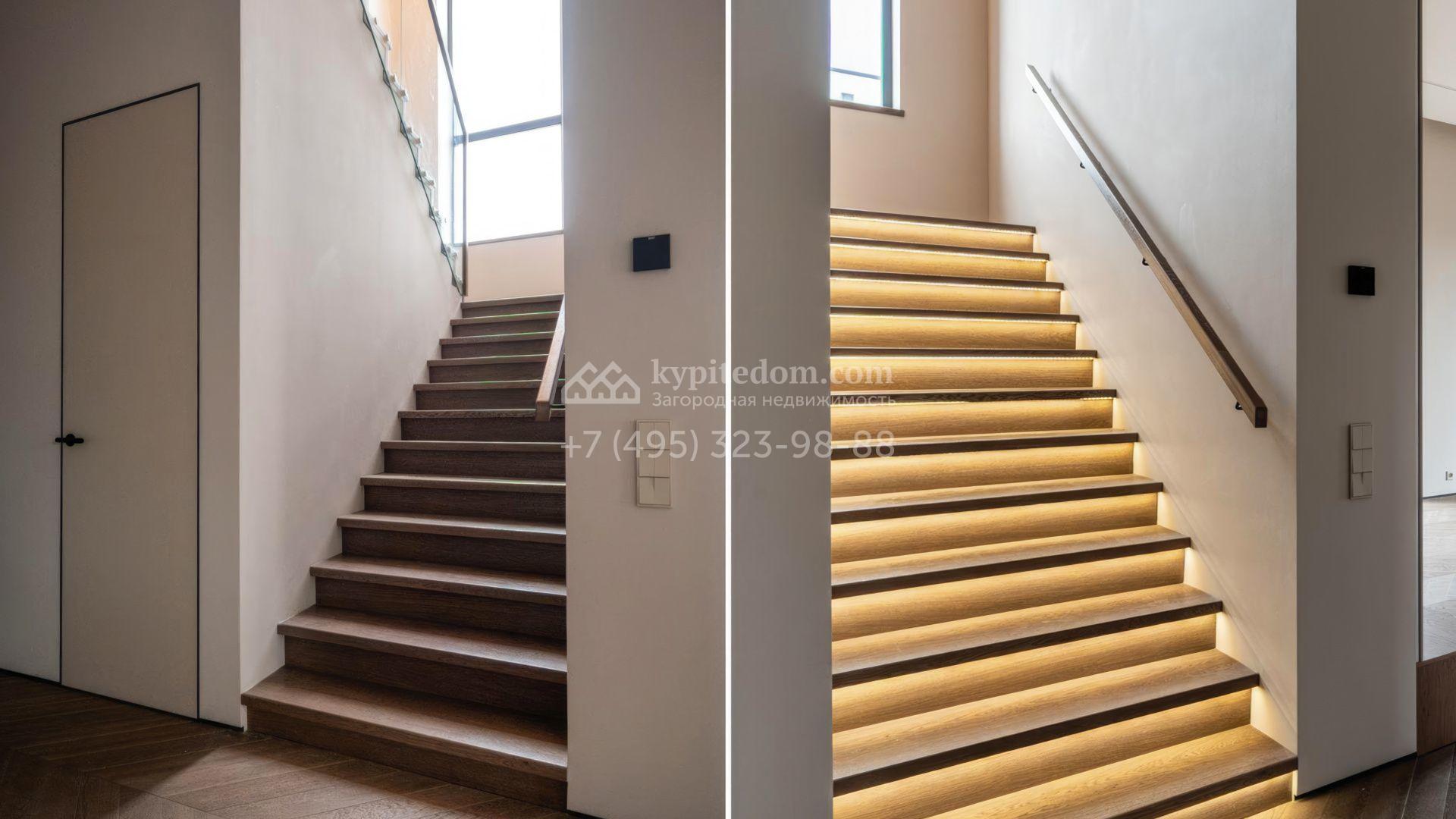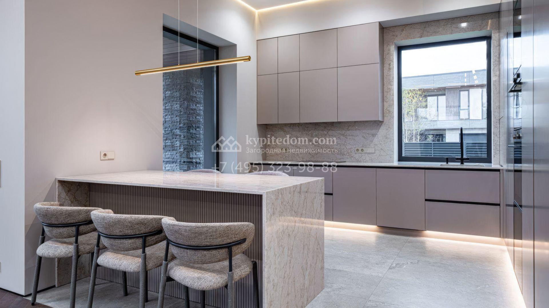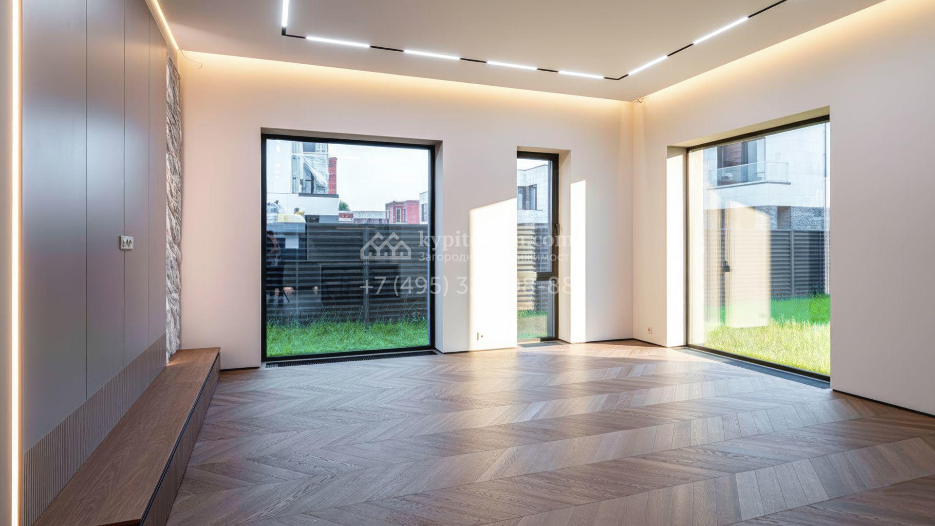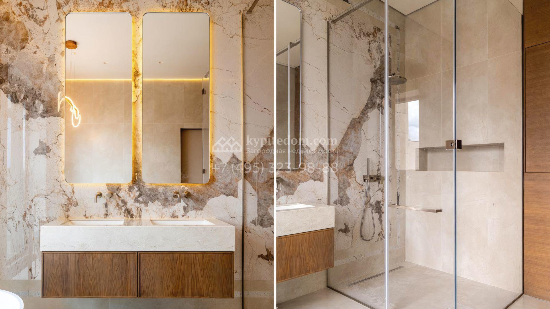 Загородный коттедж площадью 372 м² расположен на полевом участке 8,3 сотки. Современный фасад облицован сланцем, натуральным камнем Limestone и панелями с фактурой дерева, а подсветка гармонично подчёркивает строгие формы здания в вечерние часы. Панорамное остелкение и потолки высотой 4 метра визуально расширяют пространство и создают ощущение свободы.