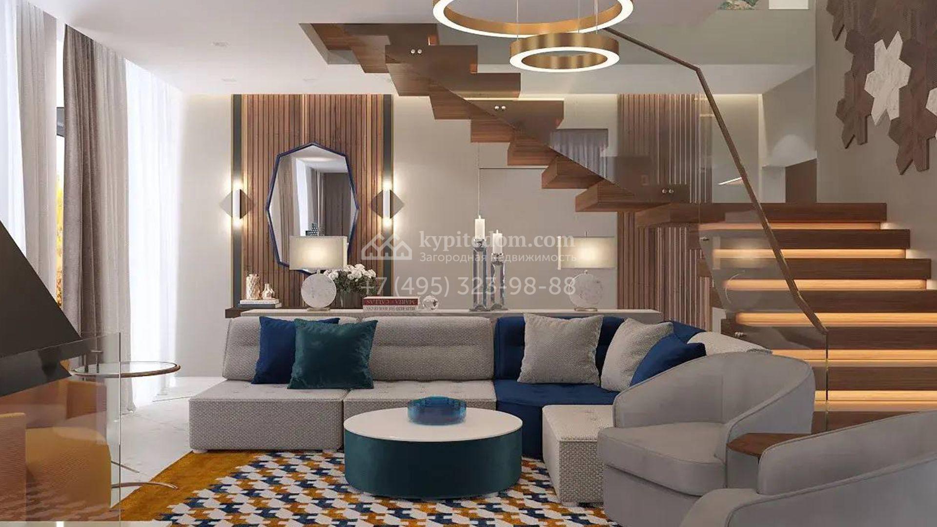 Загородный дом площадью 395 м² возведен на полевом участке 27 соток. Фасад дома выполнен в современном стиле и выделяется панорамными окнами, выступающими элементами и ассиметричной крышей, которая формирует выразительный силуэт. Свободная планировка позволяет организовать пространство по собственному усмотрению, есть возможность выбрать готовый дизайн-проект.