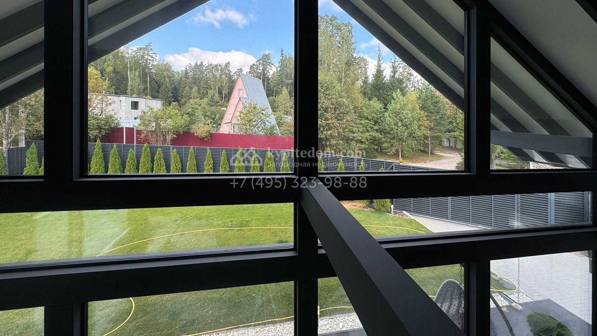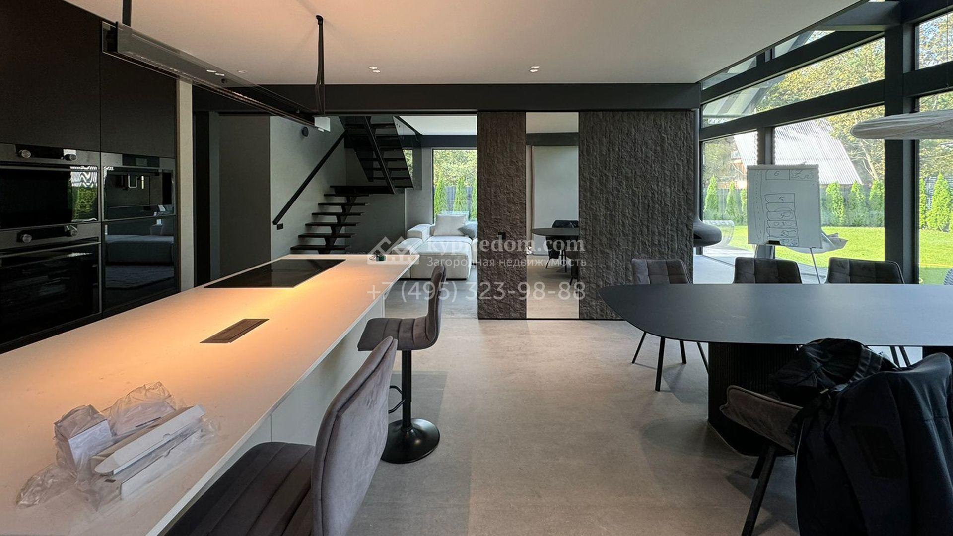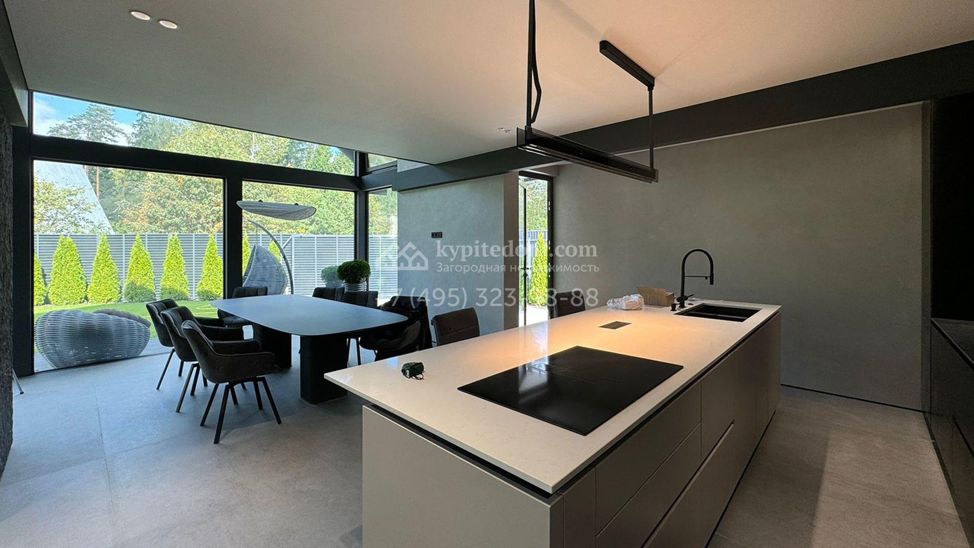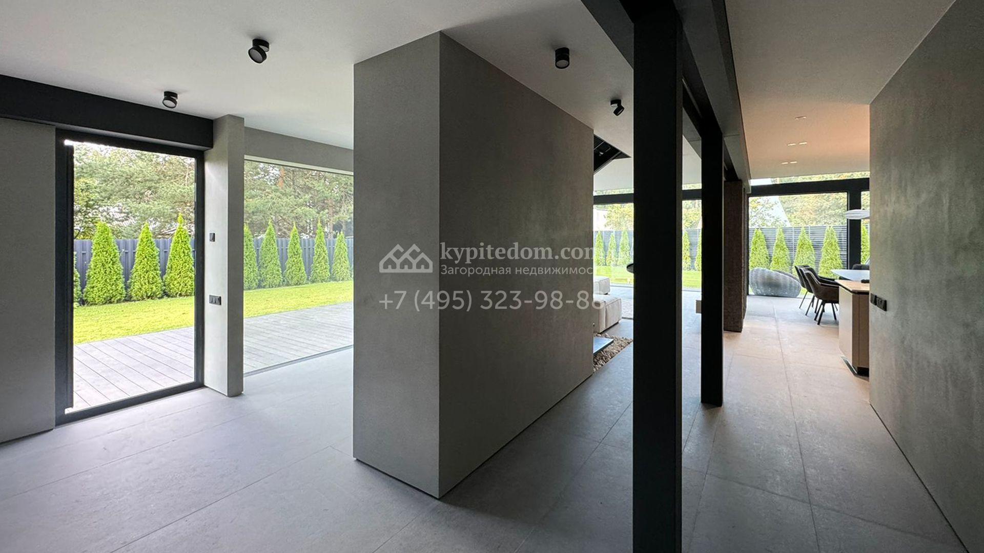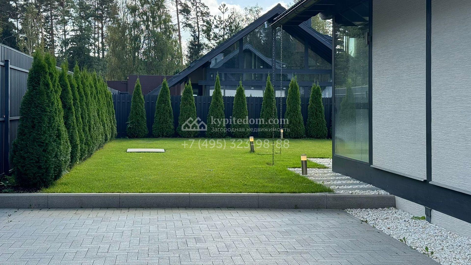 Загородный дом площадью 309 м² построен на уютном полевом участке 11 соток. Фасад здания с большой площадью остекления выполнен в стиле «фахверк». В коттедже выполнена отделка под ключ. В резиденции можно обустроить несколько спален, гостиную и кухню-столовую. На участке выполнен ландшафтный дизайн с системой автоматического полива Hunter, сделана мраморная отмостка и засеян газон.