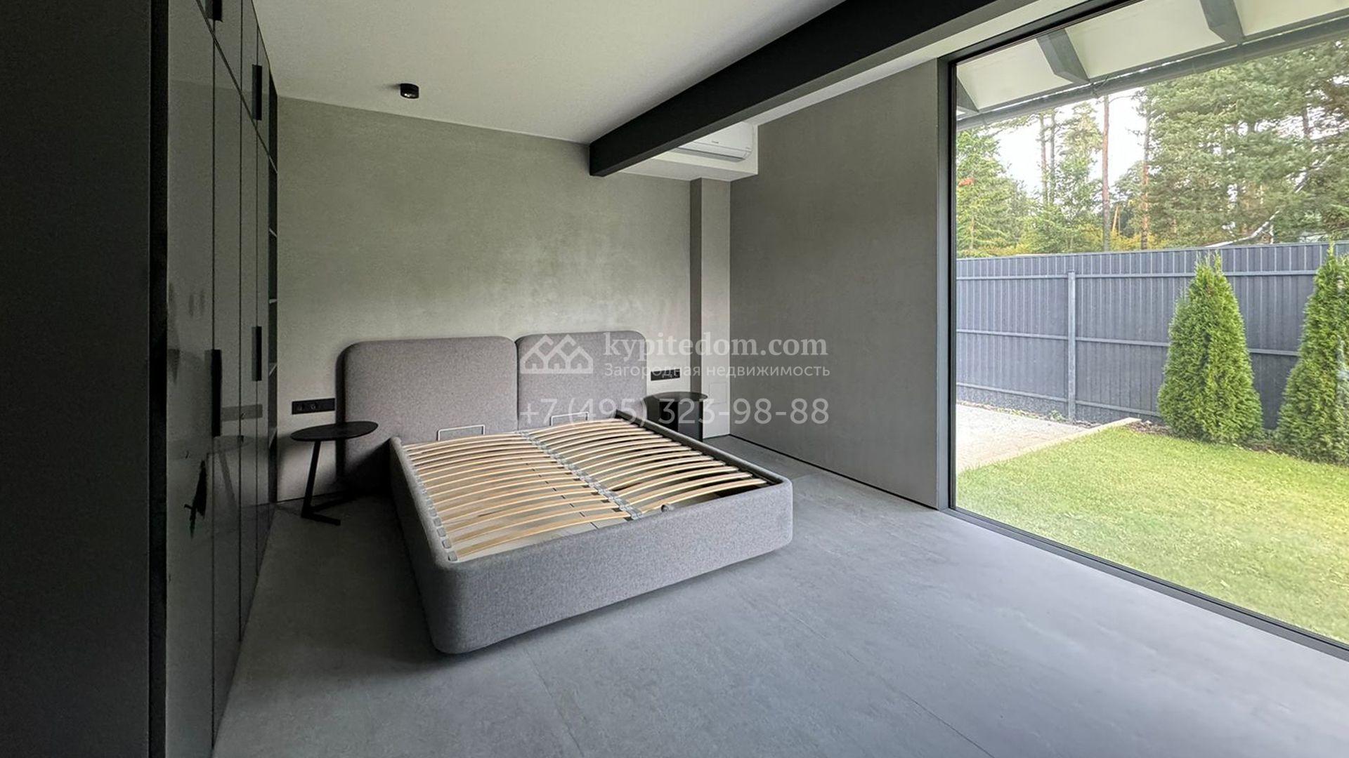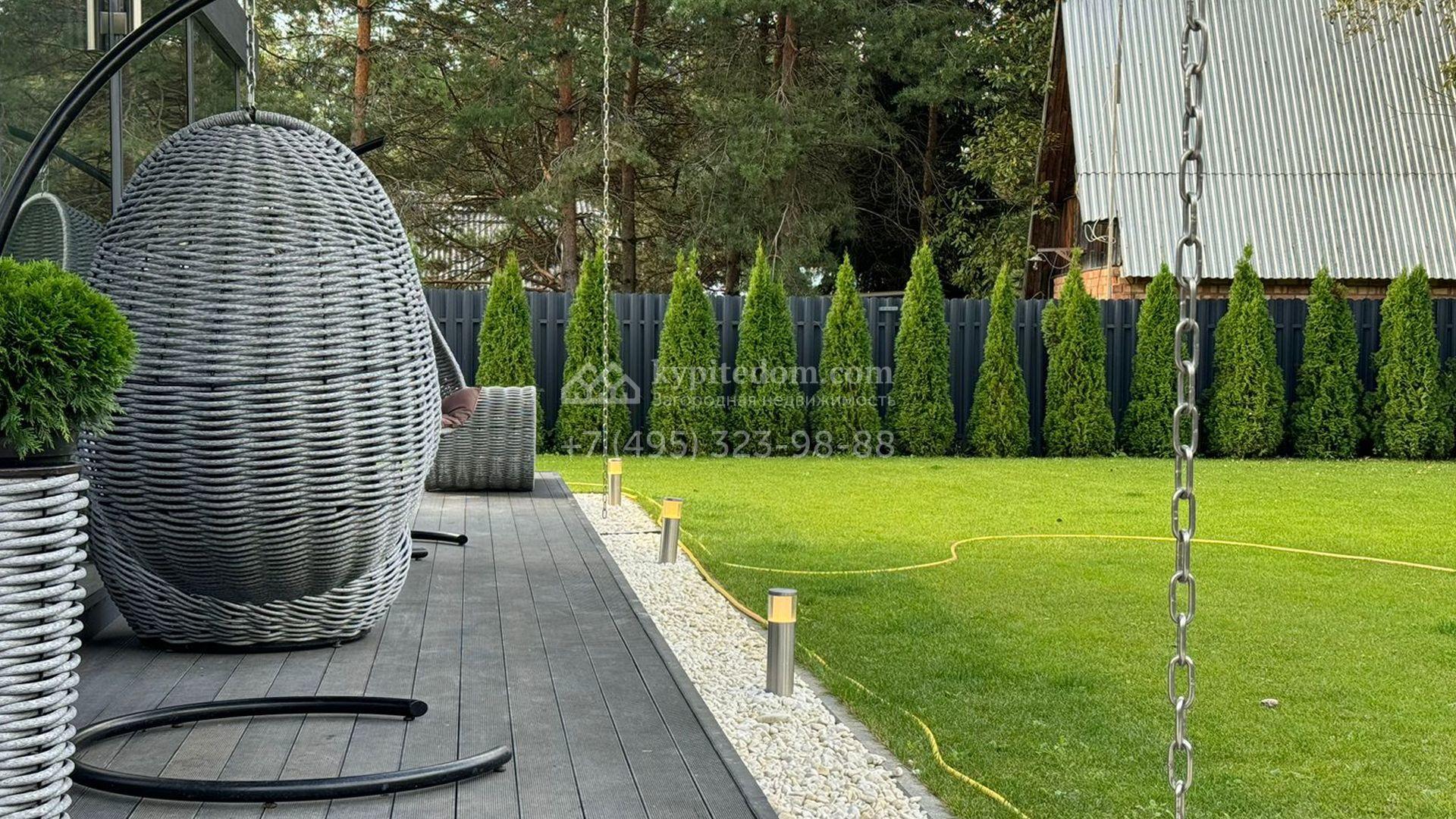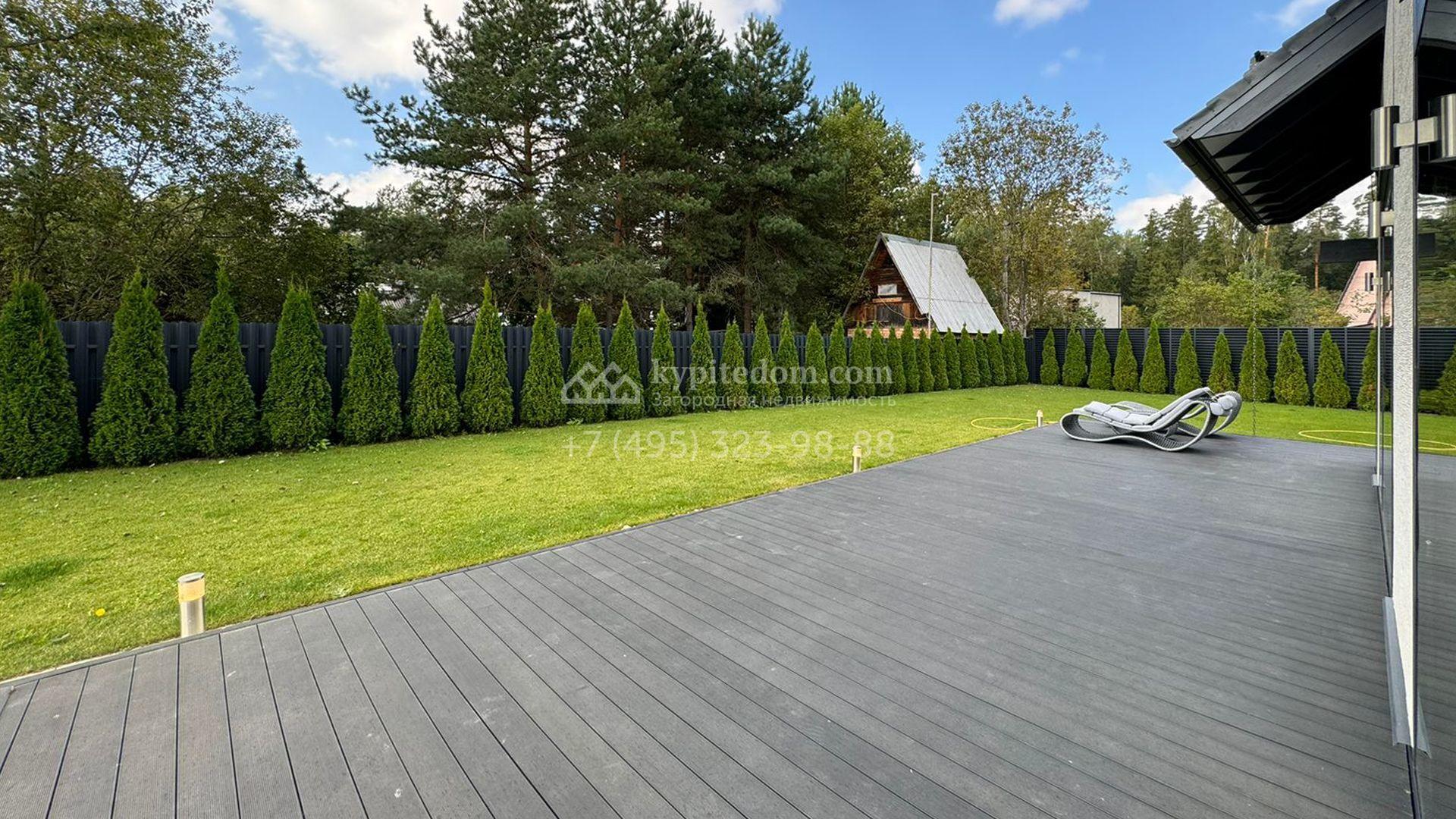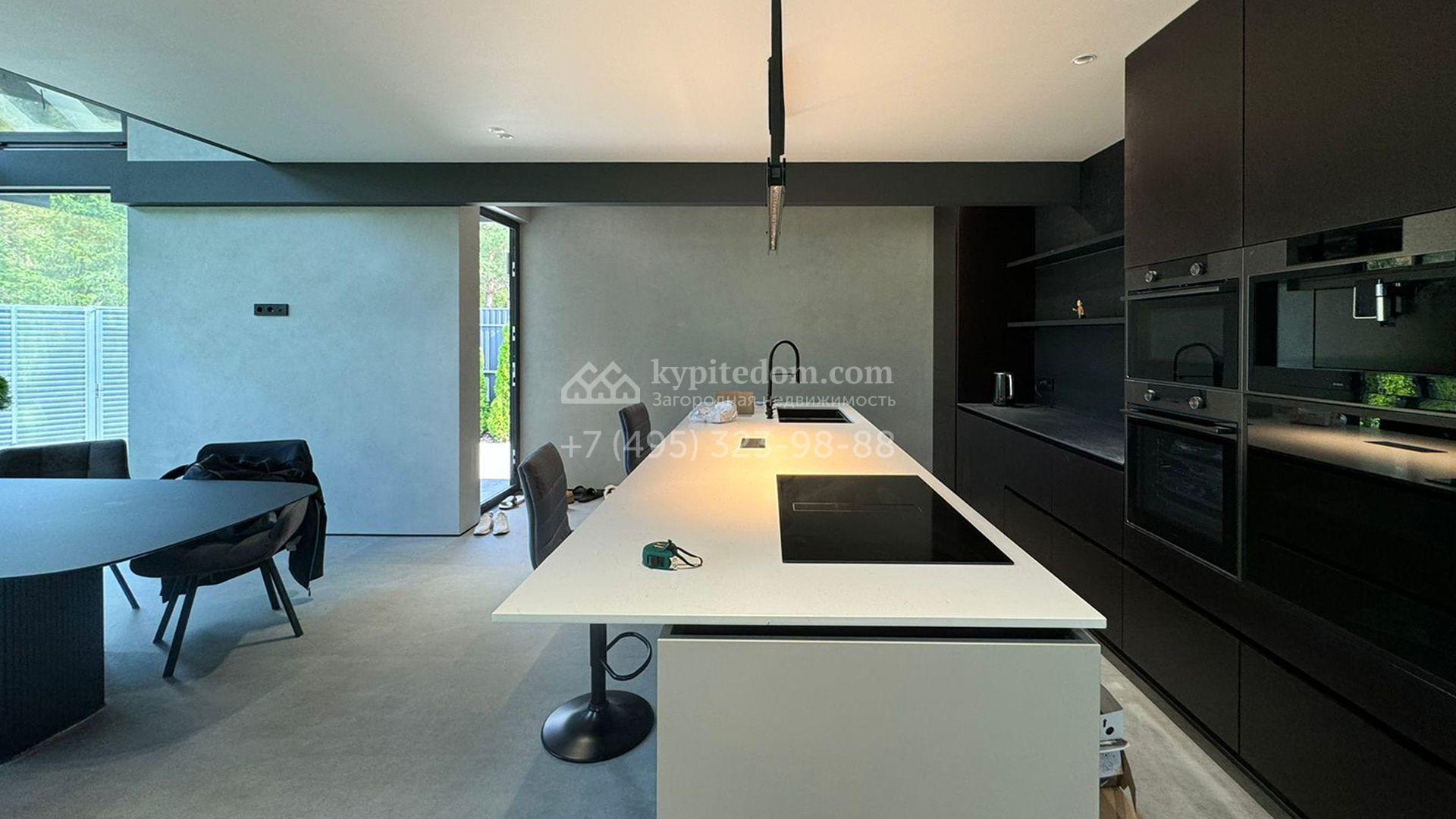 Загородный дом площадью 309 м² построен на уютном полевом участке 11 соток. Фасад здания с большой площадью остекления выполнен в стиле «фахверк». В коттедже выполнена отделка под ключ. В резиденции можно обустроить несколько спален, гостиную и кухню-столовую. На участке выполнен ландшафтный дизайн с системой автоматического полива Hunter, сделана мраморная отмостка и засеян газон.