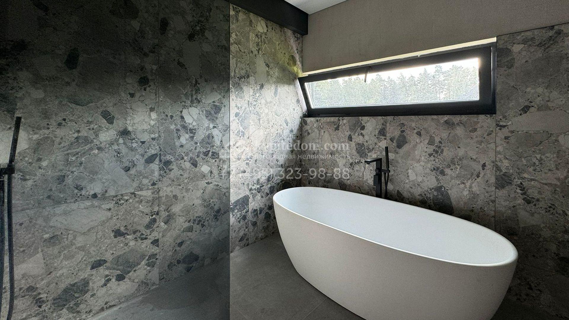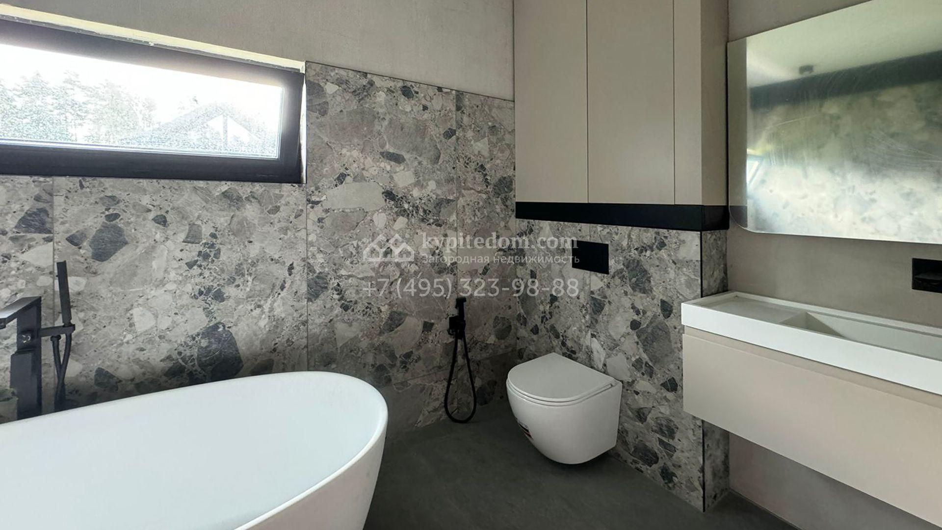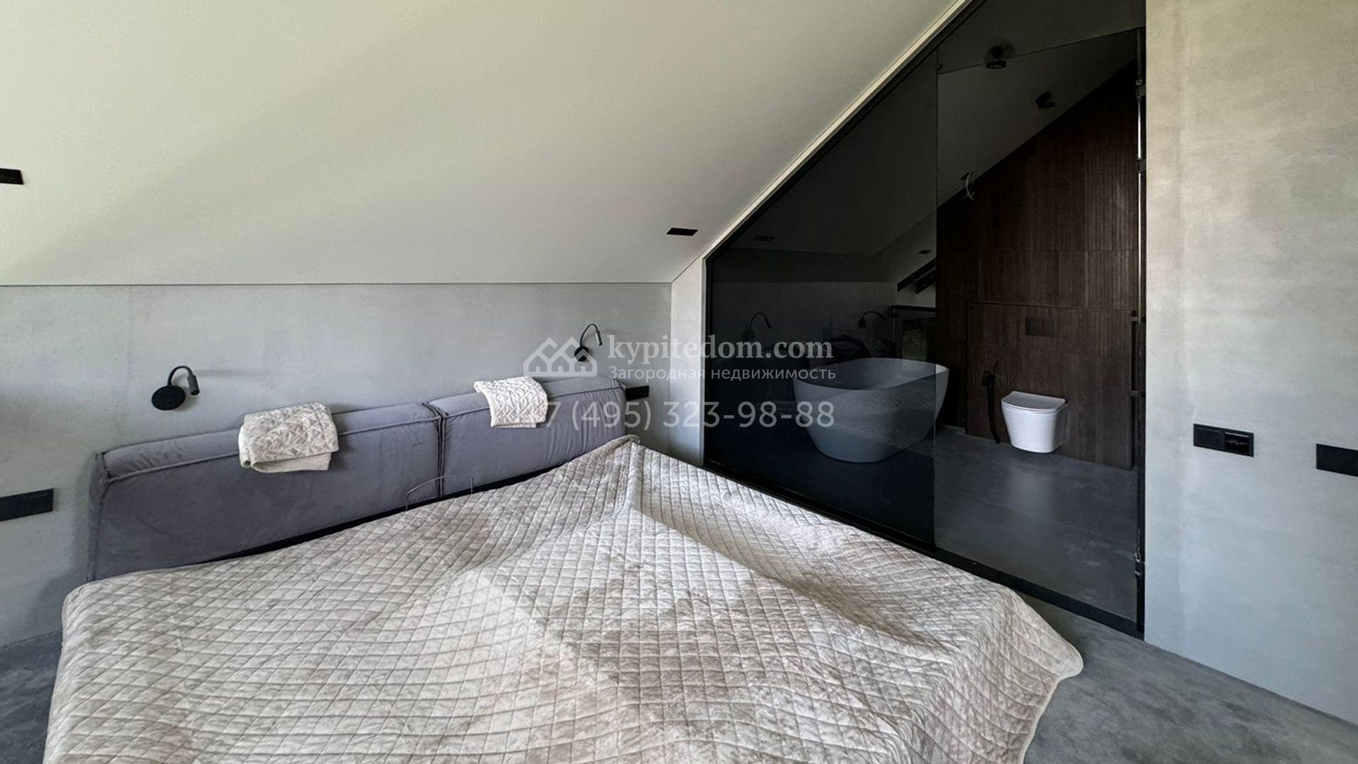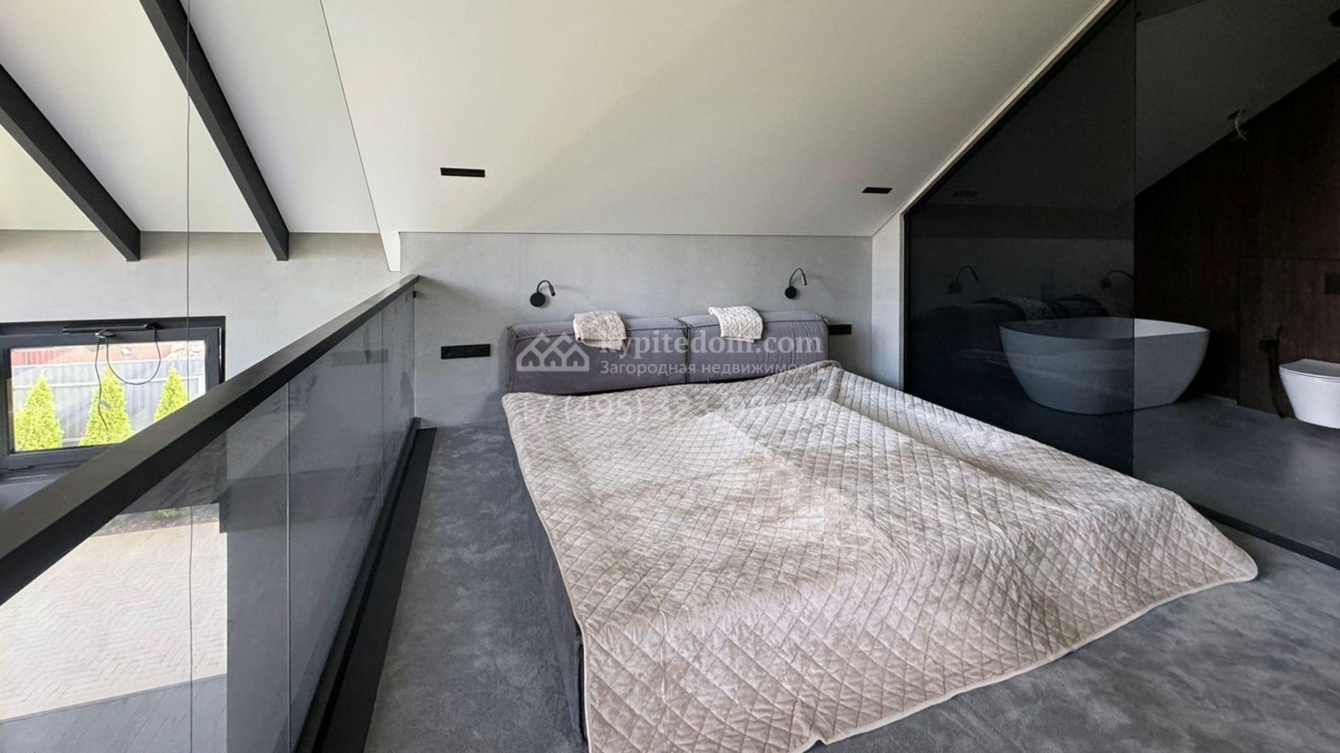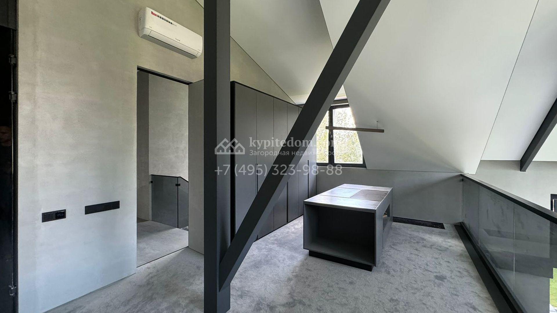 Загородный дом площадью 309 м² построен на уютном полевом участке 11 соток. Фасад здания с большой площадью остекления выполнен в стиле «фахверк». В коттедже выполнена отделка под ключ. В резиденции можно обустроить несколько спален, гостиную и кухню-столовую. На участке выполнен ландшафтный дизайн с системой автоматического полива Hunter, сделана мраморная отмостка и засеян газон.