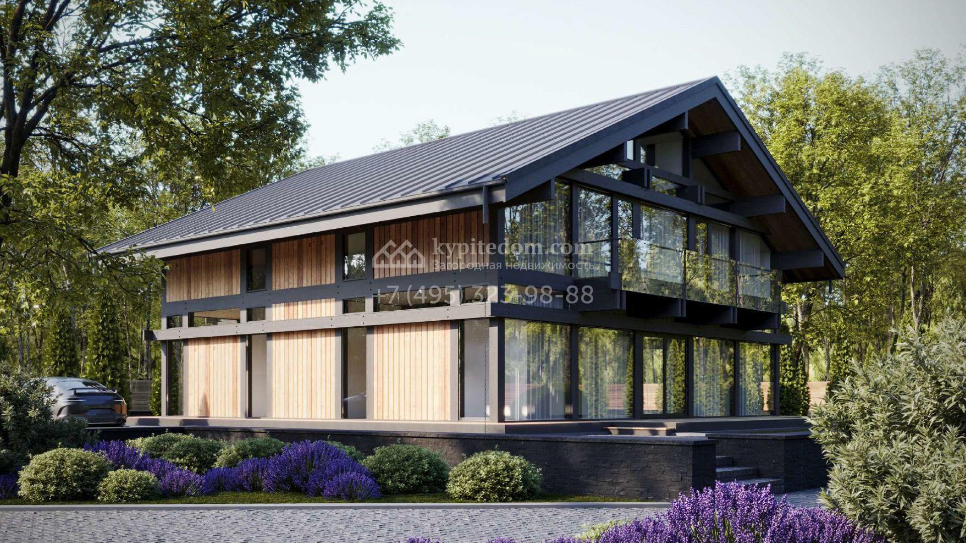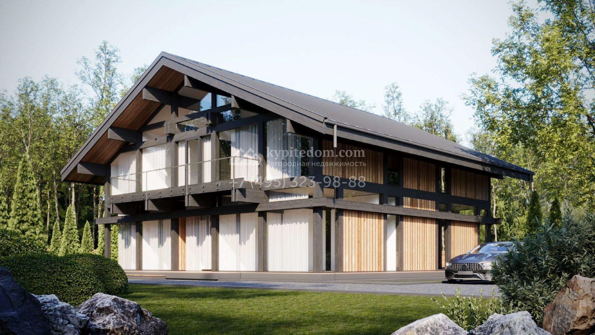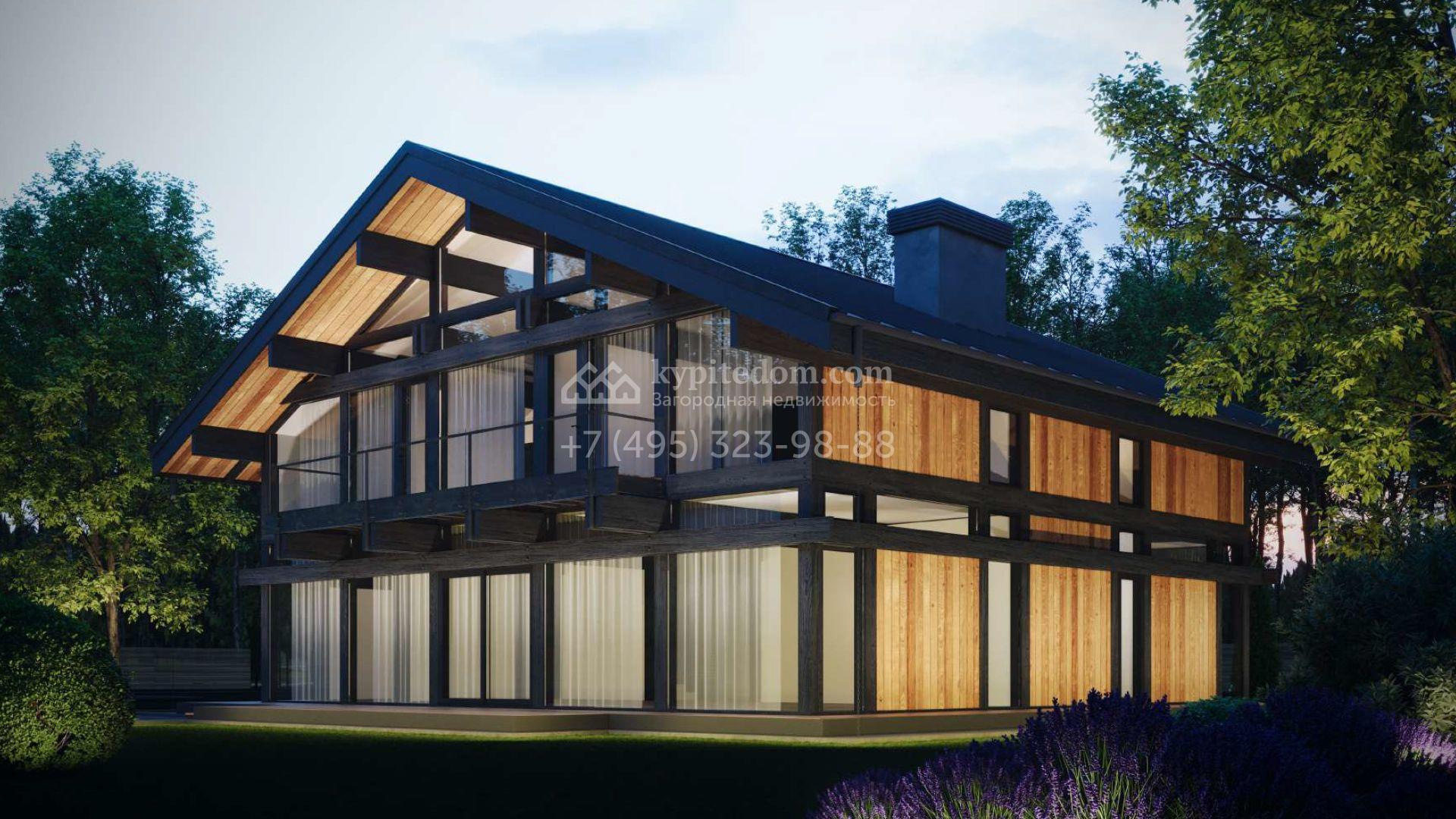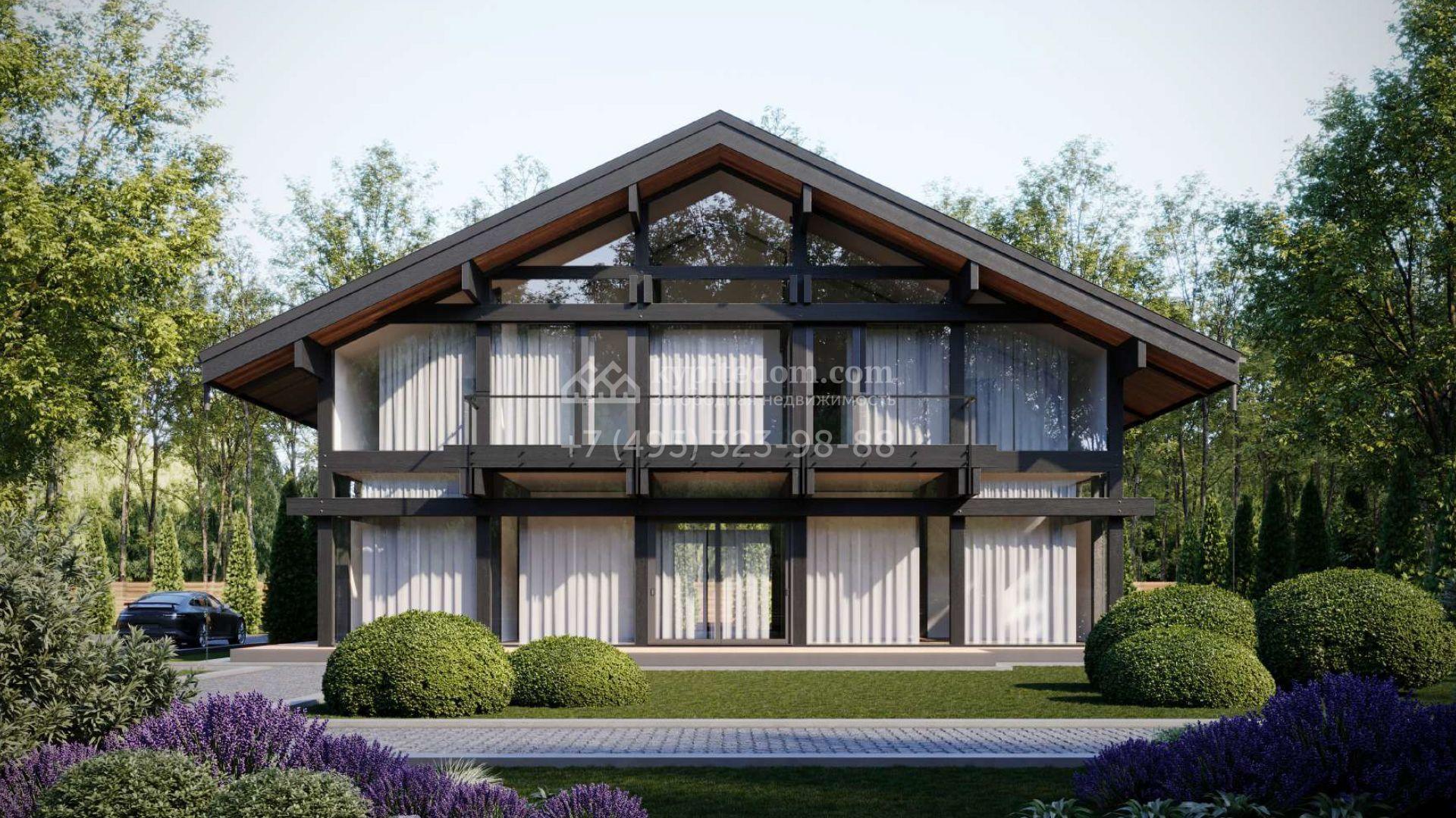 Загородный дом площадью 450 м² построен на просторном участке 22,6 сотки с лесными деревьями. Фасад здания с панорамным остеклением выполнен в стиле «фахверк» с темными балками и вставками с фактурой дерева. В резиденции без отделки можно реализовать дизайн-проект, отвечающий индивидуальным потребностям. Планировкой предусмотрены несколько спален, гостиная, кухня-столовая. На участке выполнен ландшафтный дизайн, вымощены дорожки и высажены растения.