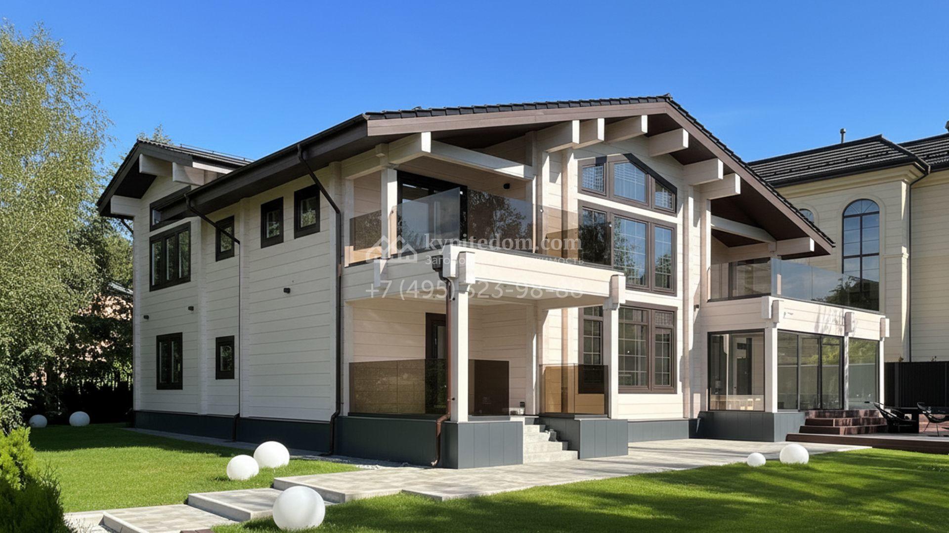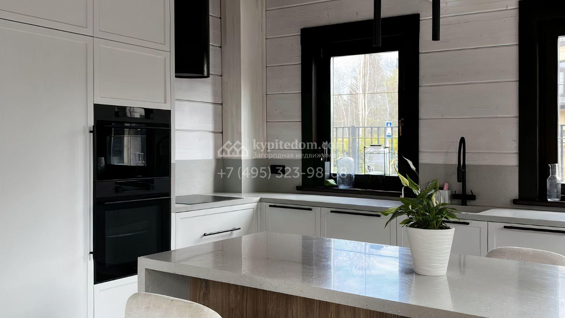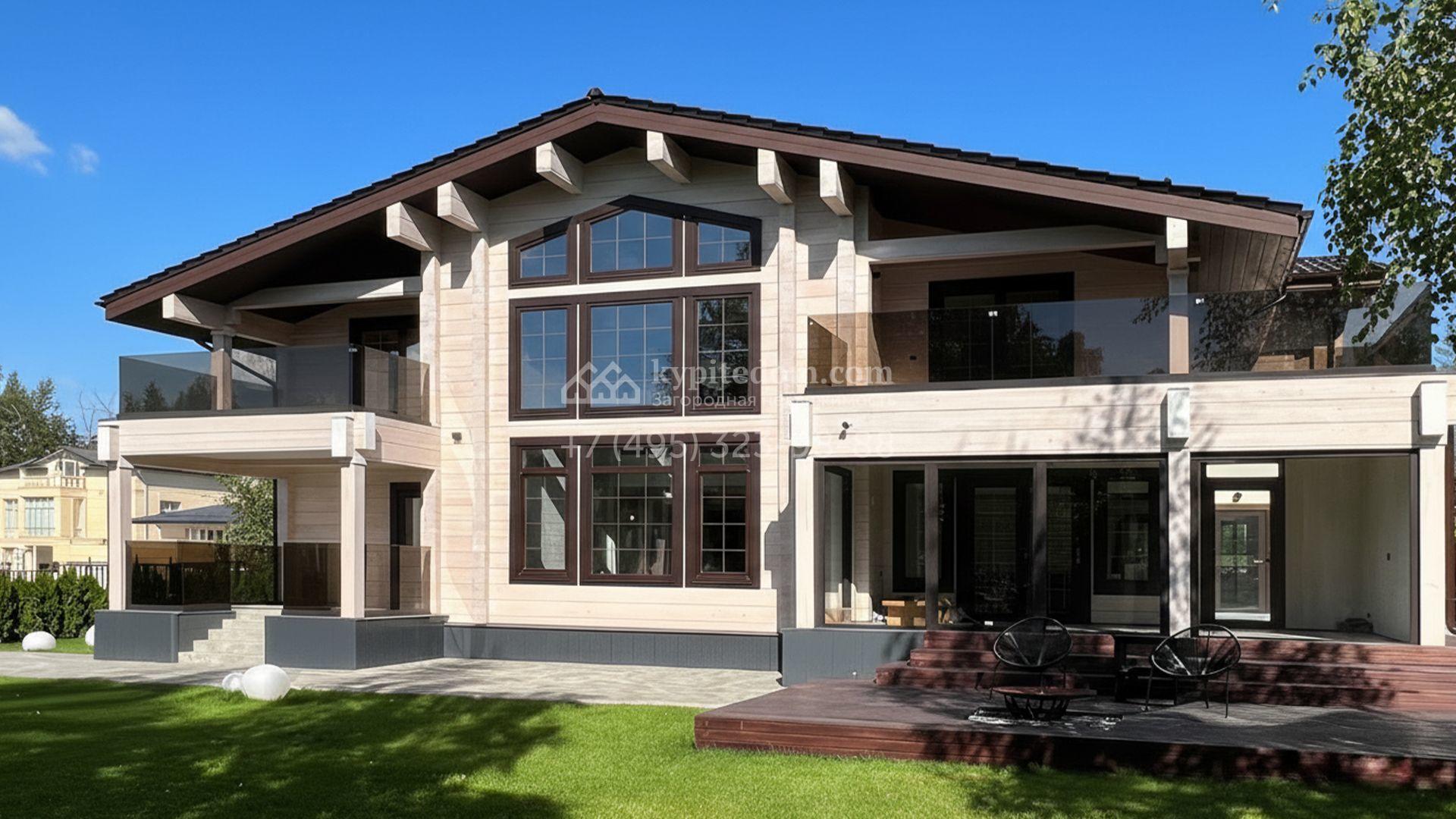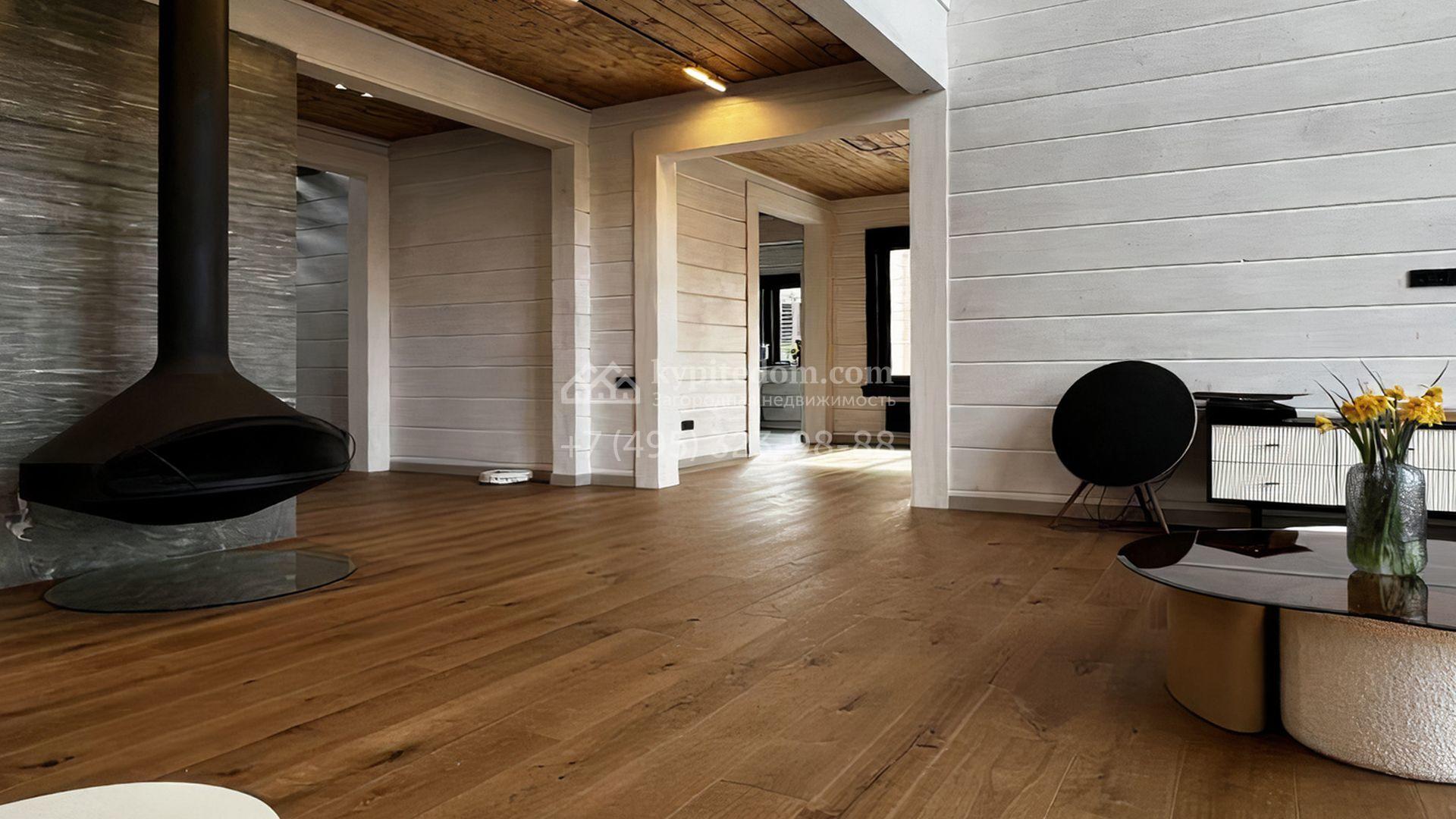 Загородный дом площадью 650 м² построен на полевом участке 13,5 сотки. Фасад здания с панорамными окнами выполнен из бруса в стиле «фахверк». В отделке современного интерьера преобладают молочные оттенки в сочетании с фактурой серого камня на напольной плитке. В коттедже спланировали 4 спальни, гостиную с подвесным камином и вторым светом, кухню, столовую, кабинет с балконом и большую террасу, где можно проводить вечера с барбекю. Рядом расположены баня с купелью на улице, гараж 60 м² и гостевая квартира. На участке выполнен ландшафтный дизайн, засеян газон и сделаны дорожки.