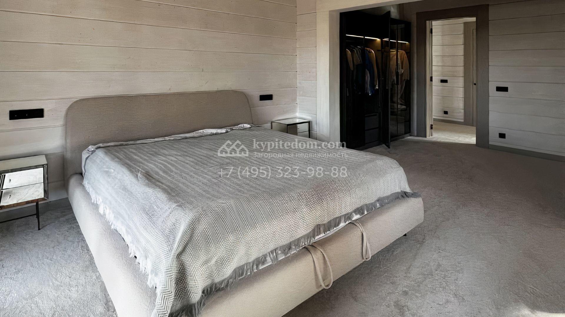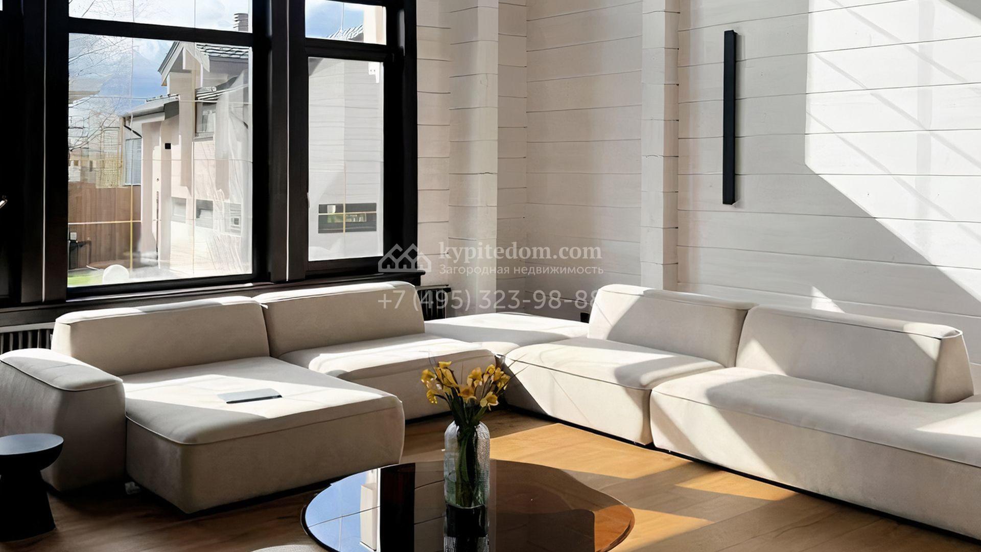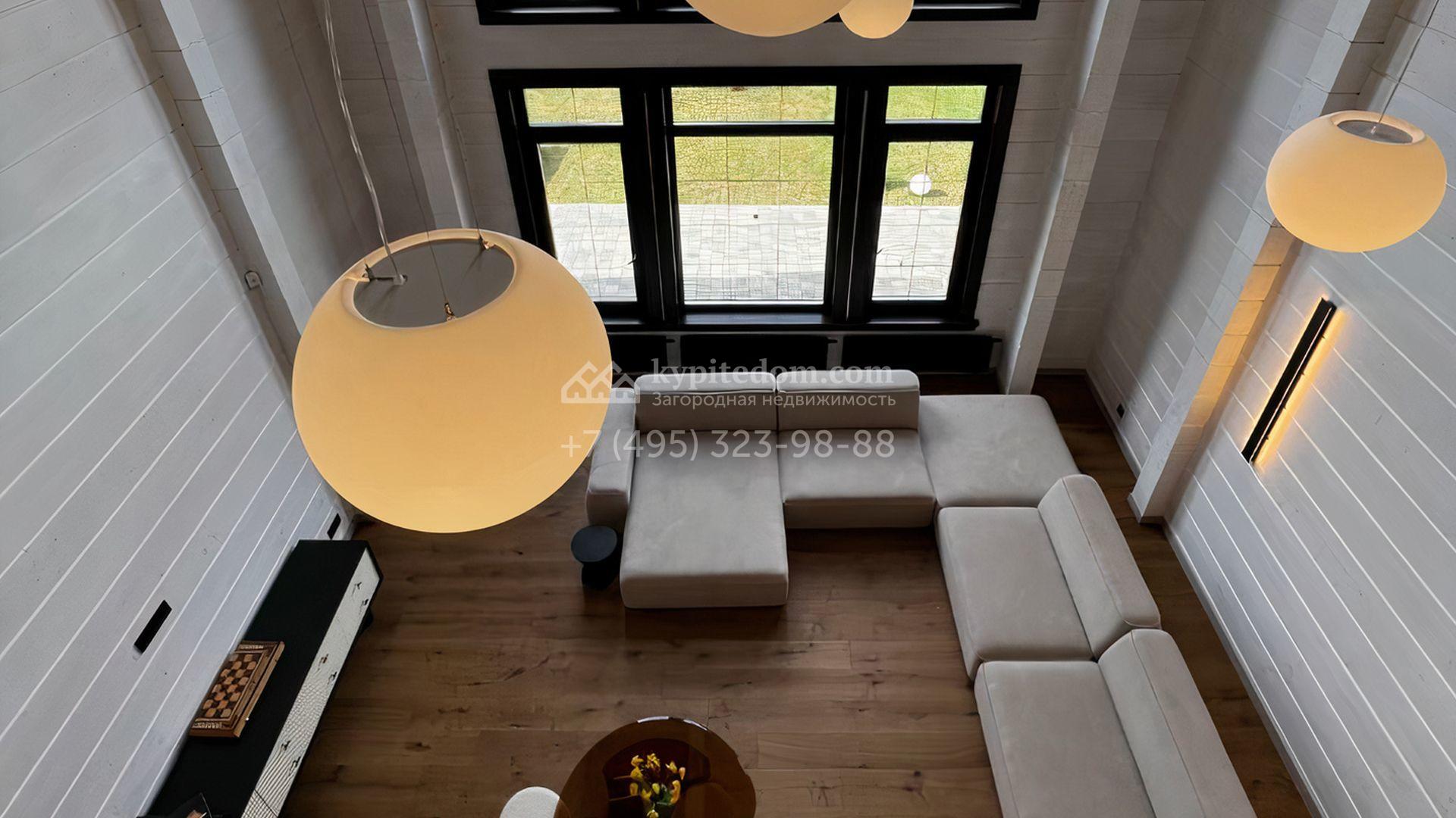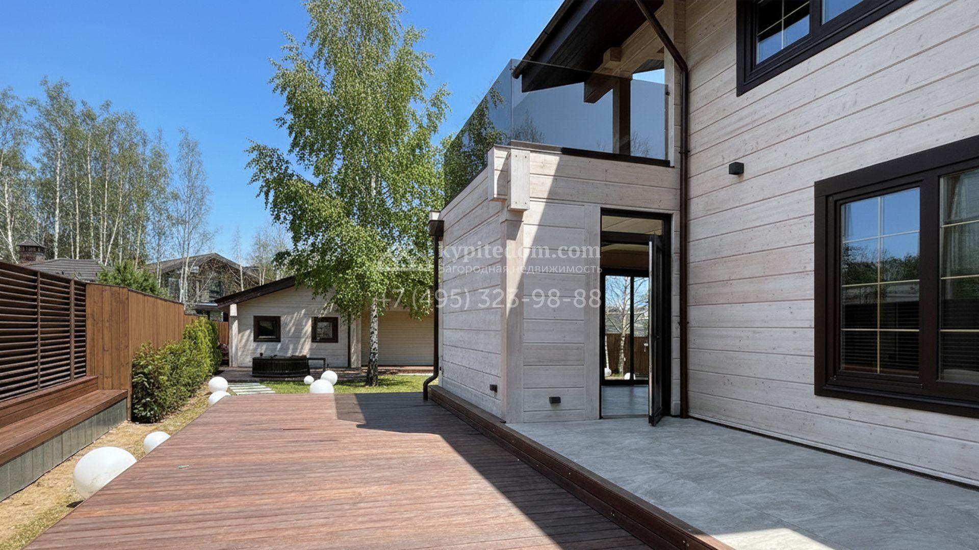 Загородный дом площадью 650 м² построен на полевом участке 13,5 сотки. Фасад здания с панорамными окнами выполнен из бруса в стиле «фахверк». В отделке современного интерьера преобладают молочные оттенки в сочетании с фактурой серого камня на напольной плитке. В коттедже спланировали 4 спальни, гостиную с подвесным камином и вторым светом, кухню, столовую, кабинет с балконом и большую террасу, где можно проводить вечера с барбекю. Рядом расположены баня с купелью на улице, гараж 60 м² и гостевая квартира. На участке выполнен ландшафтный дизайн, засеян газон и сделаны дорожки.
