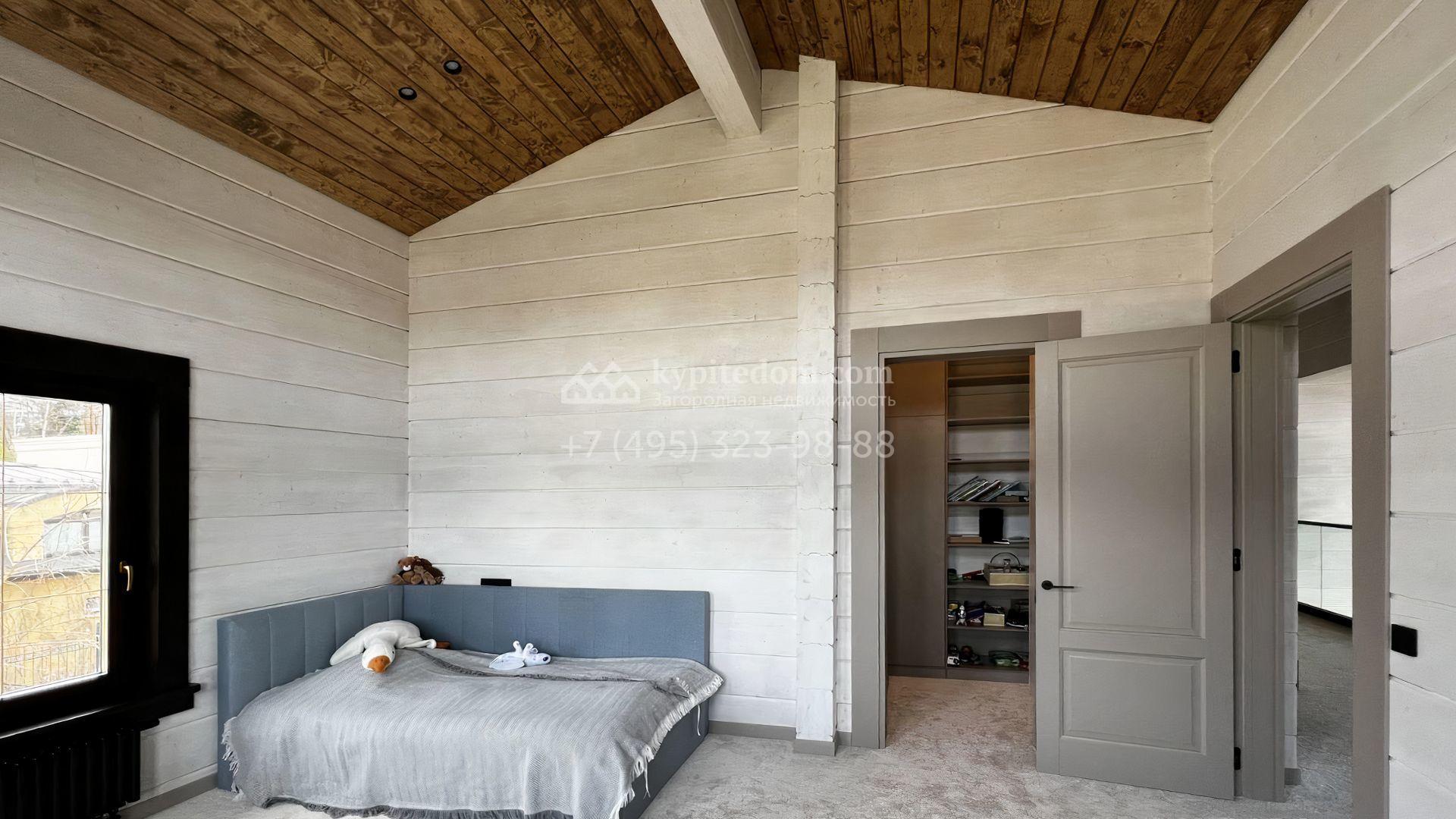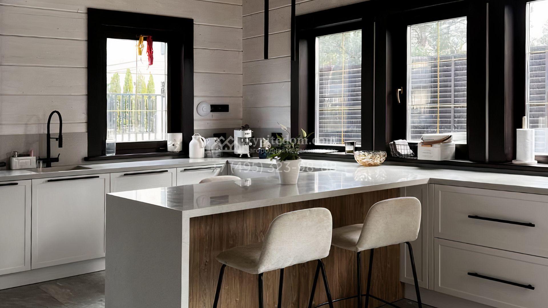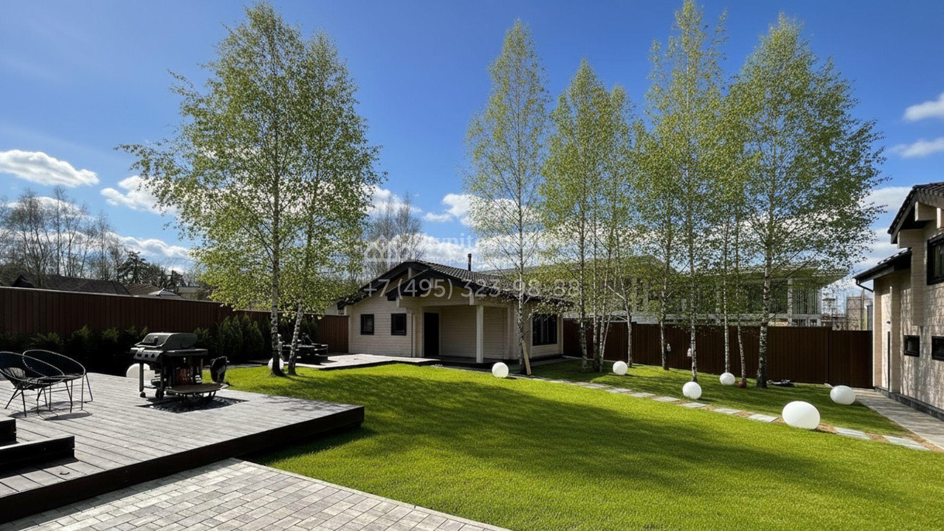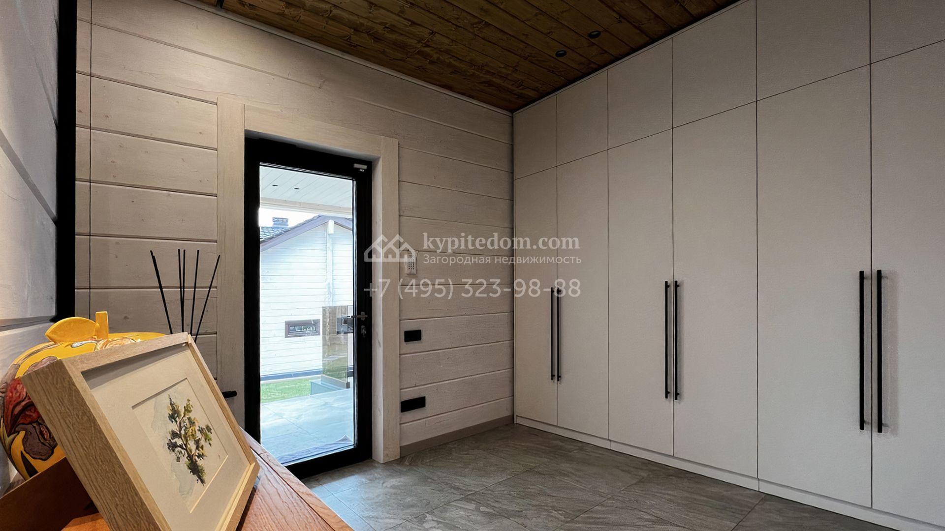 Загородный дом площадью 650 м² построен на полевом участке 13,5 сотки. Фасад здания с панорамными окнами выполнен из бруса в стиле «фахверк». В отделке современного интерьера преобладают молочные оттенки в сочетании с фактурой серого камня на напольной плитке. В коттедже спланировали 4 спальни, гостиную с подвесным камином и вторым светом, кухню, столовую, кабинет с балконом и большую террасу, где можно проводить вечера с барбекю. Рядом расположены баня с купелью на улице, гараж 60 м² и гостевая квартира. На участке выполнен ландшафтный дизайн, засеян газон и сделаны дорожки.