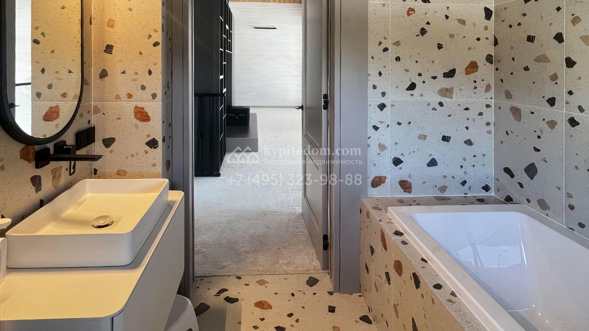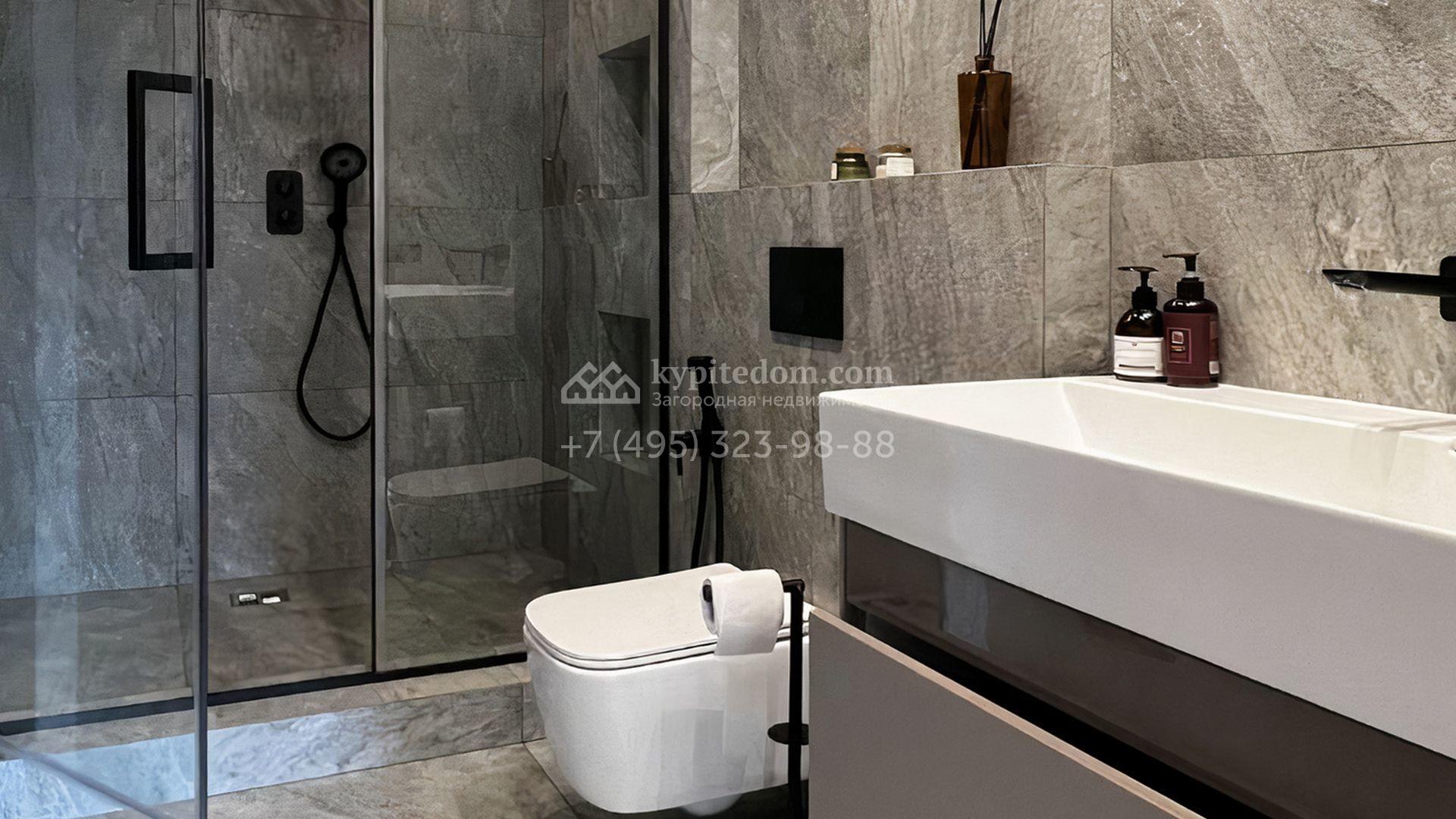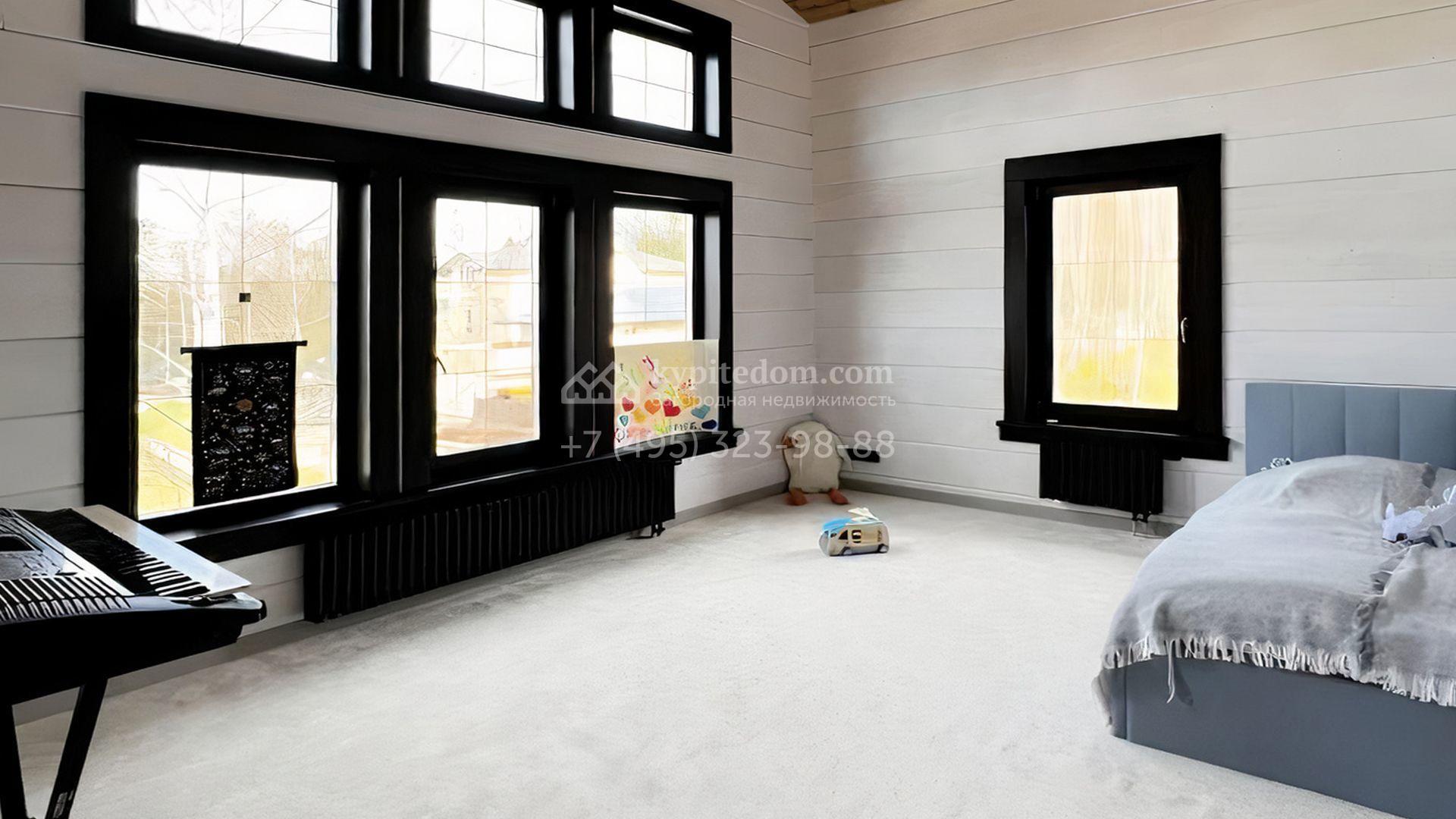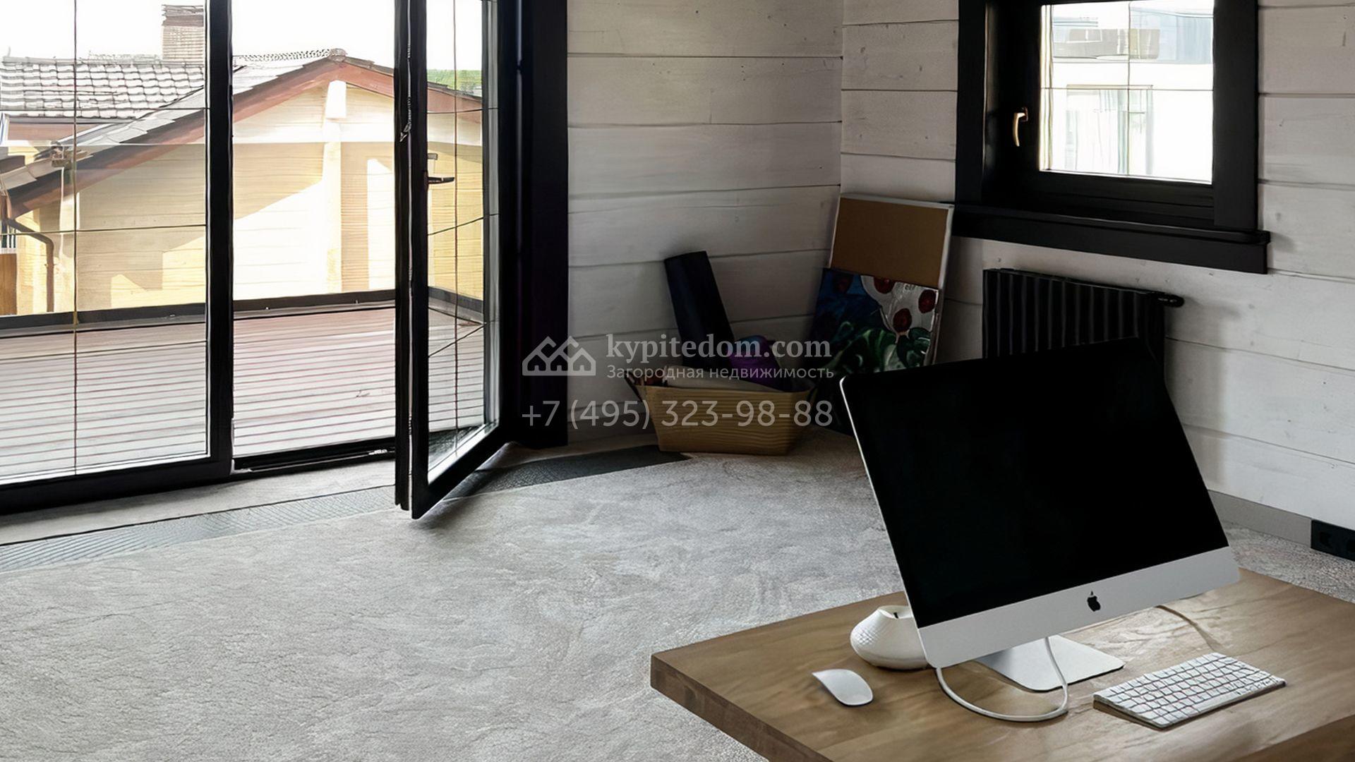 Загородный дом площадью 650 м² построен на полевом участке 13,5 сотки. Фасад здания с панорамными окнами выполнен из бруса в стиле «фахверк». В отделке современного интерьера преобладают молочные оттенки в сочетании с фактурой серого камня на напольной плитке. В коттедже спланировали 4 спальни, гостиную с подвесным камином и вторым светом, кухню, столовую, кабинет с балконом и большую террасу, где можно проводить вечера с барбекю. Рядом расположены баня с купелью на улице, гараж 60 м² и гостевая квартира. На участке выполнен ландшафтный дизайн, засеян газон и сделаны дорожки.