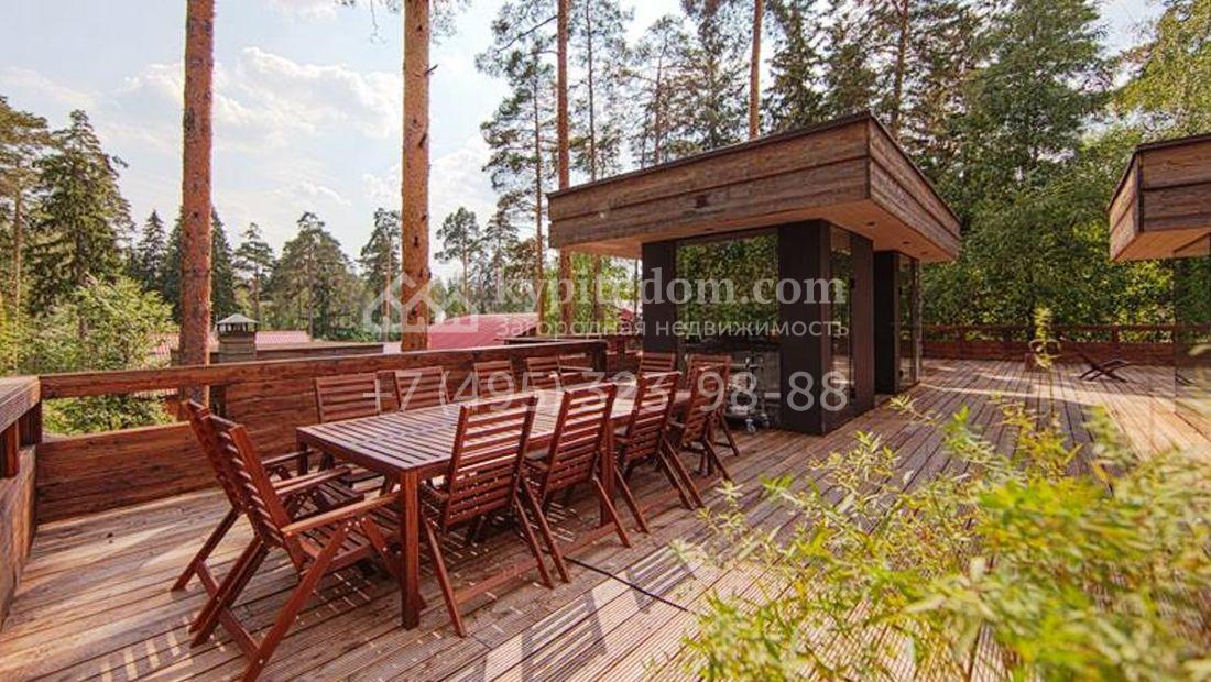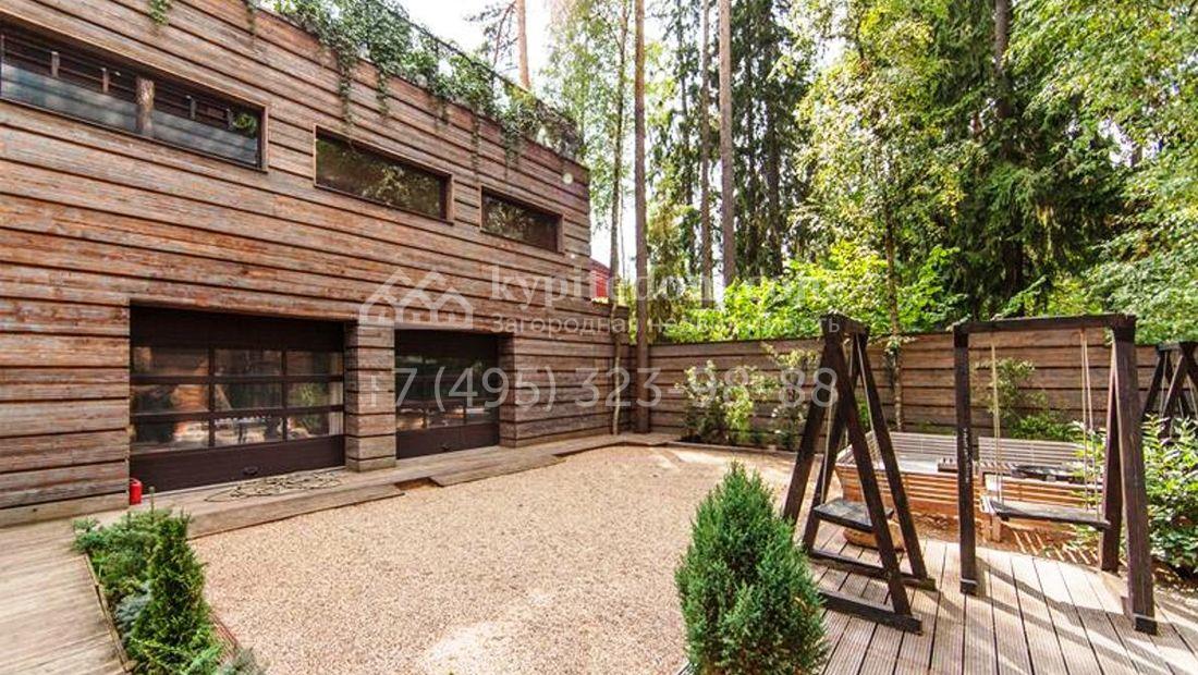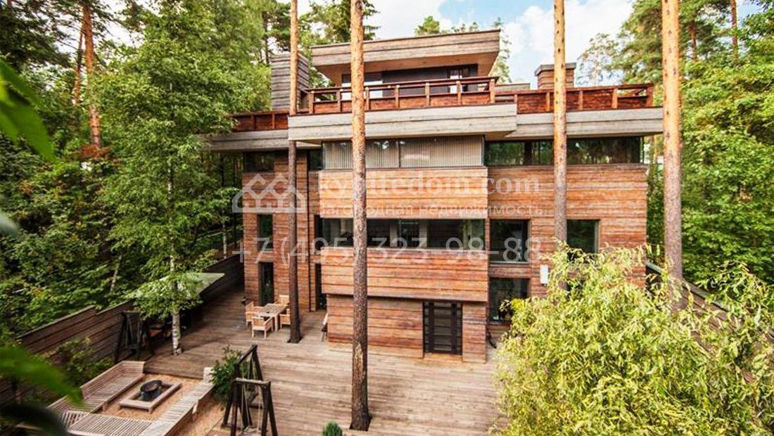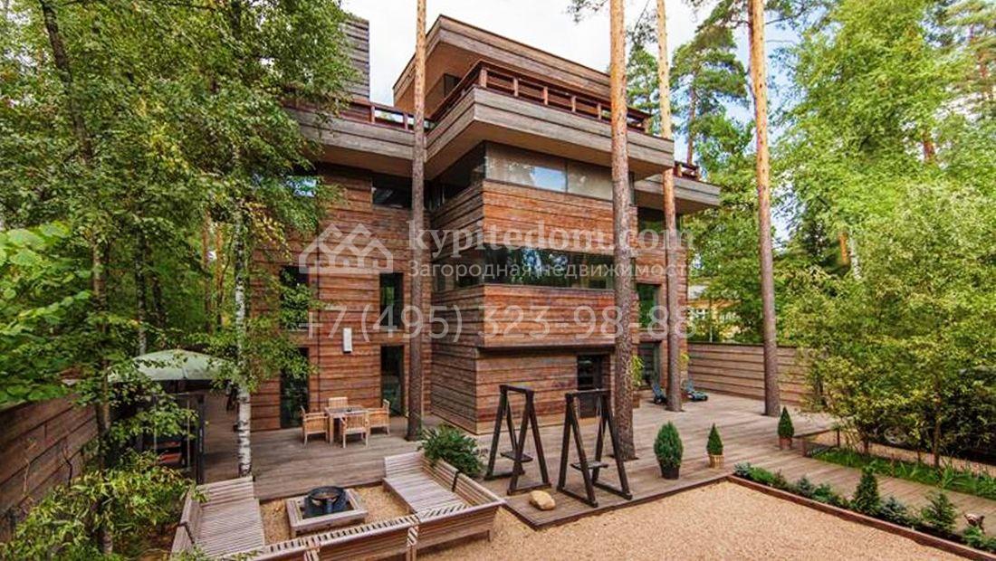 Трехэтажный дом в стиле американского архитектора ХХ века Френка Ллойда Райта скрыт в тени вековых сосен. Фасад здания облицован деревом и деликатно дополняет окружающий ландшафт. Внутри выполнена отделка в стиле минимализм. В зоне каминной двухсветное остекление, которое наполняет дом светом. На первом этаже расположен профессиональный кинотеатр, на втором — бильярдная и кабинет. Третий этаж занимают 3 спальни. Через все этажи проходит лифт. Особенность дома — возможность выйти на эксплуатируемую крышу, где можно устраивать летние званые ужины. Участок 8 соток практически полностью превращен в патио — около дома размещены качели, зона барбекю и летняя мебель. Гараж для 2 машин встроен в дом.
