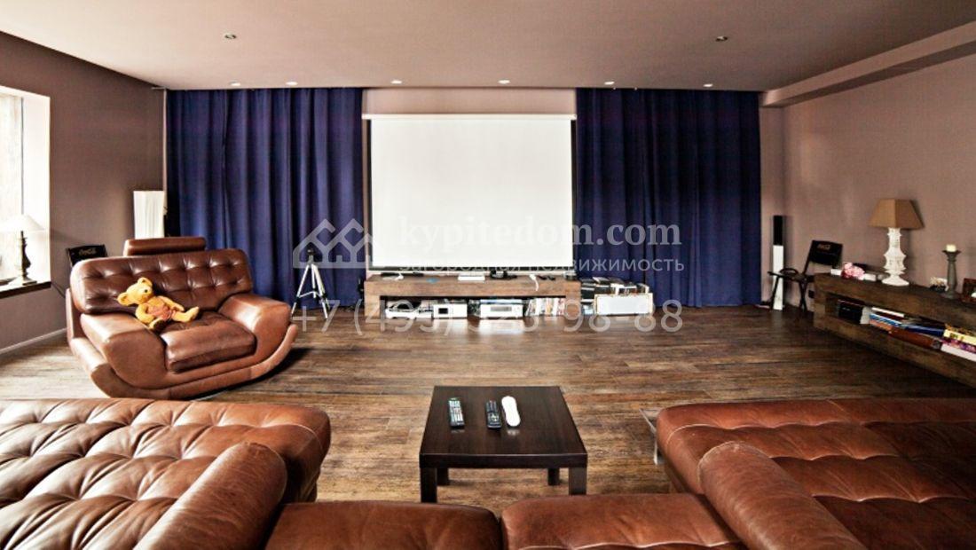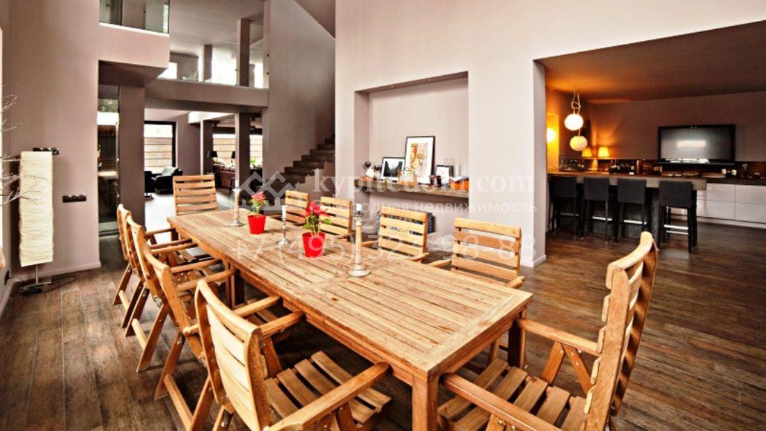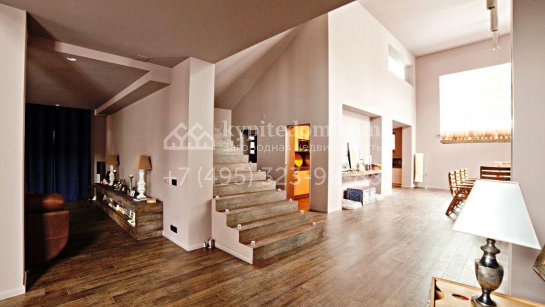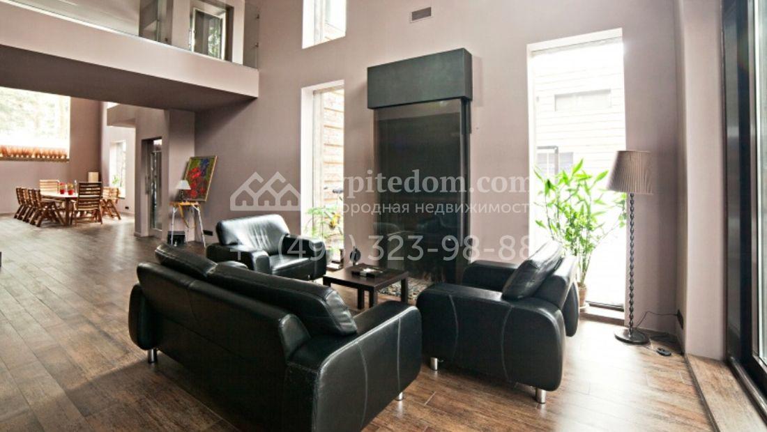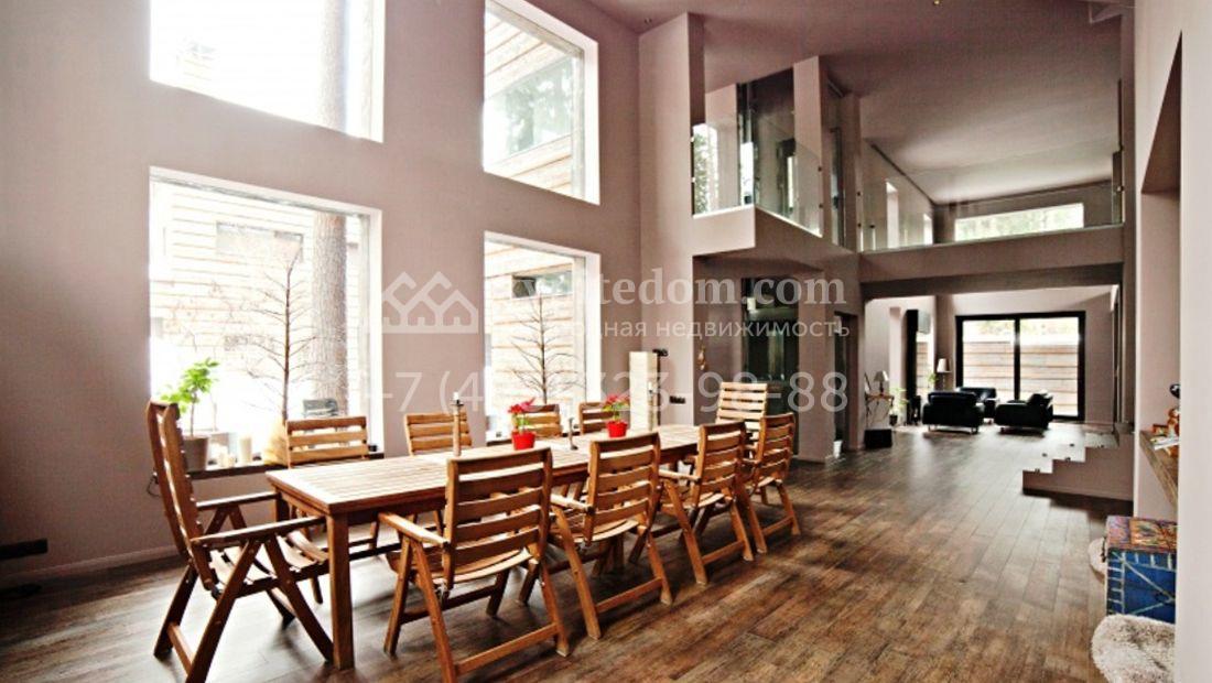 Трехэтажный дом в стиле американского архитектора ХХ века Френка Ллойда Райта скрыт в тени вековых сосен. Фасад здания облицован деревом и деликатно дополняет окружающий ландшафт. Внутри выполнена отделка в стиле минимализм. В зоне каминной двухсветное остекление, которое наполняет дом светом. На первом этаже расположен профессиональный кинотеатр, на втором — бильярдная и кабинет. Третий этаж занимают 3 спальни. Через все этажи проходит лифт. Особенность дома — возможность выйти на эксплуатируемую крышу, где можно устраивать летние званые ужины. Участок 8 соток практически полностью превращен в патио — около дома размещены качели, зона барбекю и летняя мебель. Гараж для 2 машин встроен в дом.