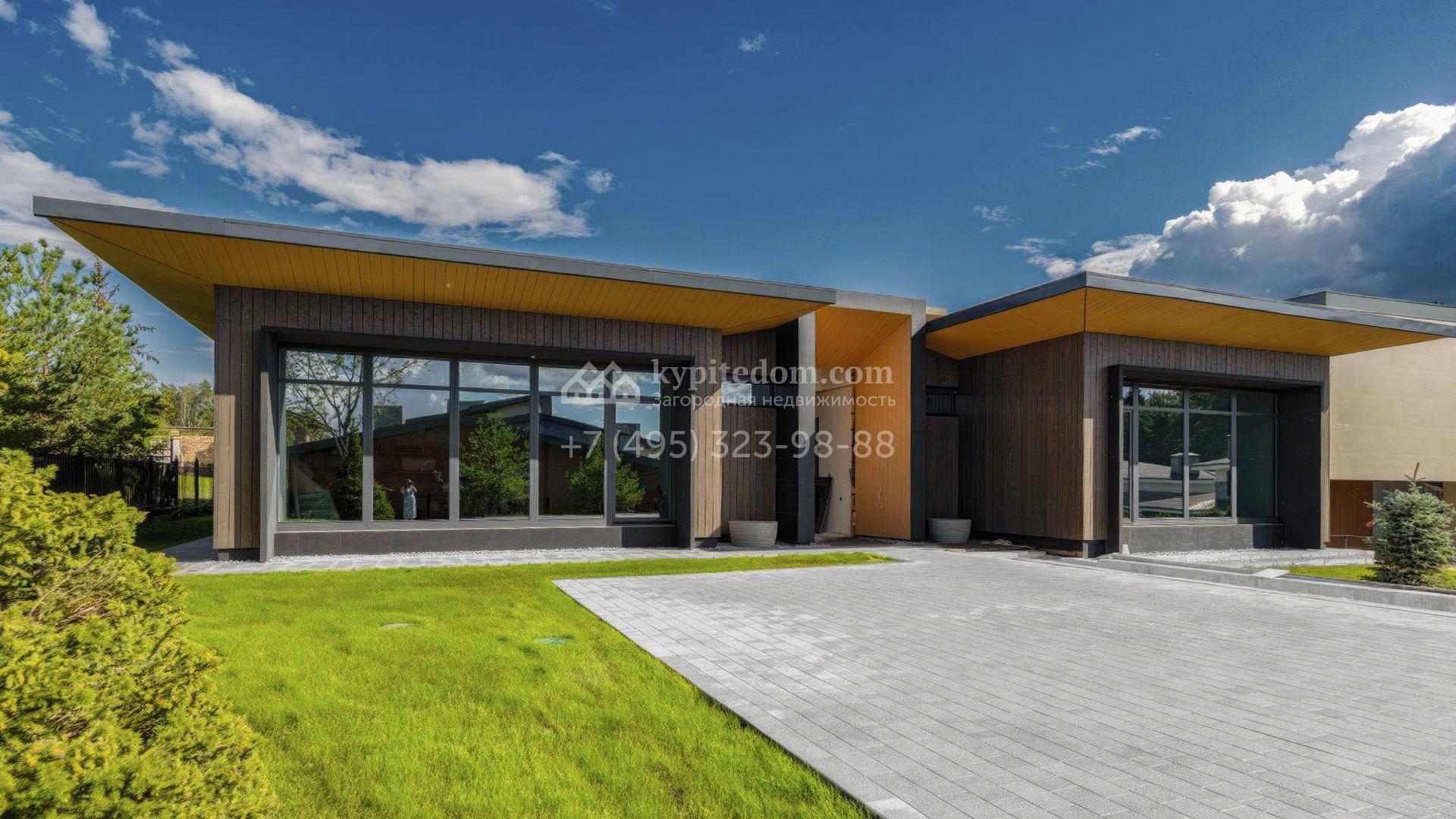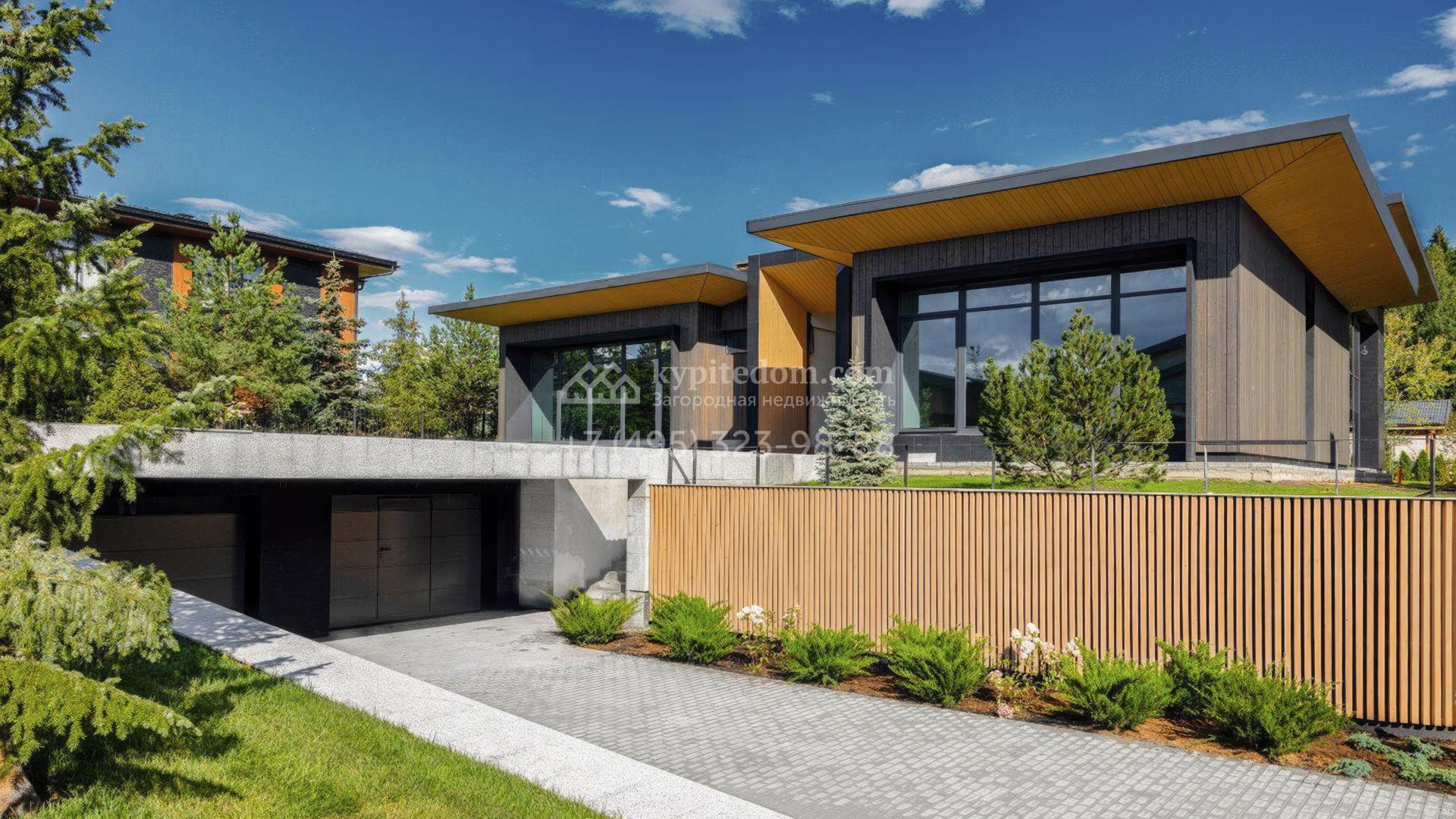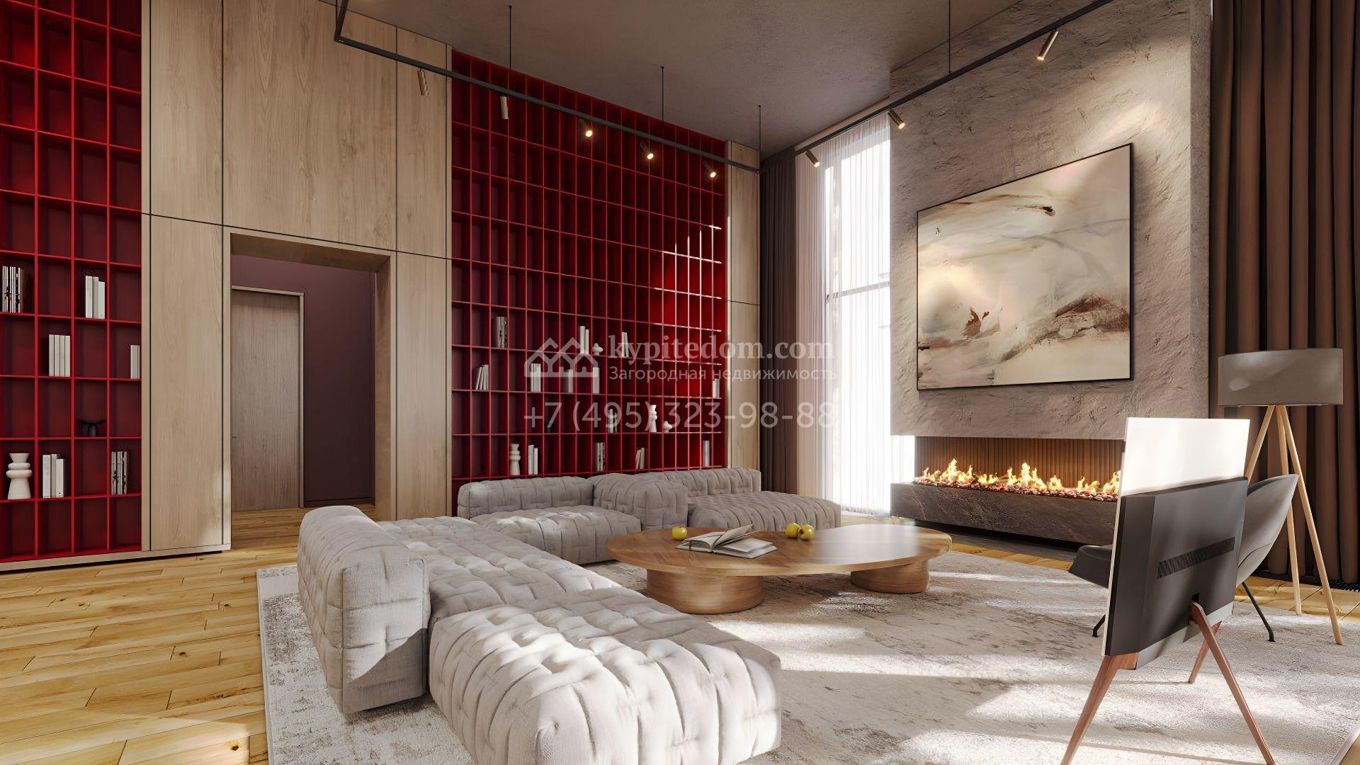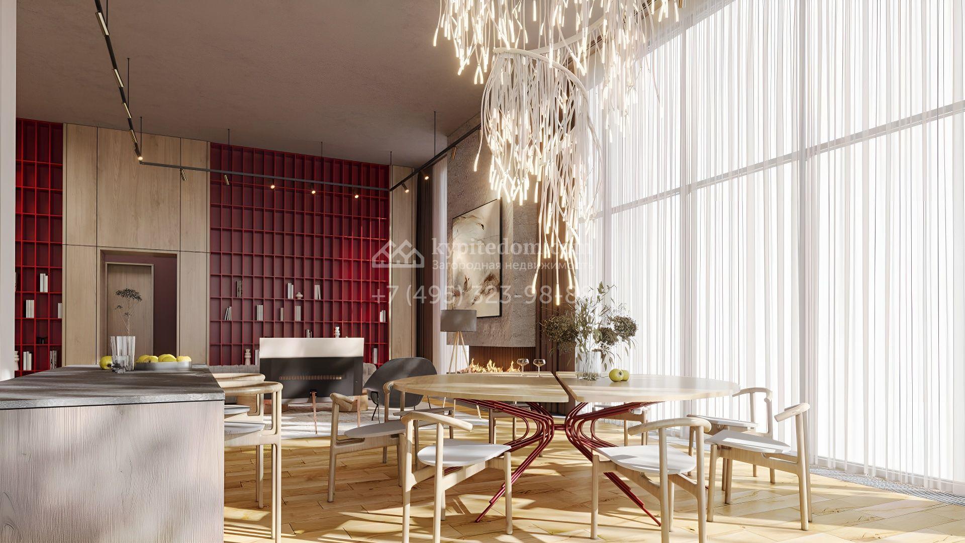 Современный загородный коттедж площадью 489 м² расположен на полевом участке 22 сотки. Фасад, выполненный в стиле минимализм, облицован панелями с фактурой дерева и гармонично вписан в ландшафт. Панорамные окна стирают грань между природным окружением и интерьерами, наполненными солнечным теплом. Внутреннее пространство выдержано в светлых тонах, дополнено ярко-красными акцентами, а также элегантными люстрами и картинами. Дом полностью укомплектован комфортной мебелью, встроенной бытовой техникой и сантехникой.
