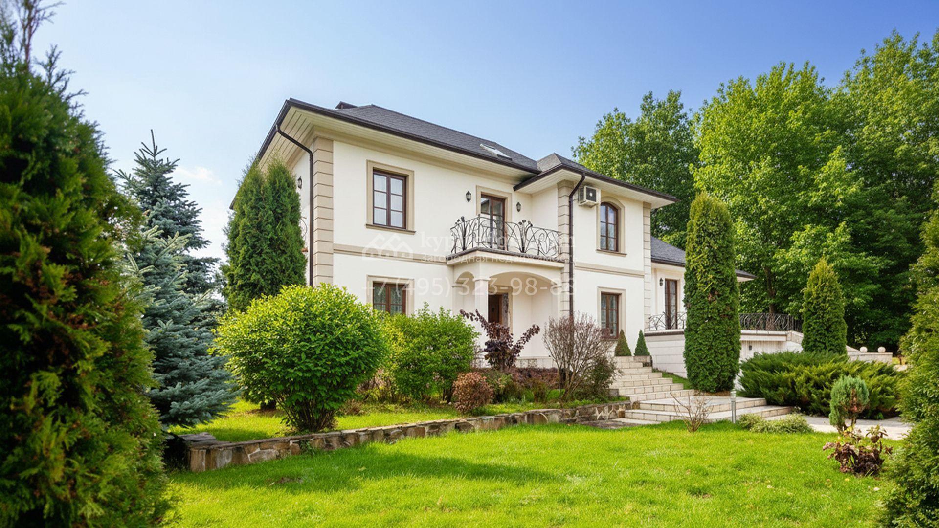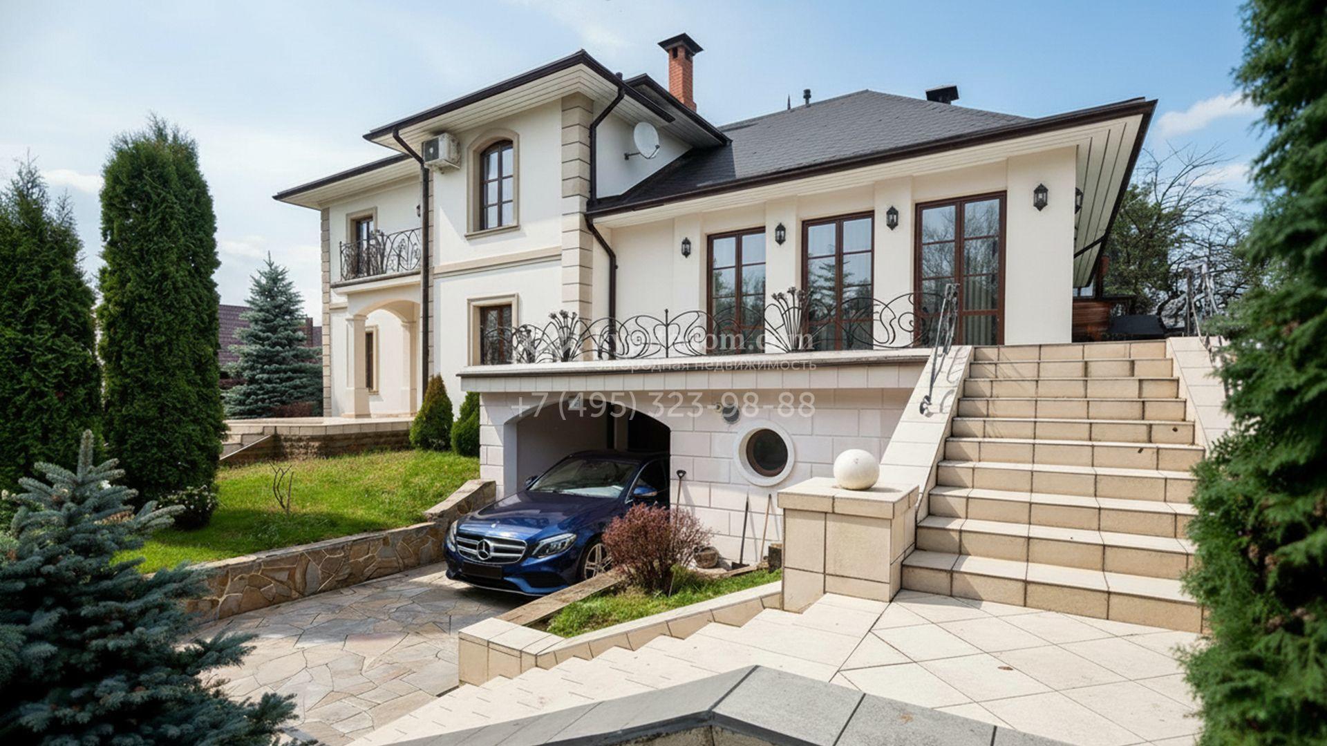 Дом в стиле «модерн» расположен на участке 24 сотки с продуманным ландшафтным оформлением. Светлый фасад украшен коваными парапетами с растительным мотивом, а высокий цоколь позволяет разместить встроенный гараж. Просторные террасы выходят в сад и объединяют дом с участком. Интерьеры выдержаны в светлой гамме и дополнены деревянной мебелью.