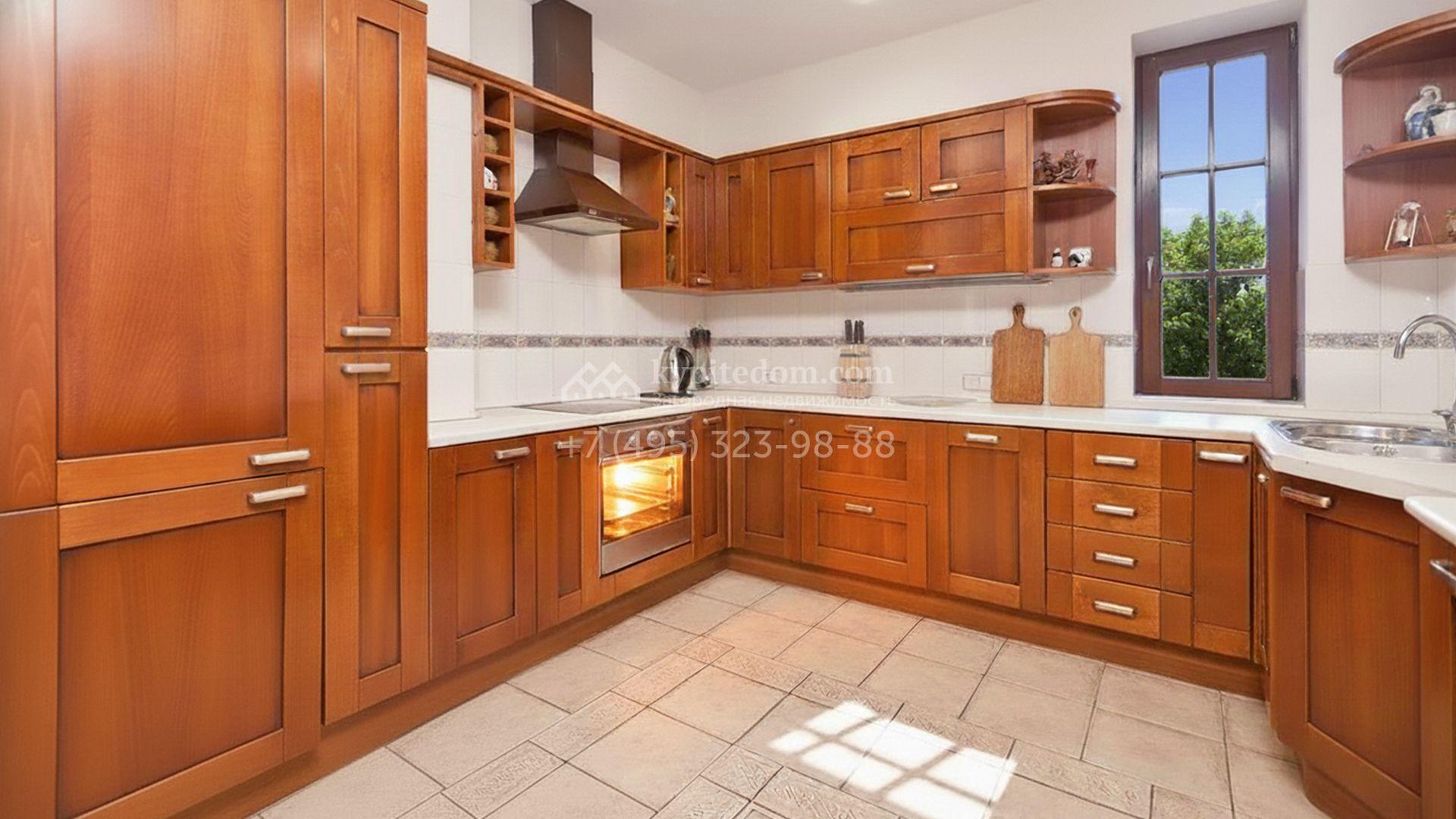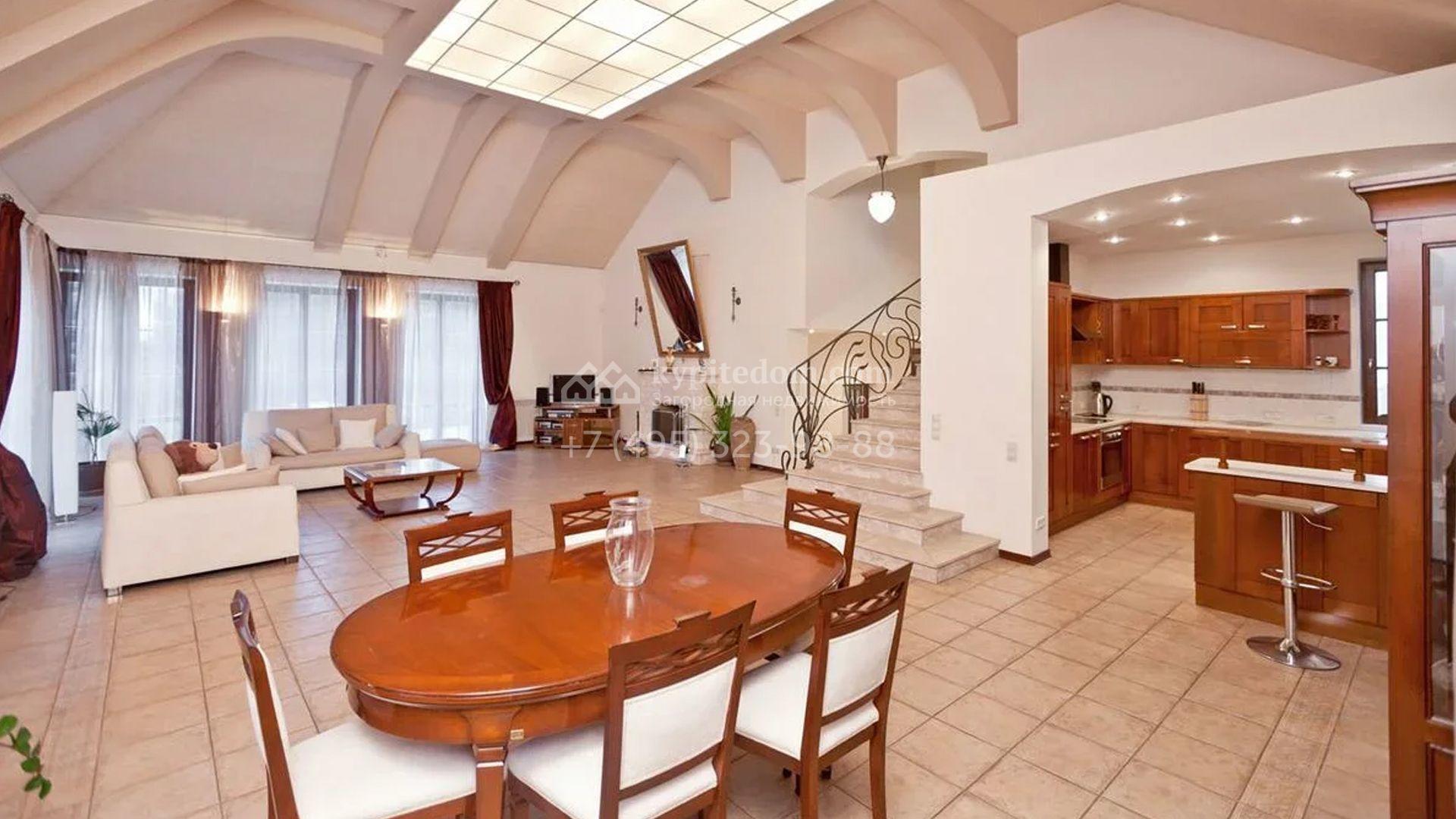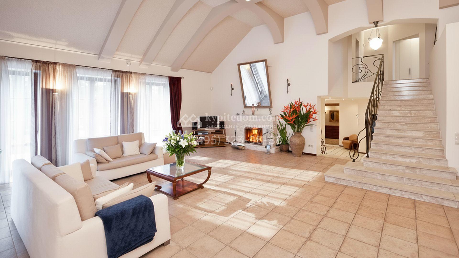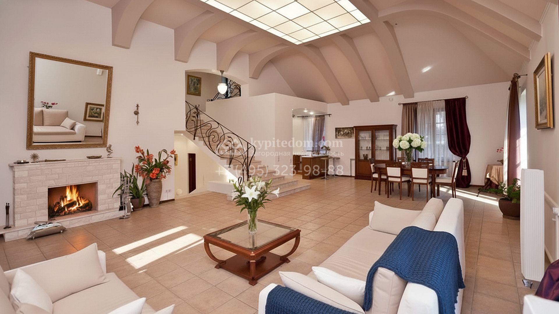 Главное пространство — двухсветная гостиная со сводчатым потолком и камином. Кухня и санузлы оснащены необходимой встроенной техникой. Планировка включает четыре спальни, гостиную и кухню-столовую. На участке устроены каменные дорожки из плитки и сланца, разбит газон и высажены декоративные кустарники, формирующие аккуратные зелёные зоны вокруг дома.