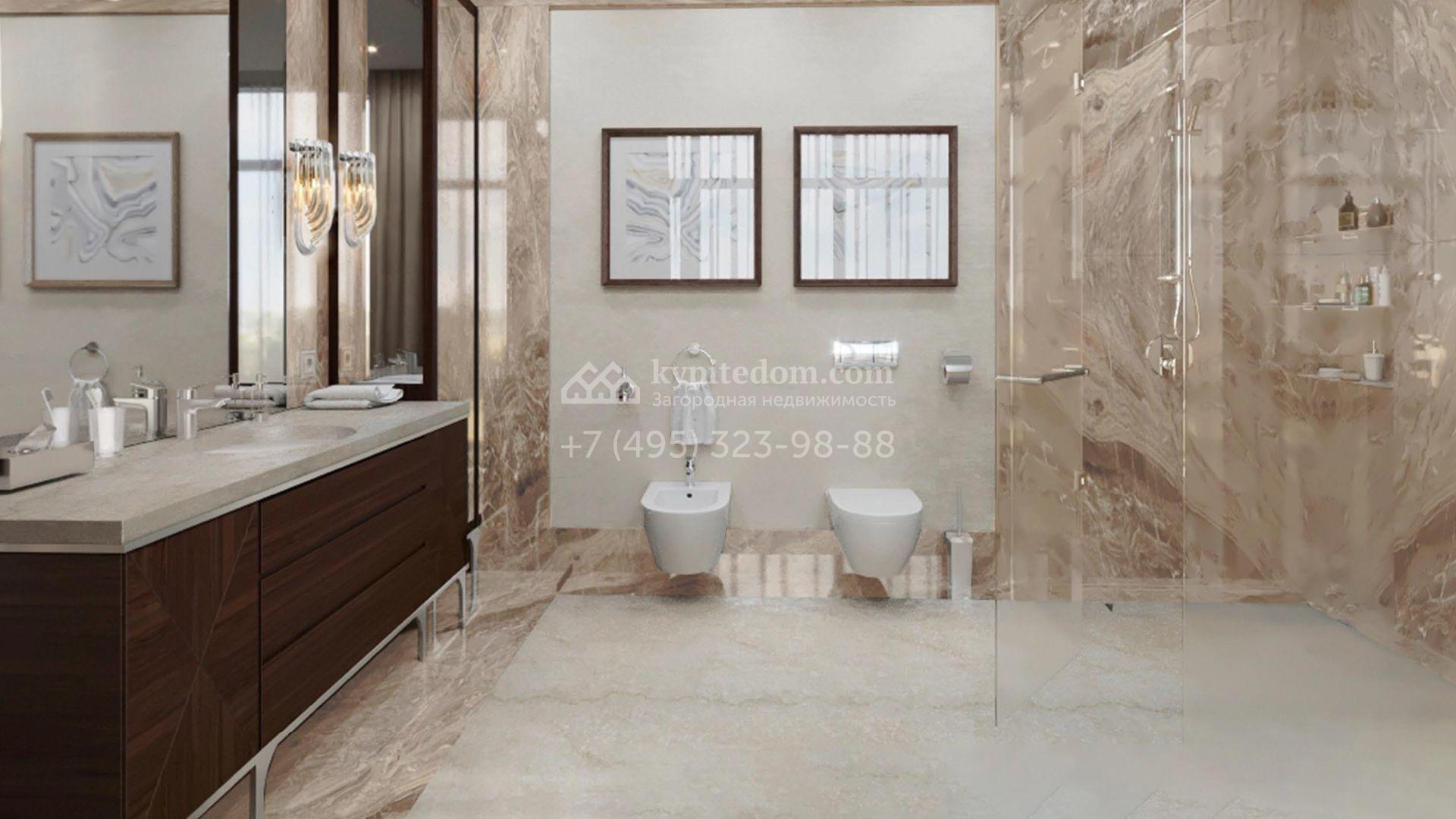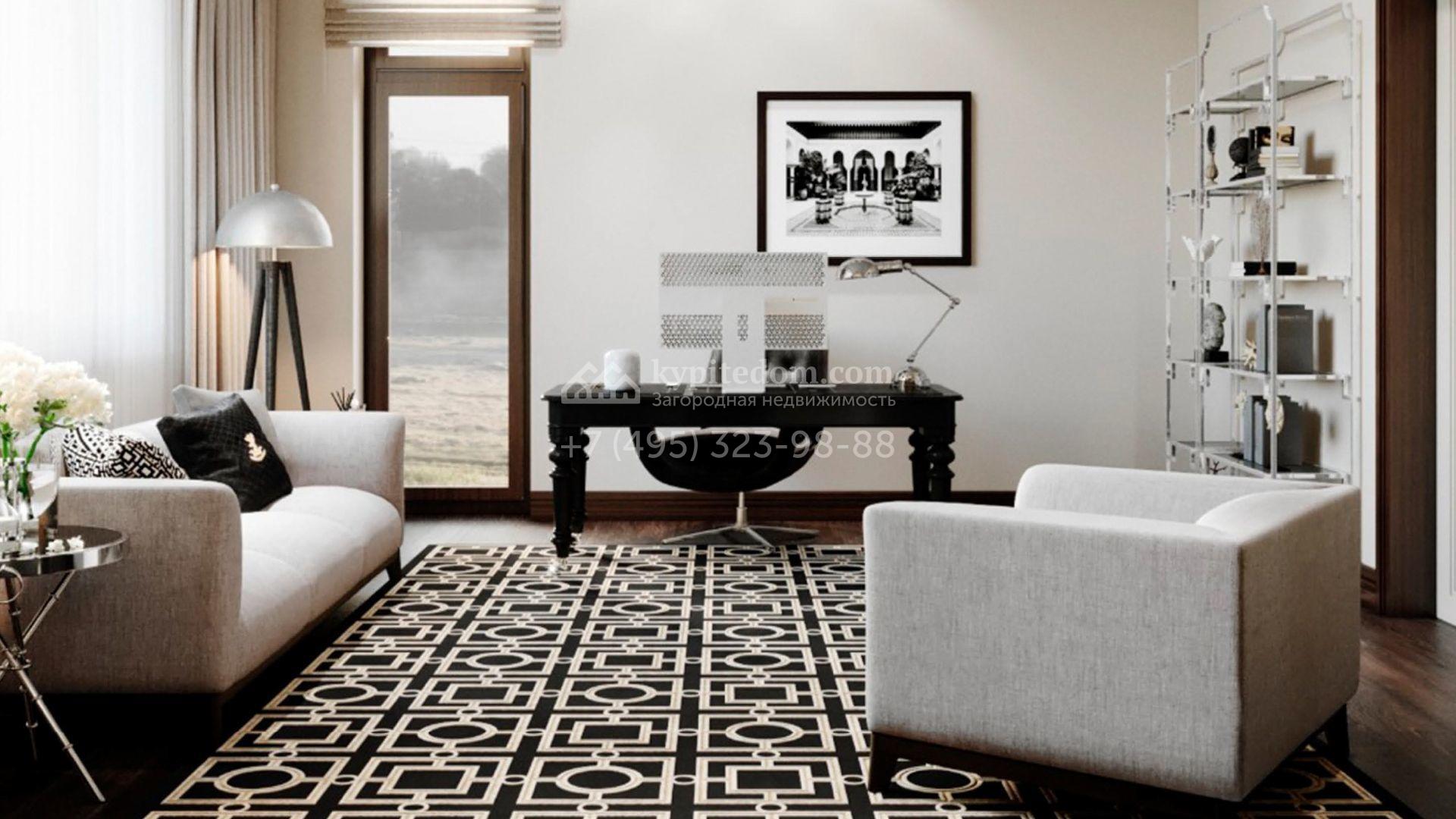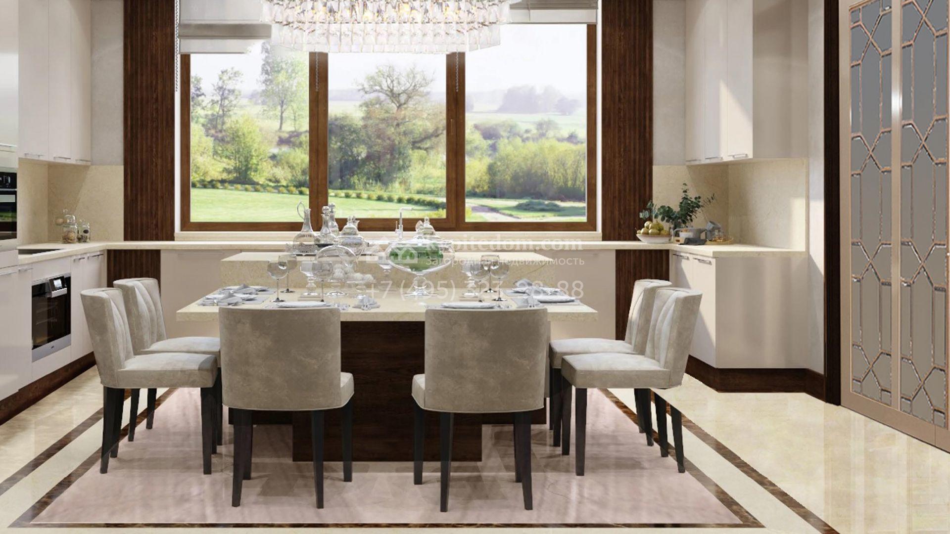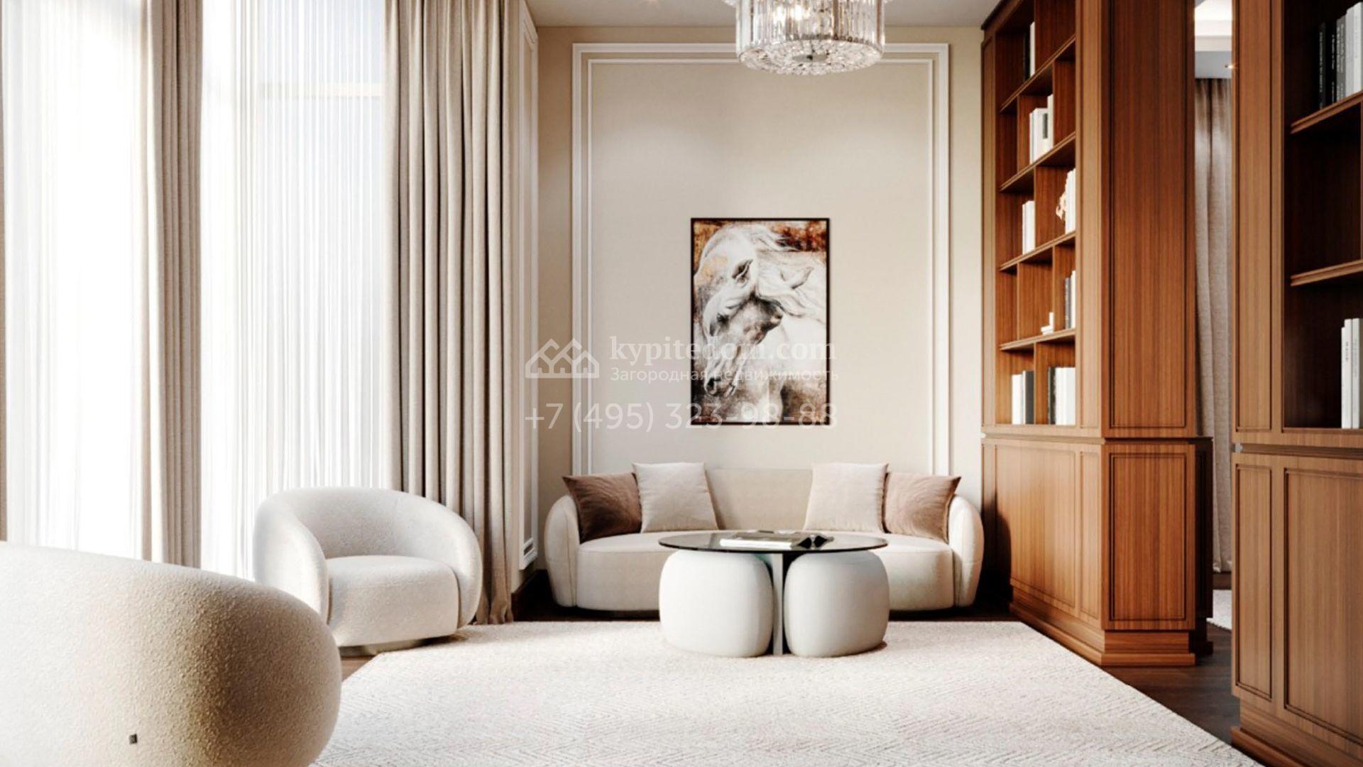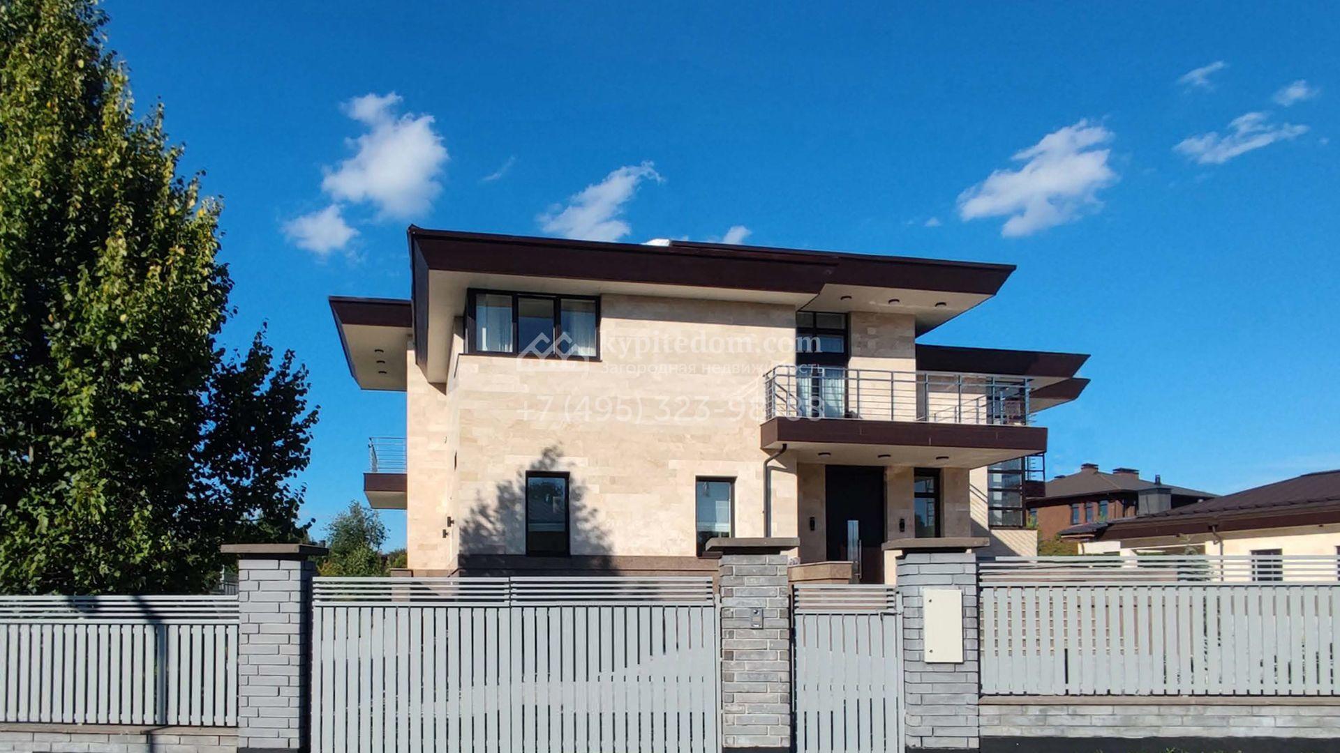Коттедж с отделкой «под ключ» площадью 942 м² построен на полевом участке 38 соток в дальней части поселка. Фасад здания спроектировано в стиле райта и облицовано натуральным камнем двух цветов. В доме можно спланировать до 3-х просторных спален с санузлами и гардеробными комнатами. Первый этаж займет гостиная для приемов, кухня и кинозал. Дополнительно на территории предусмотрен гараж 175,3 м².