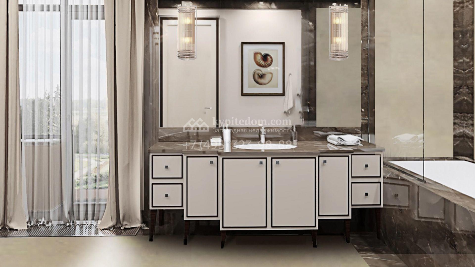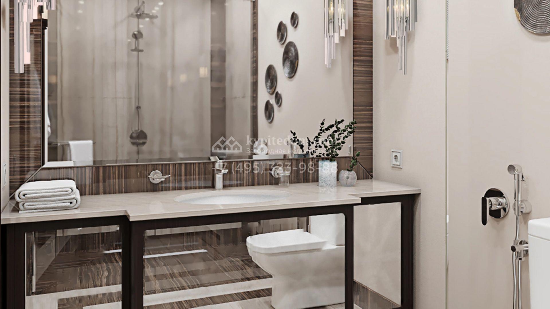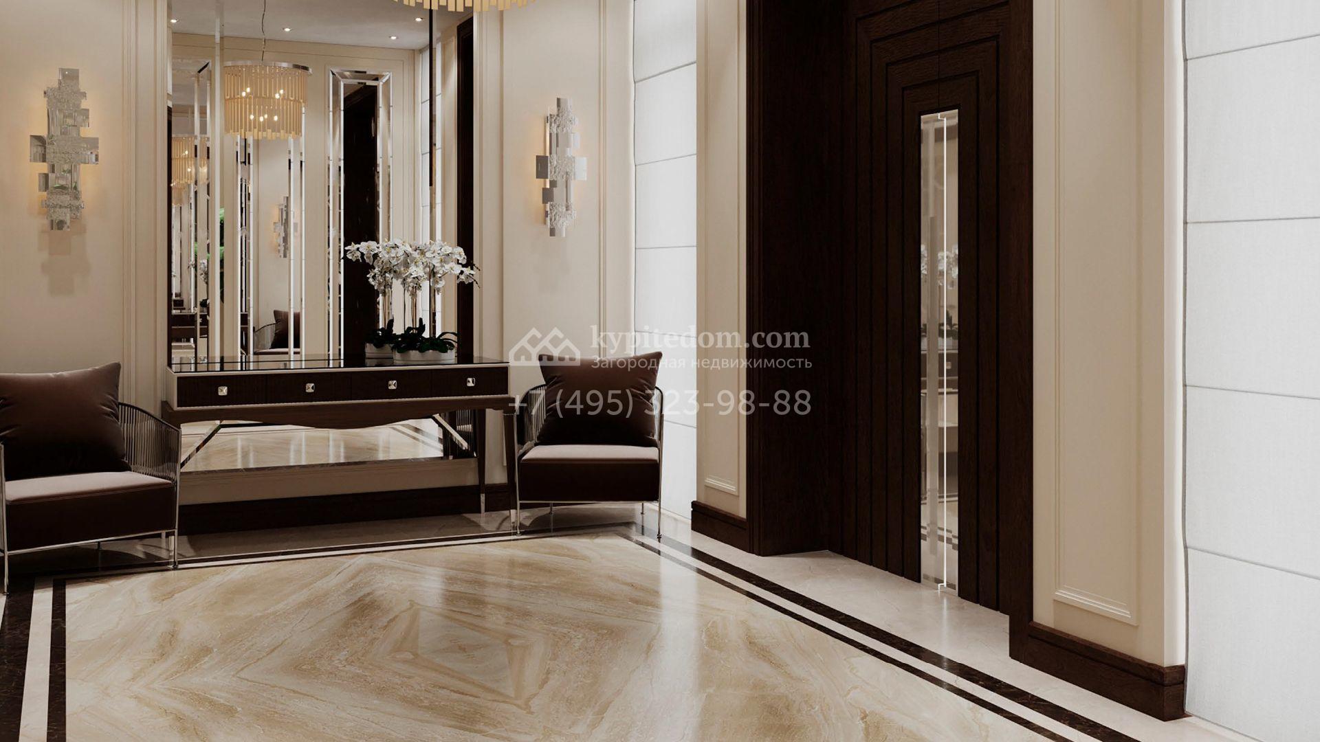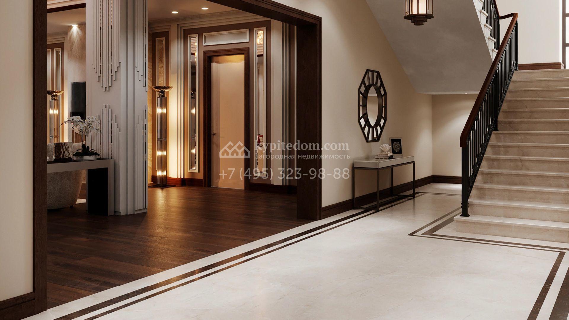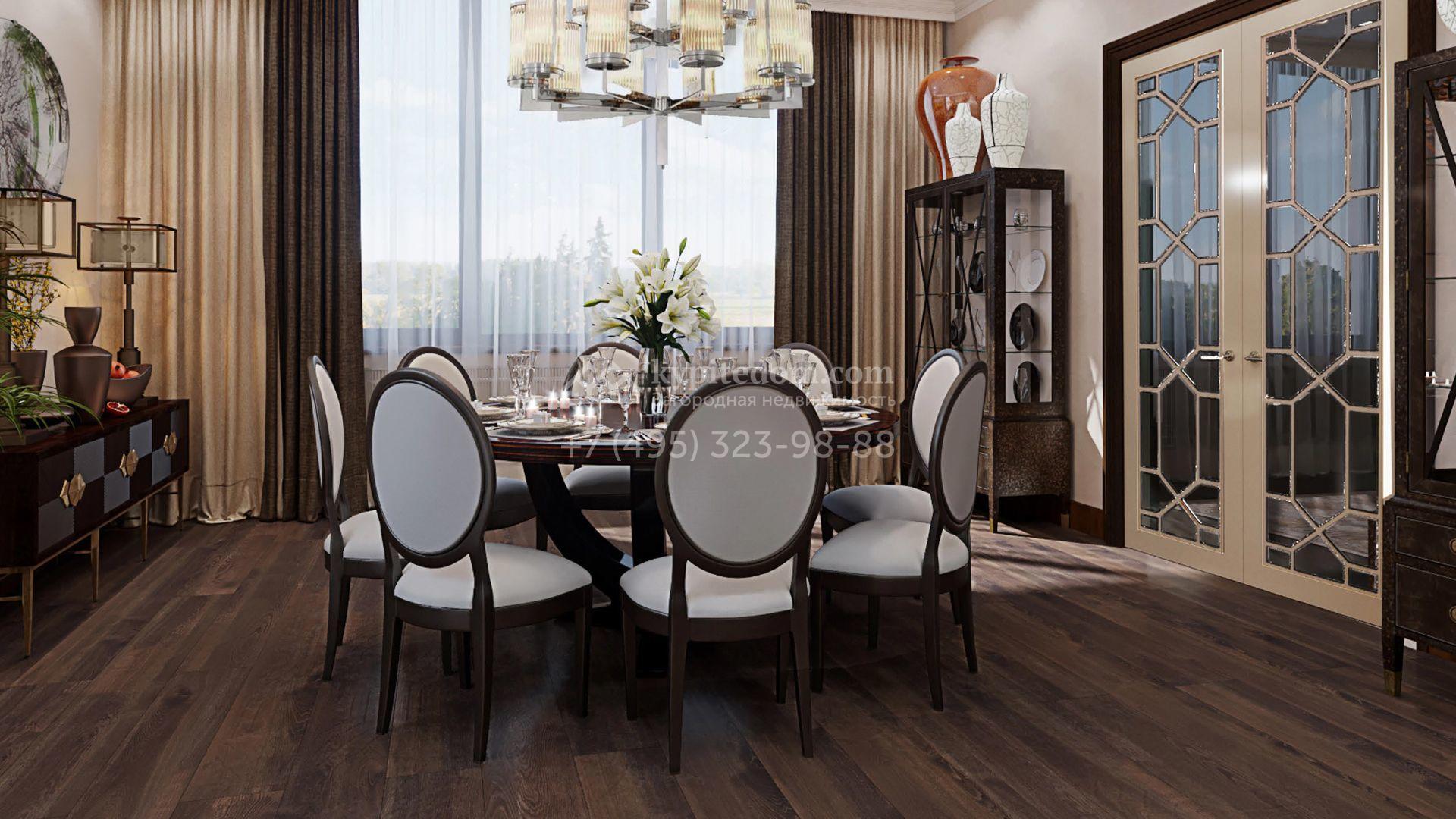 Коттедж с отделкой «под ключ» площадью 942 м² построен на полевом участке 38 соток в дальней части поселка. Фасад здания спроектировано в стиле райта и облицовано натуральным камнем двух цветов. В доме можно спланировать до 3-х просторных спален с санузлами и гардеробными комнатами. Первый этаж займет гостиная для приемов, кухня и кинозал. Дополнительно на территории предусмотрен гараж 175,3 м².