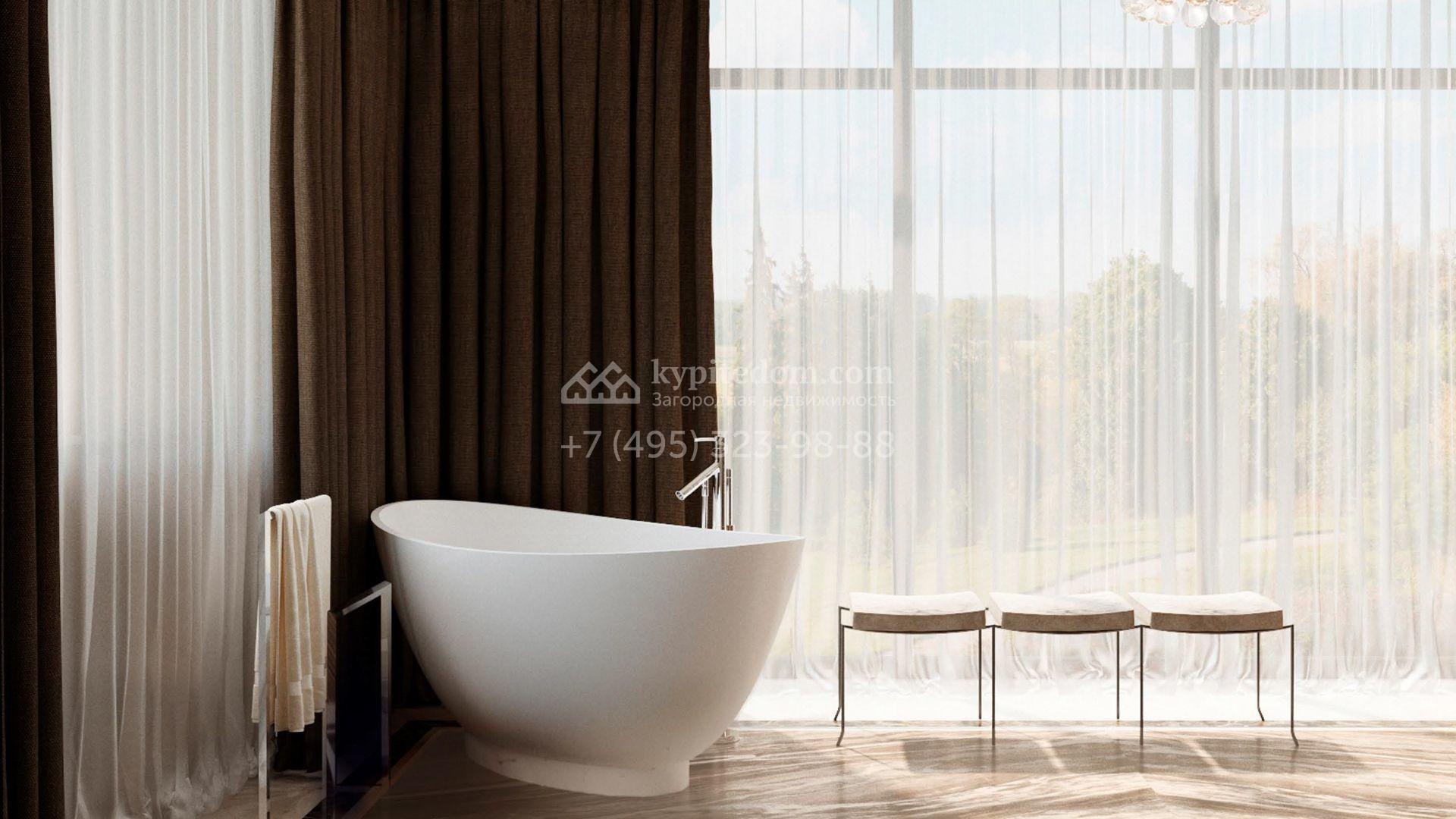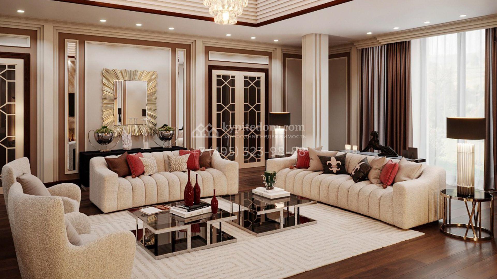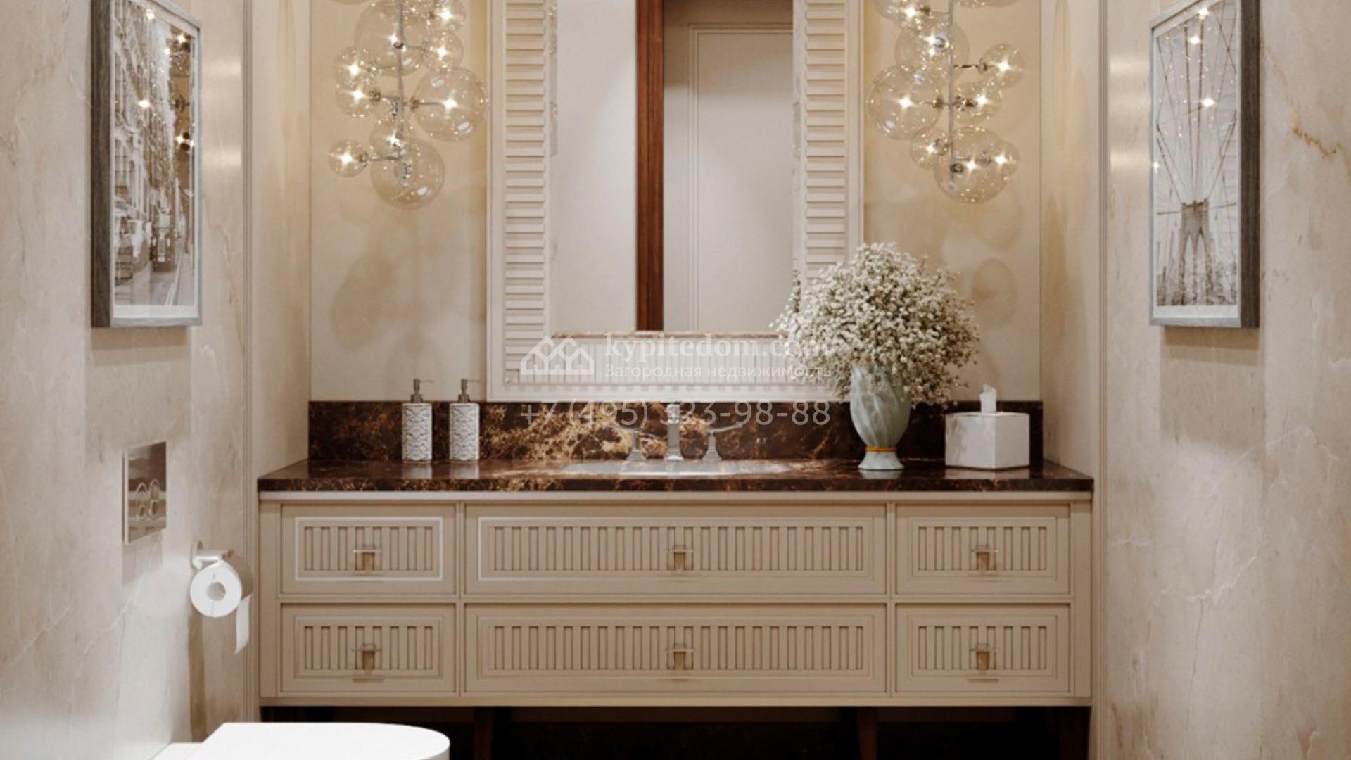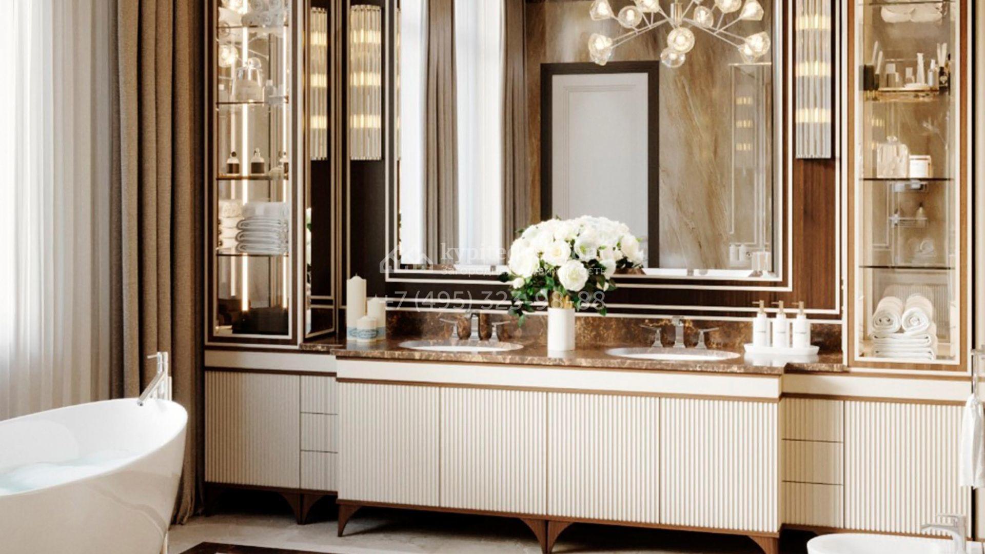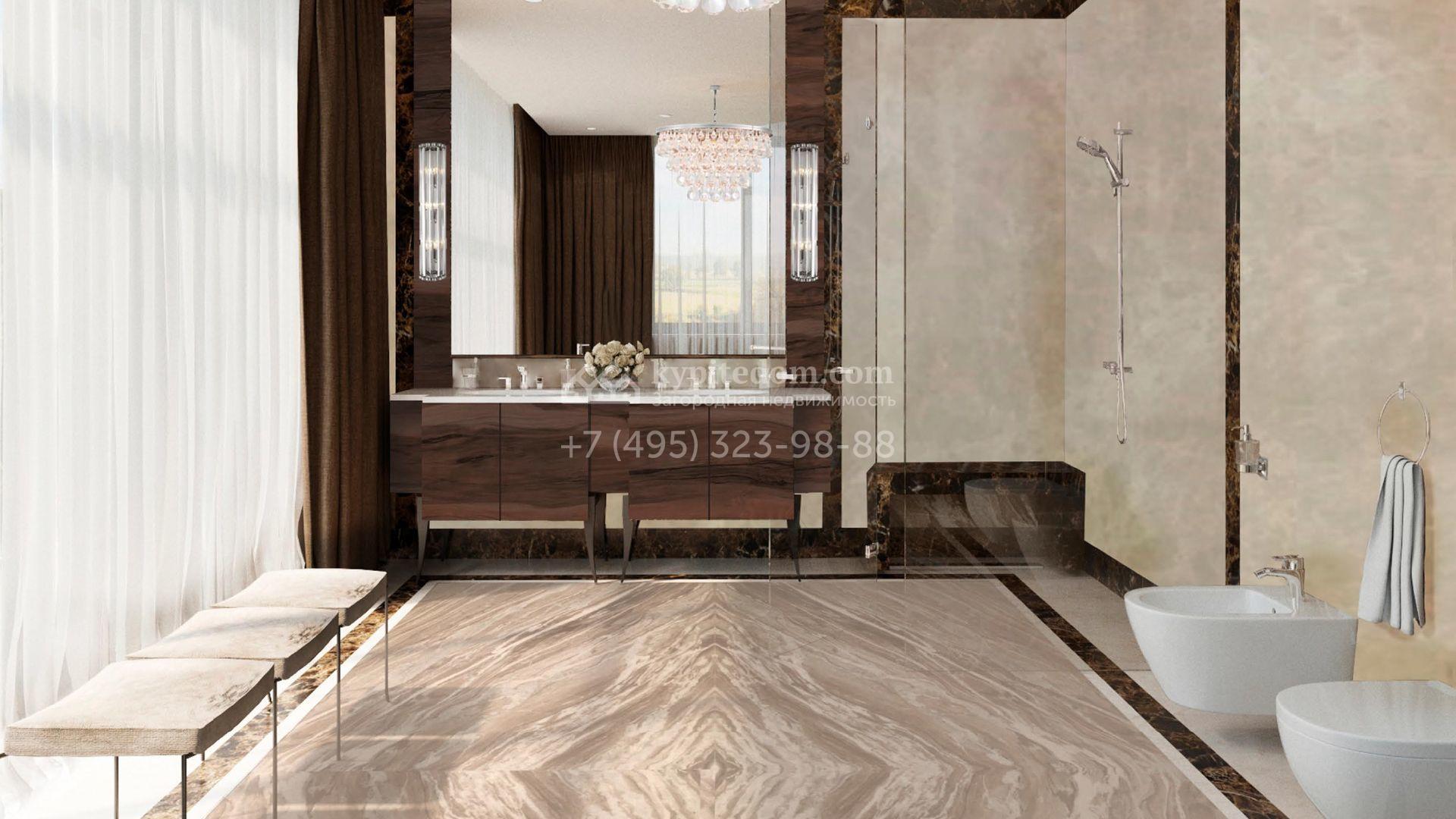 Коттедж с отделкой «под ключ» площадью 942 м² построен на полевом участке 38 соток в дальней части поселка. Фасад здания спроектировано в стиле райта и облицовано натуральным камнем двух цветов. В доме можно спланировать до 3-х просторных спален с санузлами и гардеробными комнатами. Первый этаж займет гостиная для приемов, кухня и кинозал. Дополнительно на территории предусмотрен гараж 175,3 м².
