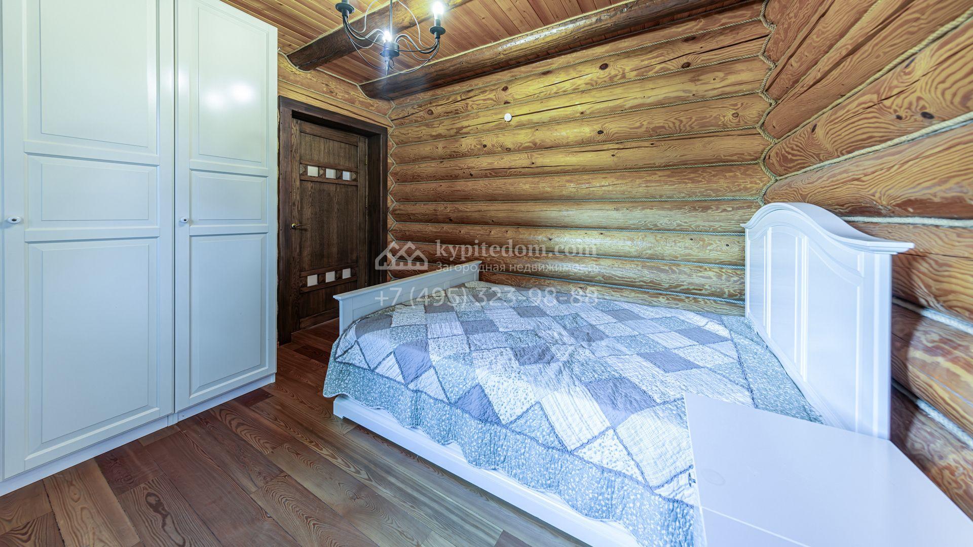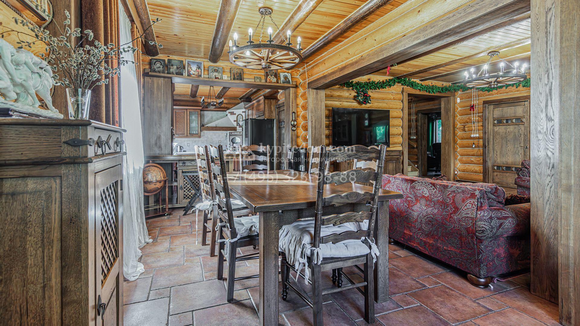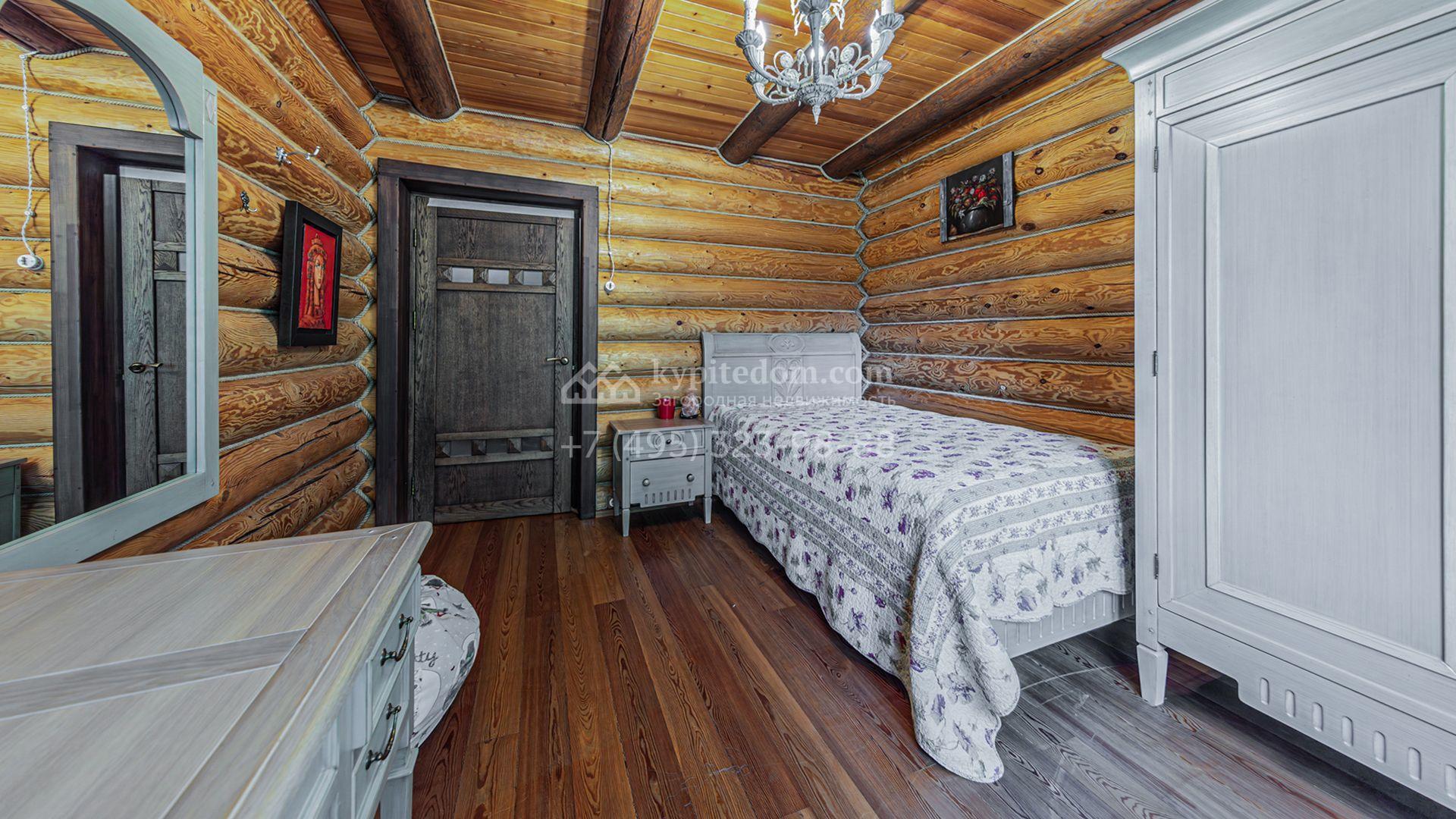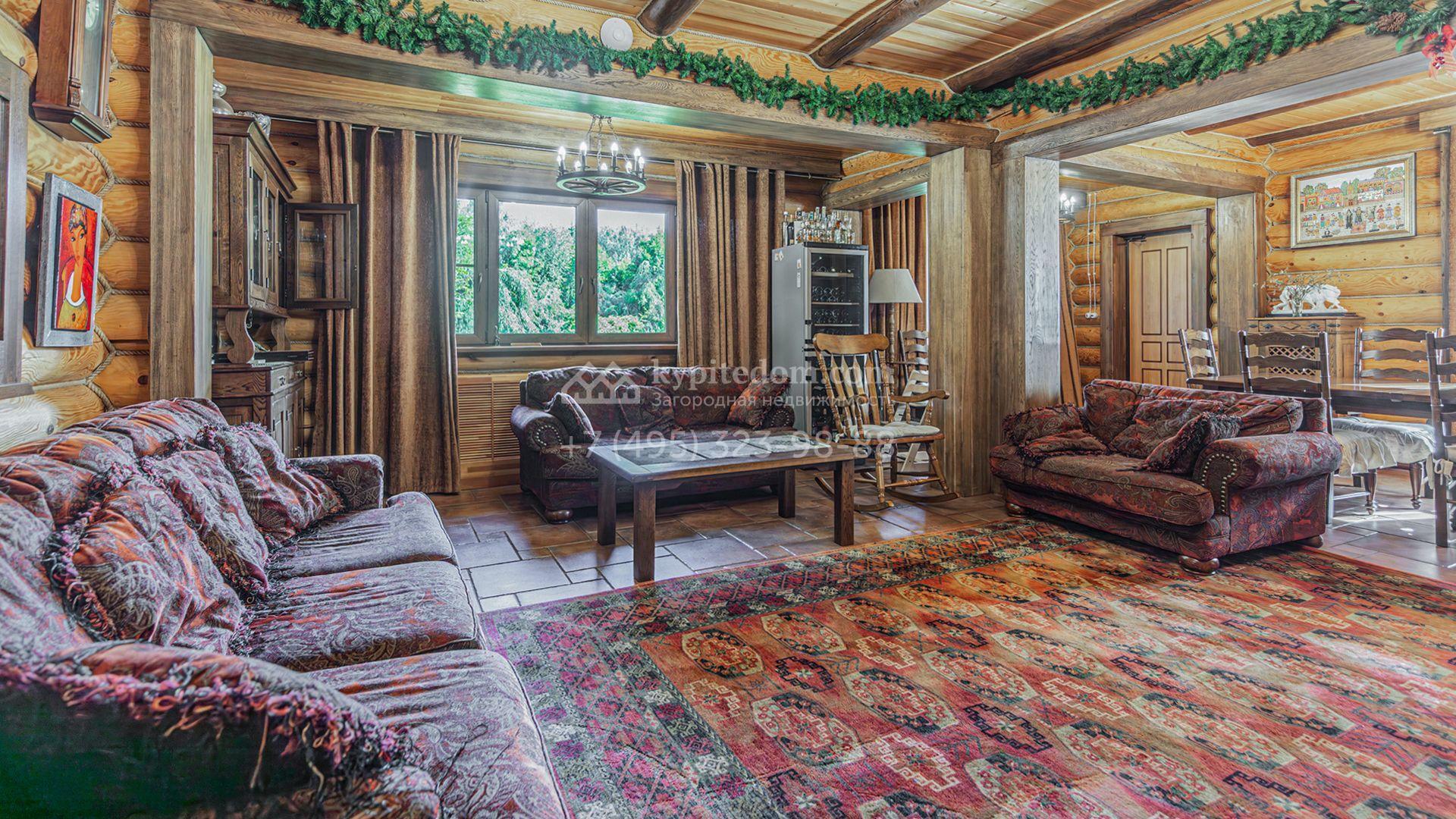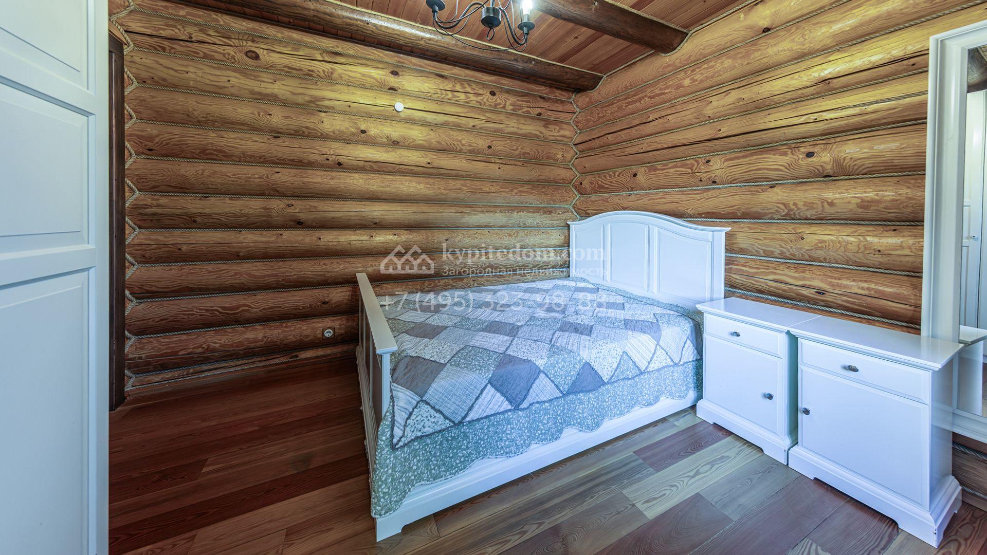 Загородный дом площадью 352 м² построен на просторном полевом участке 40 соток. Фасад здания выполнен из бревна в стиле «шале». В отделке интерьера сохранена фактура дерева, создающая атмосферу тепла и уюта. В резиденции разместили 9 спален, гостиную, кухню-столовую и бильярдную. Рядом расположены баня с комнатой отдыха и санузлом, гараж на 3 машины с квартирой для персонала и котельной, а также закрытая беседка с мангальной зоной. На участке выполнен ландшафтный дизайн, вымощены дорожки, высажены кустарники и цветы.
