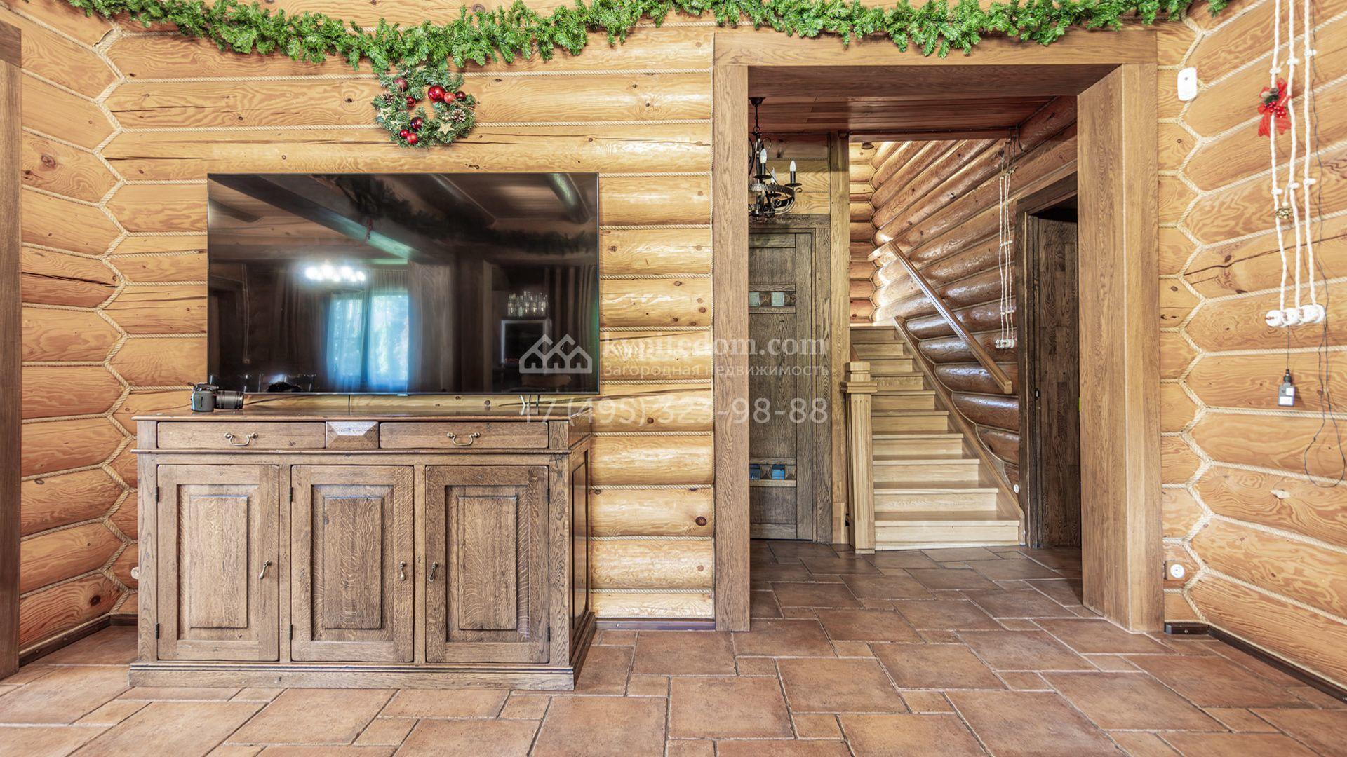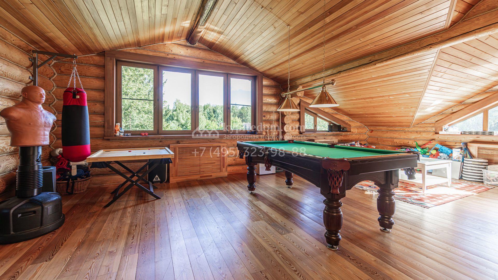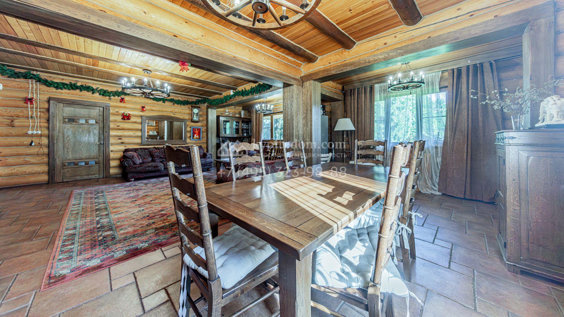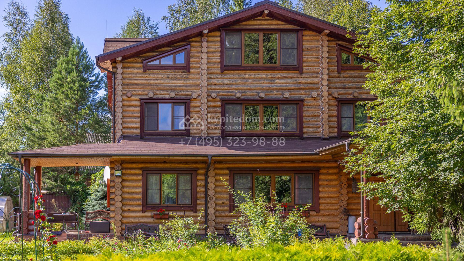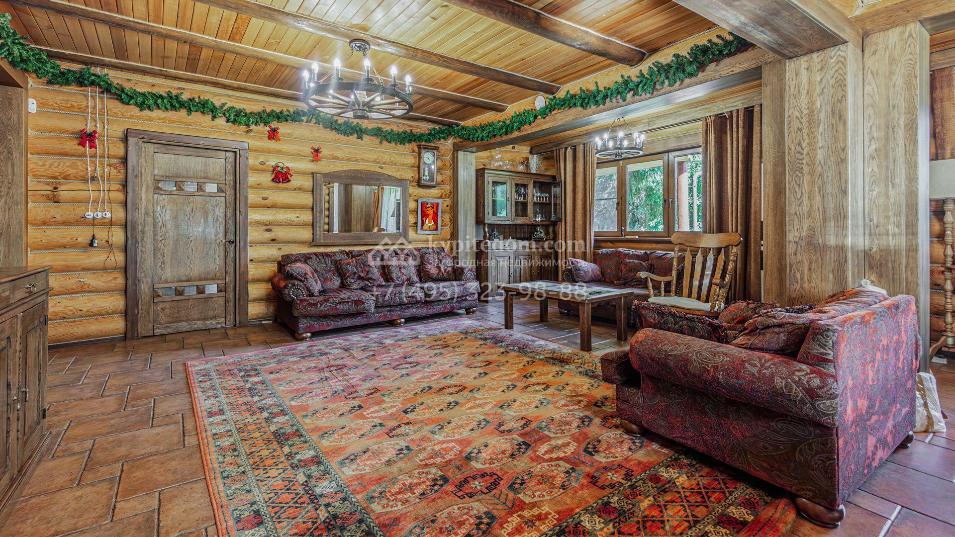 Загородный дом площадью 352 м² построен на просторном полевом участке 40 соток. Фасад здания выполнен из бревна в стиле «шале». В отделке интерьера сохранена фактура дерева, создающая атмосферу тепла и уюта. В резиденции разместили 9 спален, гостиную, кухню-столовую и бильярдную. Рядом расположены баня с комнатой отдыха и санузлом, гараж на 3 машины с квартирой для персонала и котельной, а также закрытая беседка с мангальной зоной. На участке выполнен ландшафтный дизайн, вымощены дорожки, высажены кустарники и цветы.