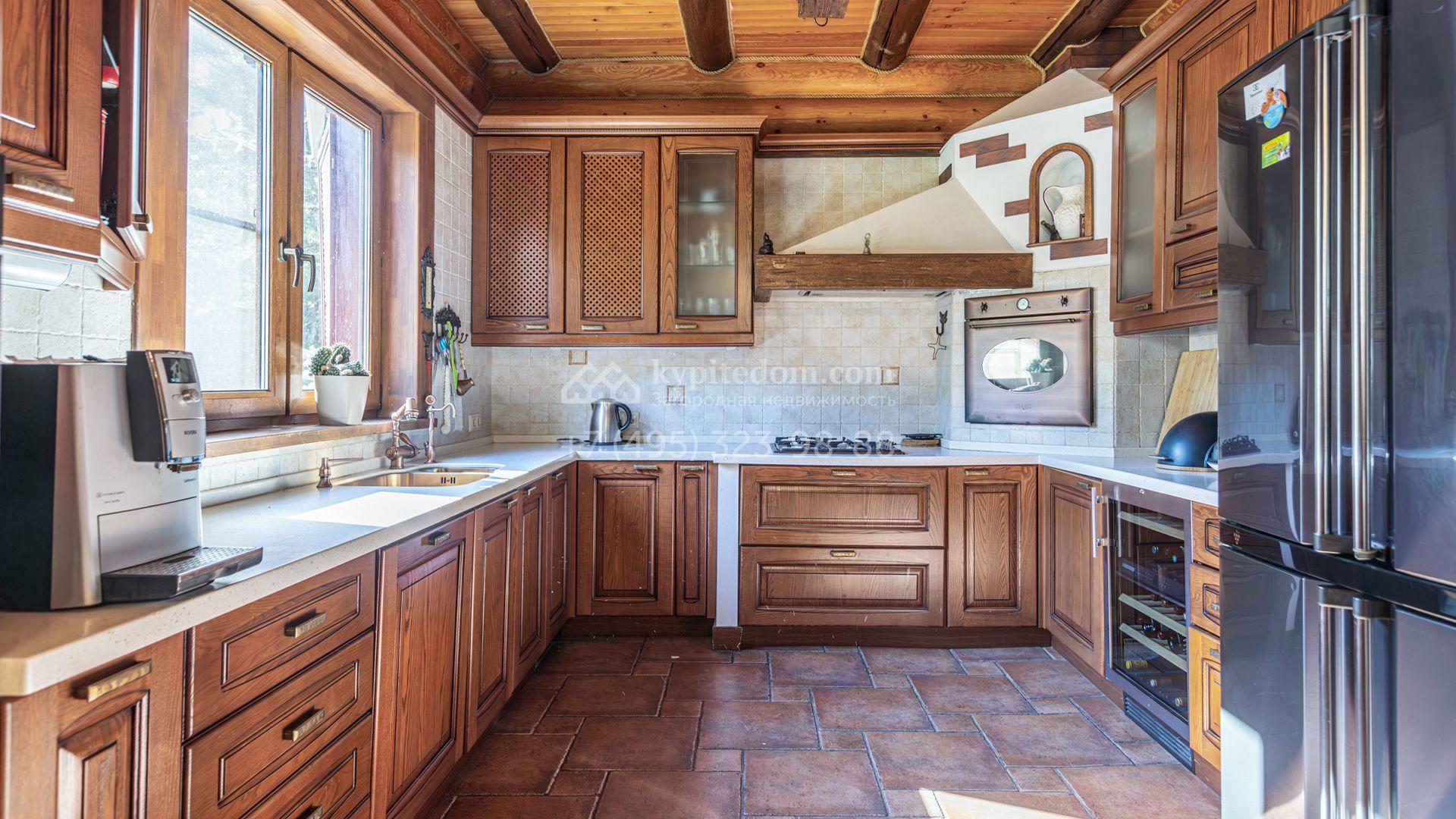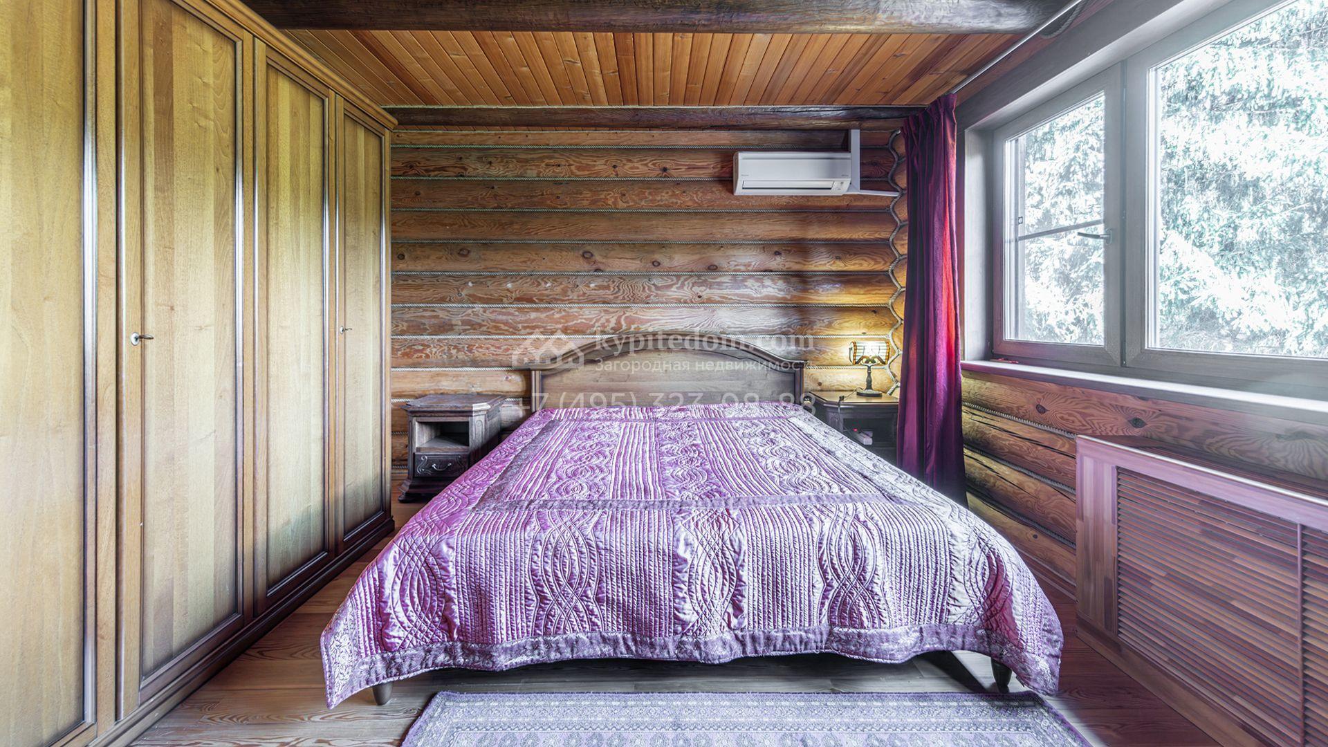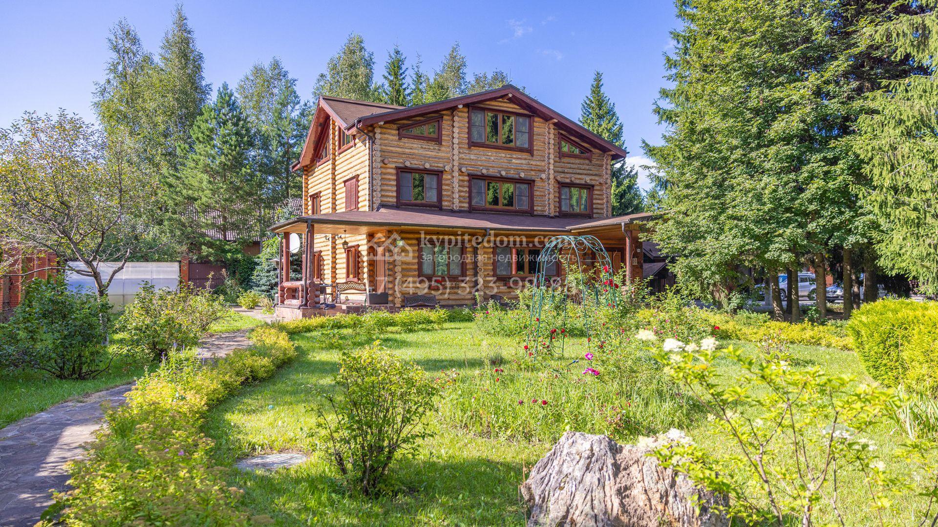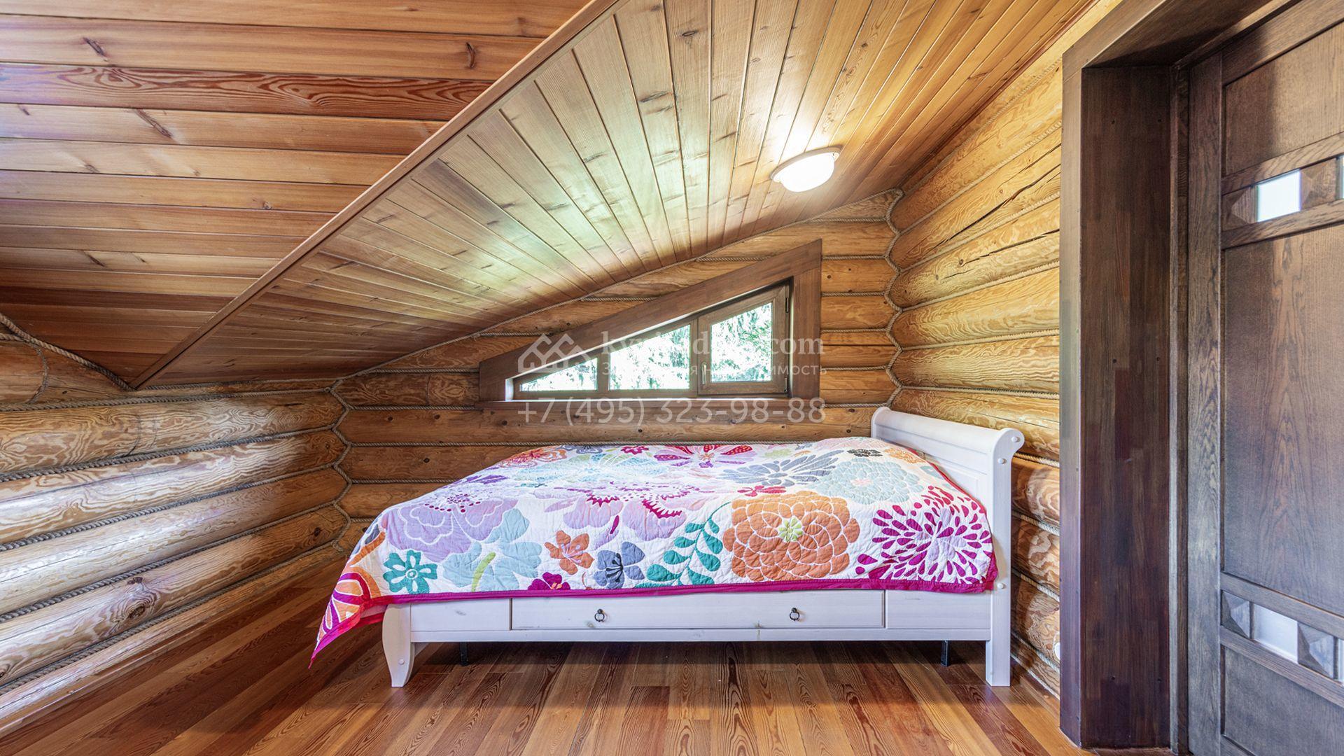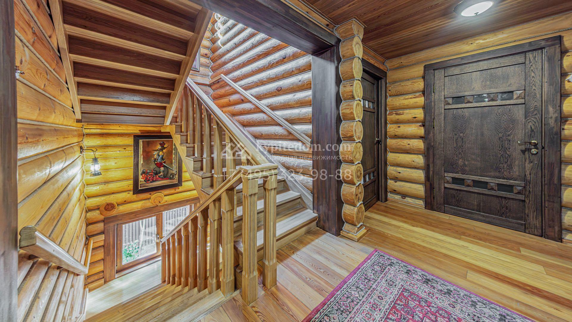 Загородный дом площадью 352 м² построен на просторном полевом участке 40 соток. Фасад здания выполнен из бревна в стиле «шале». В отделке интерьера сохранена фактура дерева, создающая атмосферу тепла и уюта. В резиденции разместили 9 спален, гостиную, кухню-столовую и бильярдную. Рядом расположены баня с комнатой отдыха и санузлом, гараж на 3 машины с квартирой для персонала и котельной, а также закрытая беседка с мангальной зоной. На участке выполнен ландшафтный дизайн, вымощены дорожки, высажены кустарники и цветы.
