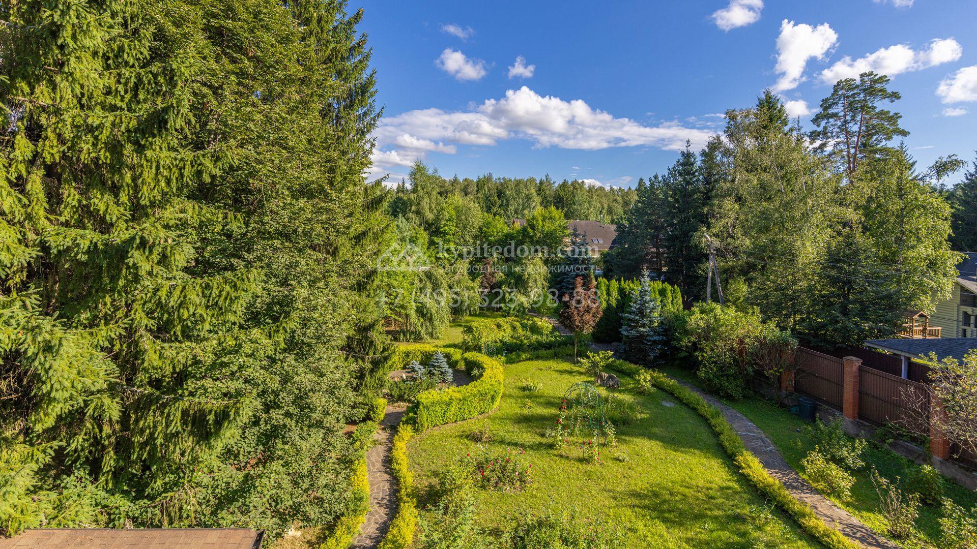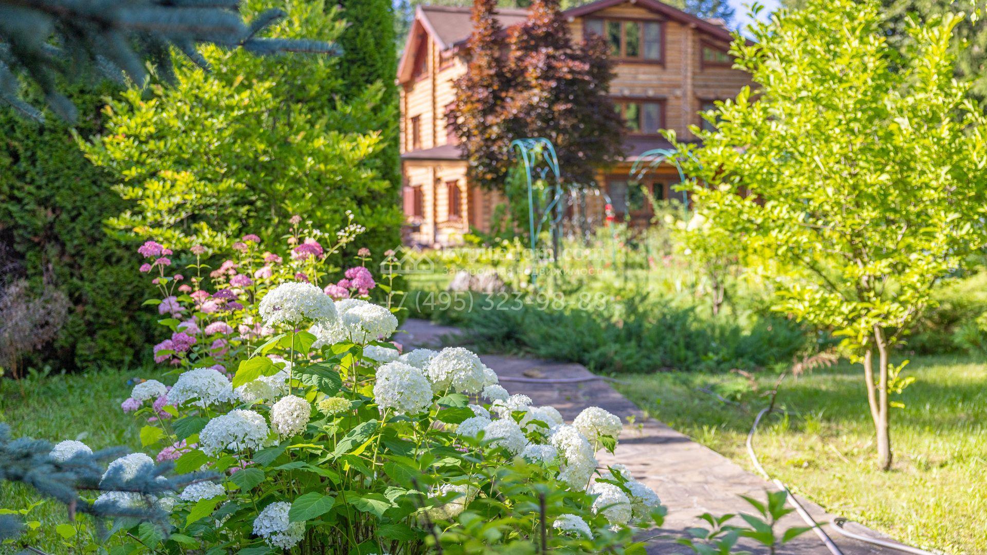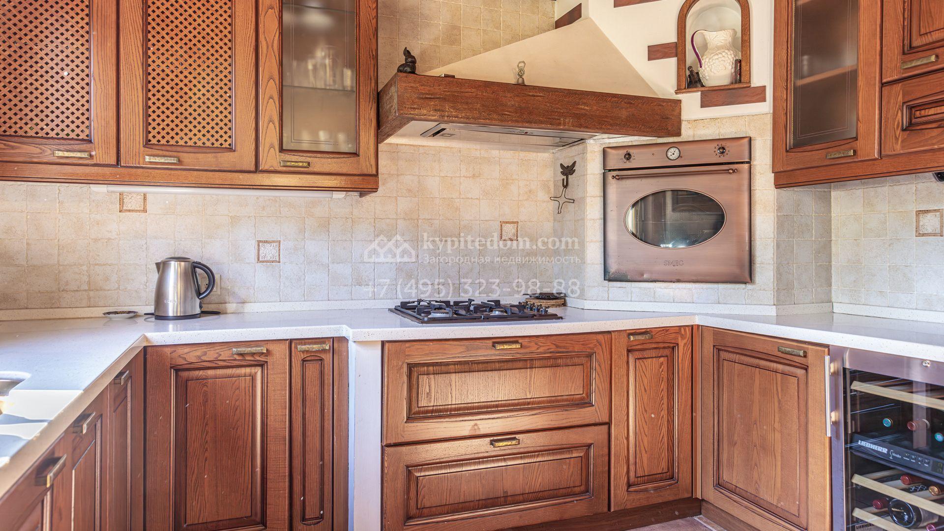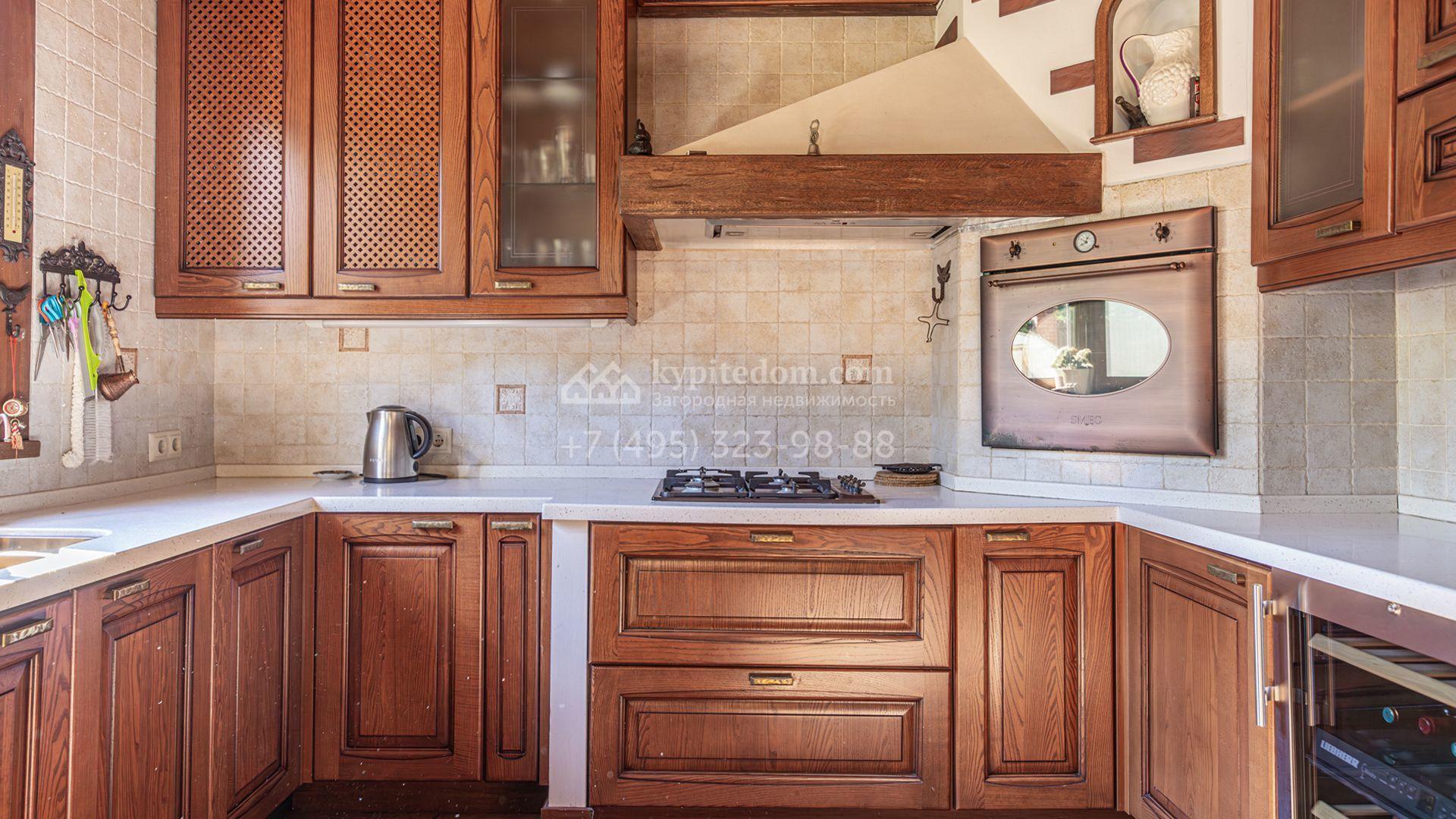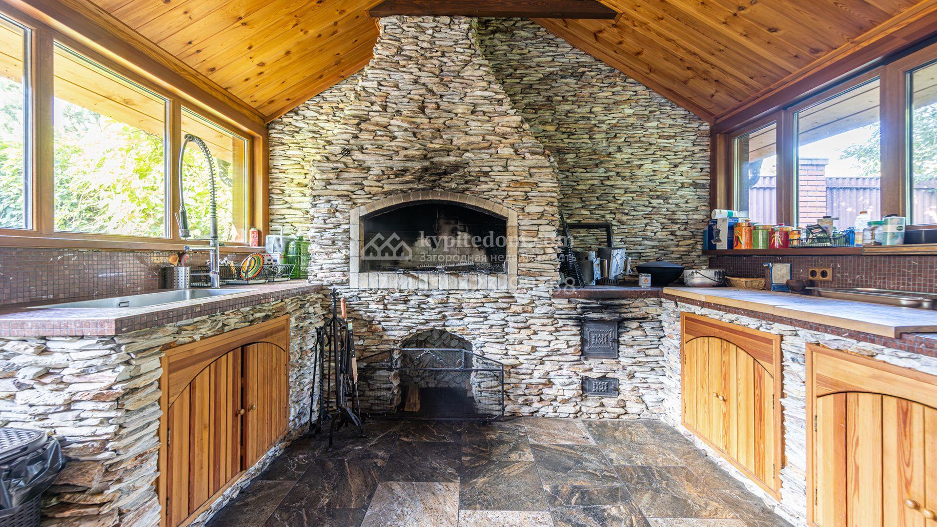 Загородный дом площадью 352 м² построен на просторном полевом участке 40 соток. Фасад здания выполнен из бревна в стиле «шале». В отделке интерьера сохранена фактура дерева, создающая атмосферу тепла и уюта. В резиденции разместили 9 спален, гостиную, кухню-столовую и бильярдную. Рядом расположены баня с комнатой отдыха и санузлом, гараж на 3 машины с квартирой для персонала и котельной, а также закрытая беседка с мангальной зоной. На участке выполнен ландшафтный дизайн, вымощены дорожки, высажены кустарники и цветы.
