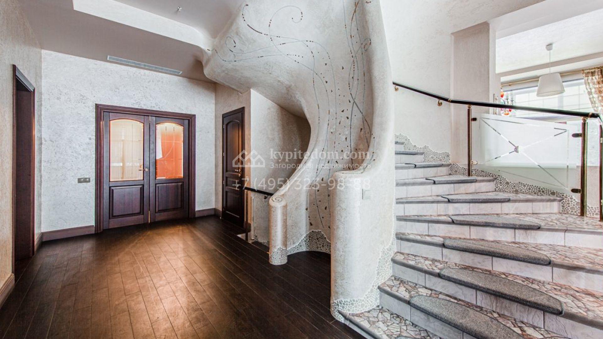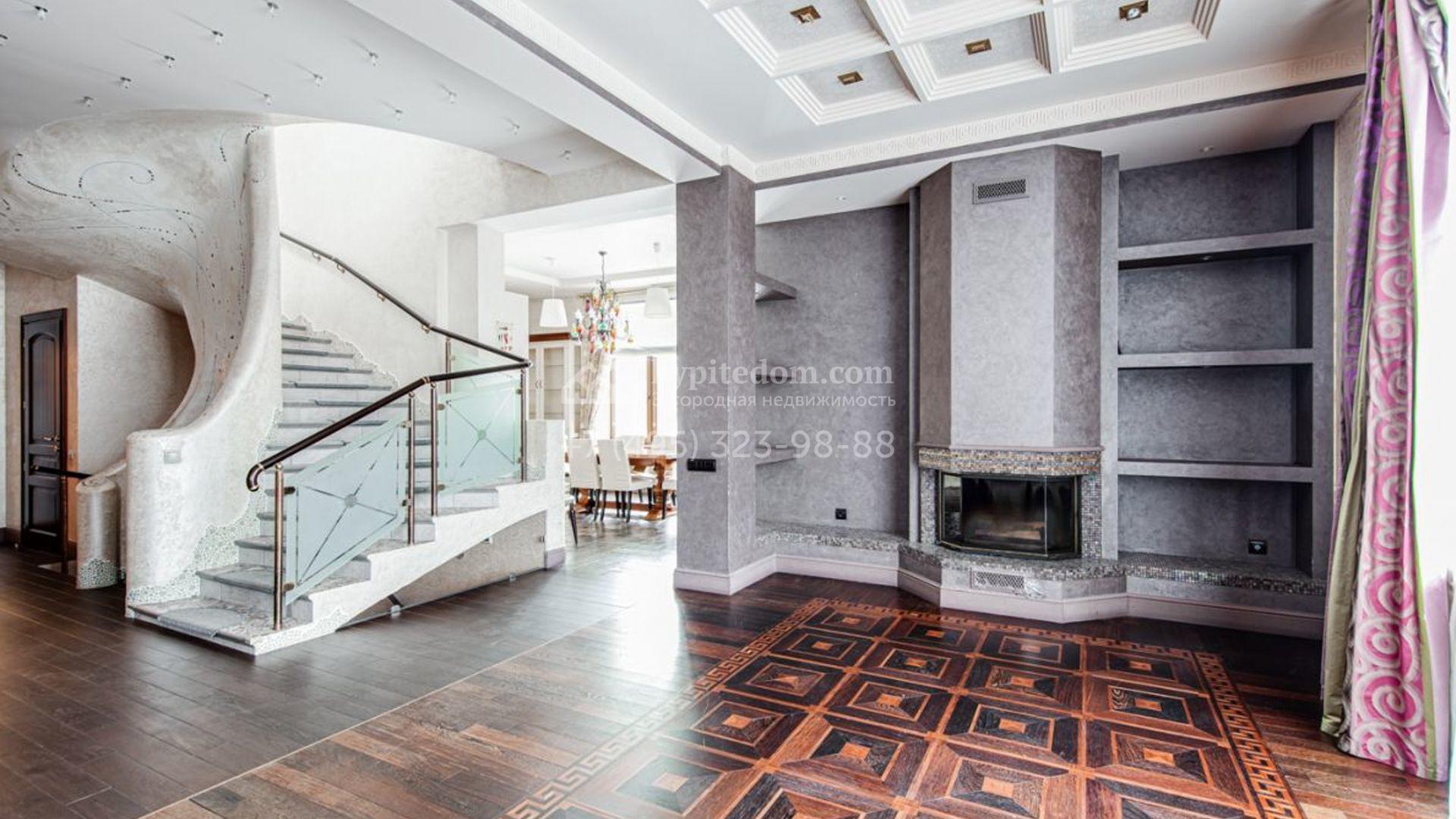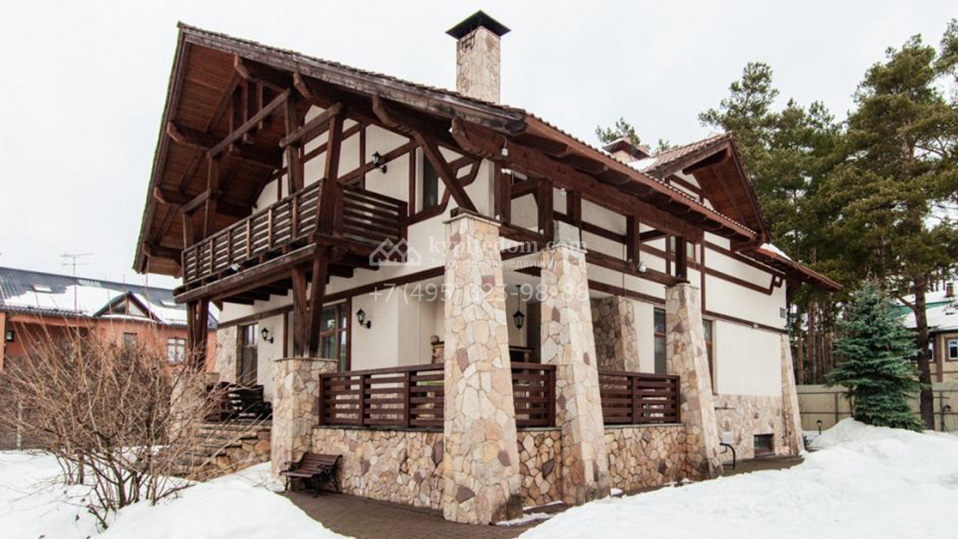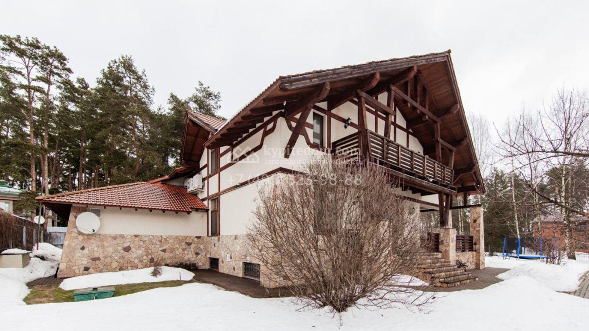 Загородная резиденция на прилесном участке 15 соток выполнена по авторскому проекту. Фасад в стиле «шале» облицован натуральным камнем и украшен декоративными деревянными балками. Интерьер в современном стиле выполнен в сдержанной гамме, в отделке использовано натуральное дерево, наборный паркет. Планировкой предусмотрены 4 спальни, кабинет, спортзал, просторная гостиная с камином. На цокольном этаже — гараж для 2 машин и квартира для персонала. С участка открывается вид на корабельные сосны.