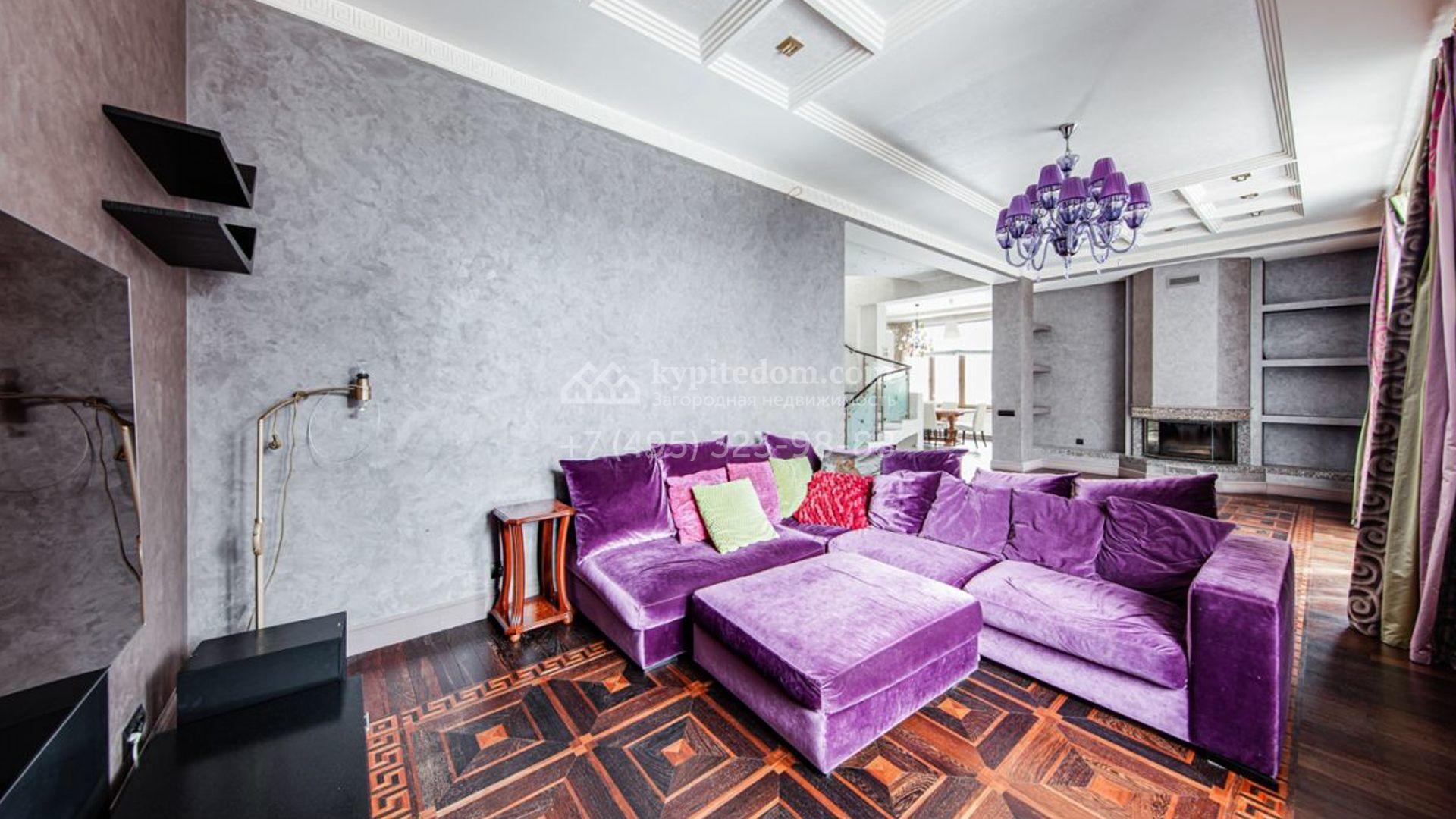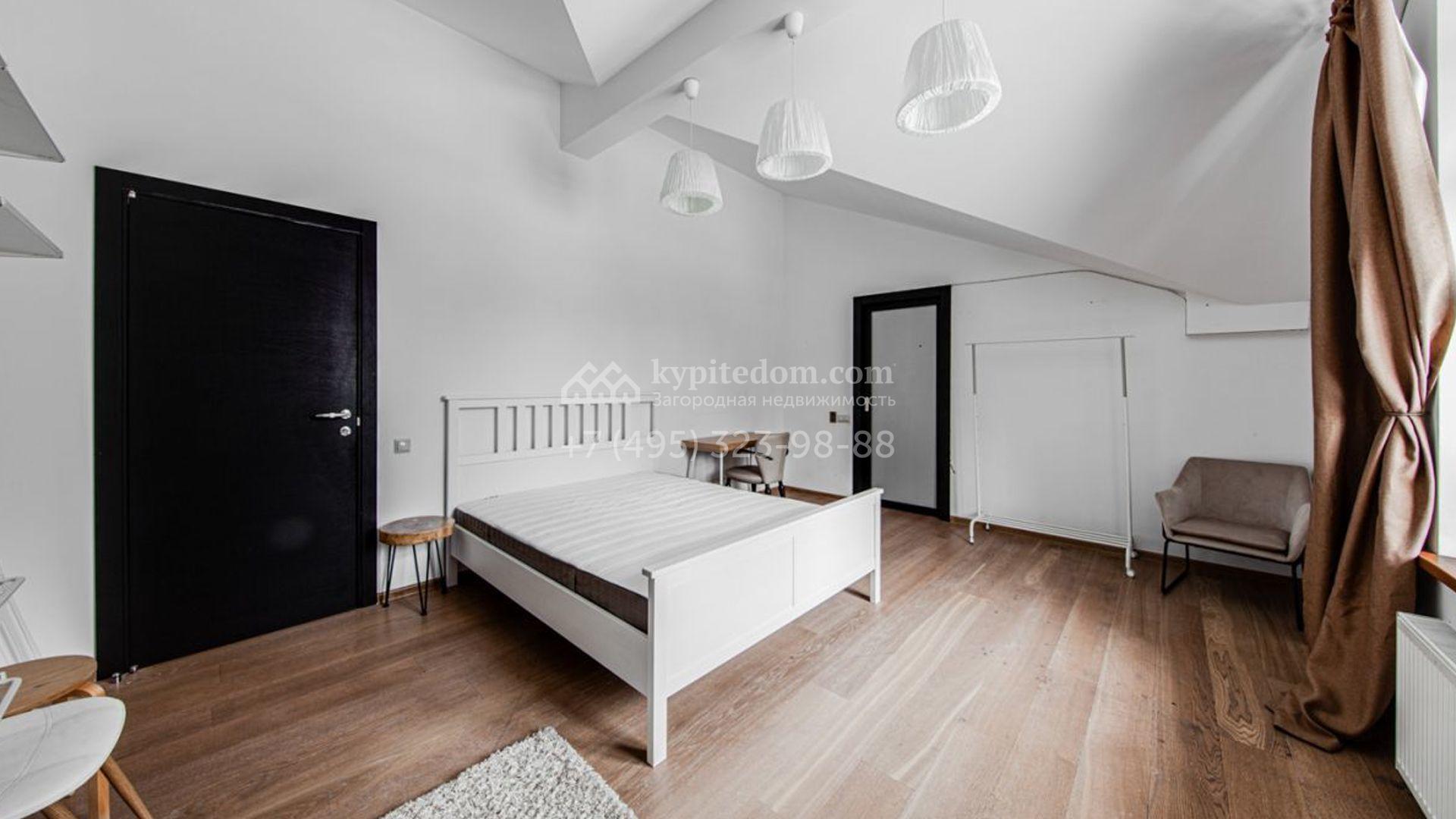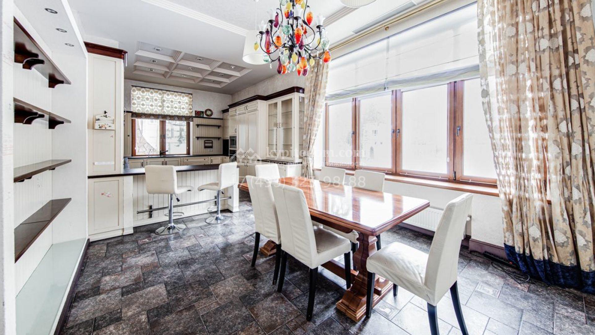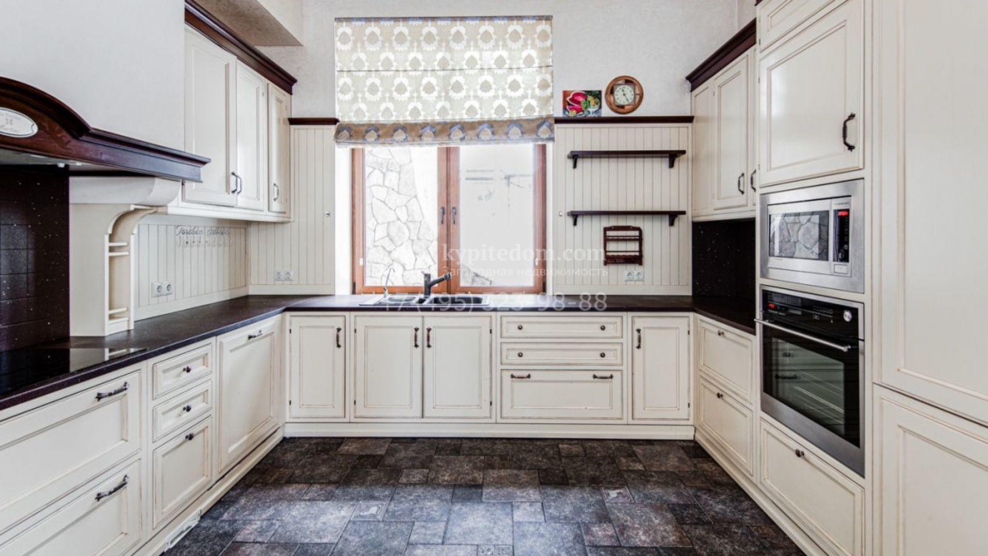 Загородная резиденция на прилесном участке 15 соток выполнена по авторскому проекту. Фасад в стиле «шале» облицован натуральным камнем и украшен декоративными деревянными балками. Интерьер в современном стиле выполнен в сдержанной гамме, в отделке использовано натуральное дерево, наборный паркет. Планировкой предусмотрены 4 спальни, кабинет, спортзал, просторная гостиная с камином. На цокольном этаже — гараж для 2 машин и квартира для персонала. С участка открывается вид на корабельные сосны.