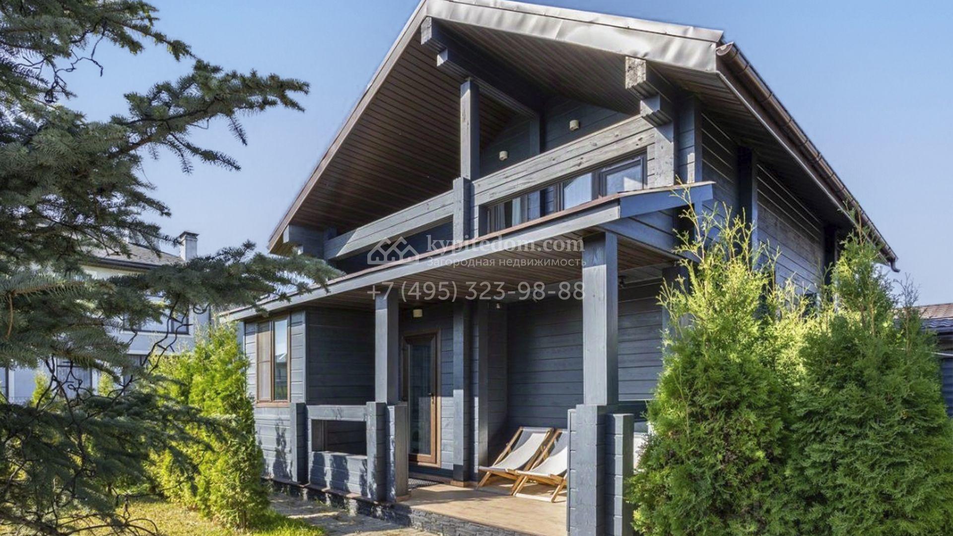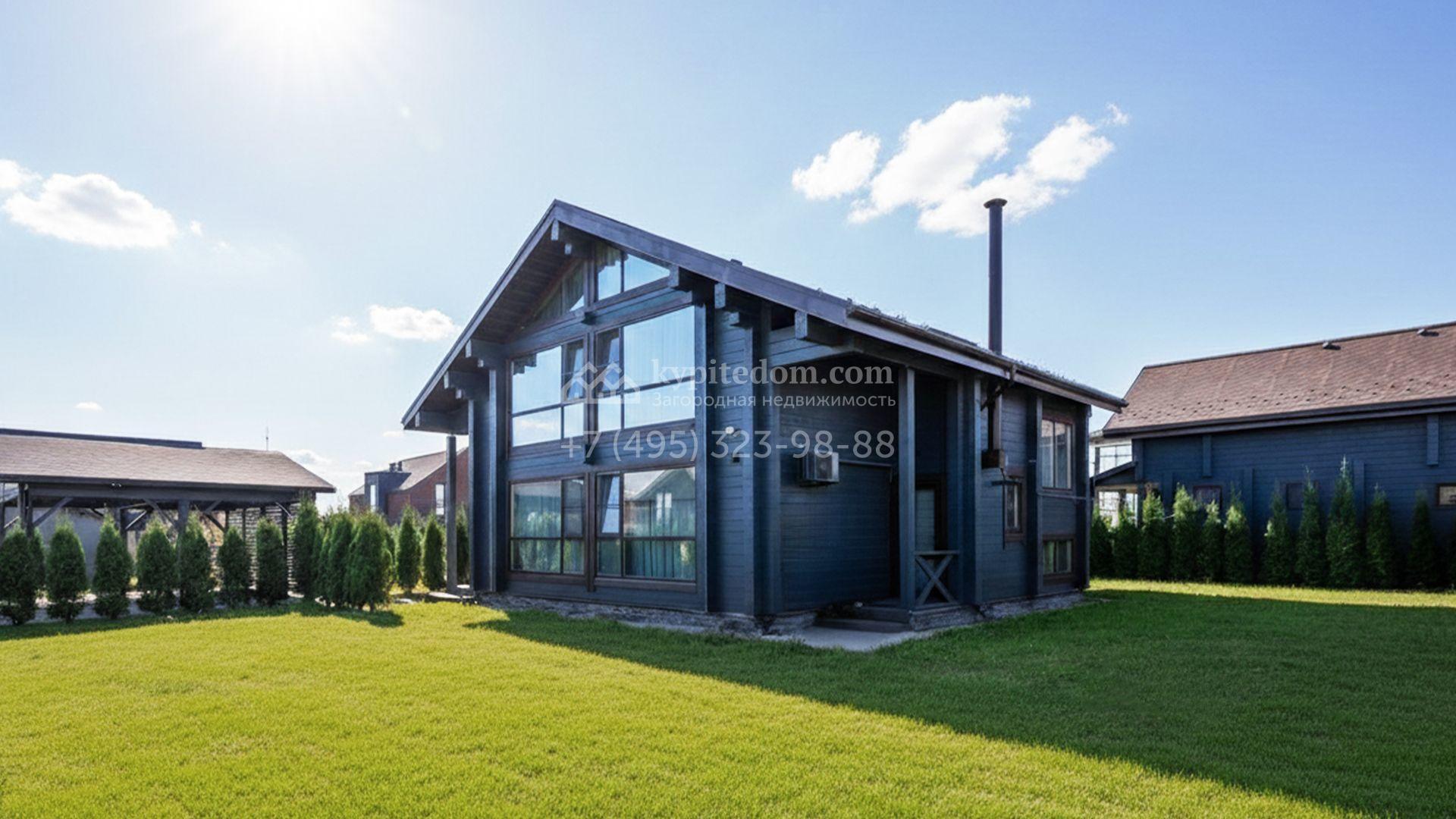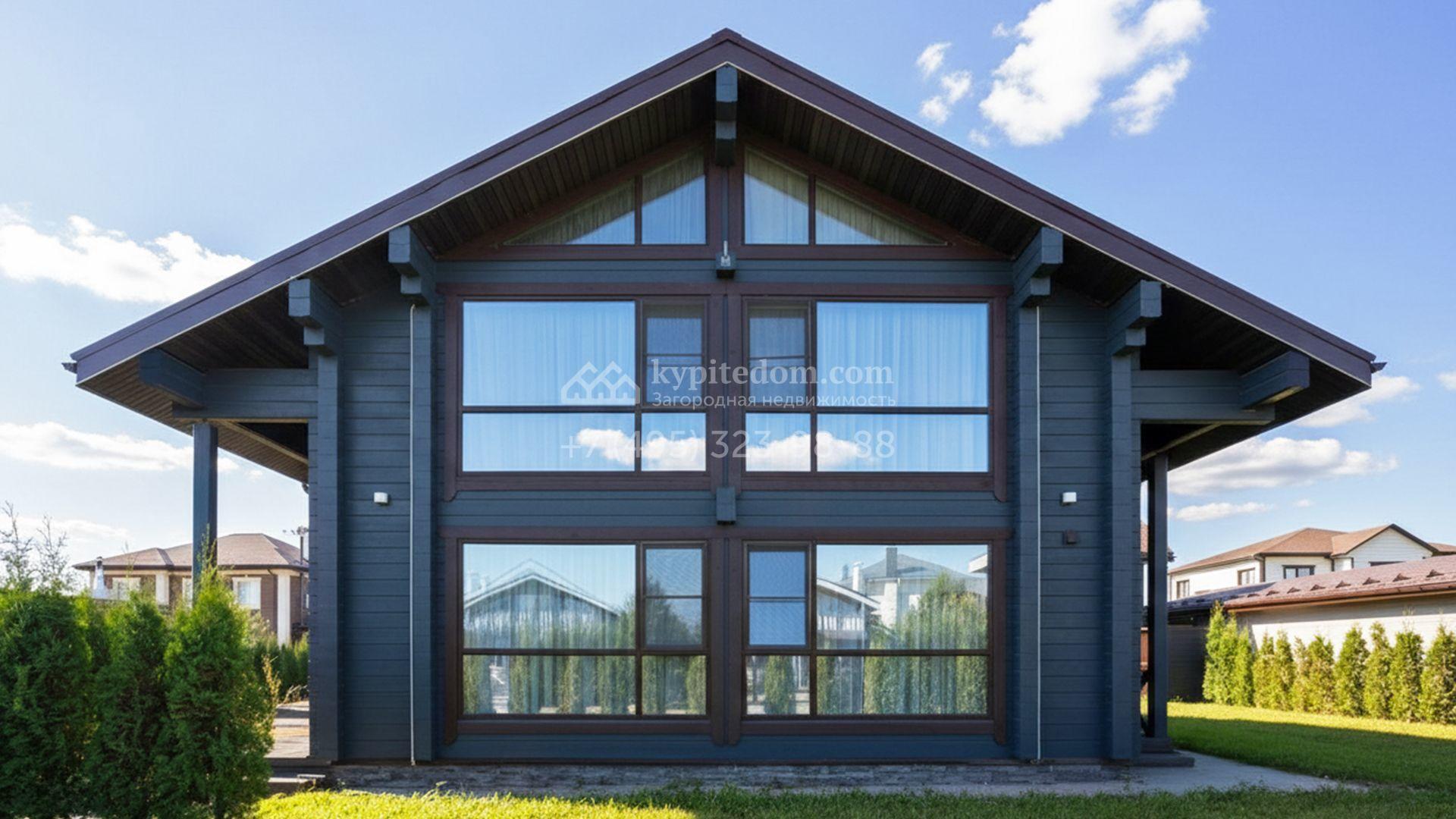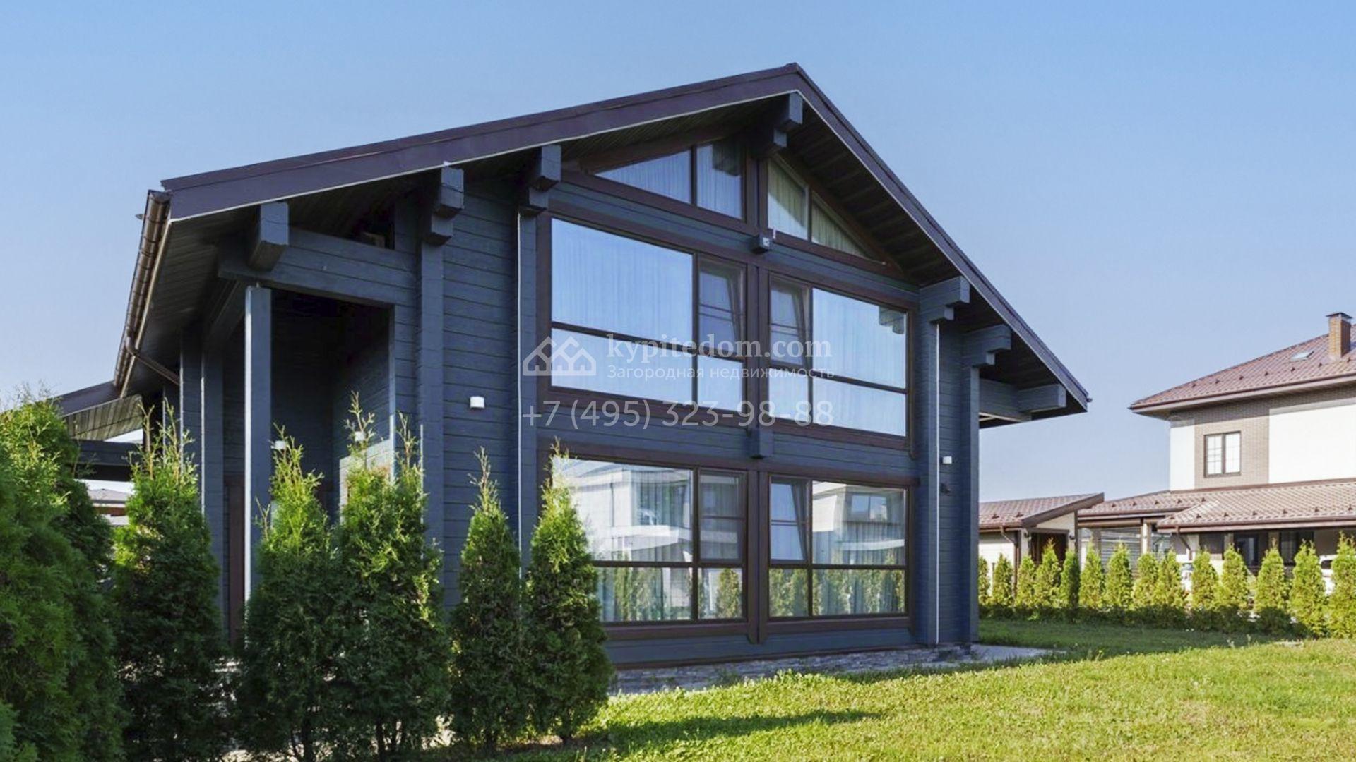 Загородный коттедж площадью 220 м² расположен на полевом участке 13 соток. Эффектный тёмно-серый фасад из клееного бруса выполнен в стиле шале, что подчёркивает выразительная нависающая крыша. Панорамные окна открывают живописные виды на посёлок и наполняют внутренние пространства солнечными лучами.