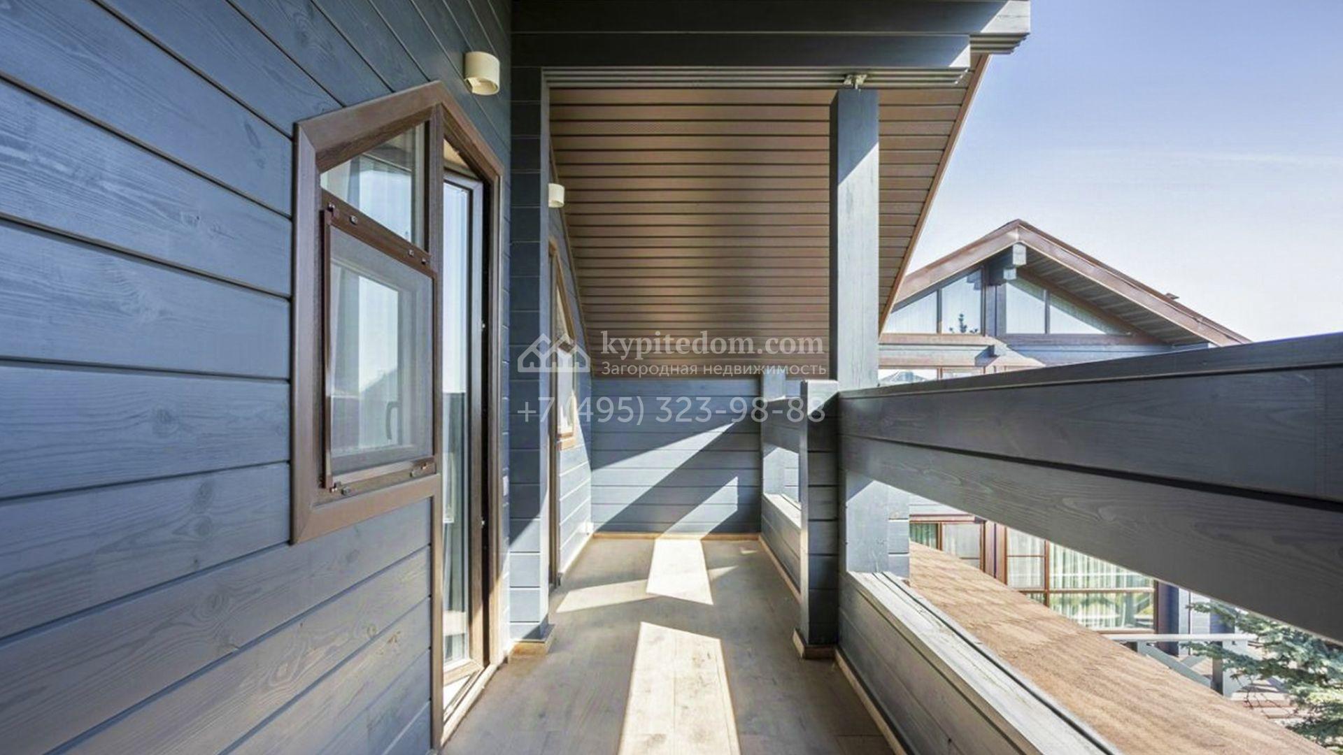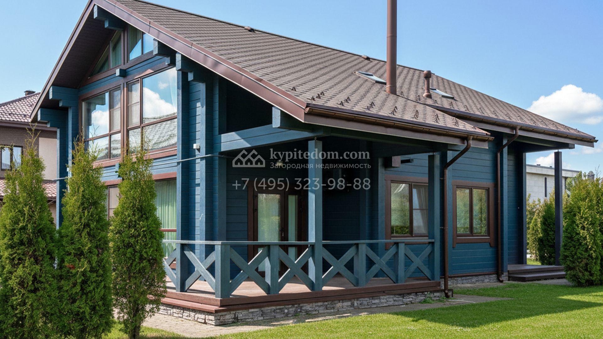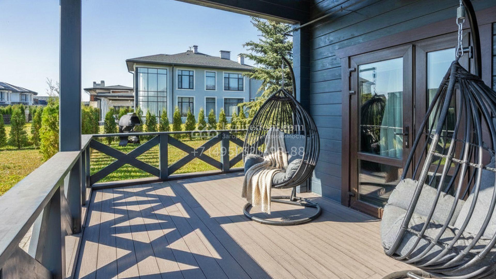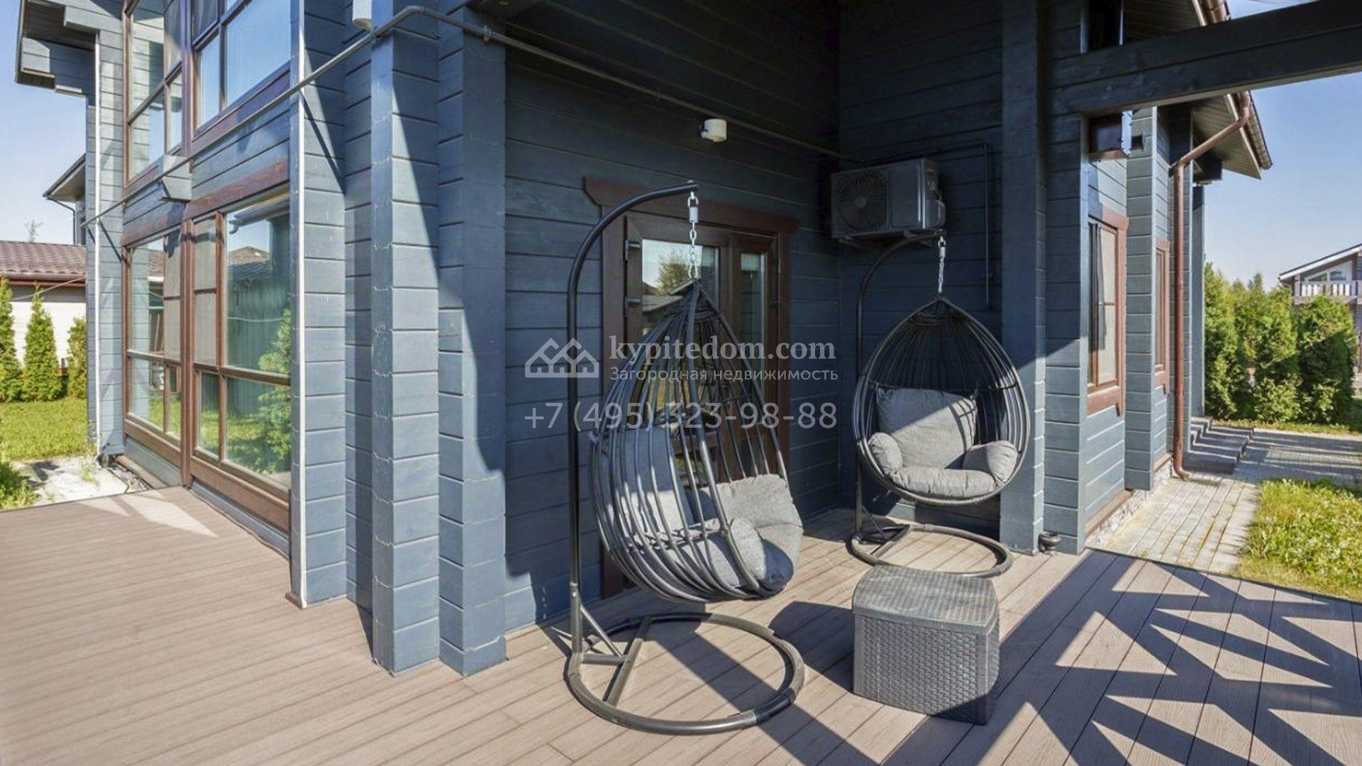 Загородный коттедж площадью 220 м² расположен на полевом участке 13 соток. Эффектный тёмно-серый фасад из клееного бруса выполнен в стиле шале, что подчёркивает выразительная нависающая крыша. Панорамные окна открывают живописные виды на посёлок и наполняют внутренние пространства солнечными лучами.
