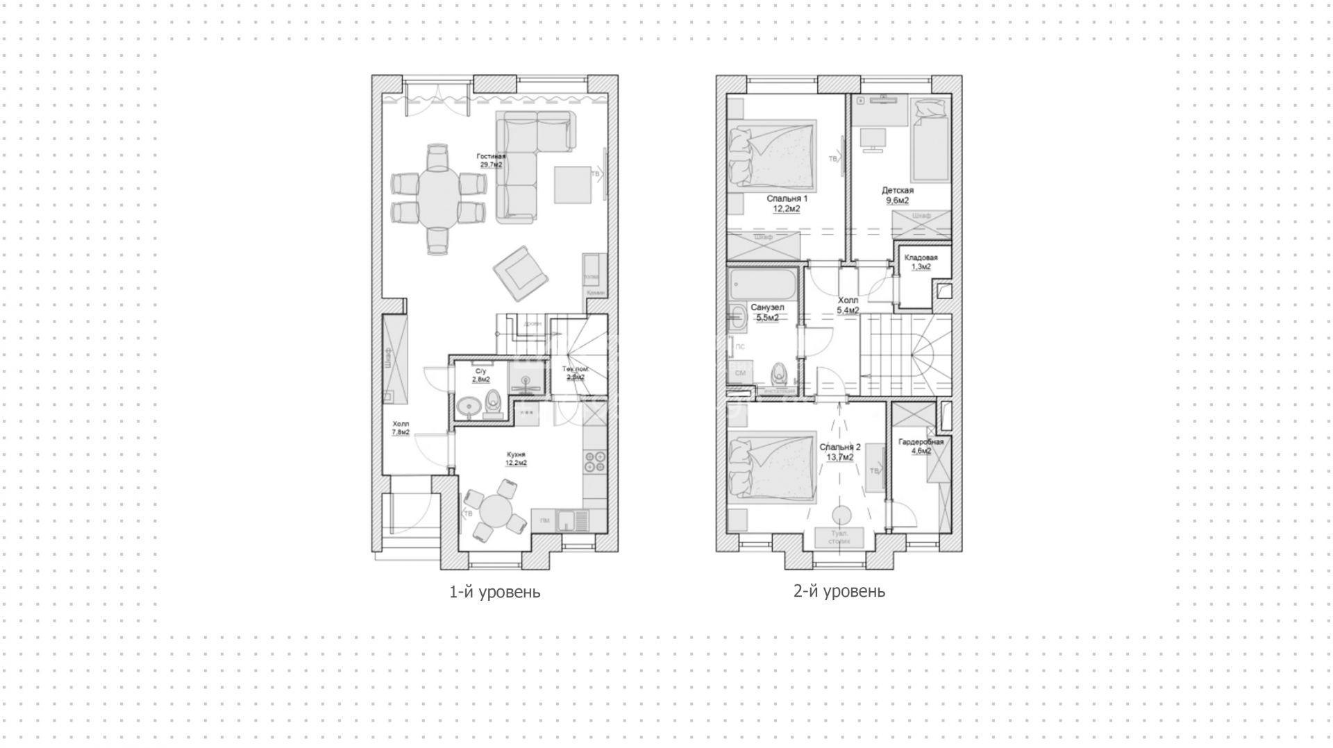 2-й уровень: спальня с гардеробной, 2 спальни, санузел, холл, кладовая.