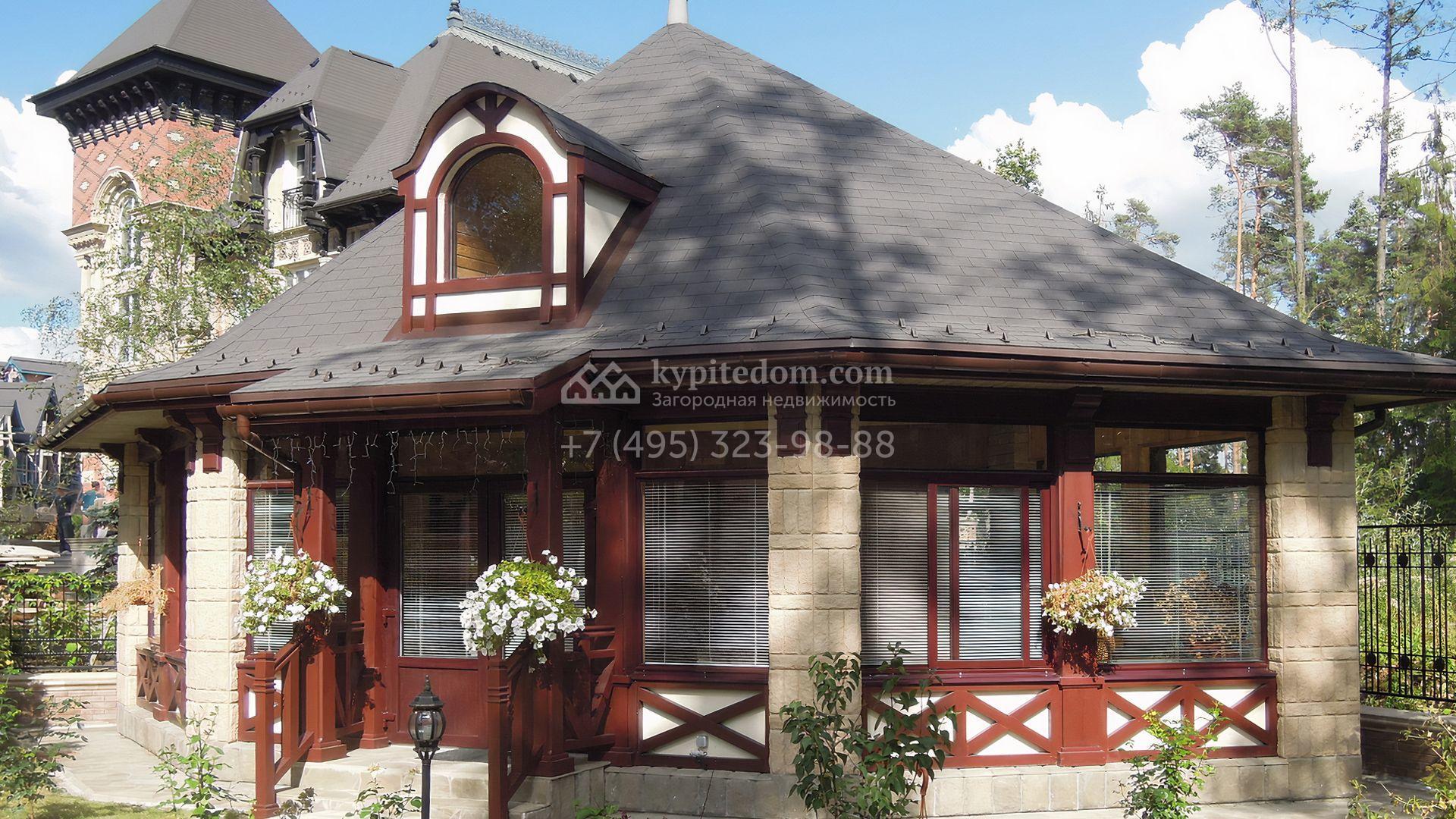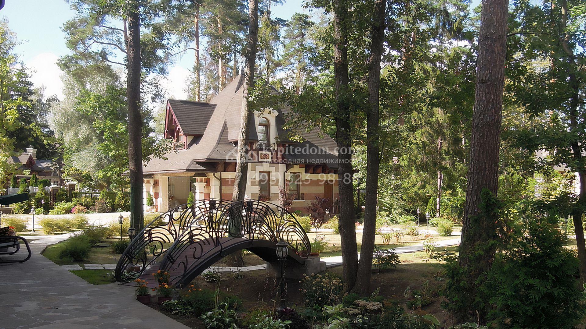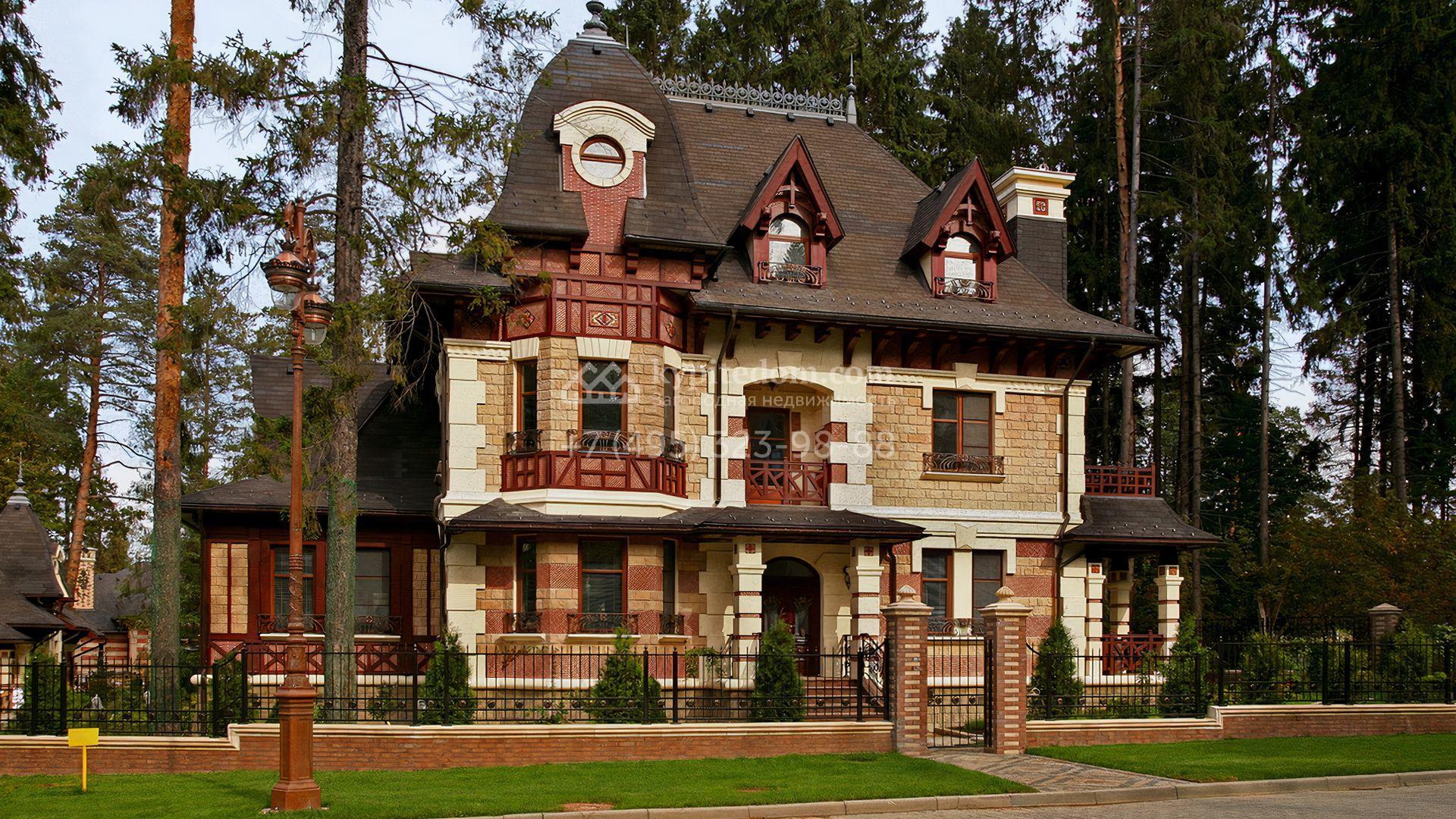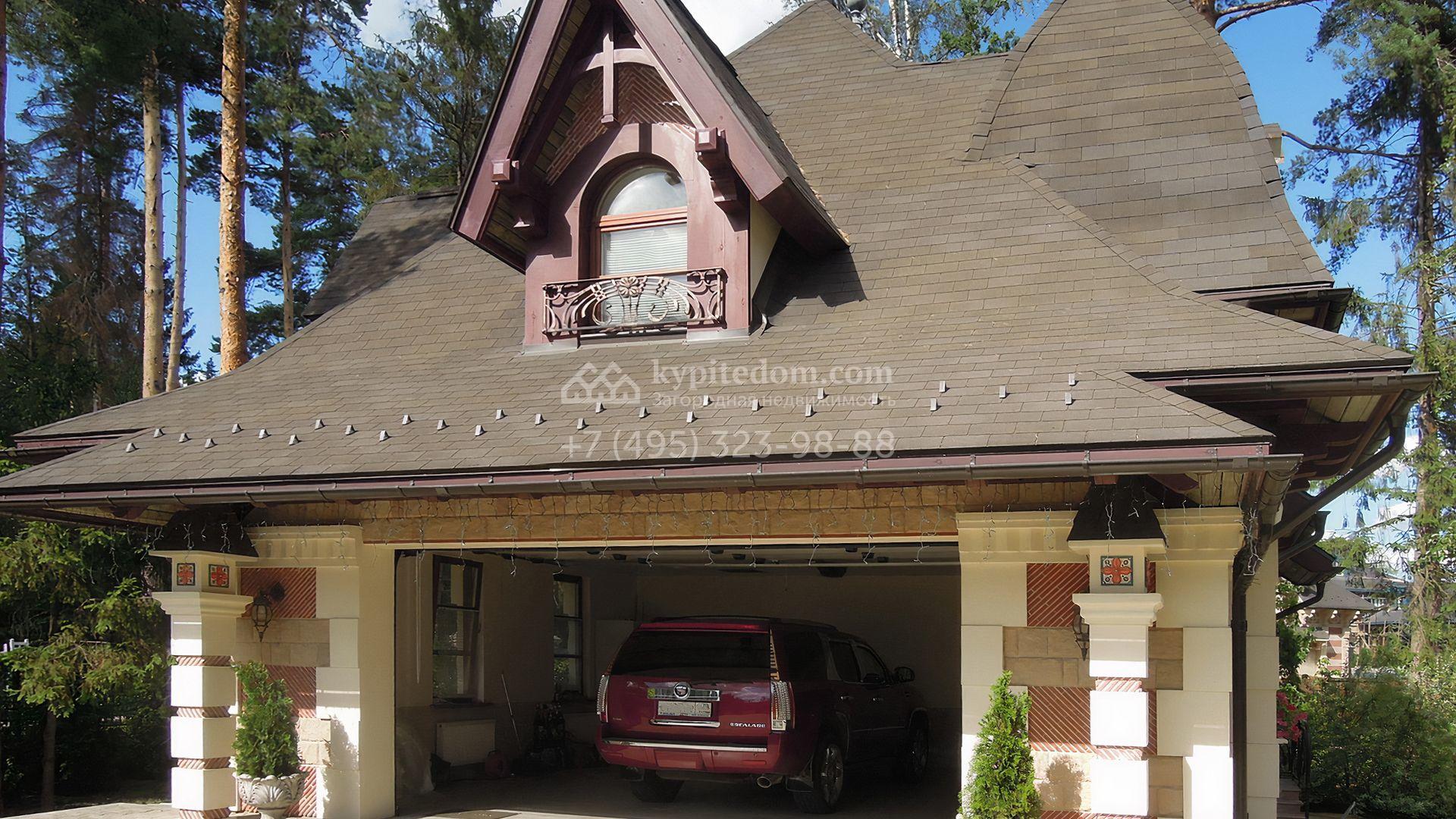 Загородная резиденция во фламандском стиле на высоком цоколе расположен на лесном участке 20 соток. Фасад резиденции 377 м² облицован штукатуркой и камнем, украшен цветными деревянными балками, резьбой, наличниками. Интерьер дома выдержали в классическом стиле в светлых тонах. Мебель выполнена из массива, установлена кухня и сантехника. В доме разместили 3 спальни, гостиную с камином, бильярдную и спортивный зал. На участке выполнили ландшафтный дизайн, в тени сосен посадили газон и кустарники, построили гараж для 2 машин с квартирой для персонала и беседку-барбекю.